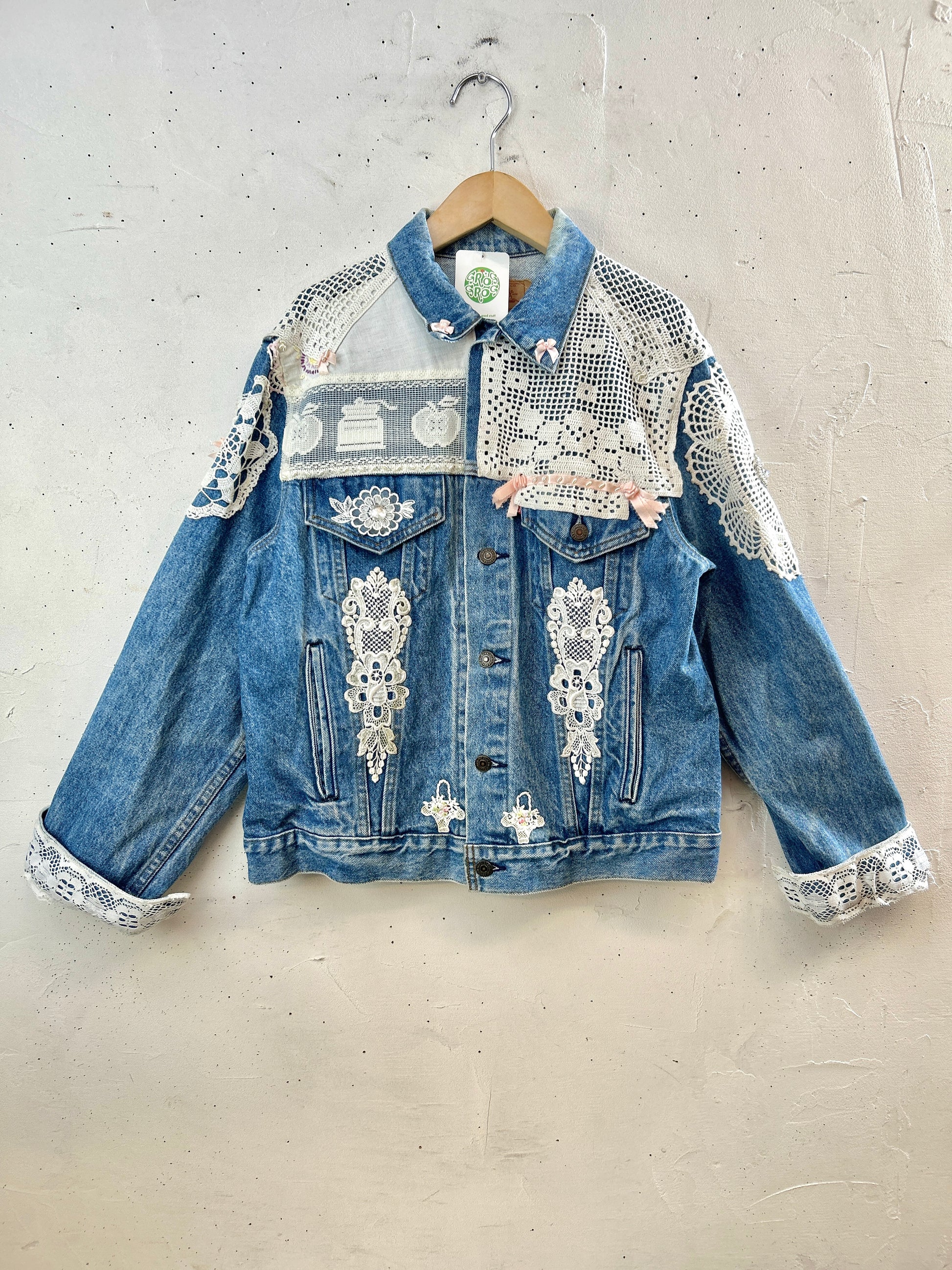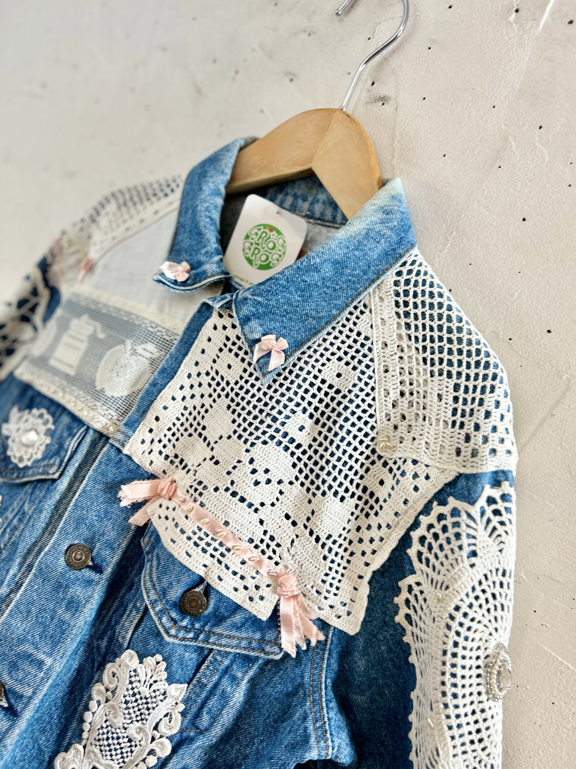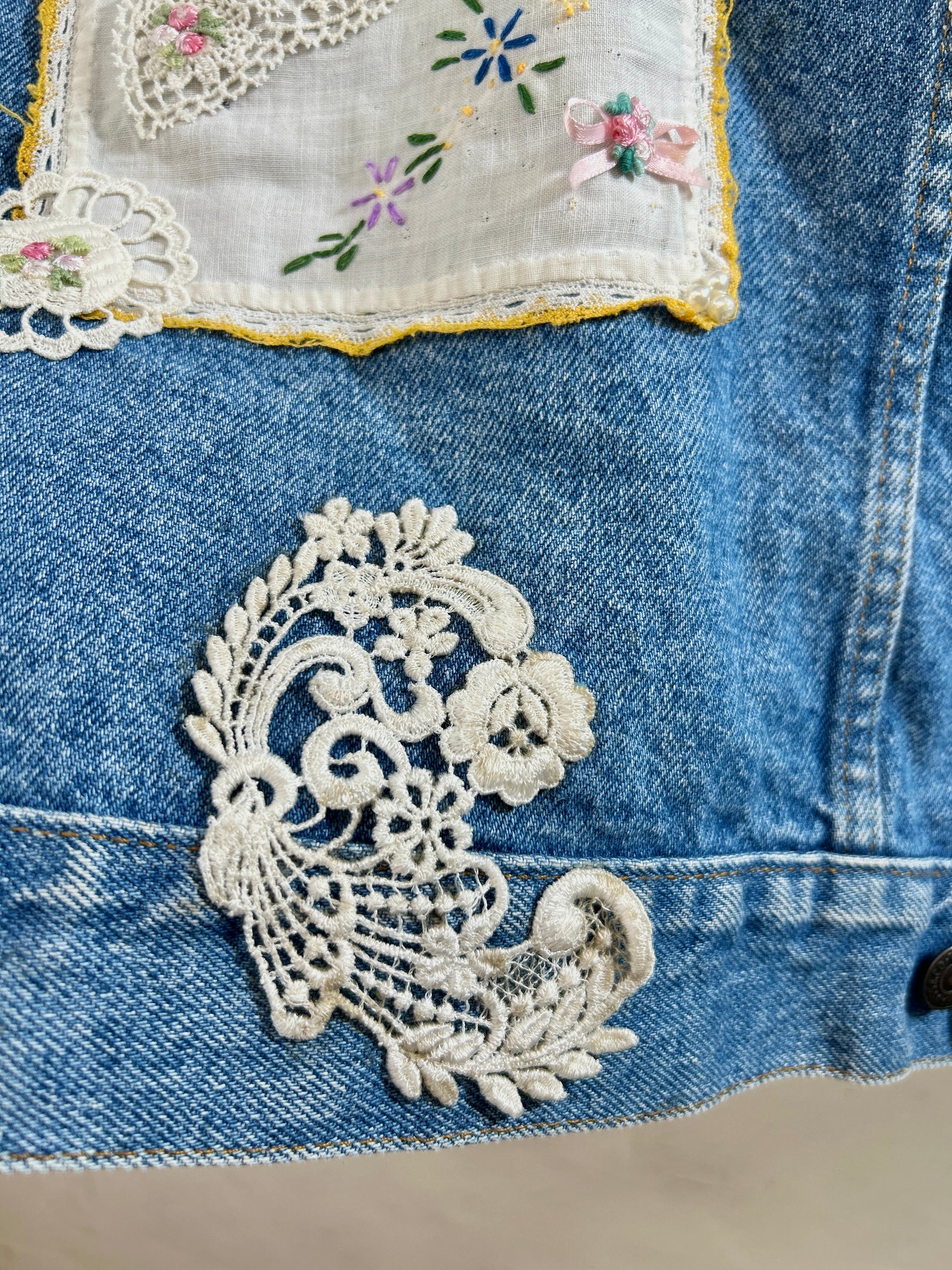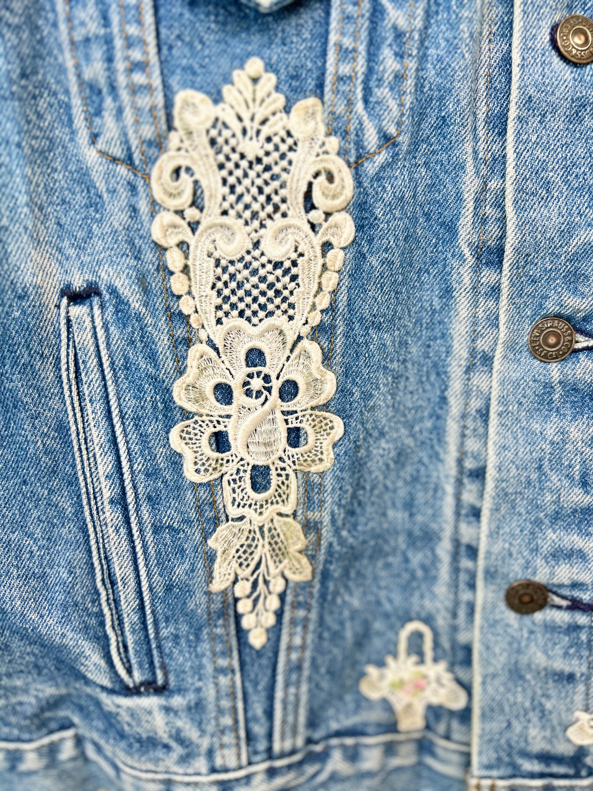 Levi’sのデニムに手の込んだ豪華なドイリーやレース編み等を贅沢に使用しカスタムした一着。