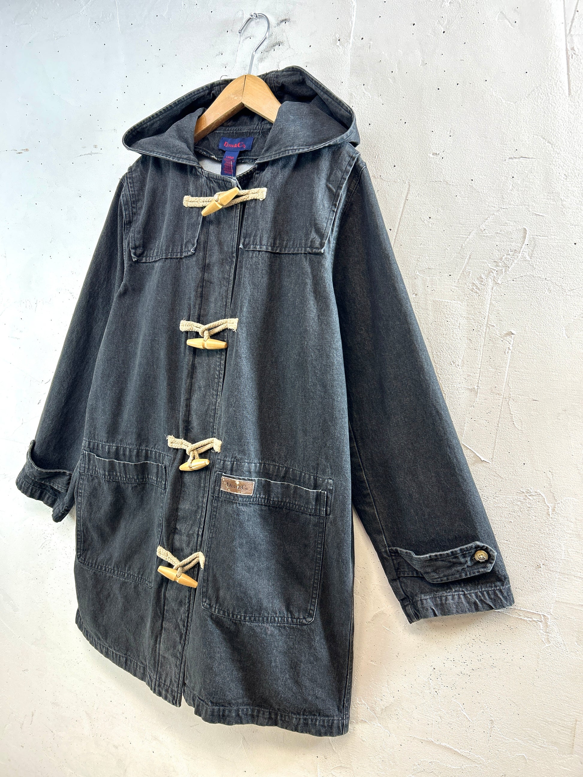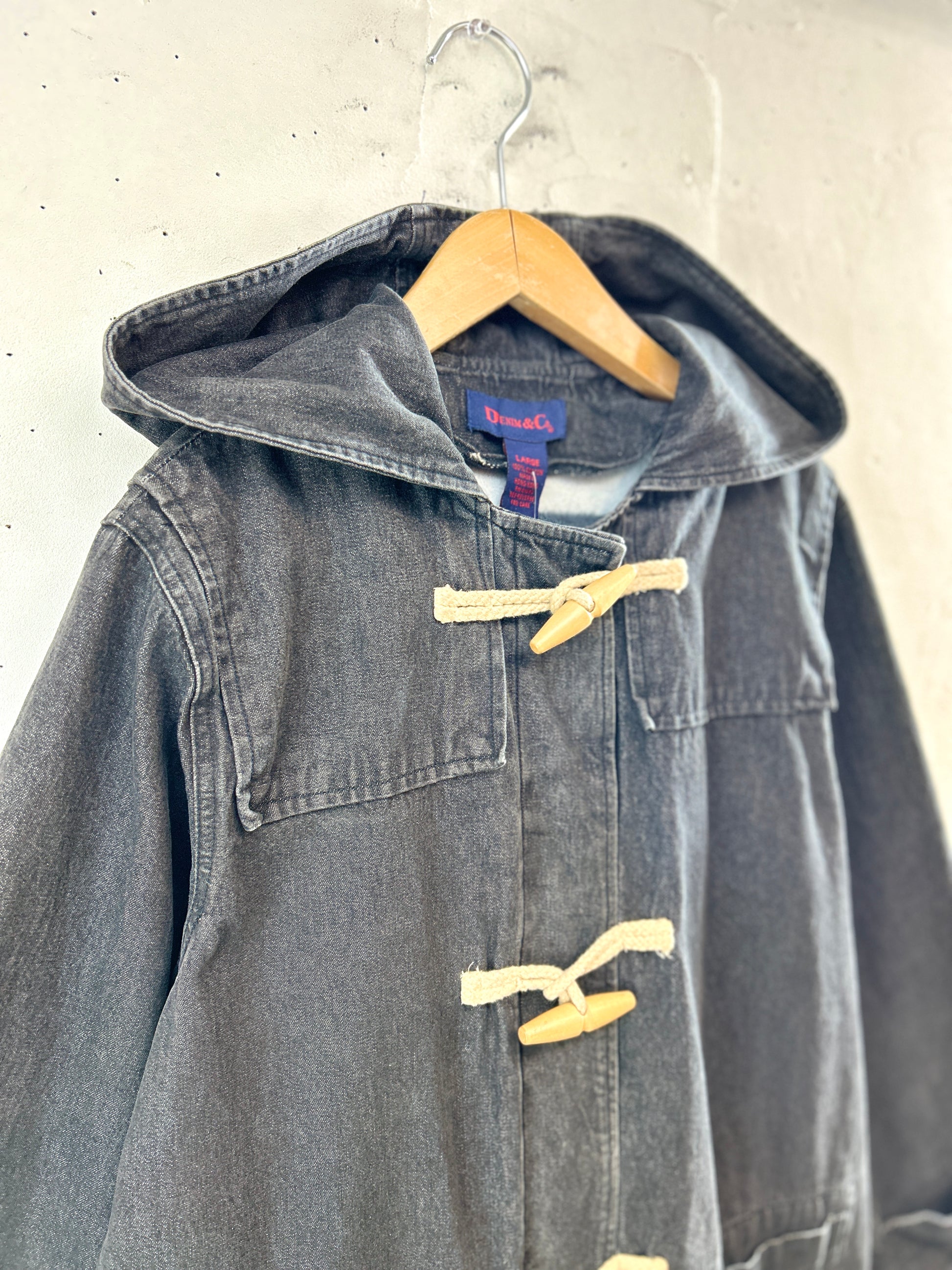 ブラックデニム、トグルボタンがつくダッフルコートシルエットの1着。