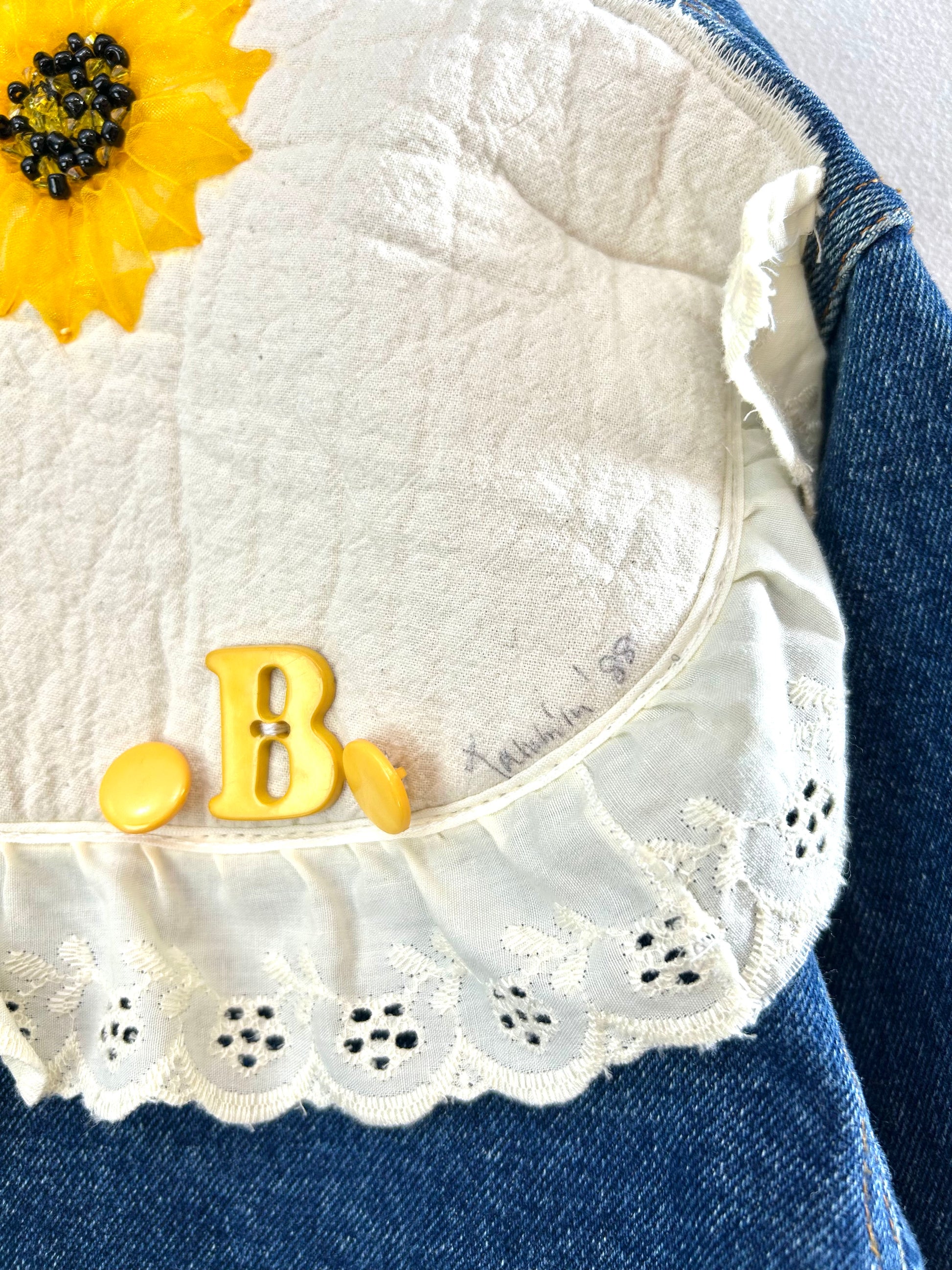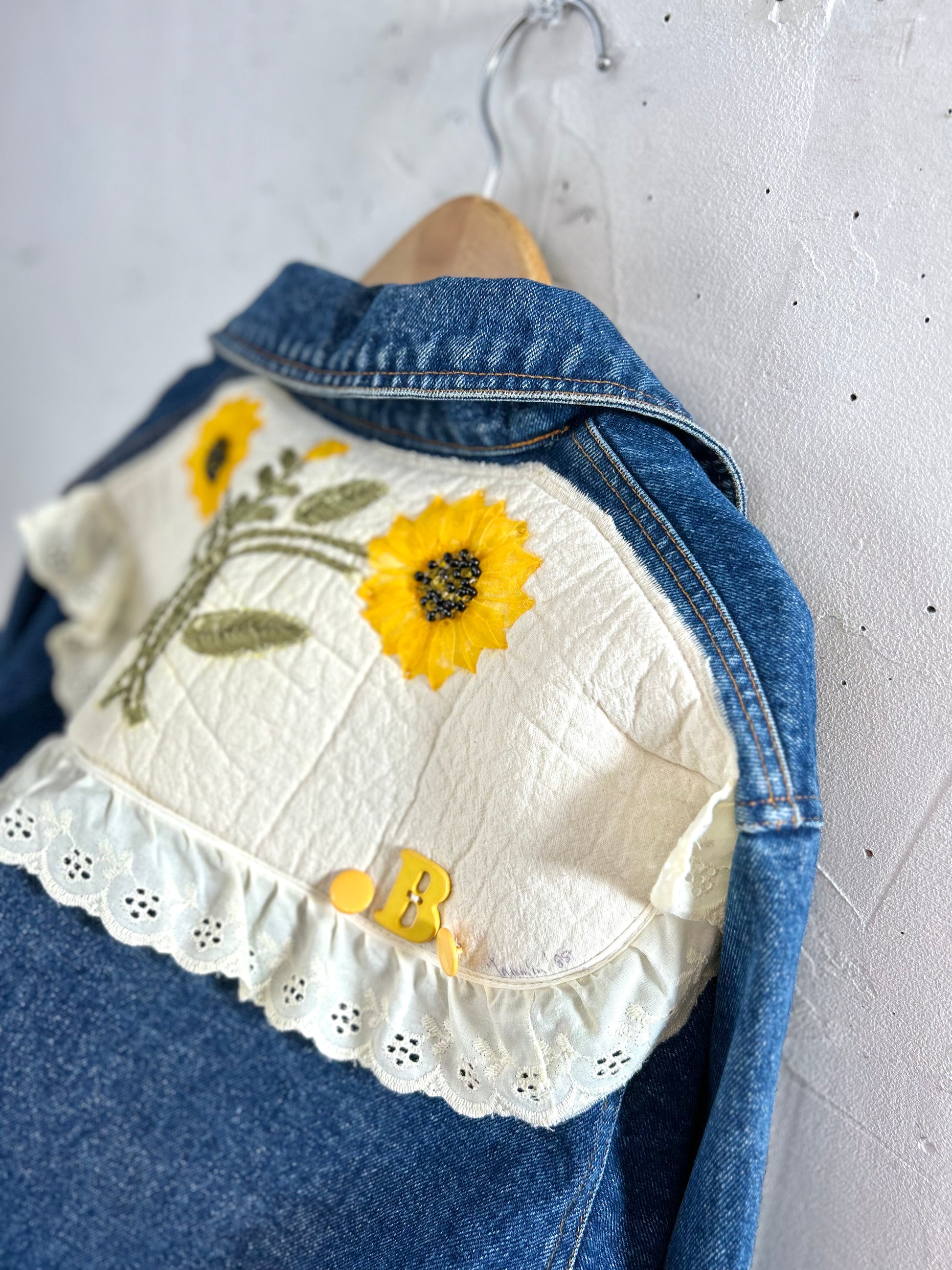 カスタムされたバックを彩るアップリケや袖のレース。ポケットのデザインなどディテールへのゴダわりが抜群の雰囲気です。