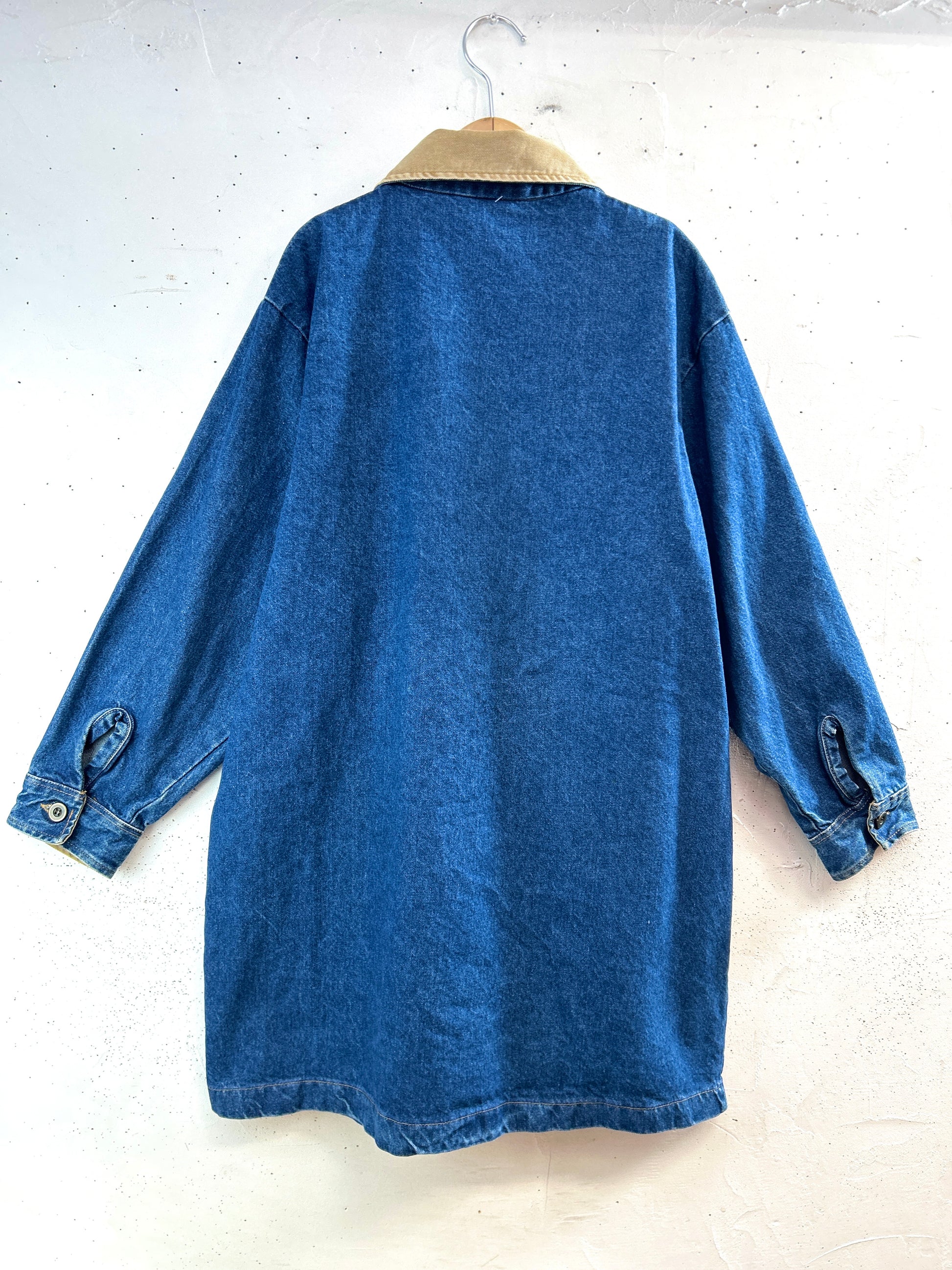 デニムにカーキカラー襟の切り替え、2つポケットのカバーオールタイプです。