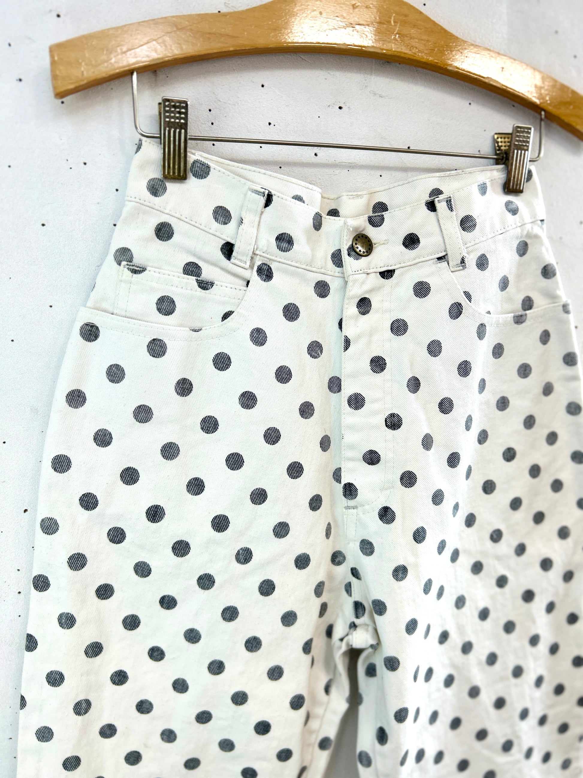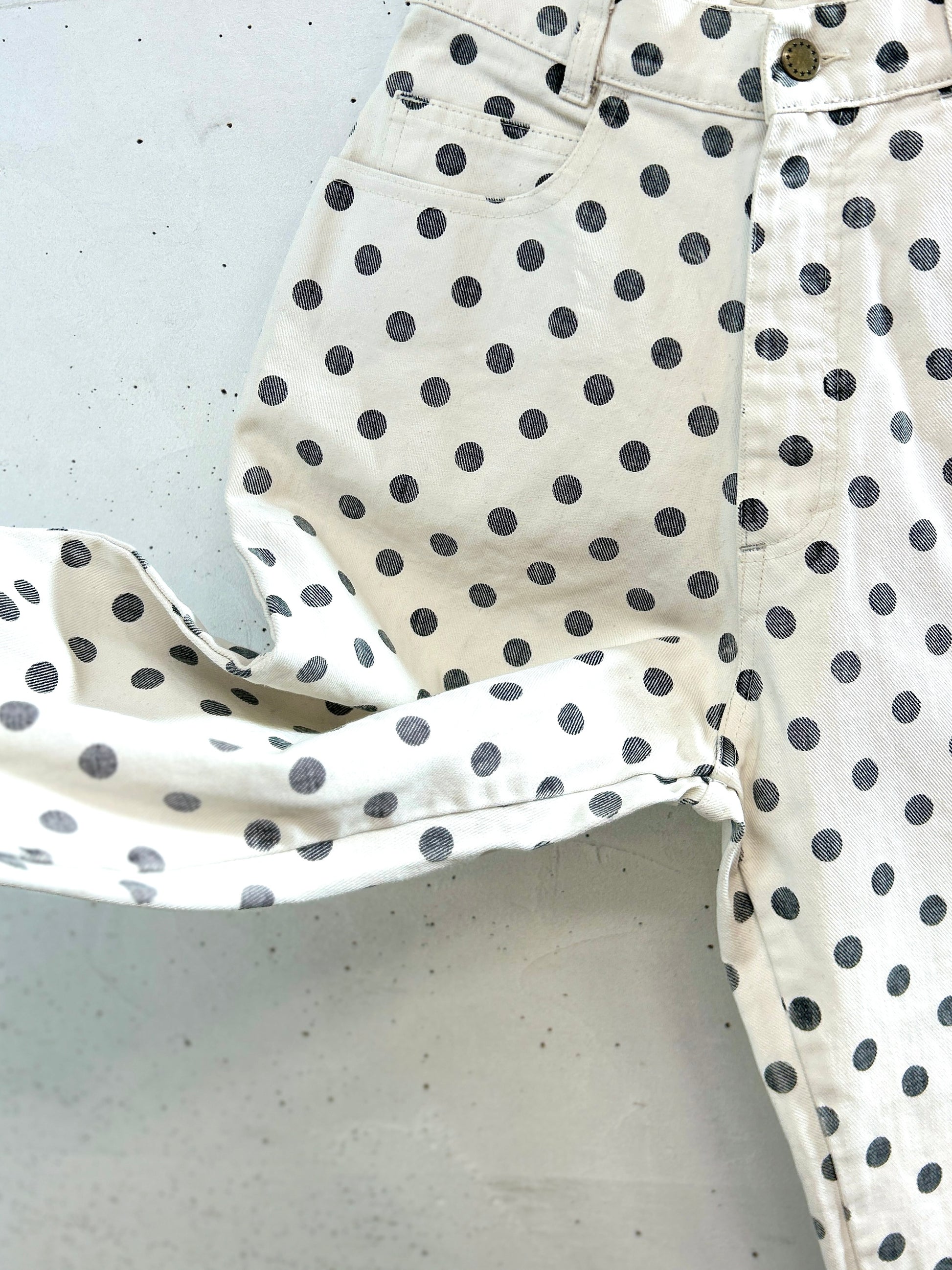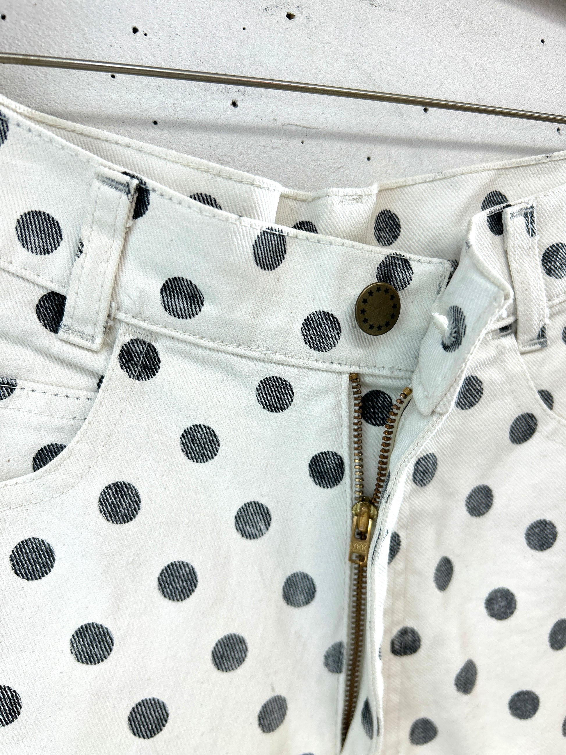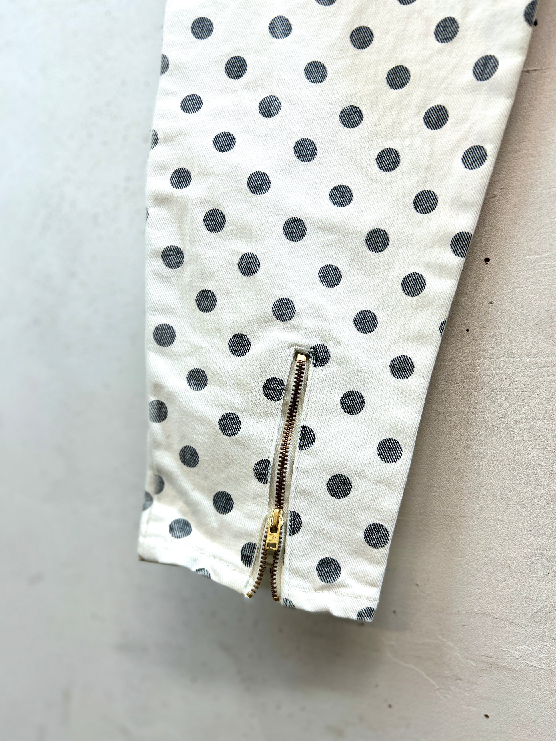 ホワイトデニムにブラックの水玉がとてもが可愛い1着です。