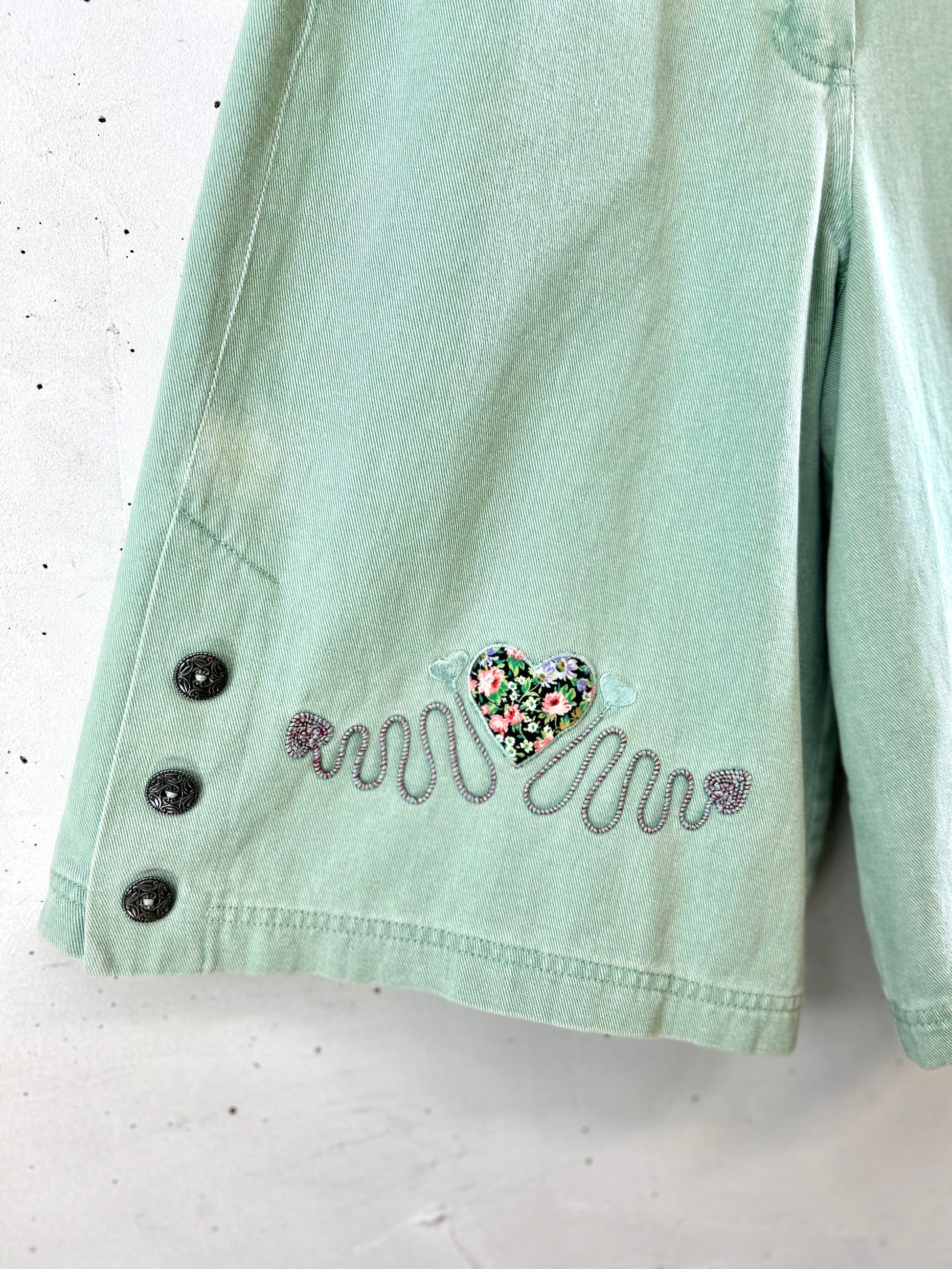 こちらのアイテムは、長めのシルエットにアップリケ、刺繍、ボタンが可愛らしい1着。