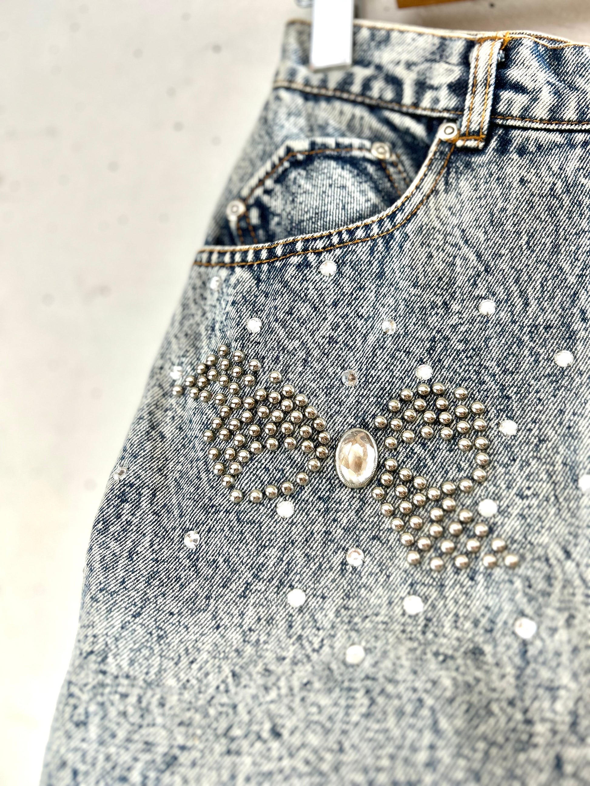 広がらないシルエットで、スタッツとラインストーンが可愛く、80s-90sなスタイルをたっぷりお楽しみ頂けるグッドピースです。