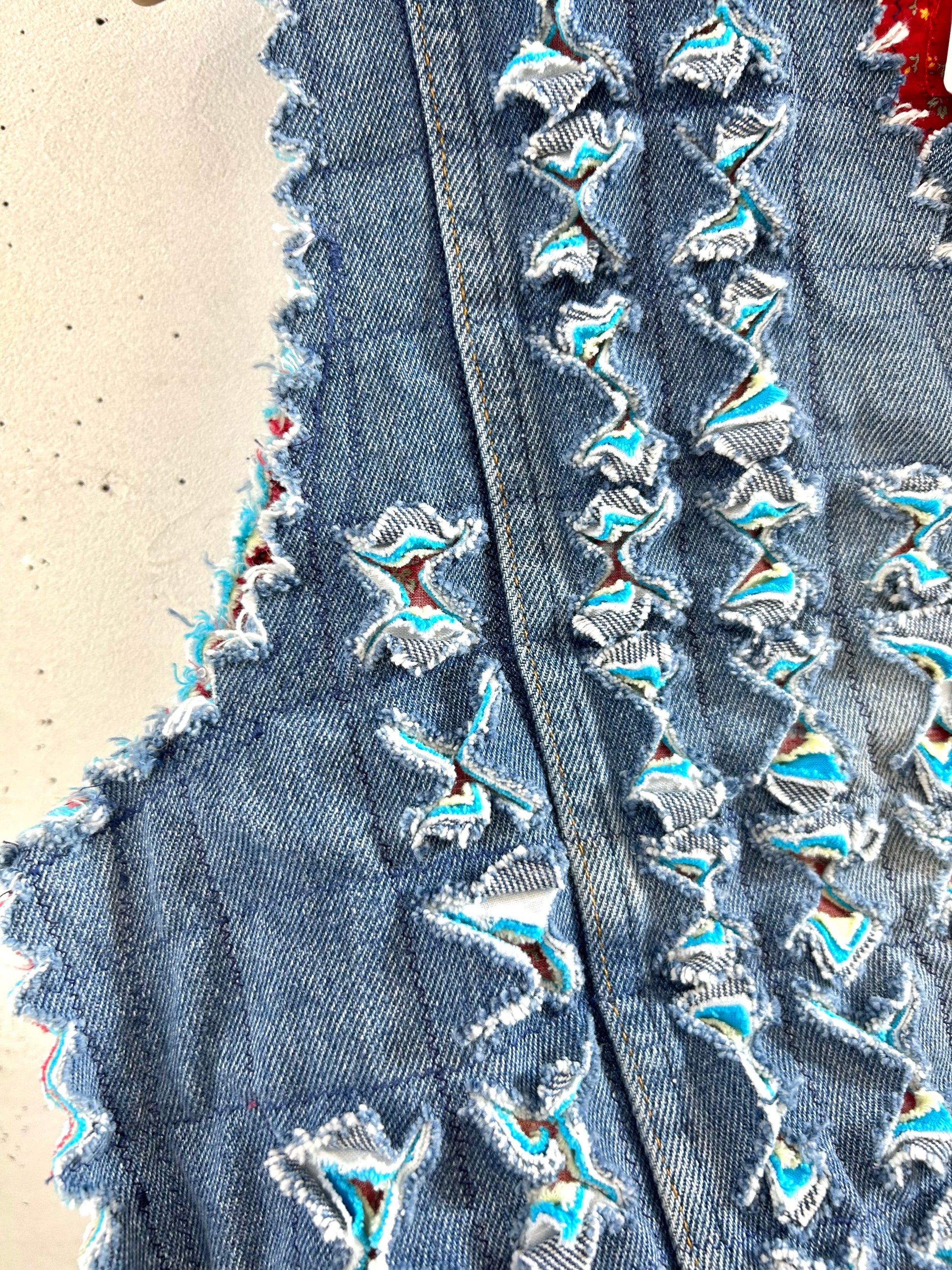 カラフルな生地を折り重ねたスラッシュキルトが色落ちされたデニムボディカラーに映えるアイテム。