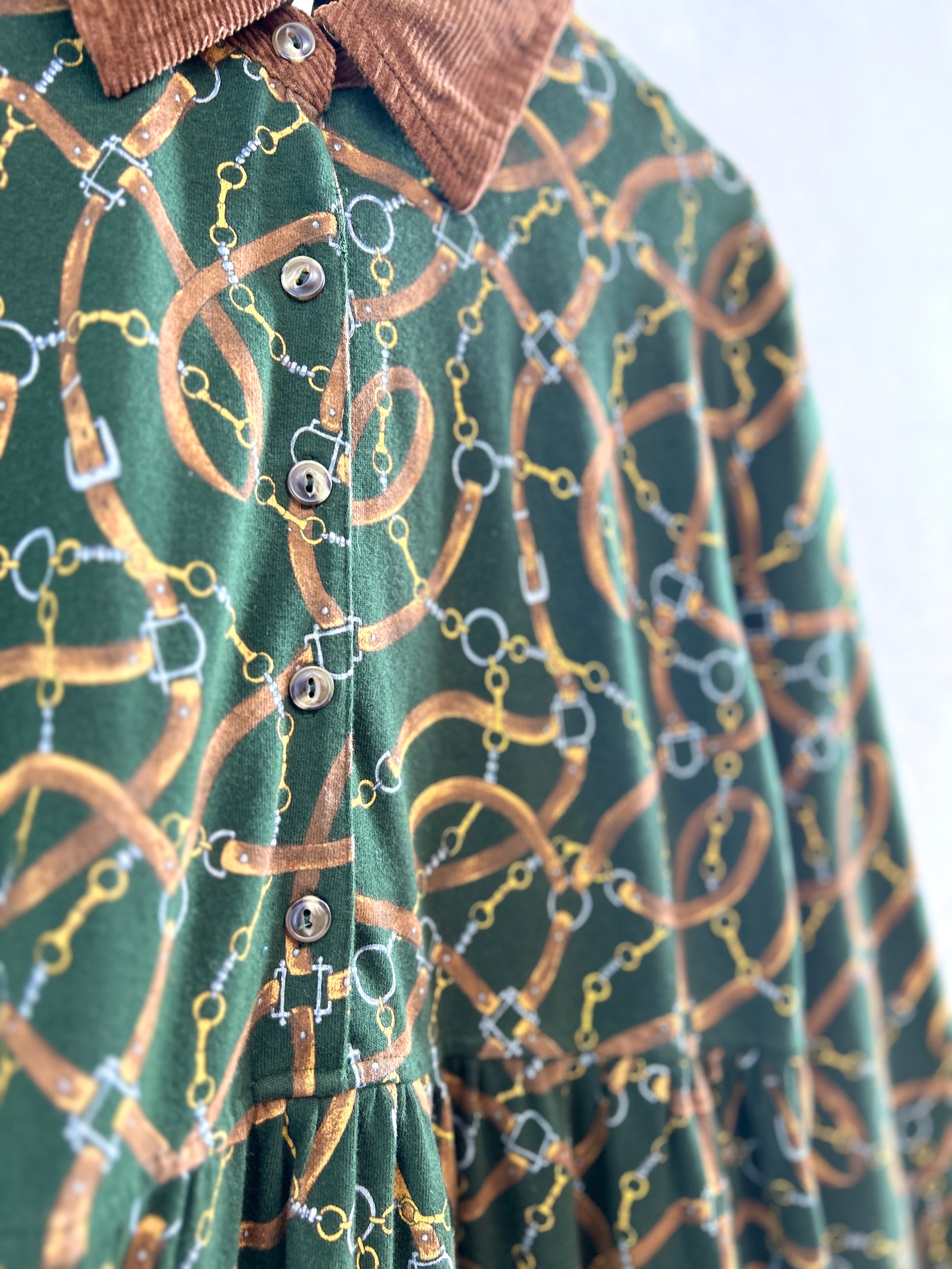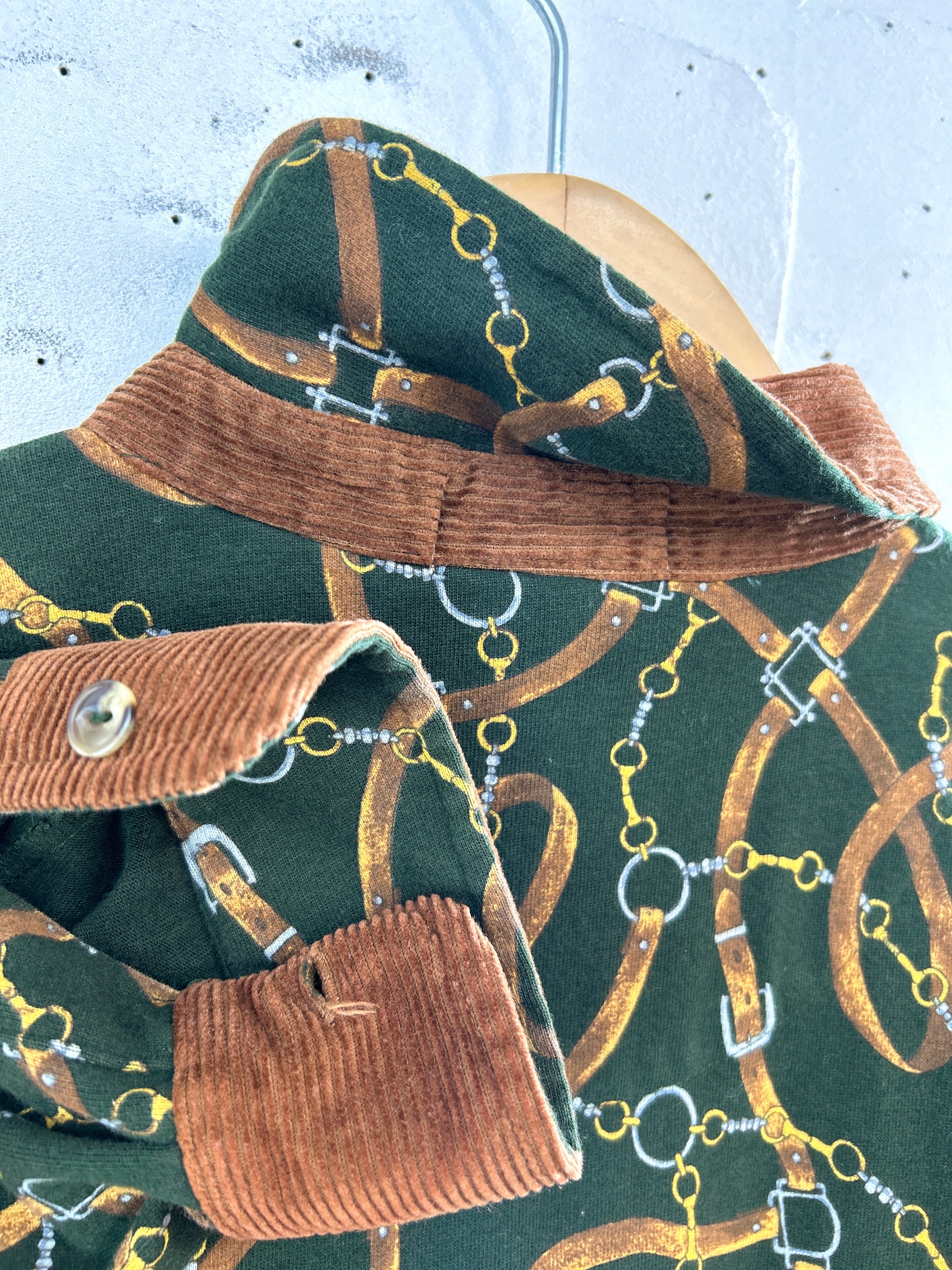 ストレッチの効いた優しい肌触りの生地には、レザーベルトとチェーンの柄が描かれていて、大人インテージな雰囲気です。