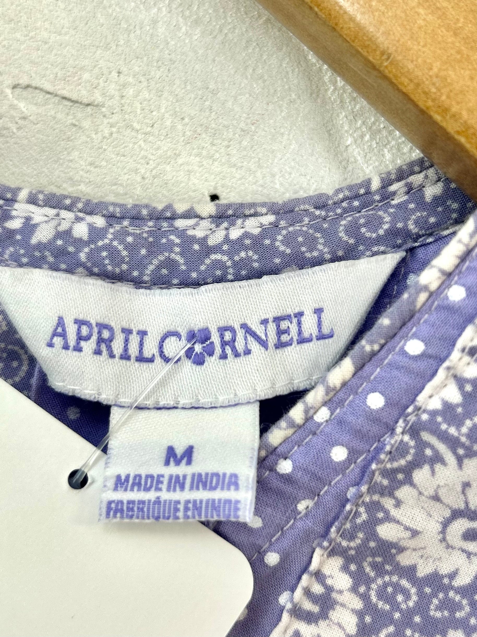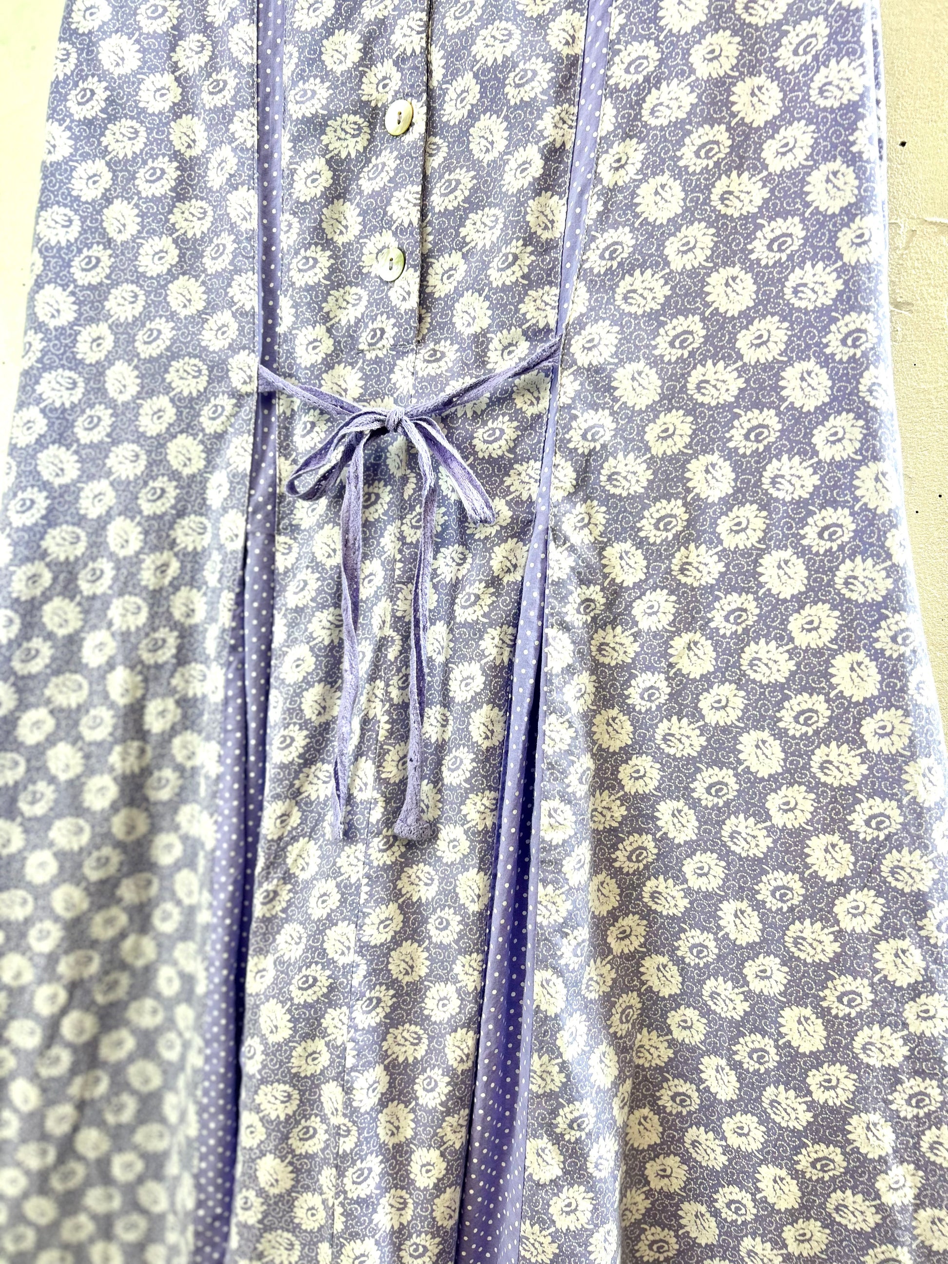 淡いパープルの花柄とドットの切り替えを使ったパターンが独特な雰囲気で素敵な一着。