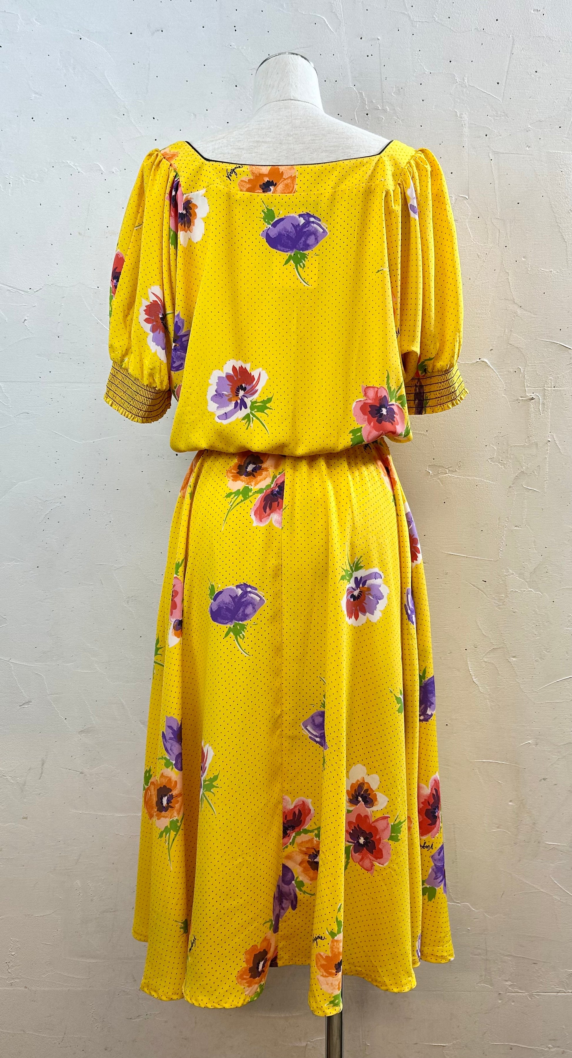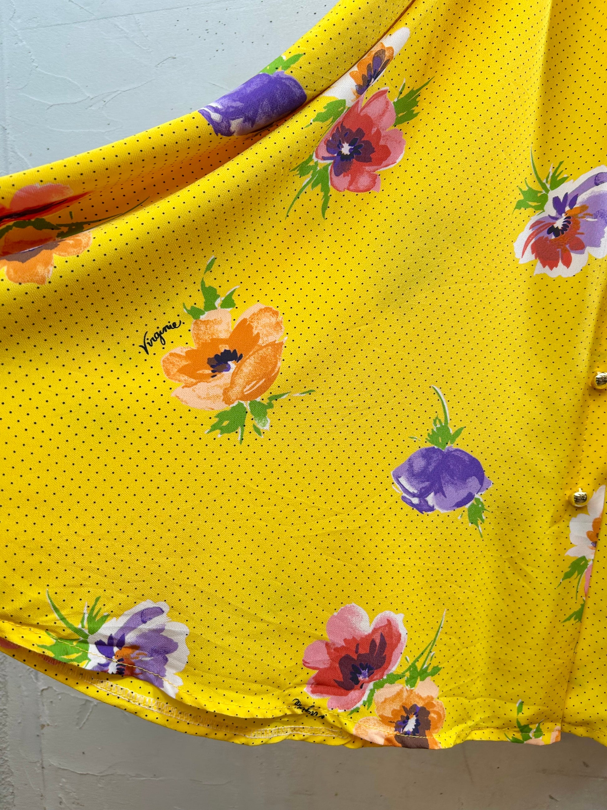 パキッとしたカラーリングとピンドットとフラワーの組み合わせが可愛い一着。