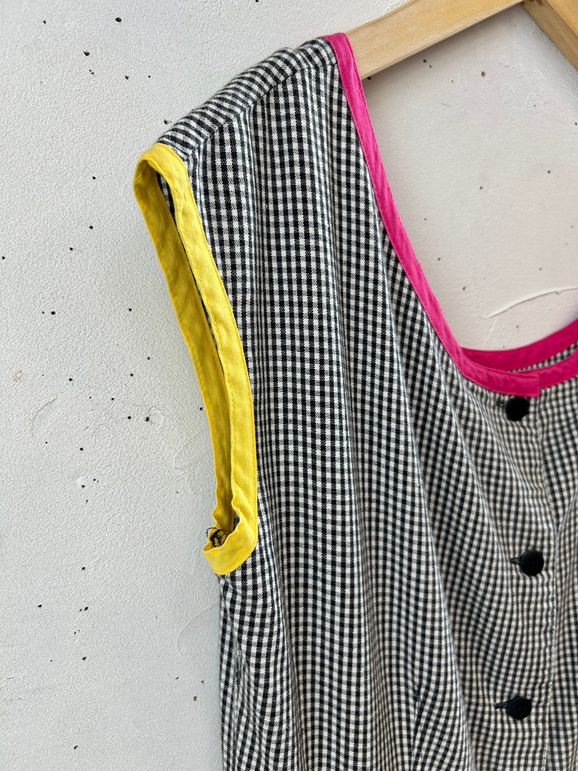 モノトーンのギンガムチェックボディに、3色のパイピングがポイントになった遊び心溢れる一着。