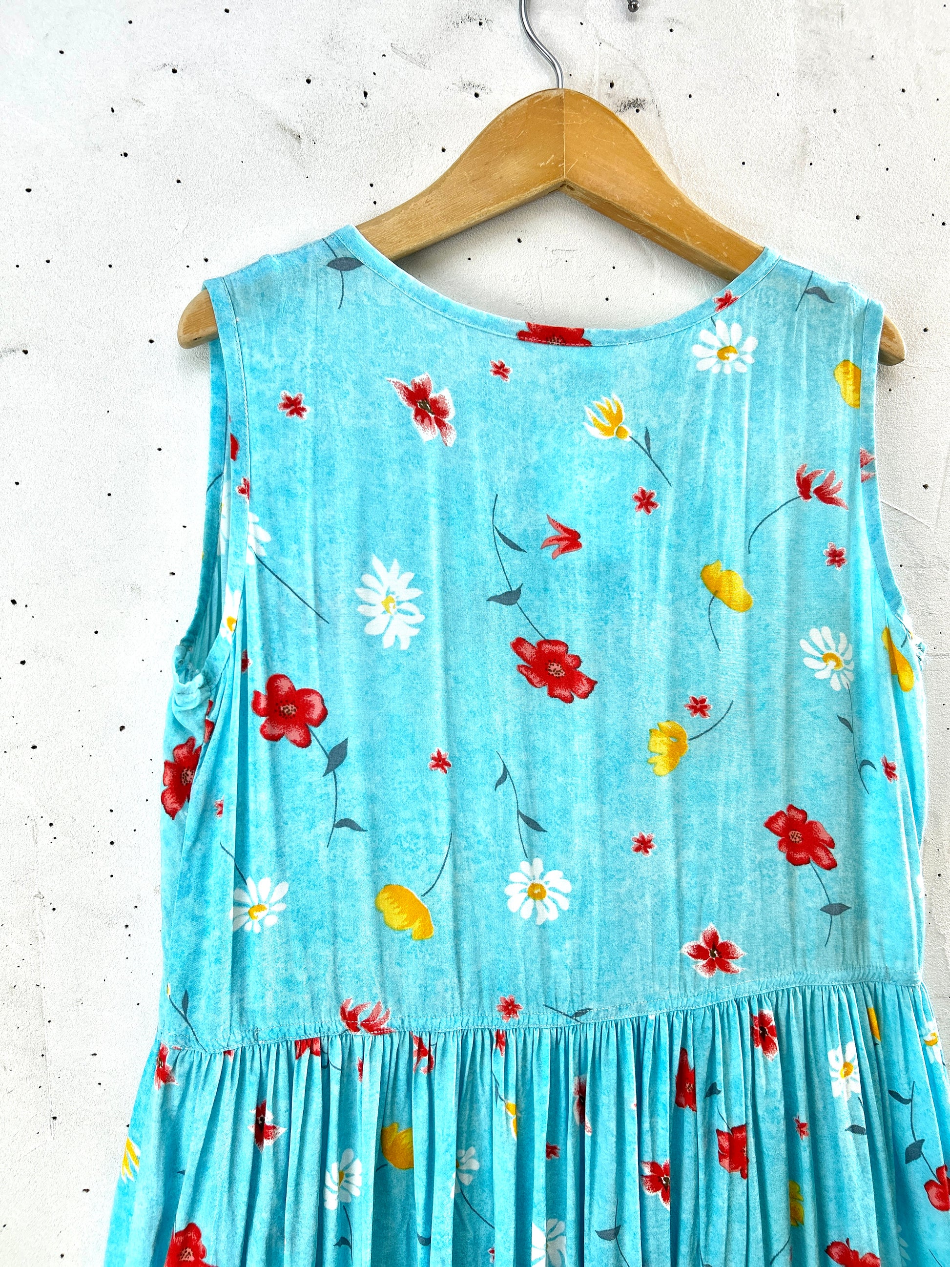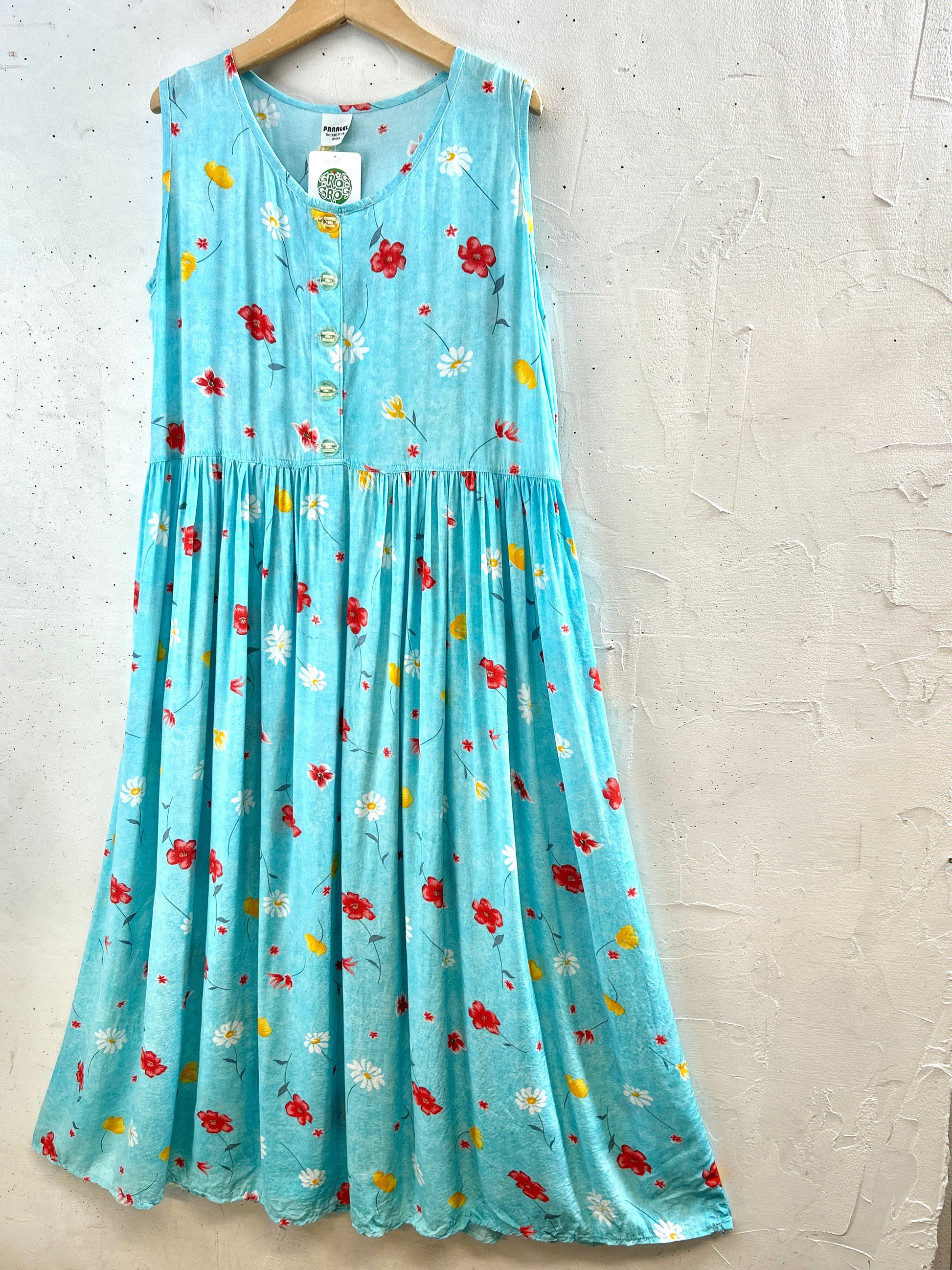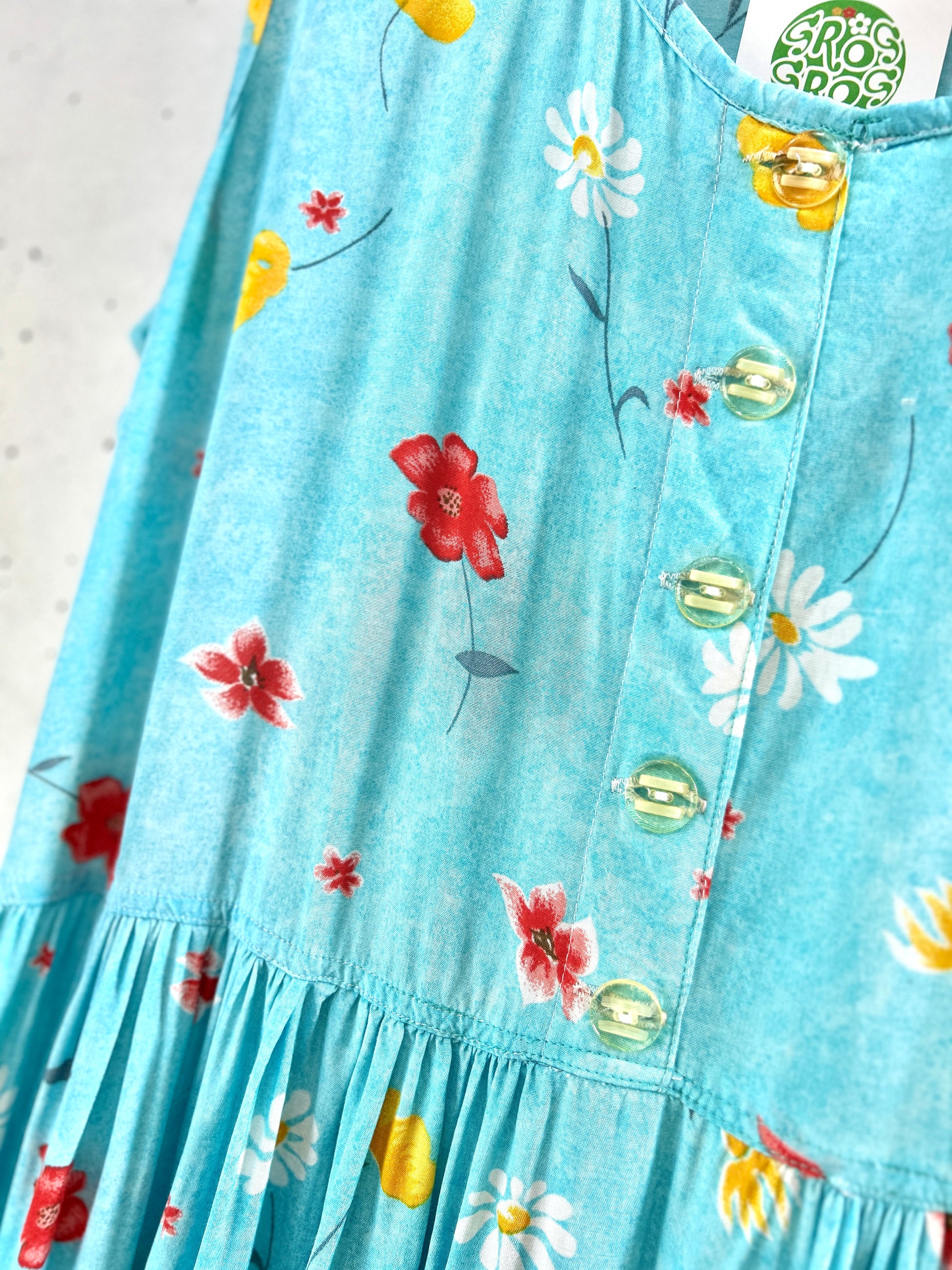 青空からフラワーシャワーを浴びているような、スカイブルーベースの花柄がとても爽やかな1着。