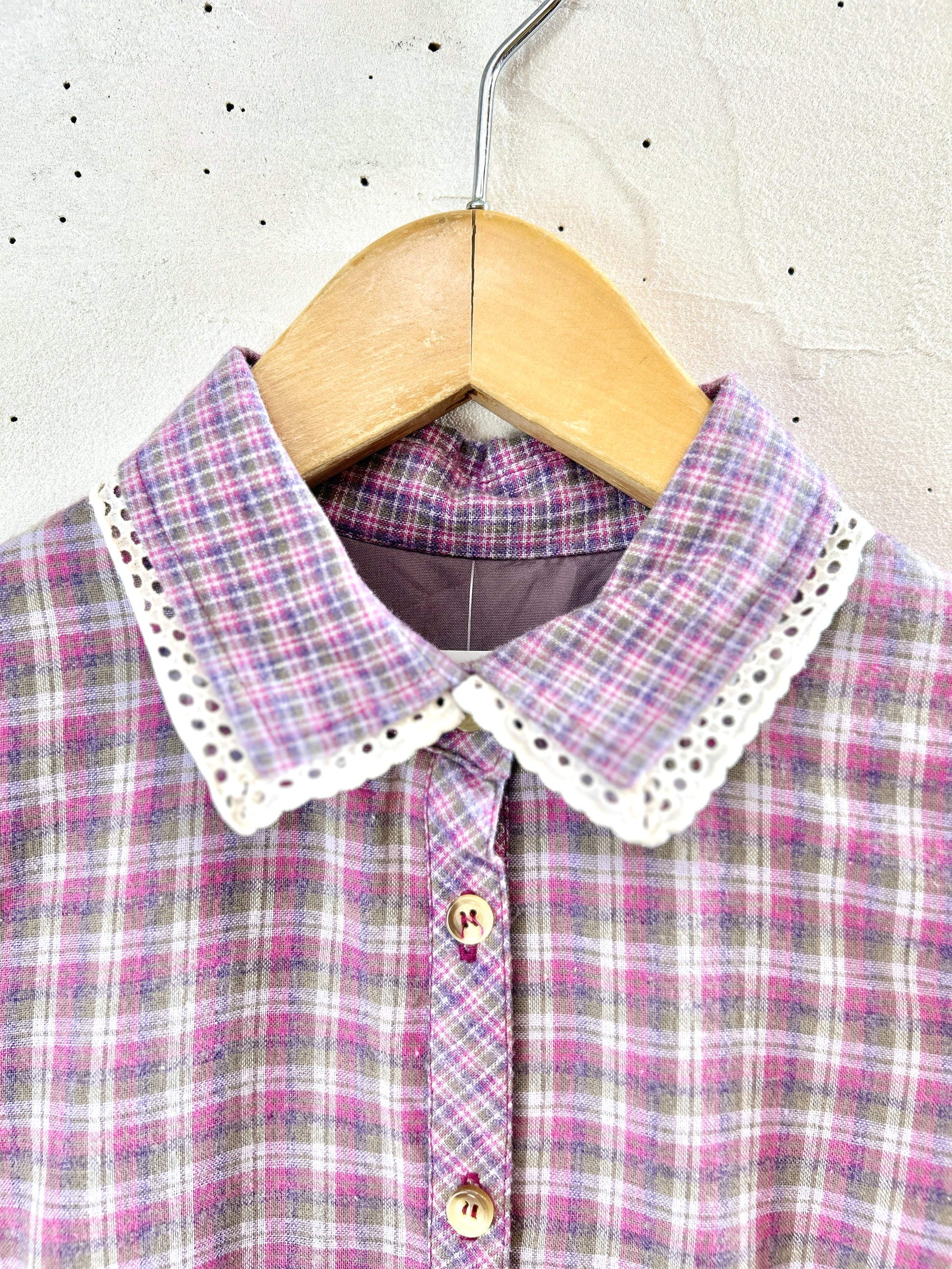 襟を縁取るレースや2種類のチェック、ウエストリボンなど細部までのこだわりを感じさせてくれます。