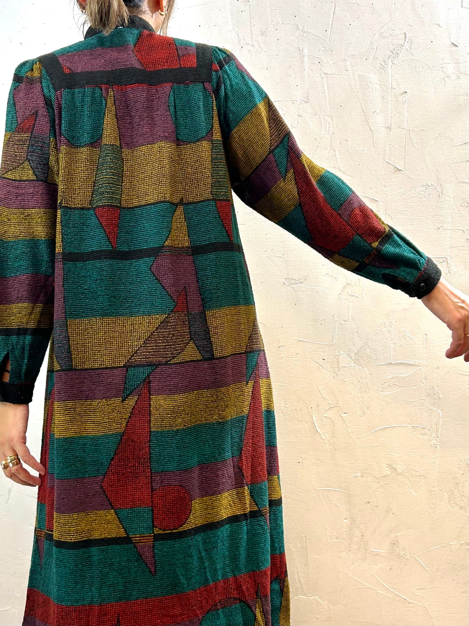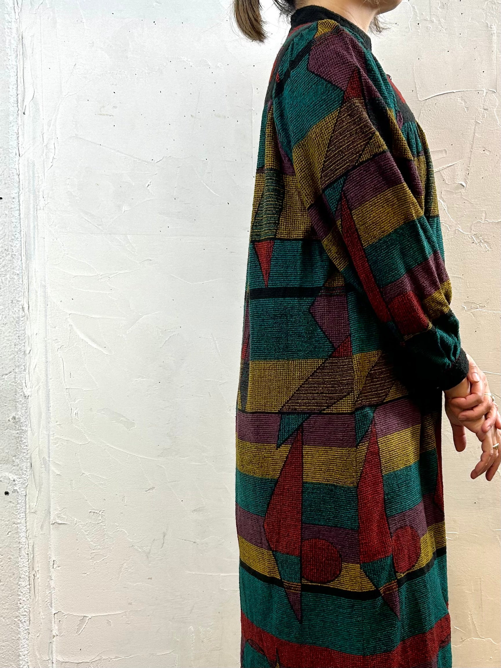 マットな色使いの幾何学柄が印象的なデザインの1着。