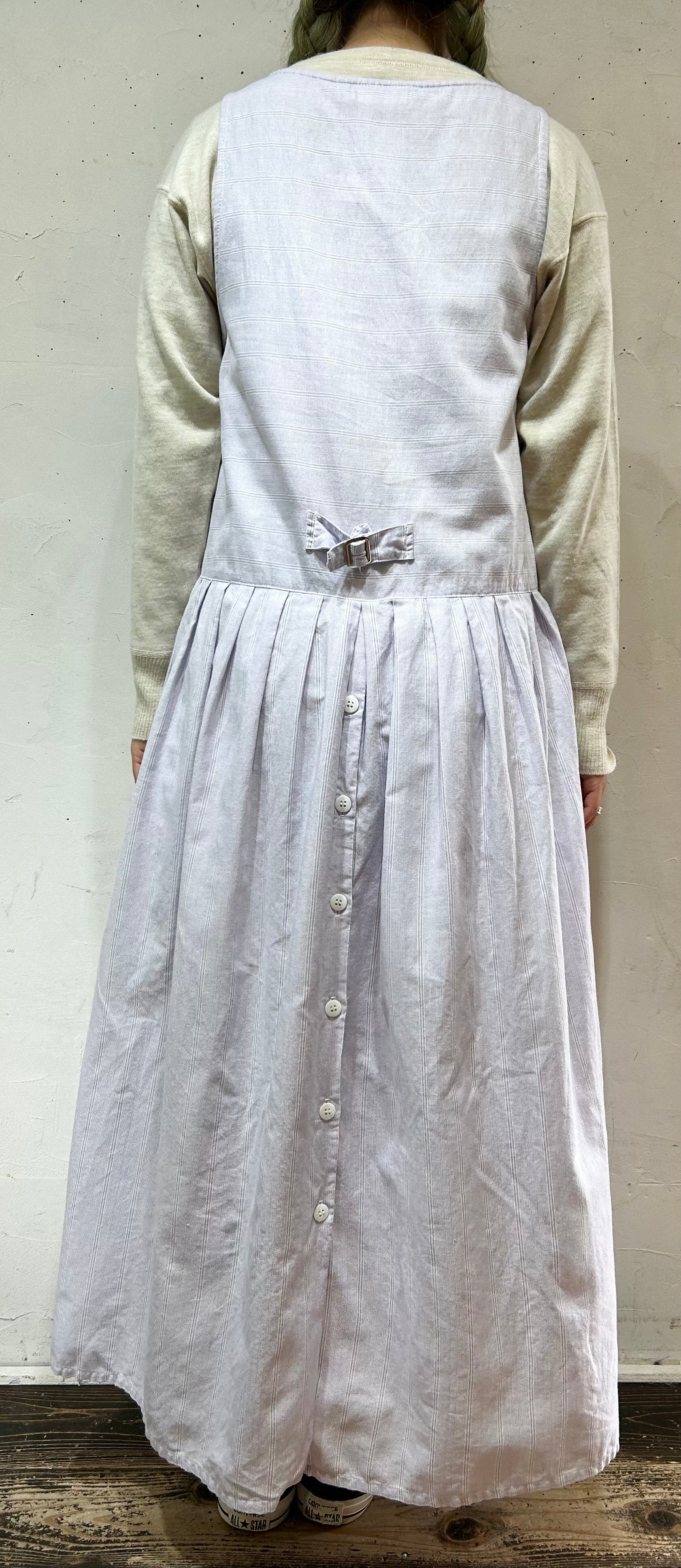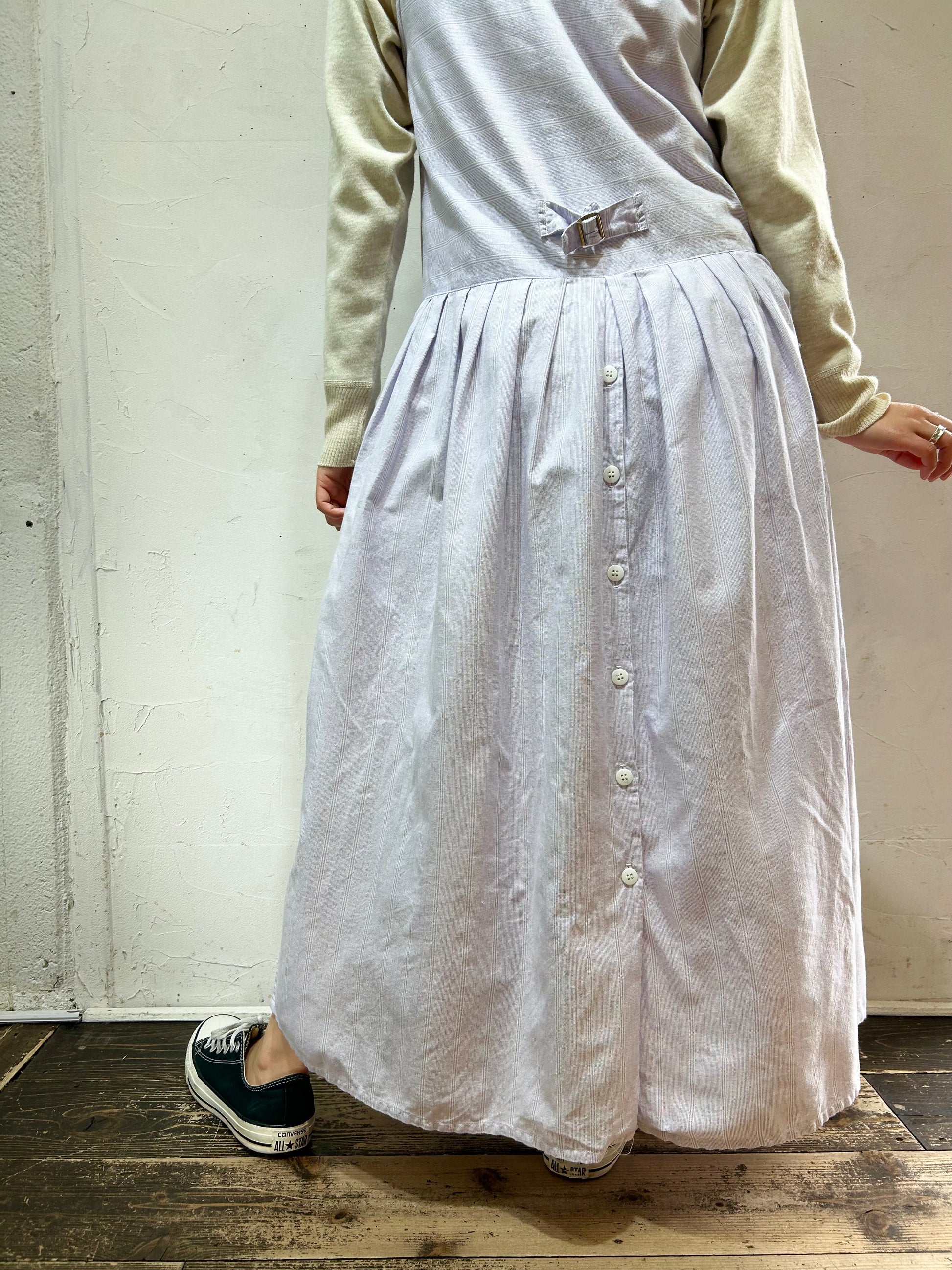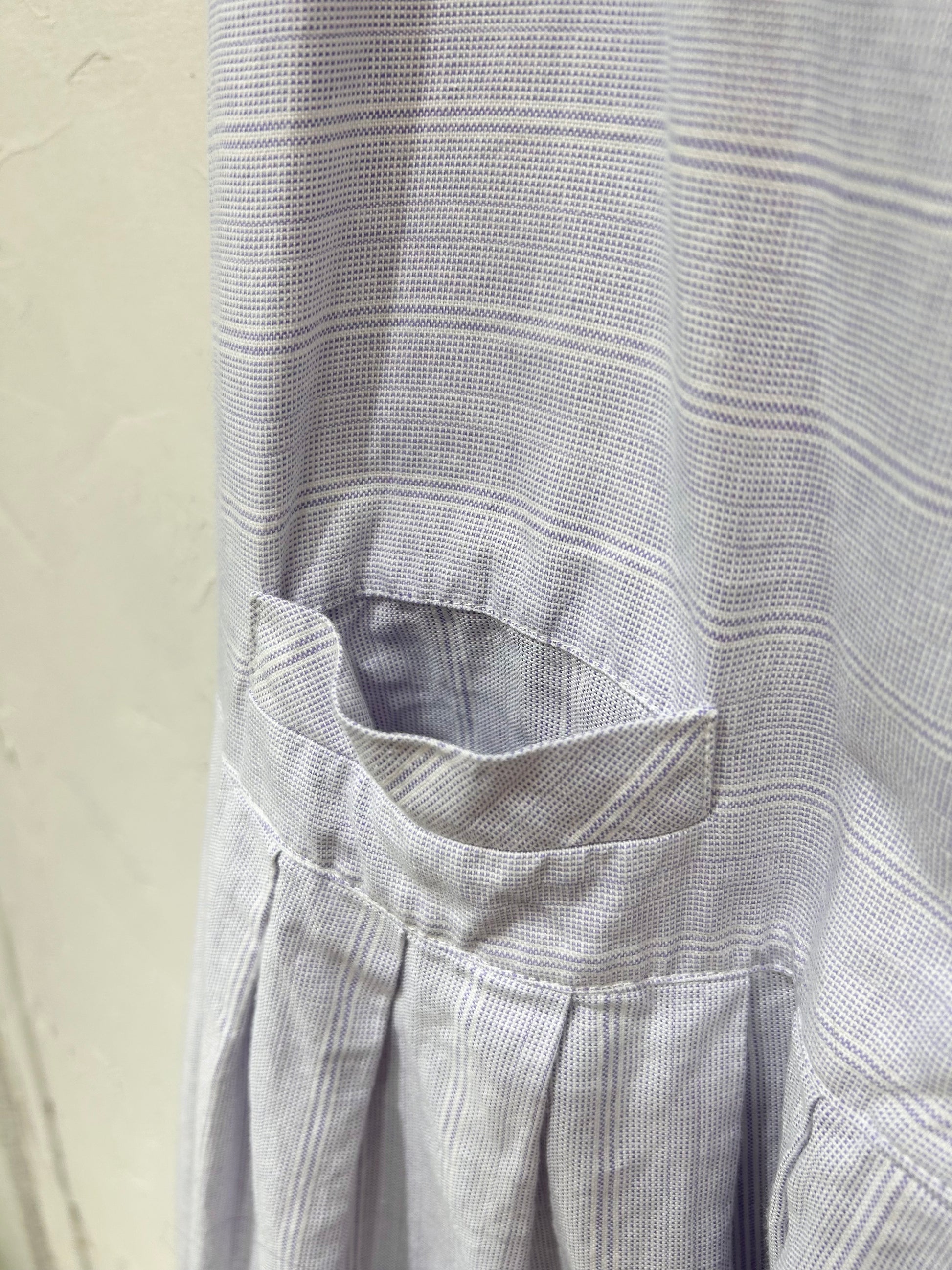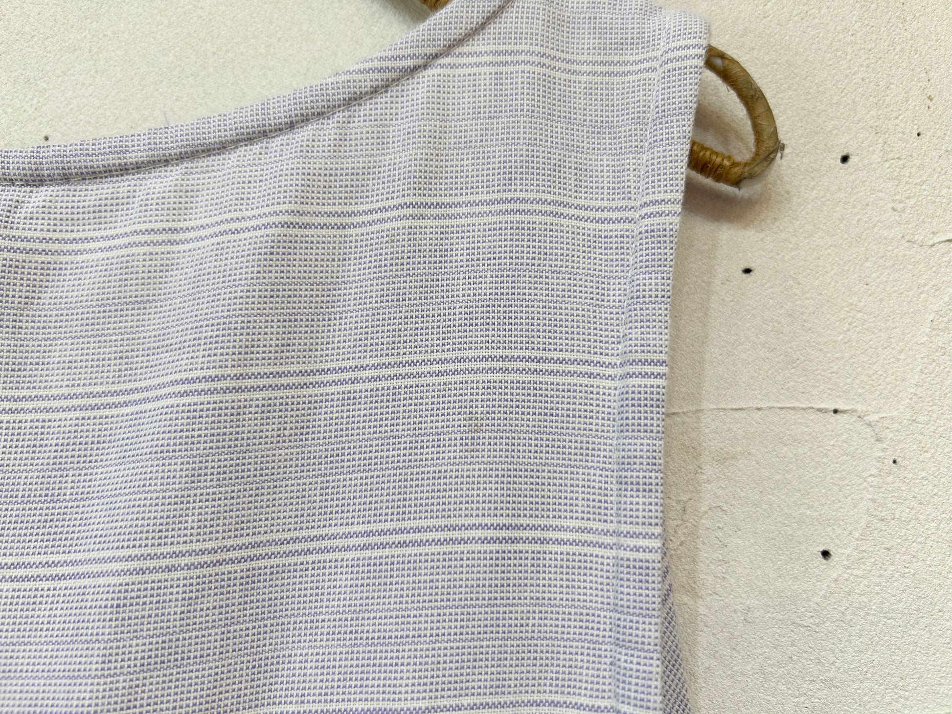 淡いパープルとホワイトカラーのボーダードレス。フロントトップにボタン、後ろスカートにもボタンがつく面白いデザインのアイテム。