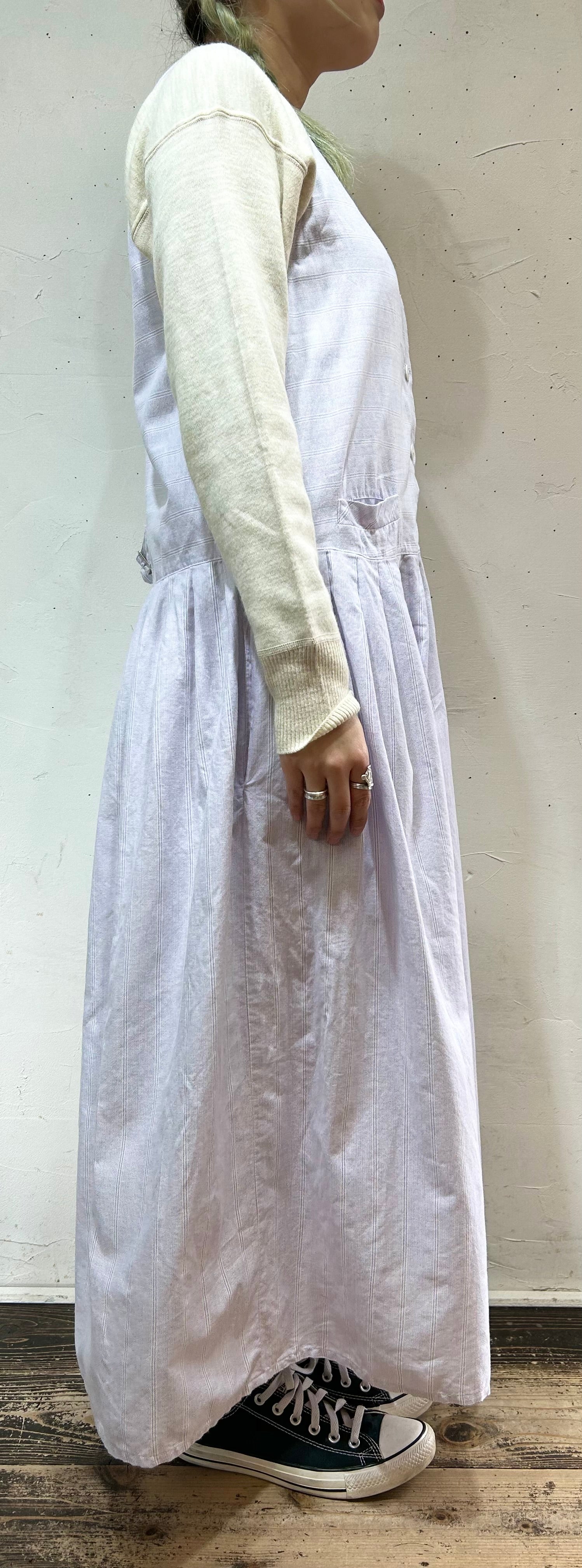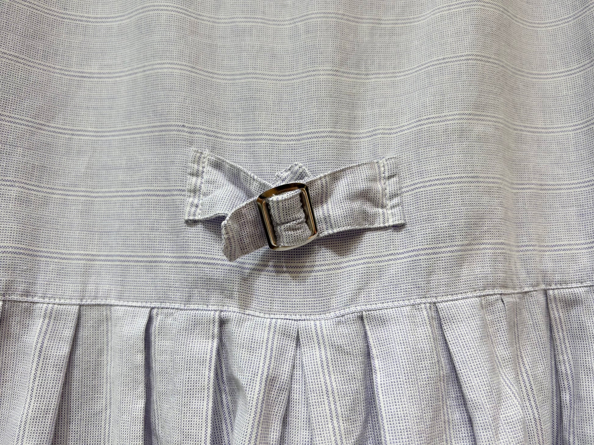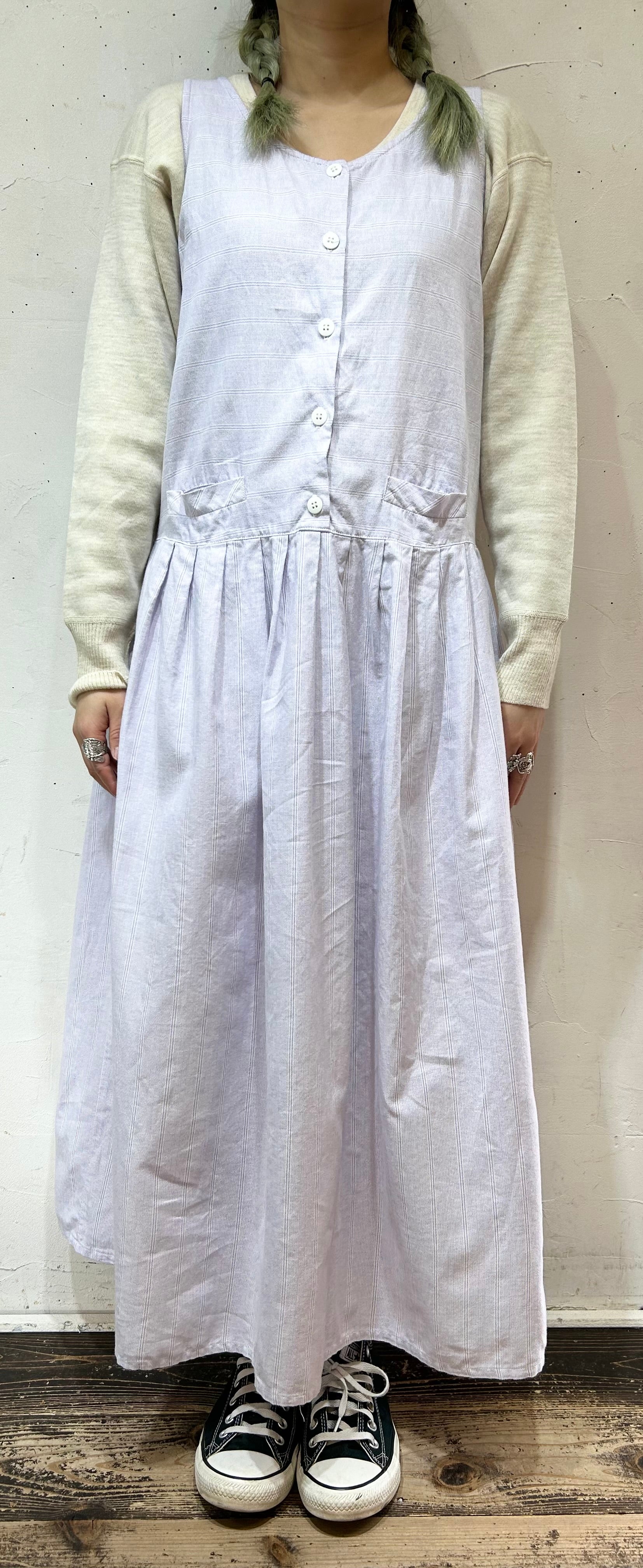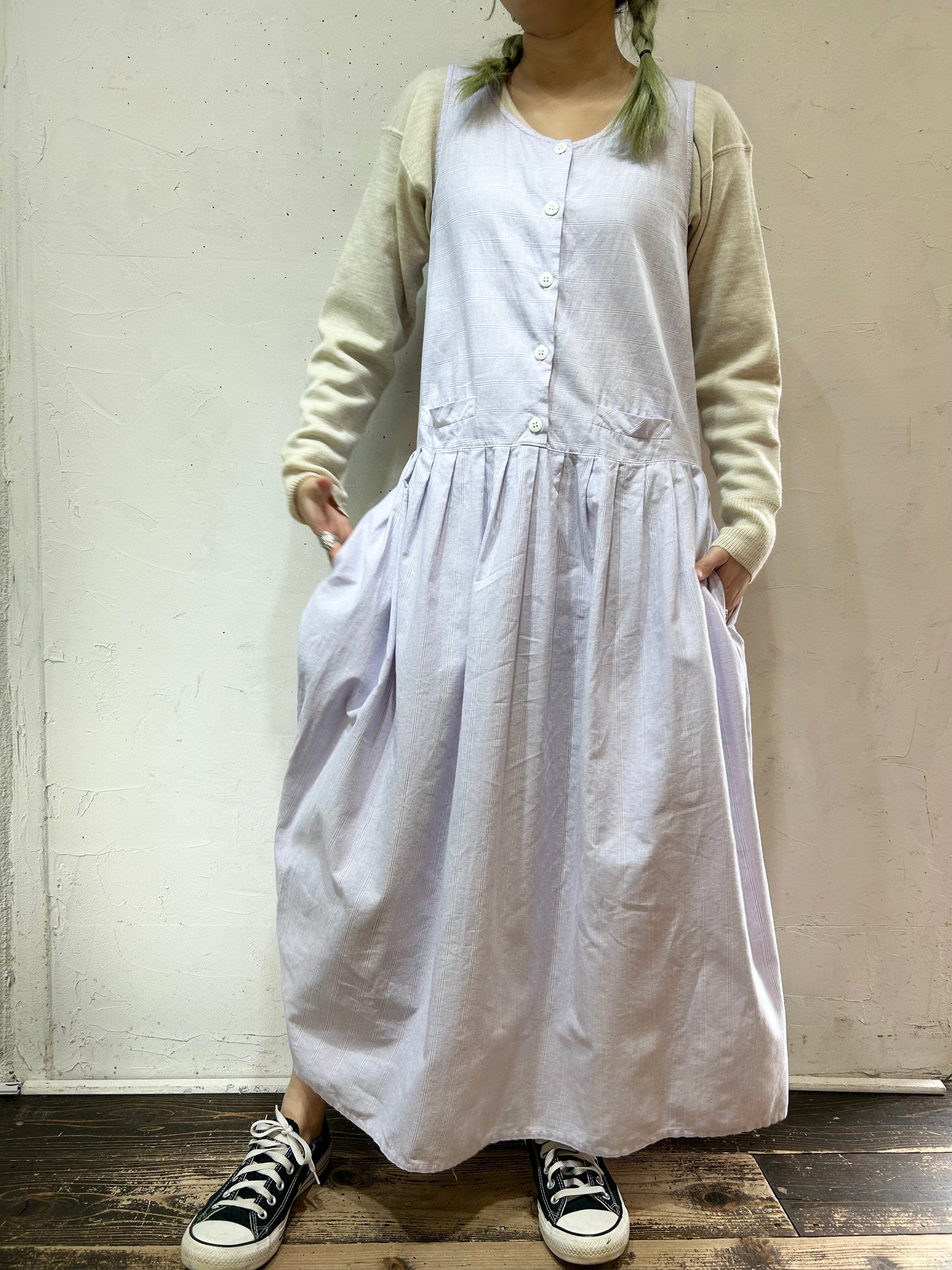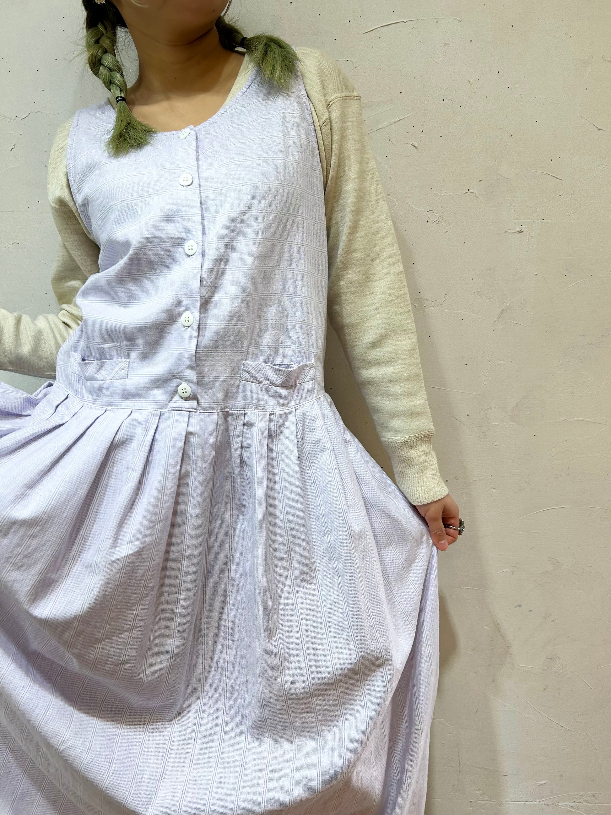 淡いパープルとホワイトカラーのボーダードレス。フロントトップにボタン、後ろスカートにもボタンがつく面白いデザインのアイテム。