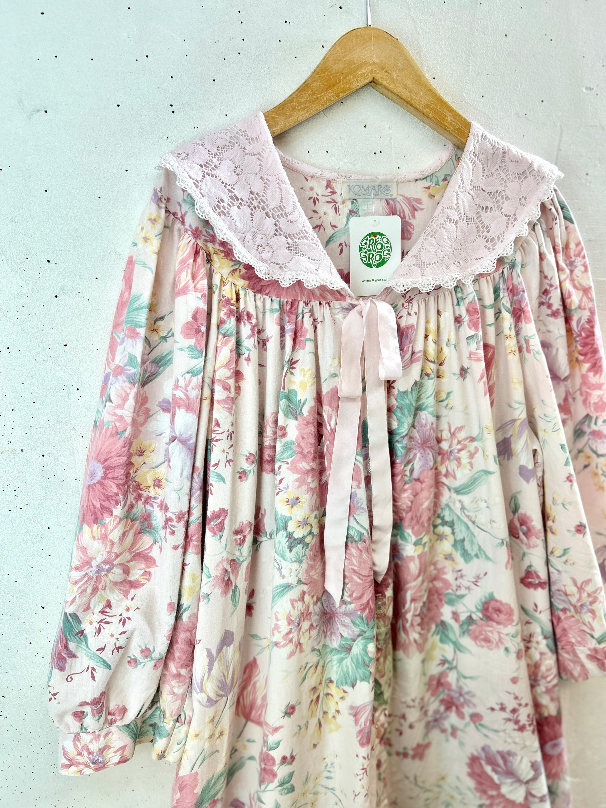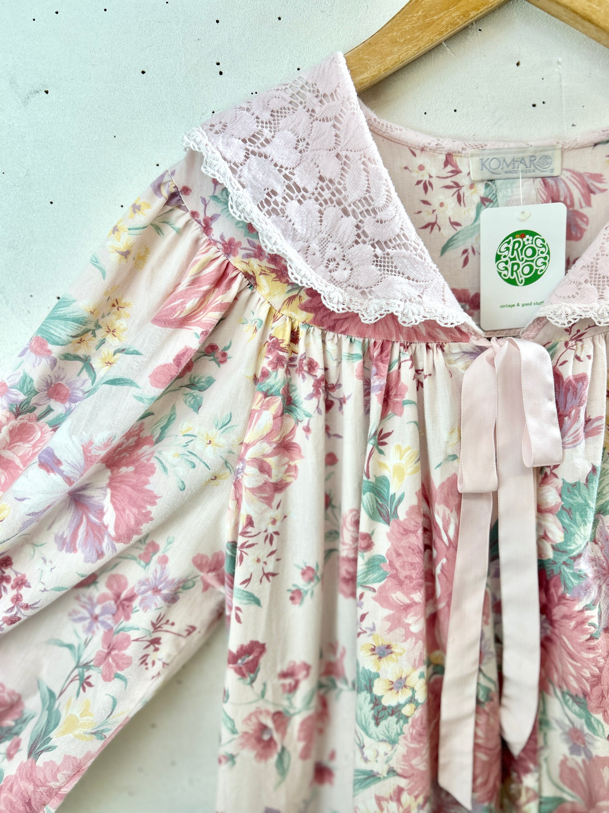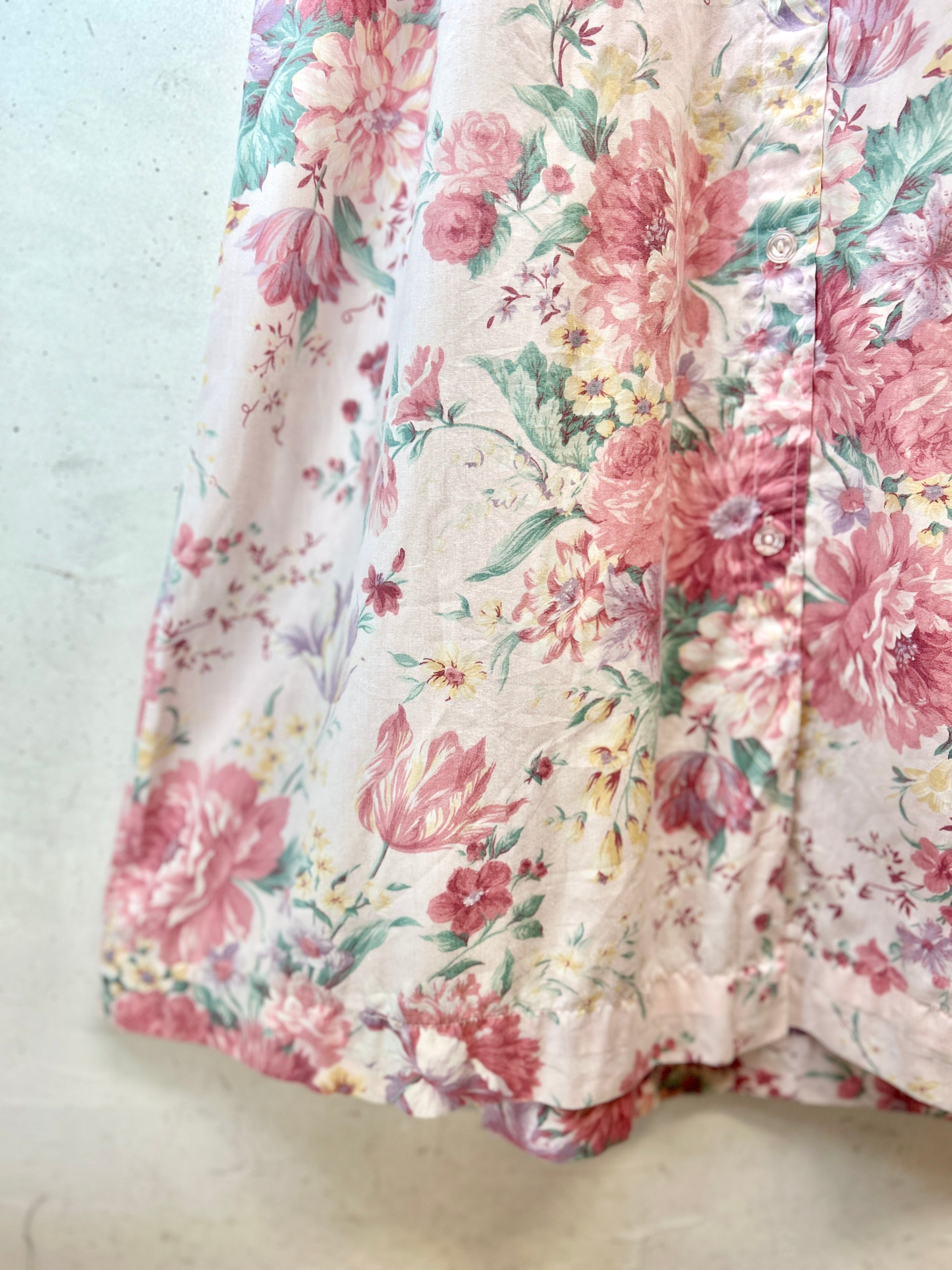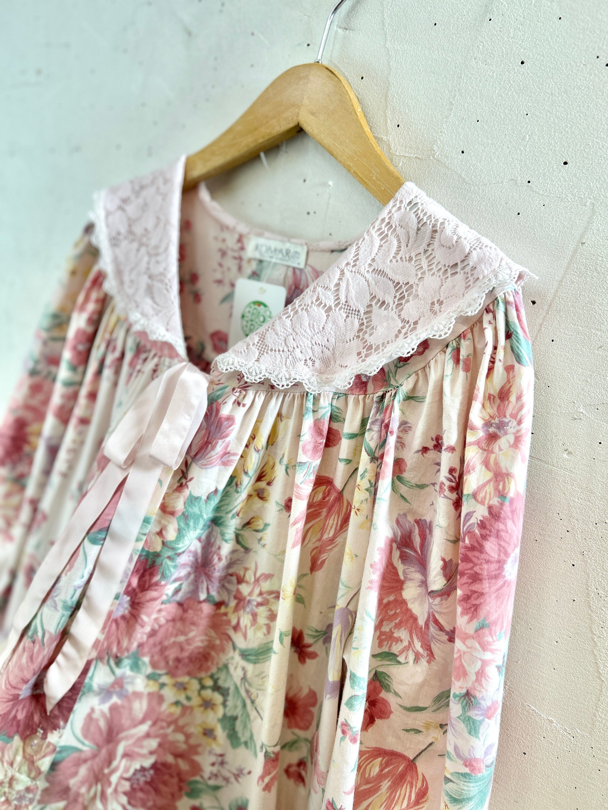 大柄のフラワーパターンと、ピンクのレース襟が印象的な1着。