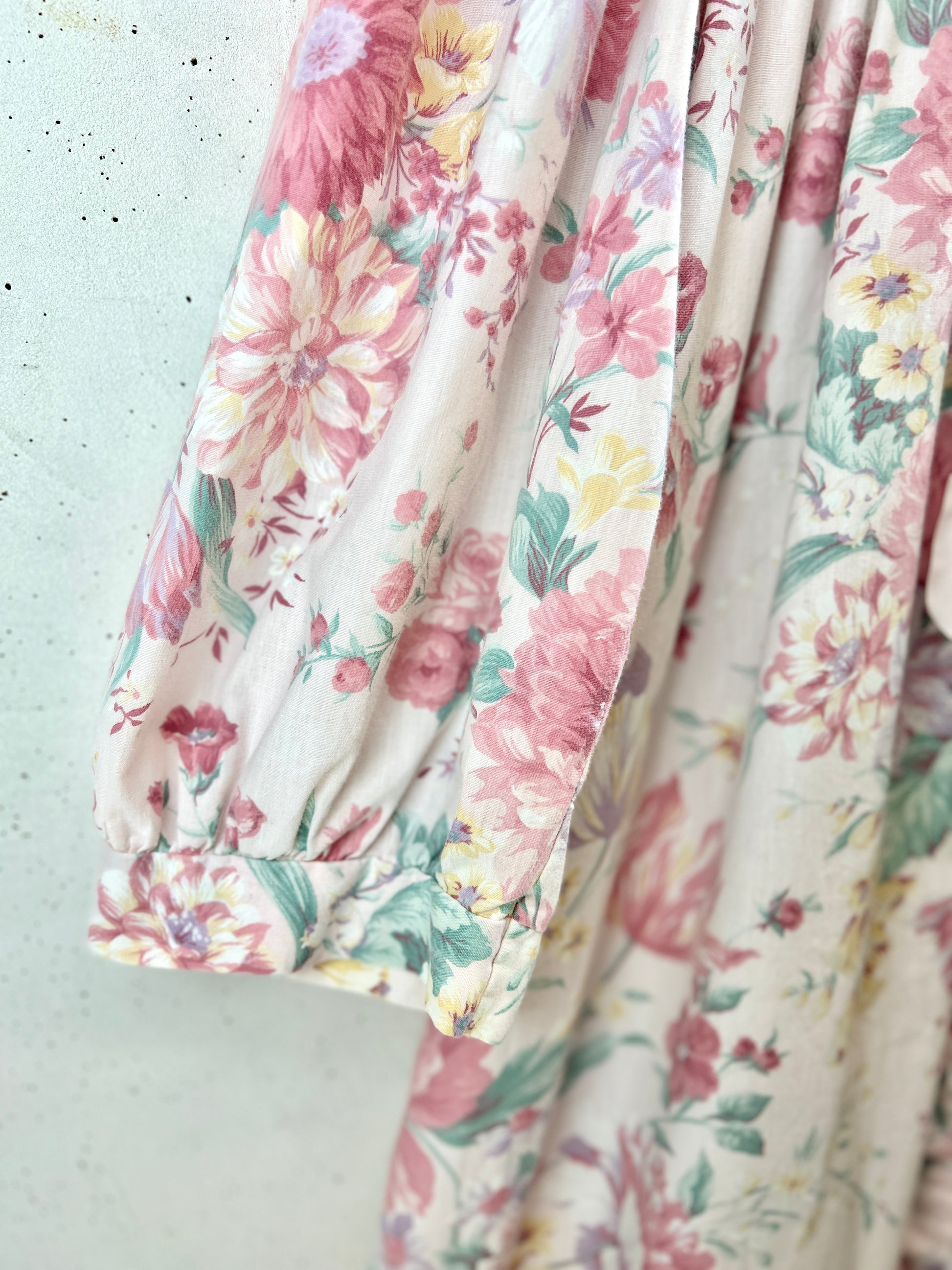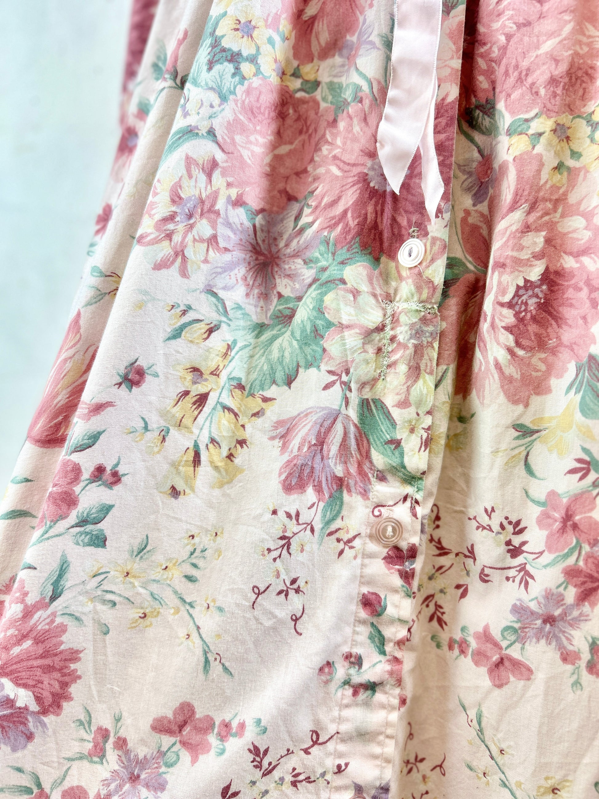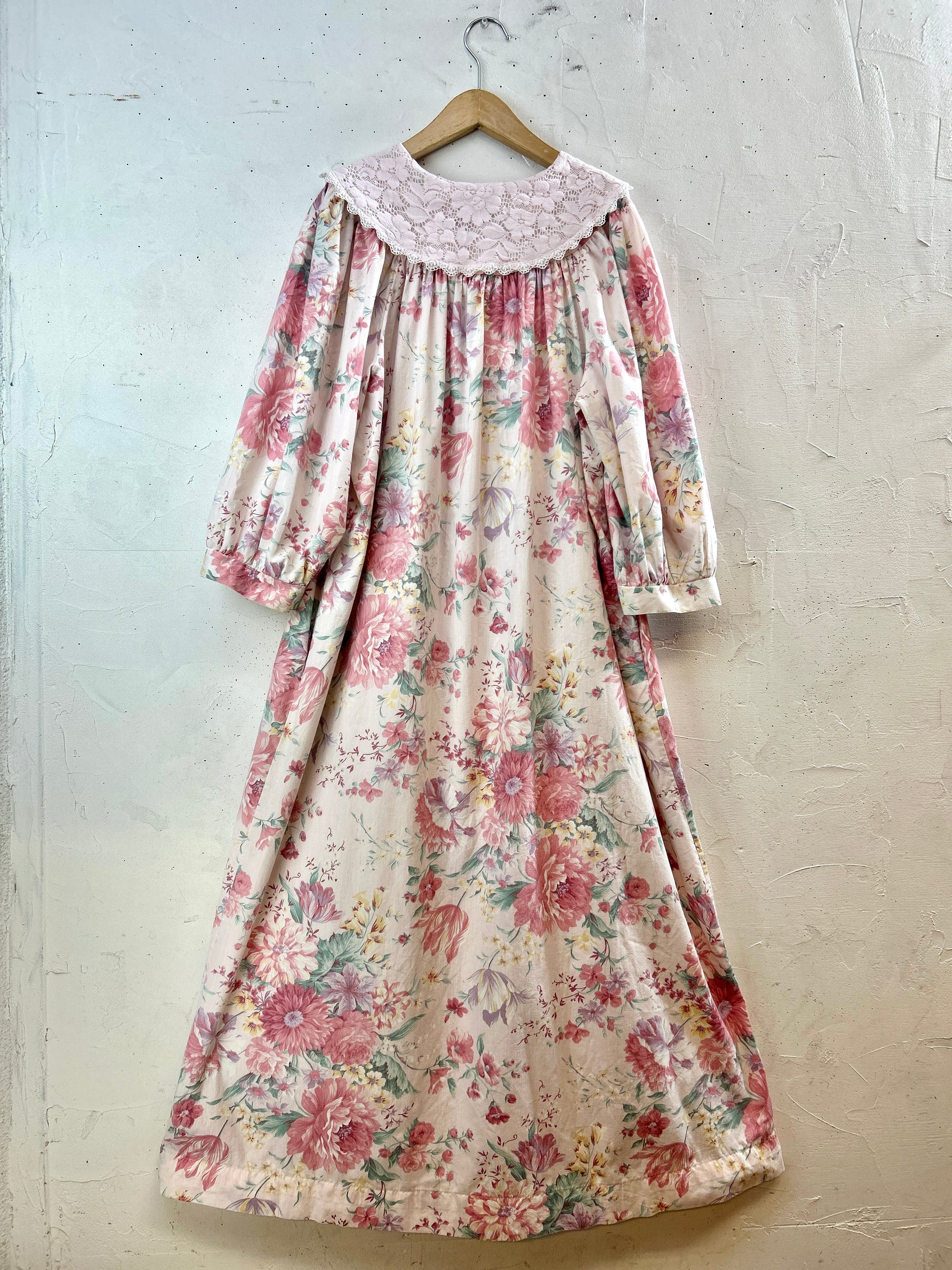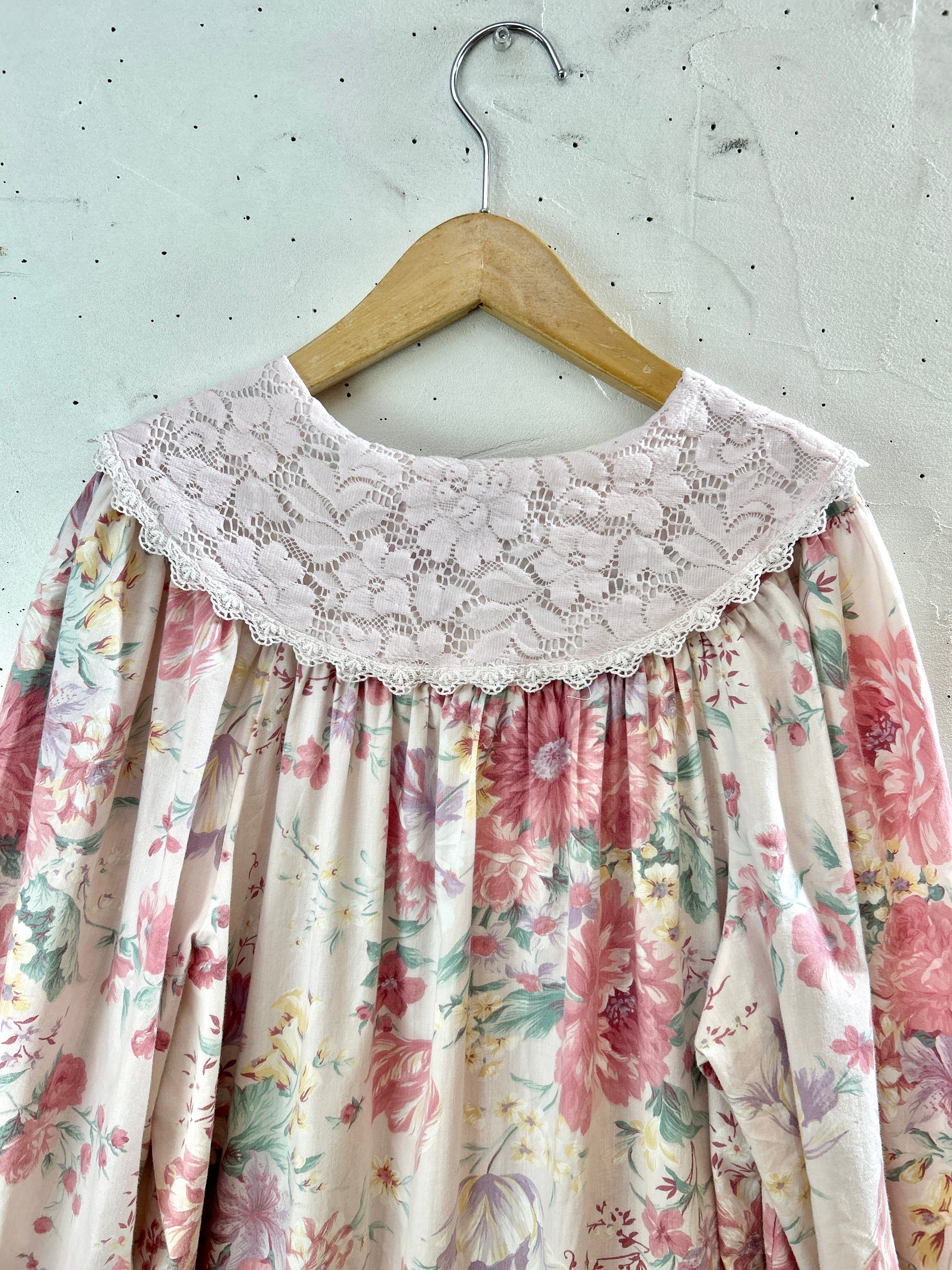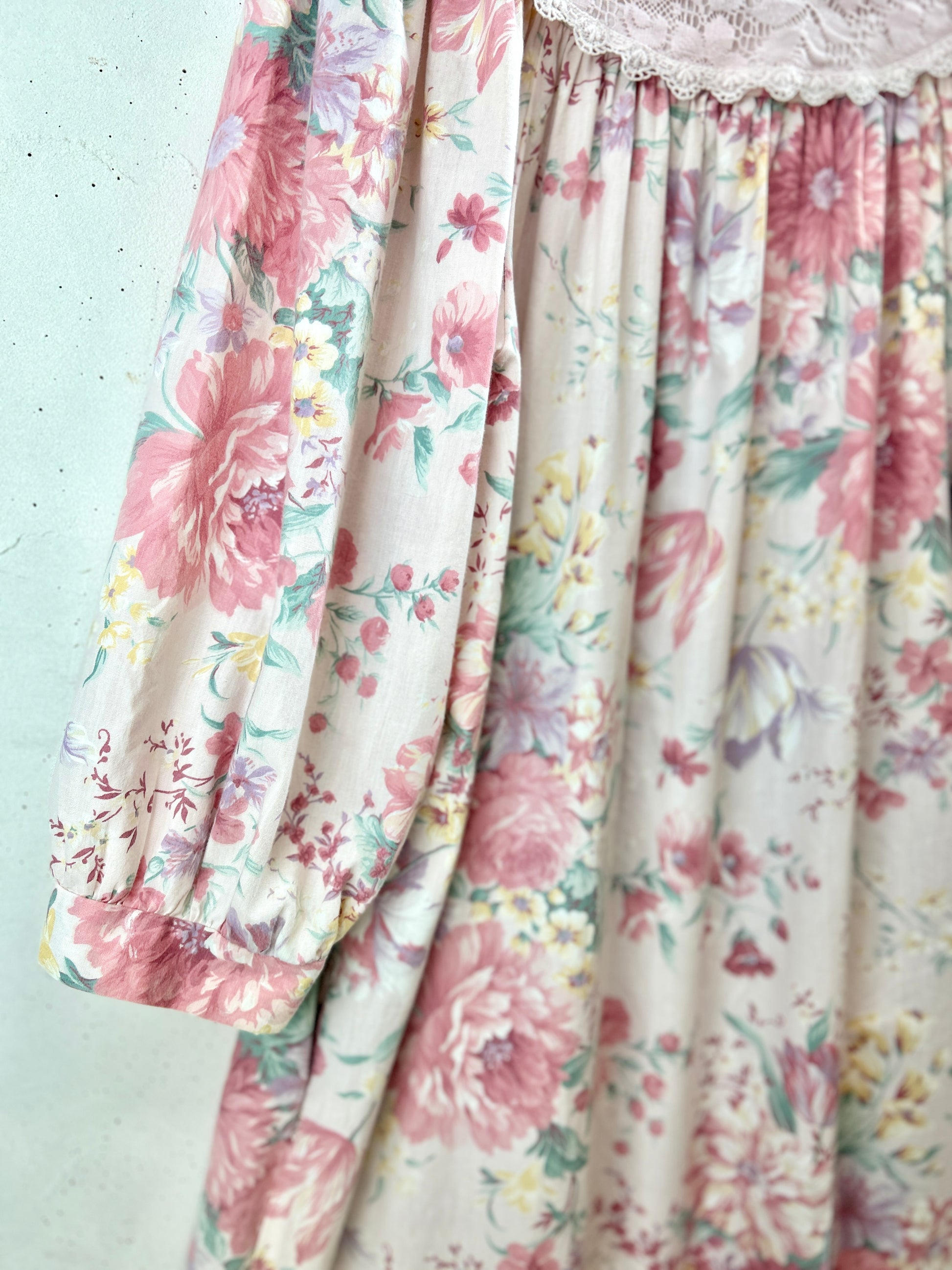 大柄のフラワーパターンと、ピンクのレース襟が印象的な1着。