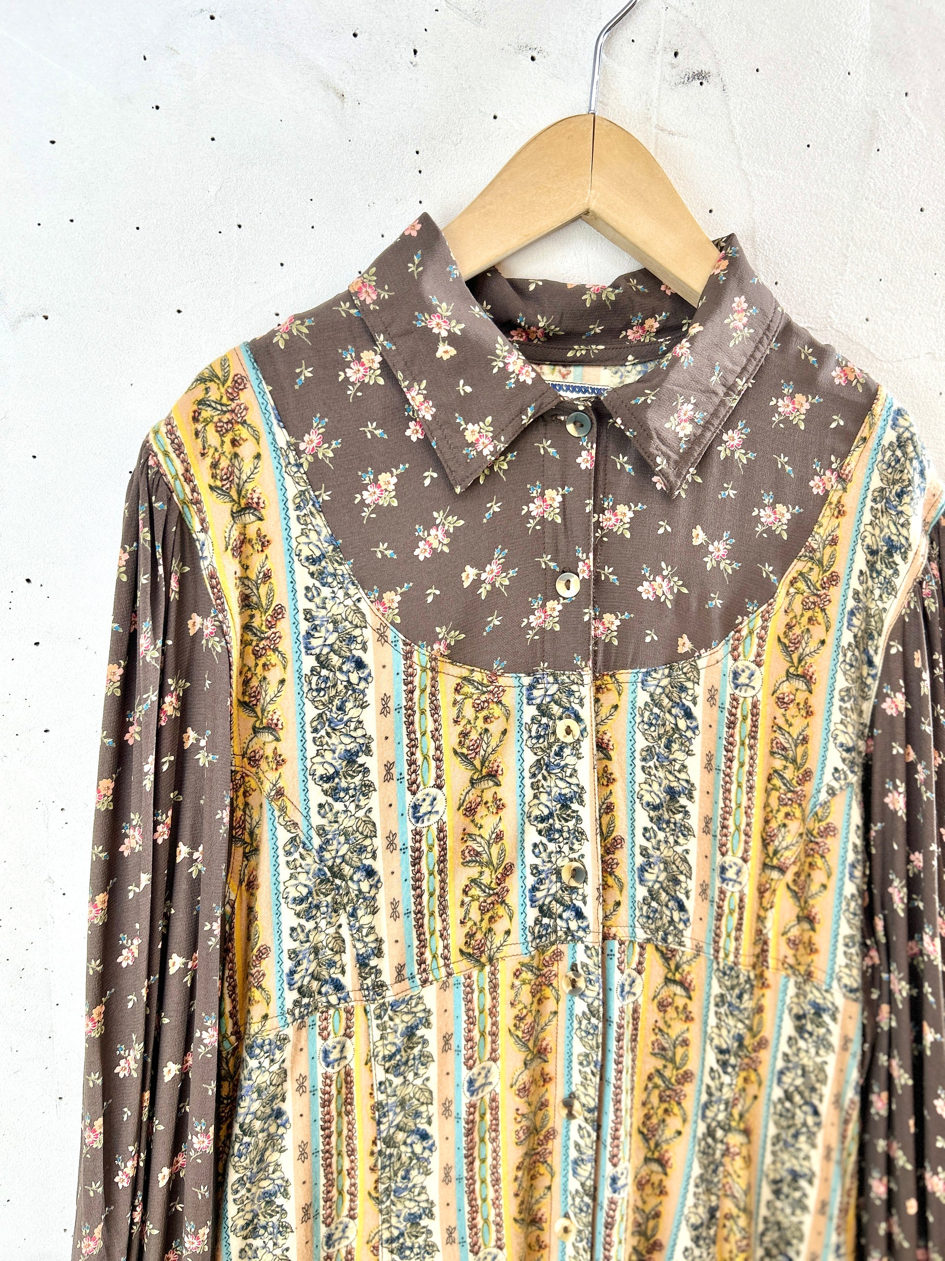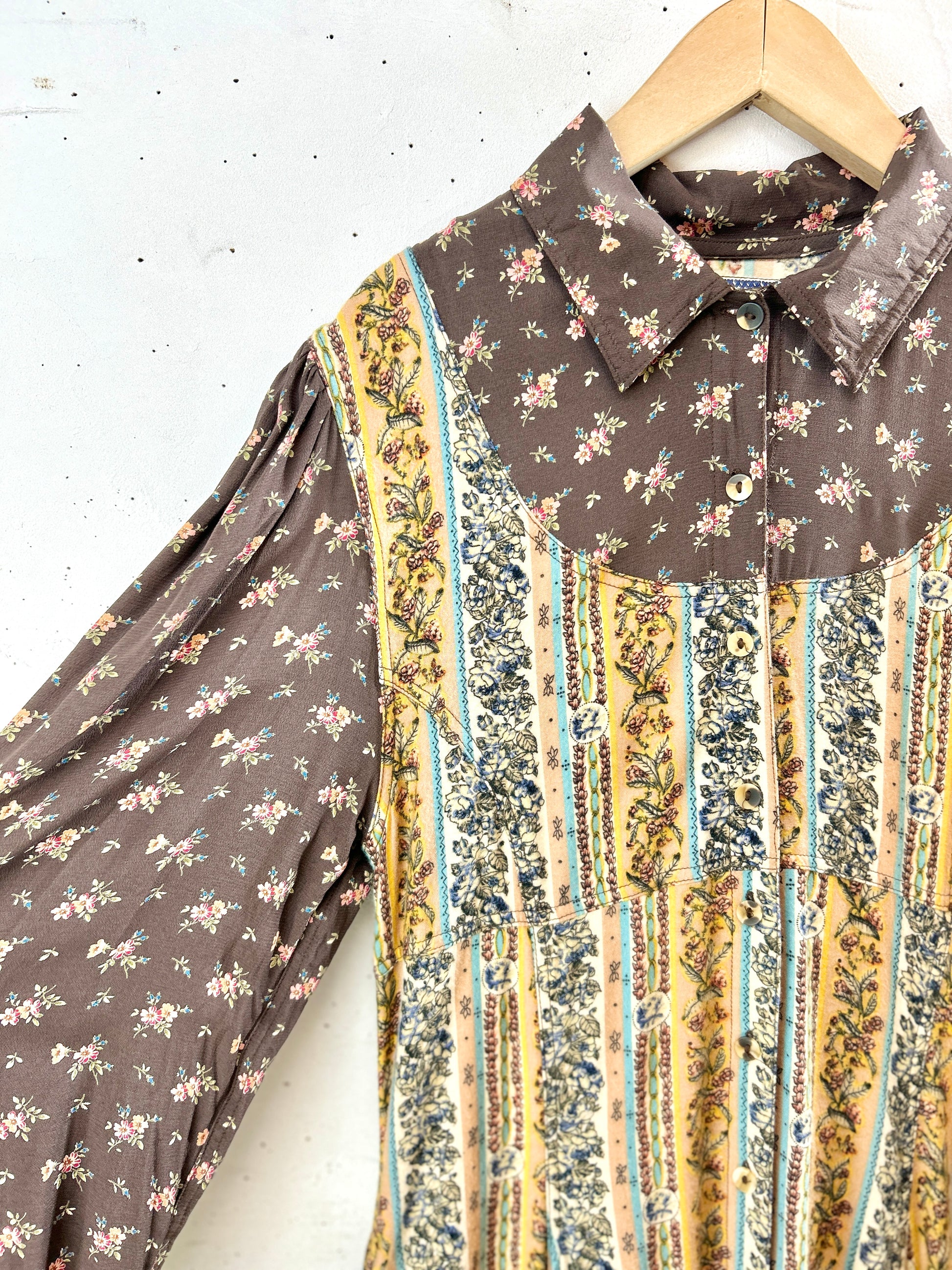 ブラウンの花柄ブラウスにノースリーブをコーディネートしたデザインになっていて、デザイン性の高さが魅力的です。