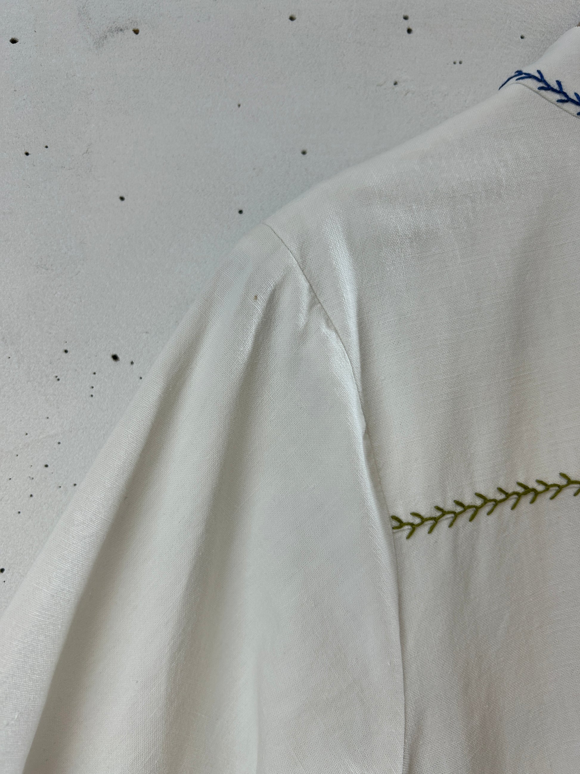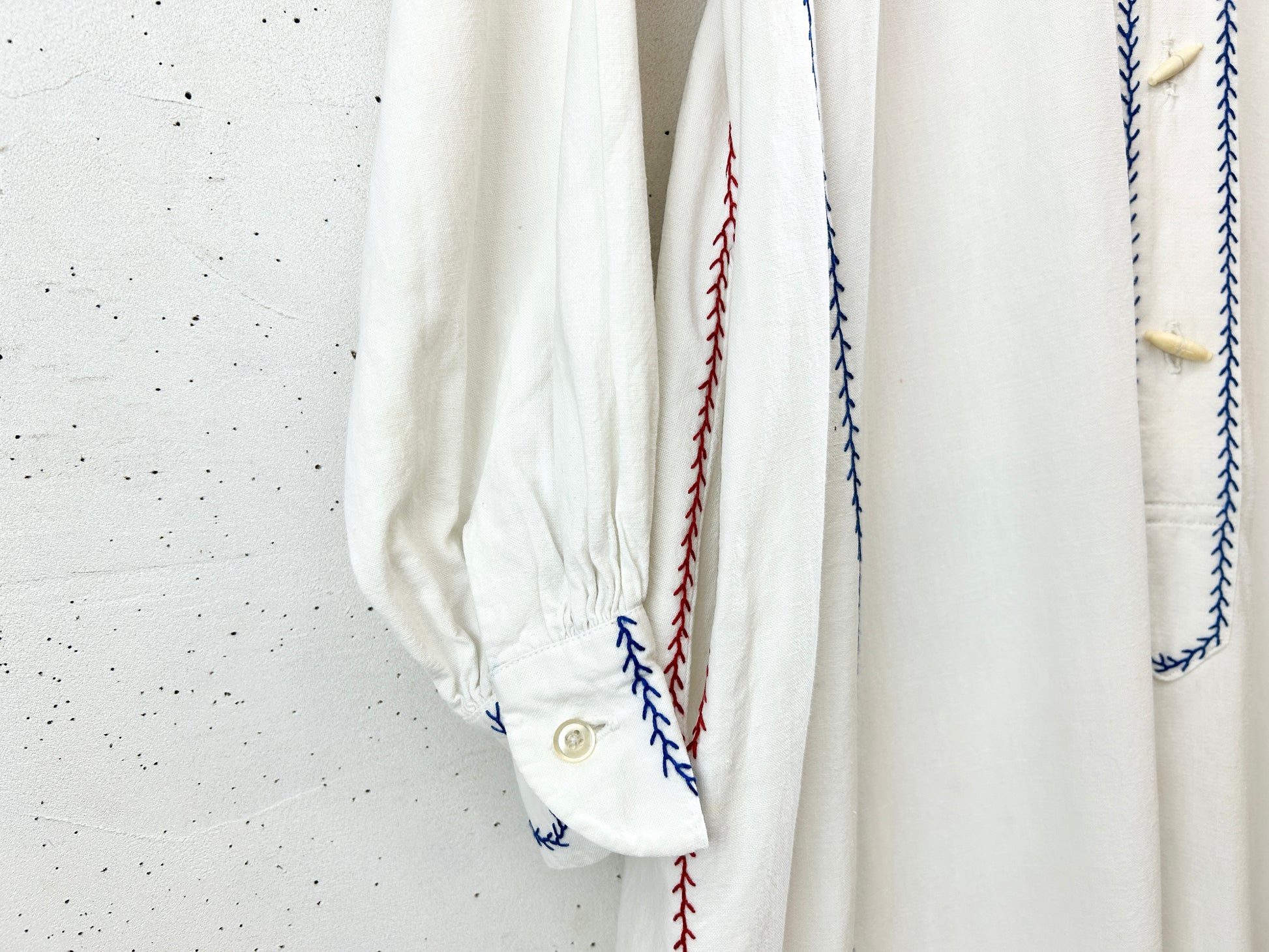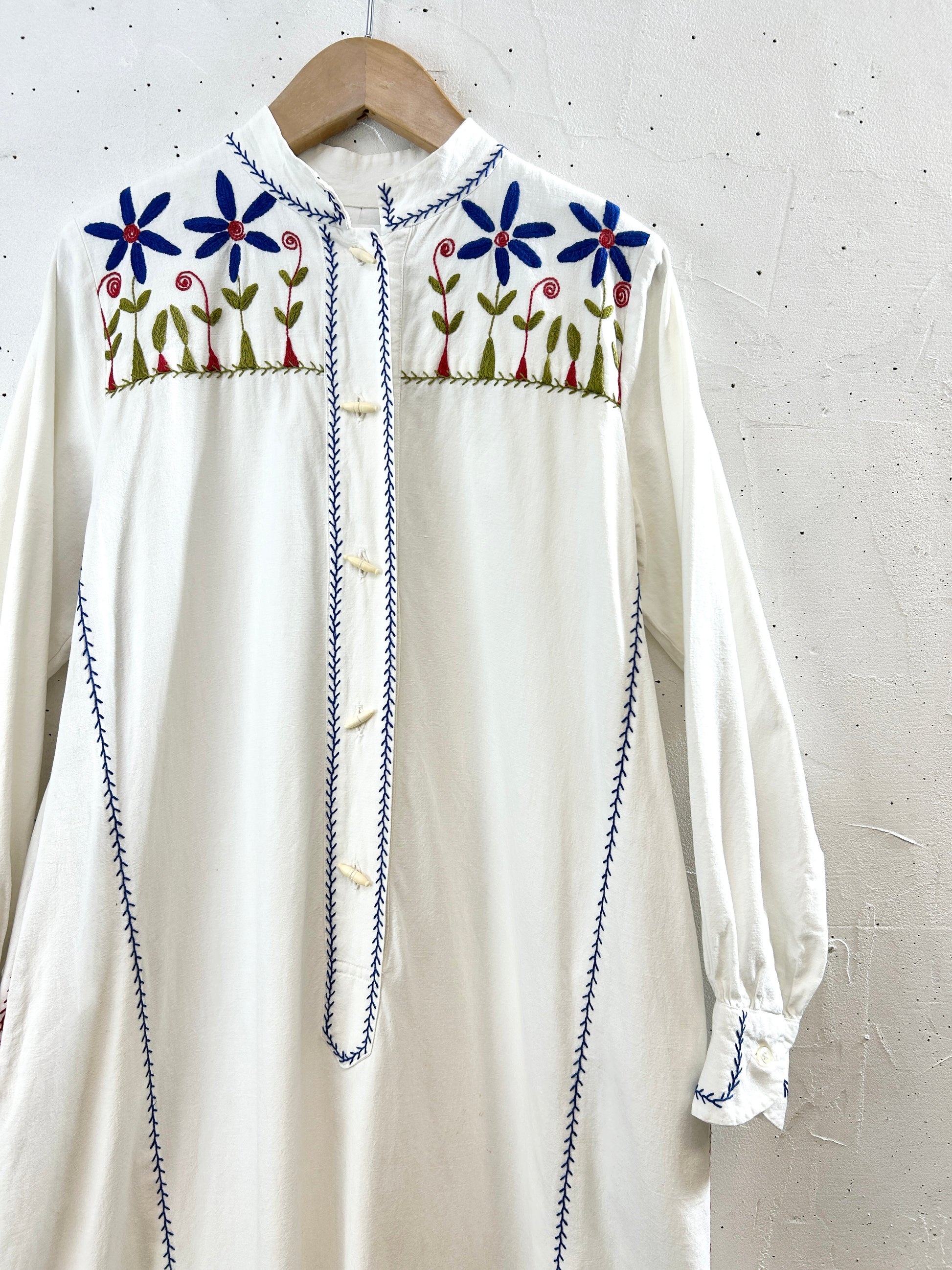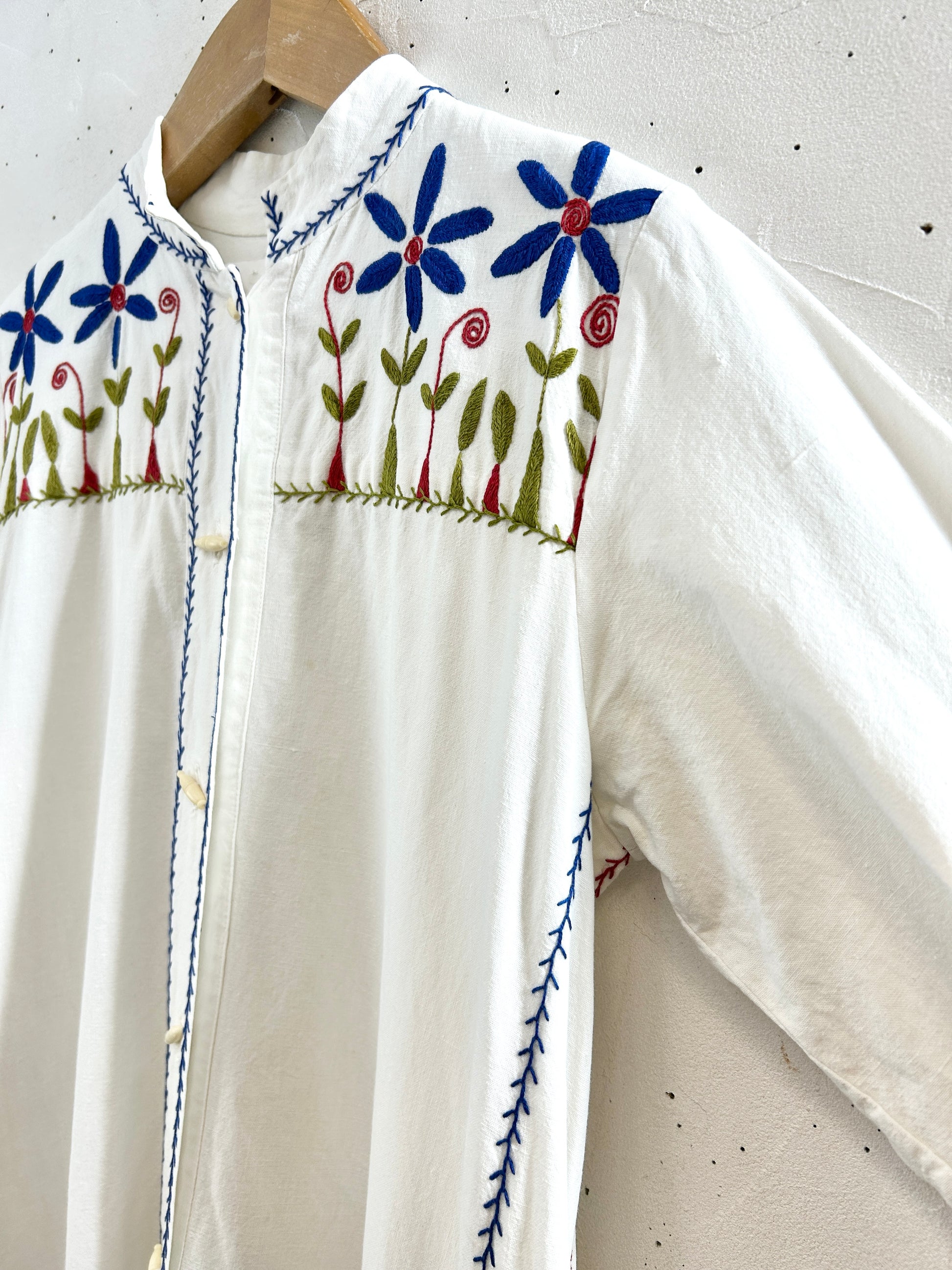 中肉コットンのシンプルなシルエットに施されたブルーフラワーやリースのような刺繍が印象的で、ビンテージならではのアイテムをお楽しみ頂けます。