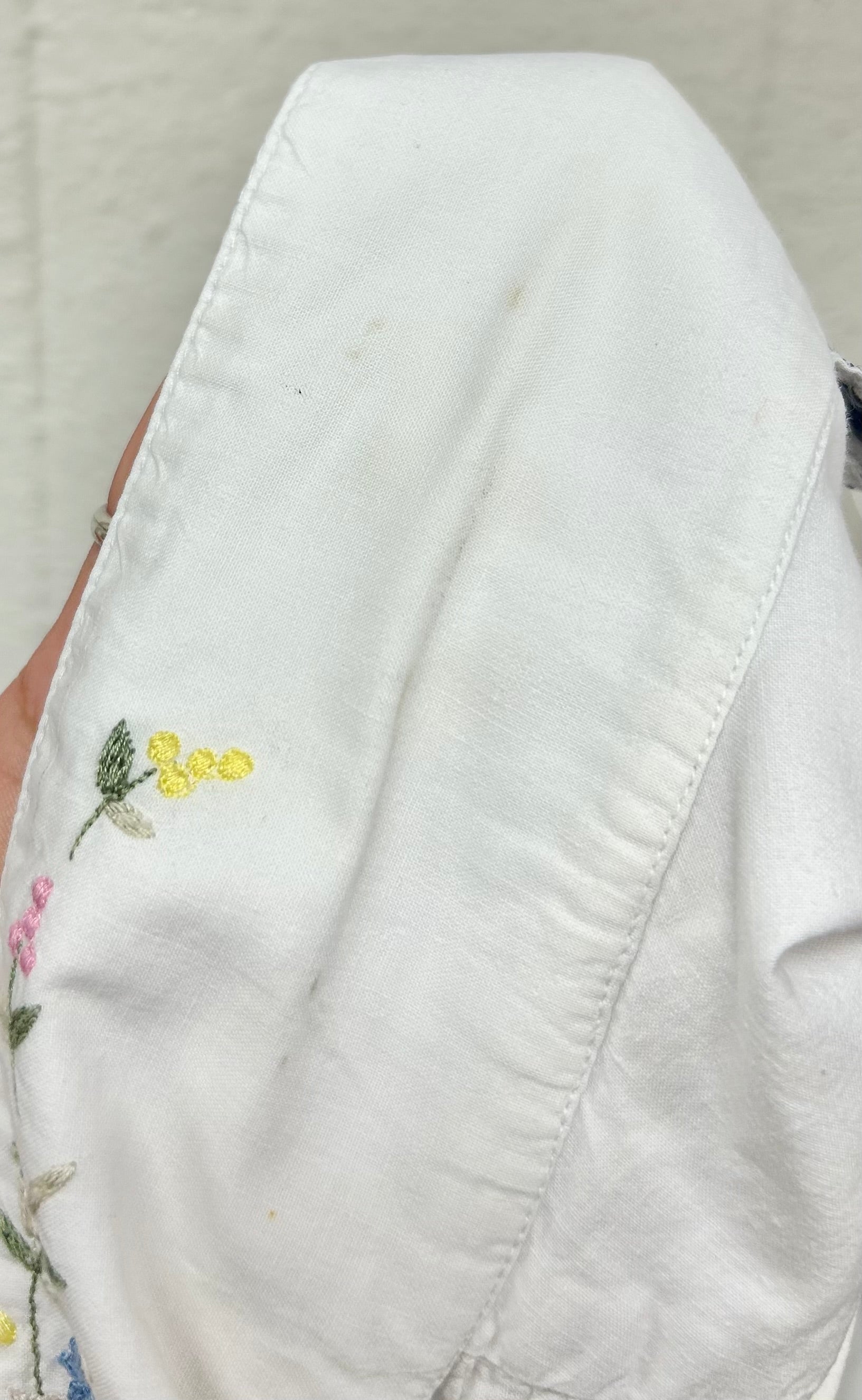 とても細かなパステルカラーのフラワー刺繍が可愛らしい1着。