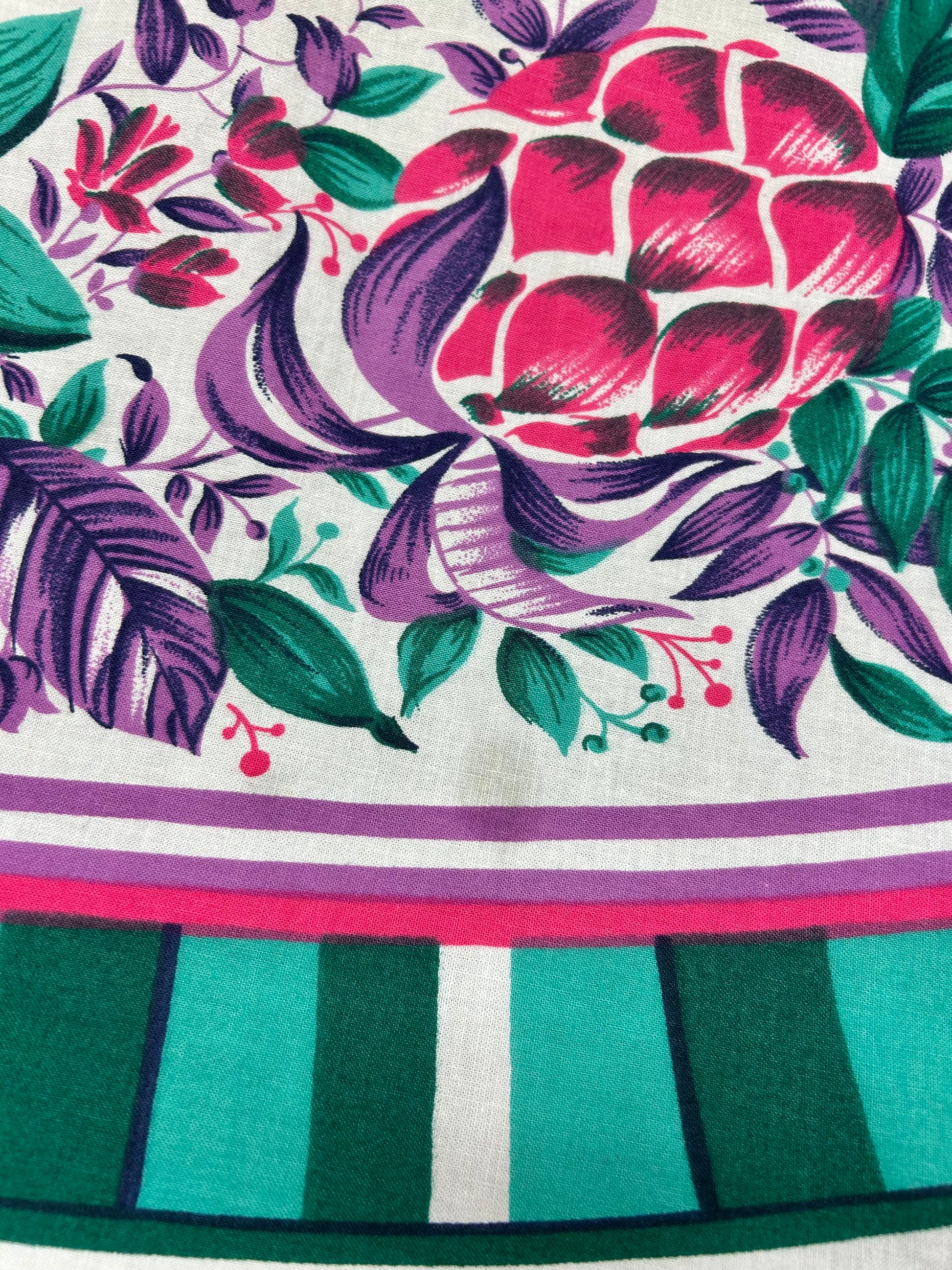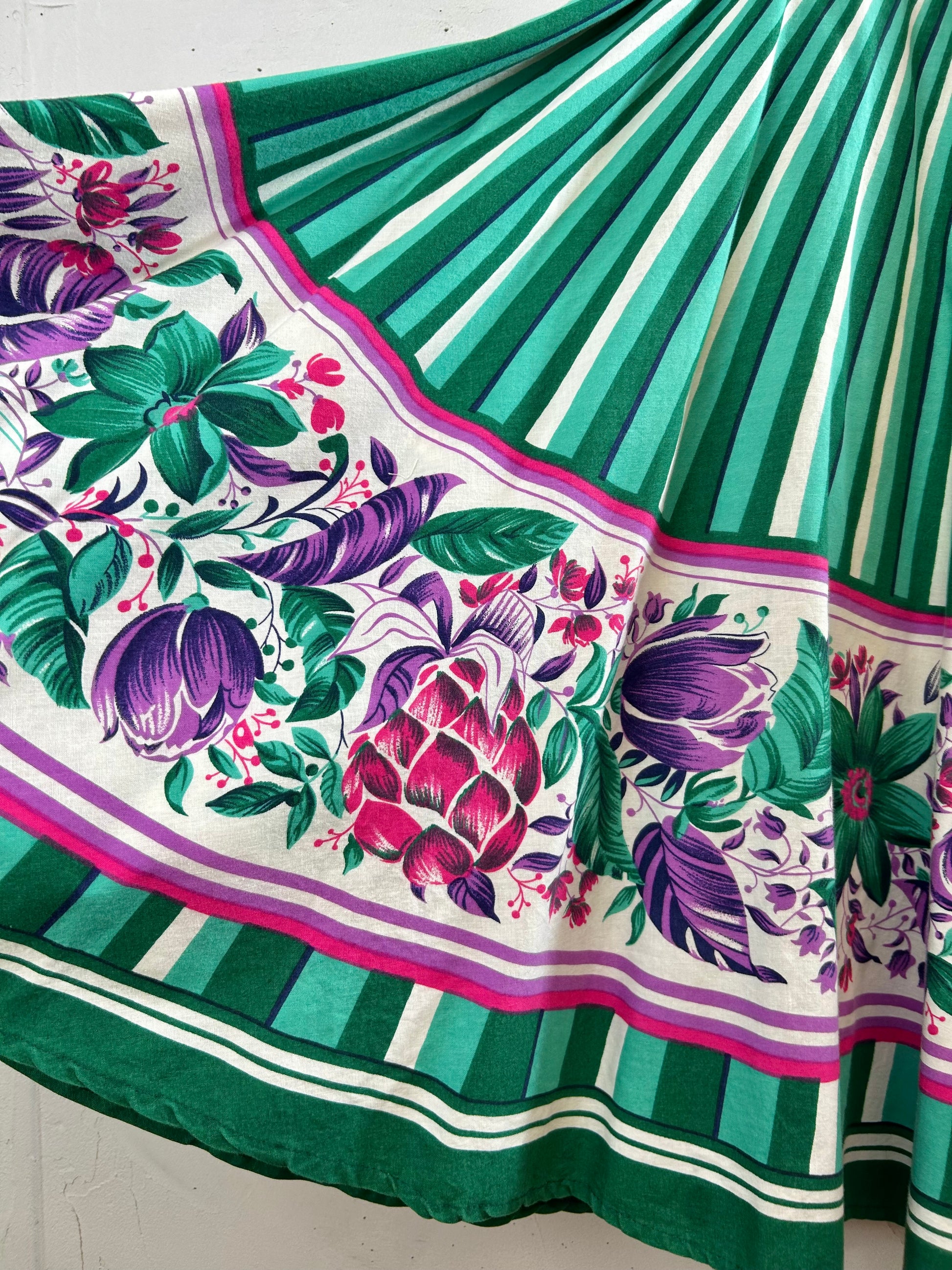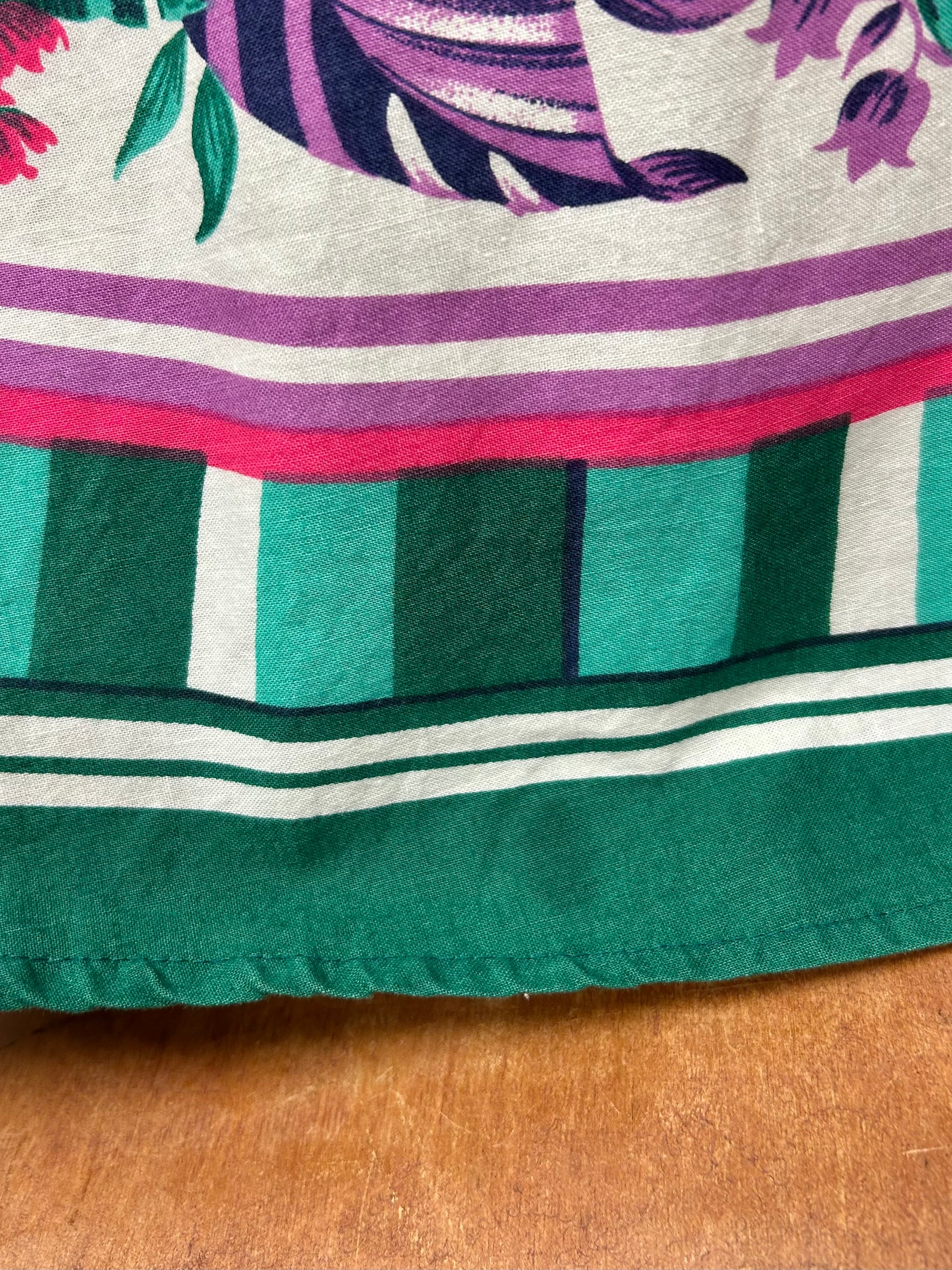 パッと目を惹くナイスカラーリングなストライプとフラワーのエンドパターンがとても素敵な1着。