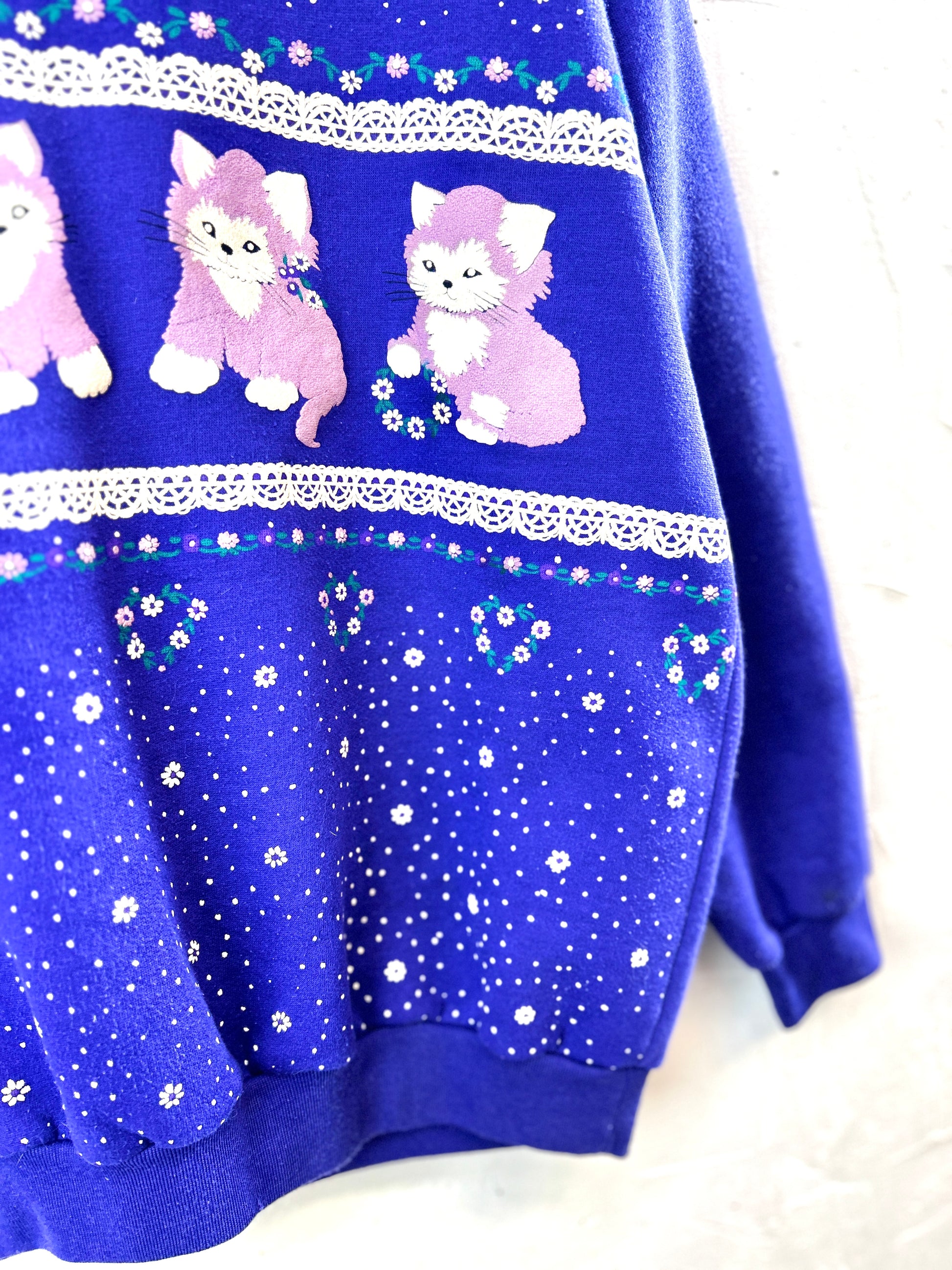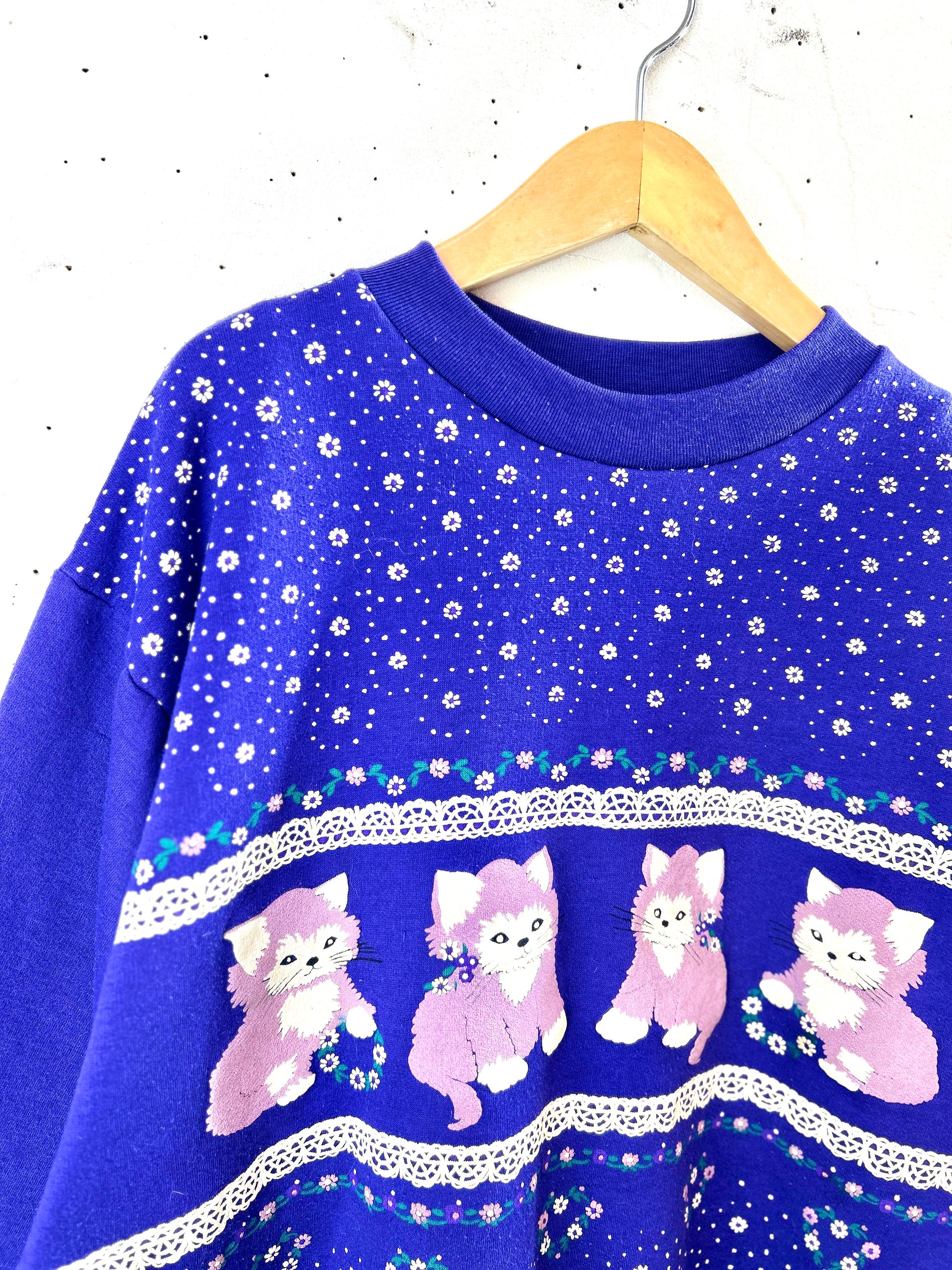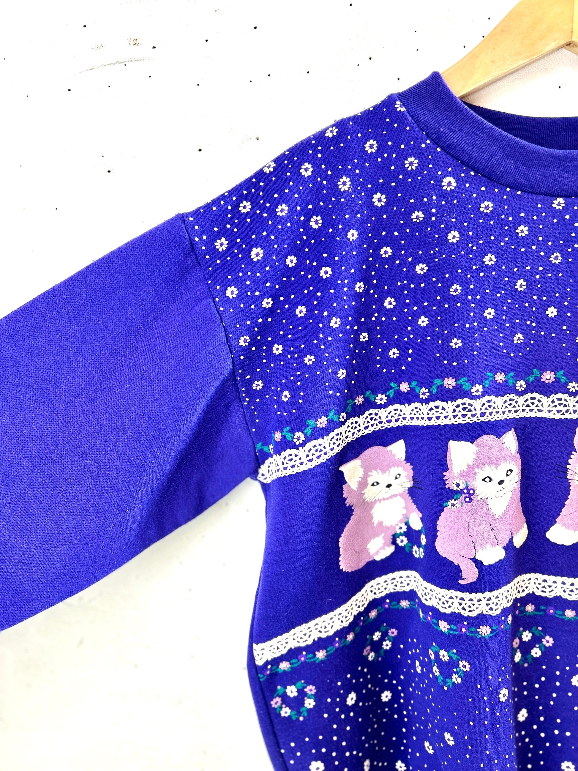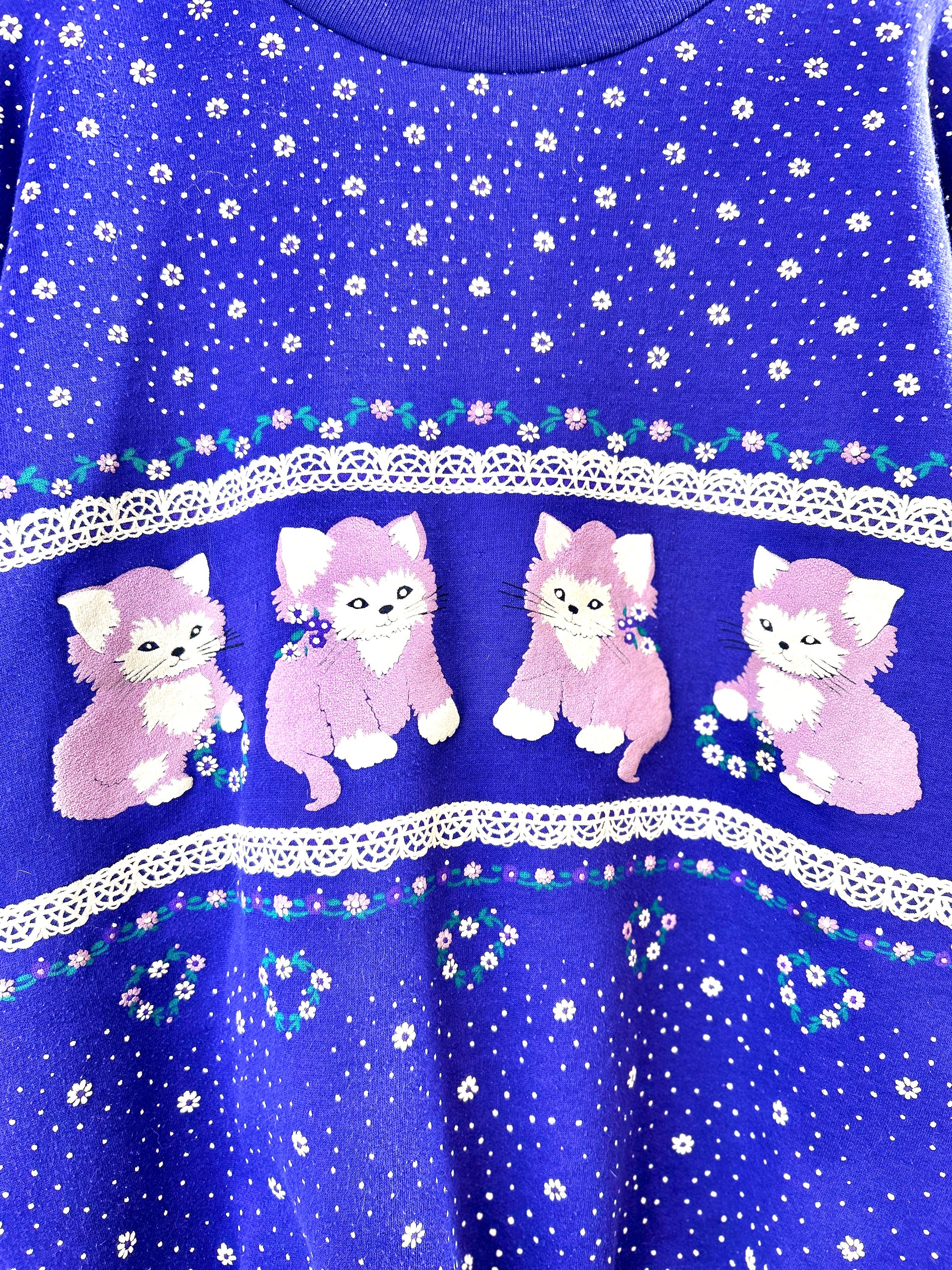 キュートな猫とレースや花柄のプリントがとても可愛らしい一着。