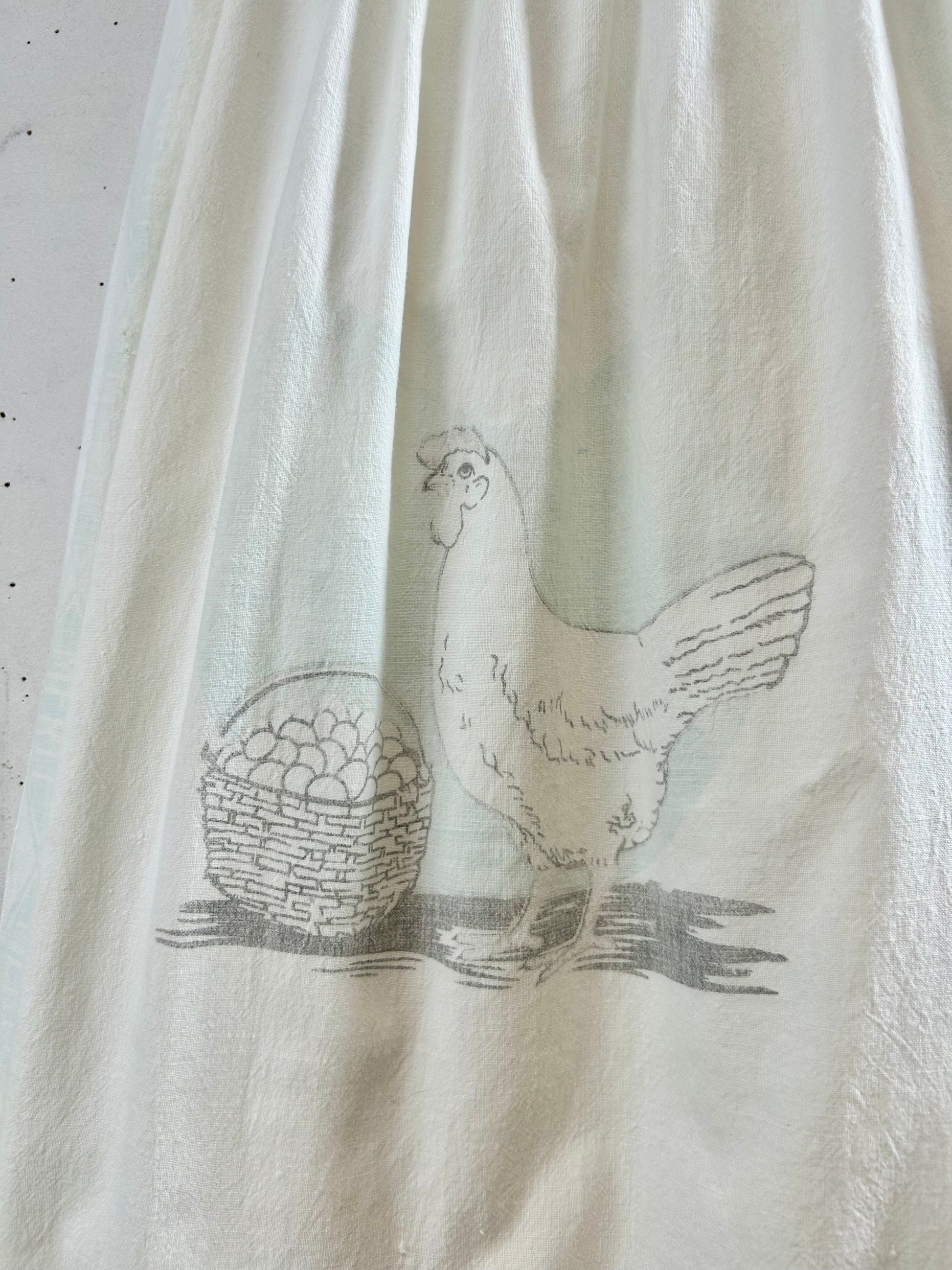 こちらは、ニワトリ染み込みプリントのサック生地を使用した雰囲気抜群な1着。