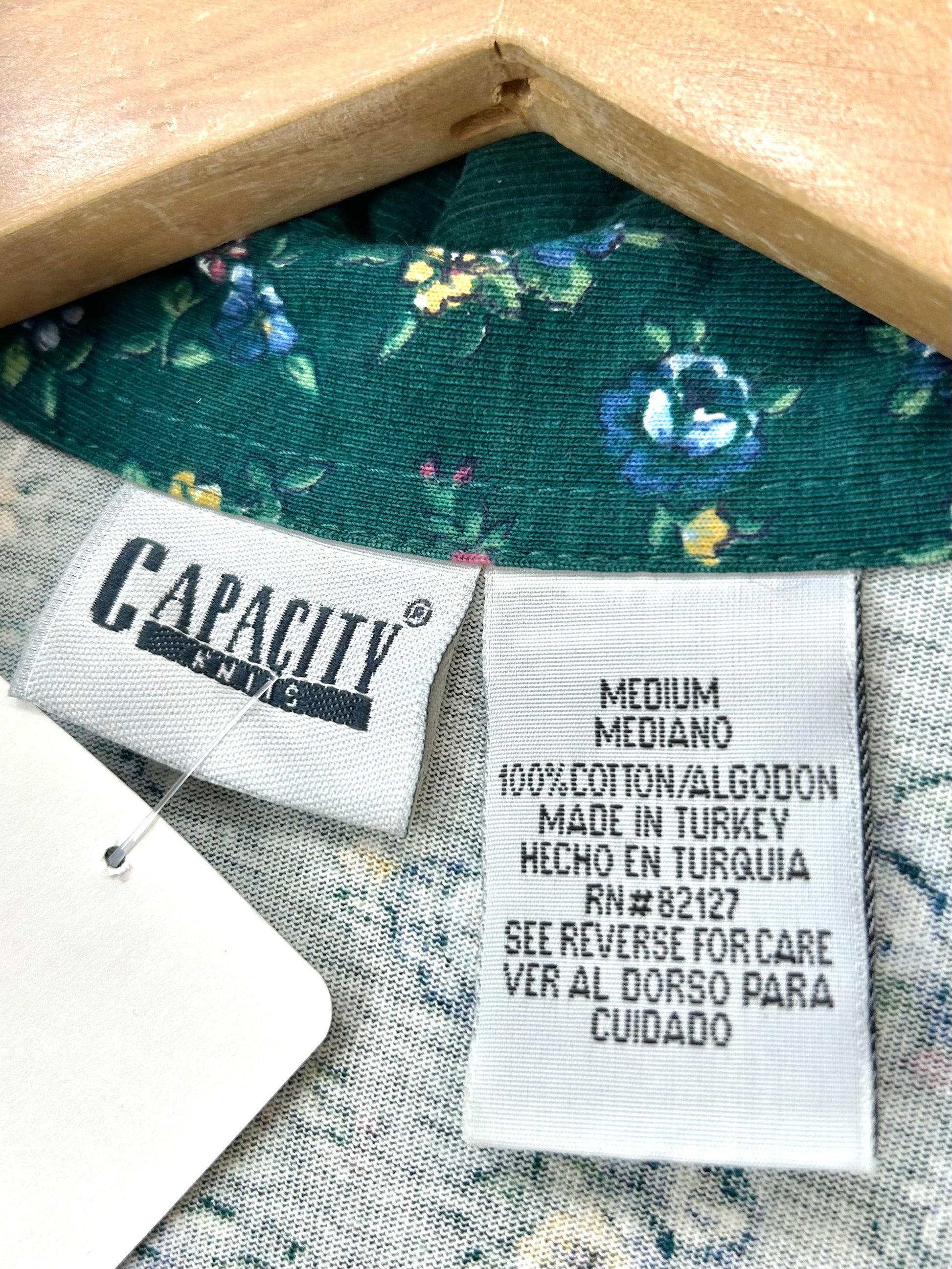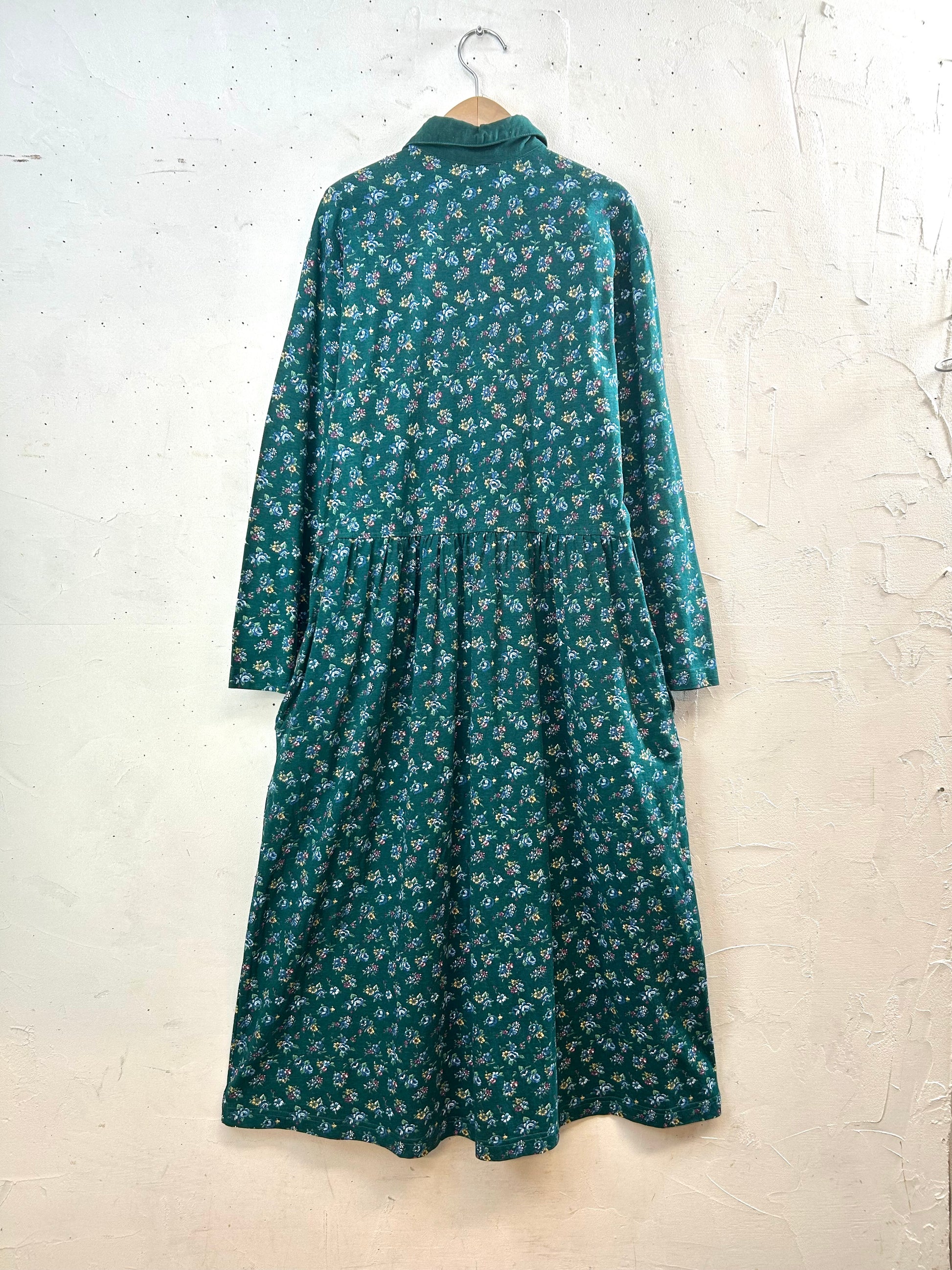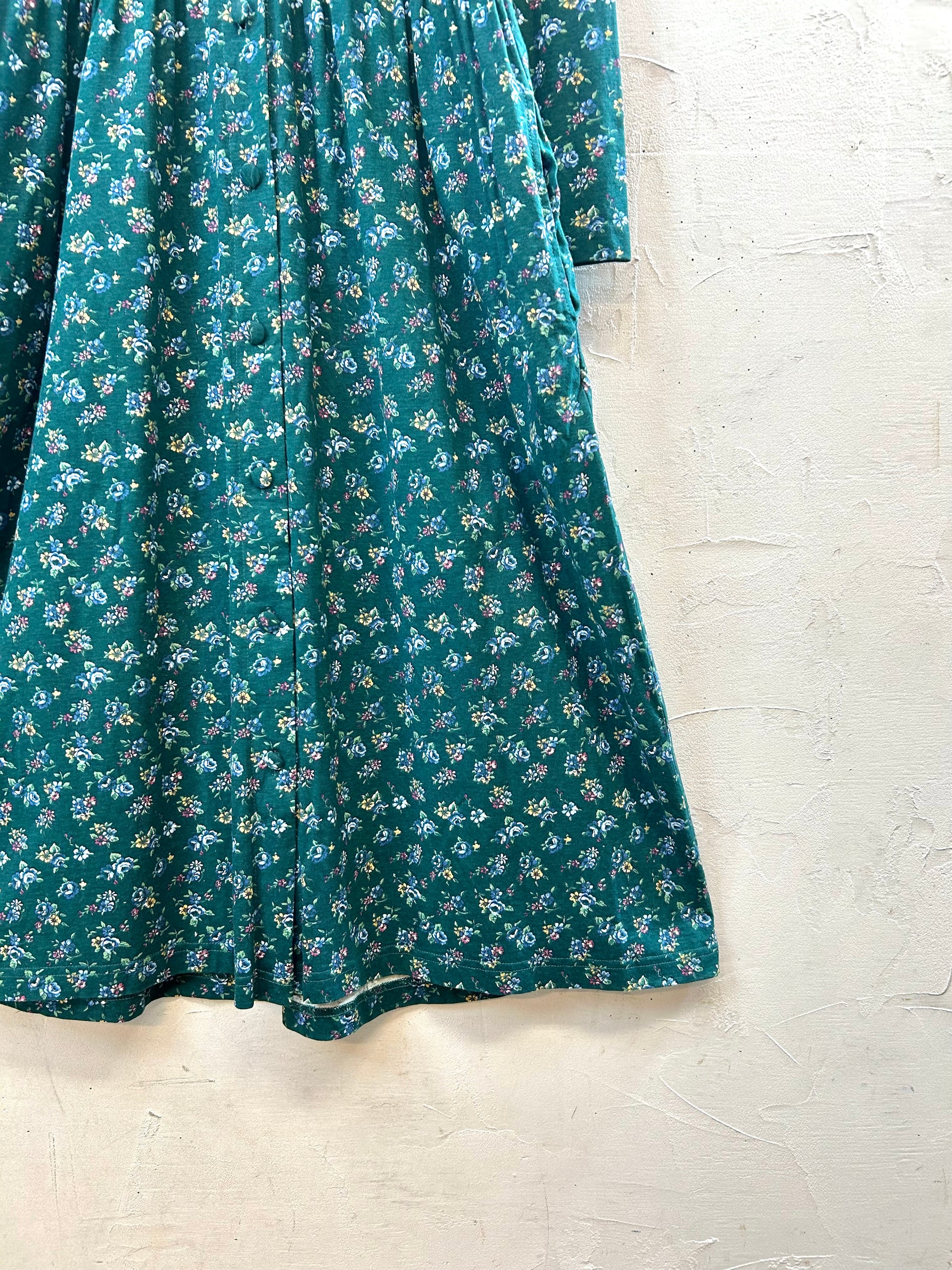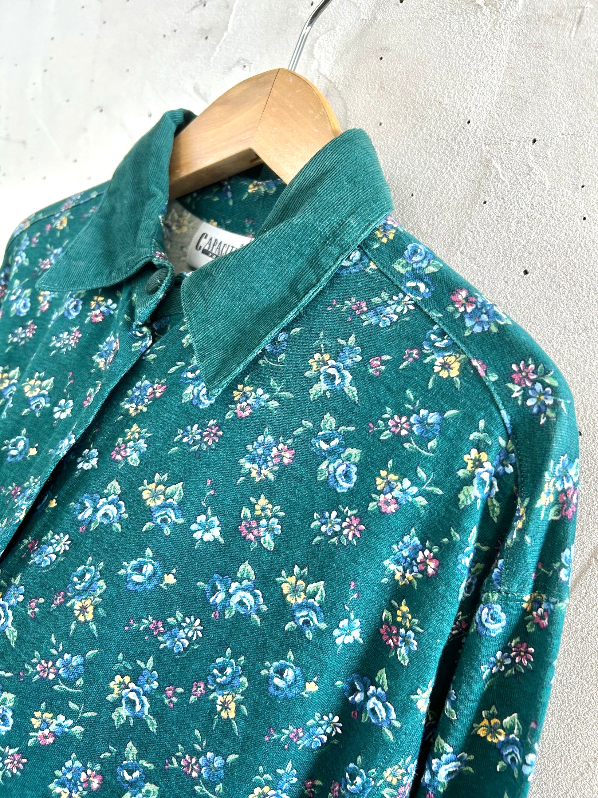 深みのあるグリーンのフラワーパターンにコーディロイの襟ガーリーな1着。