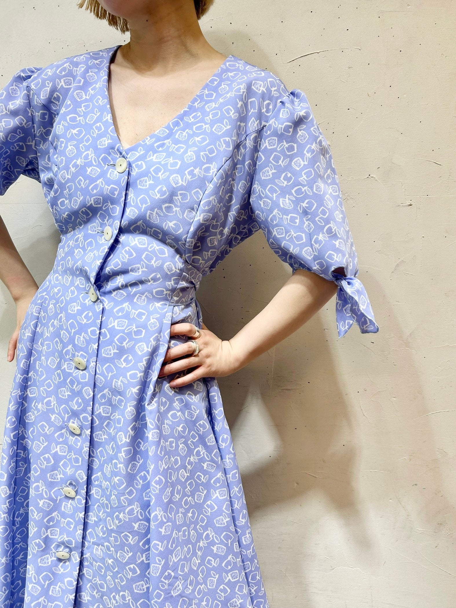 シンプルなシルエットでふが、ウエストや袖にリボンがついており、お好みのスタイルでお楽しみ頂けます。