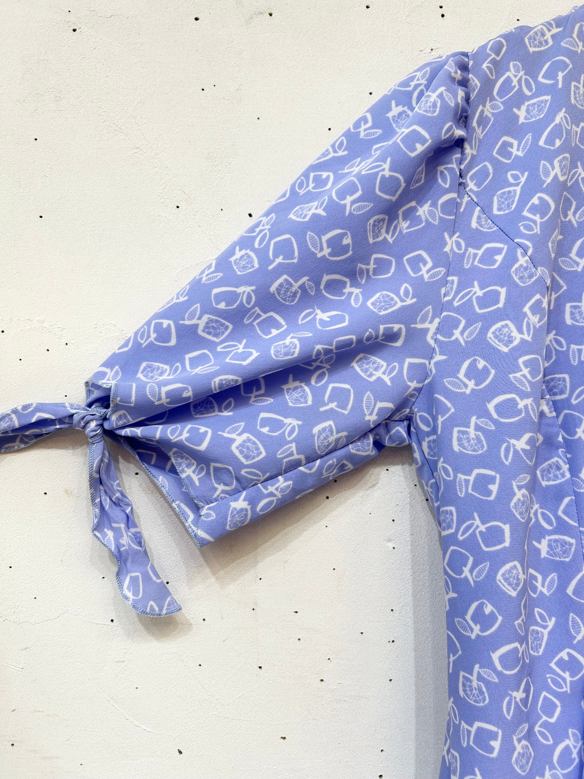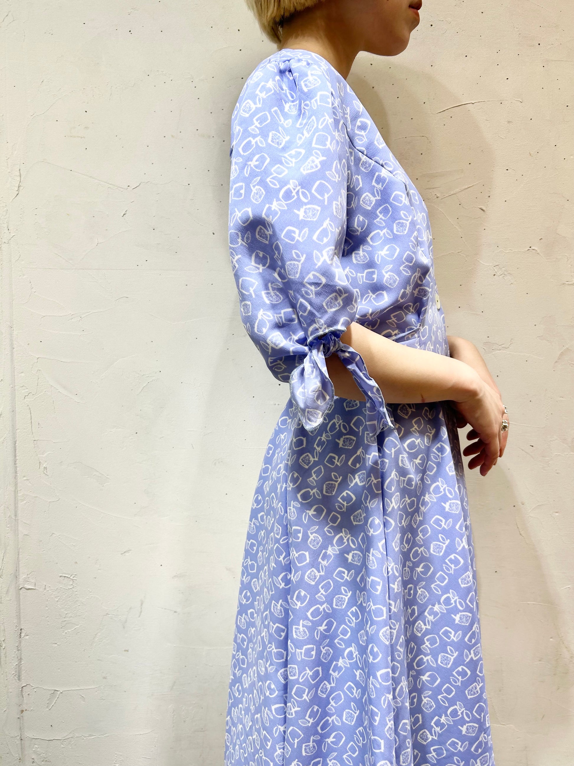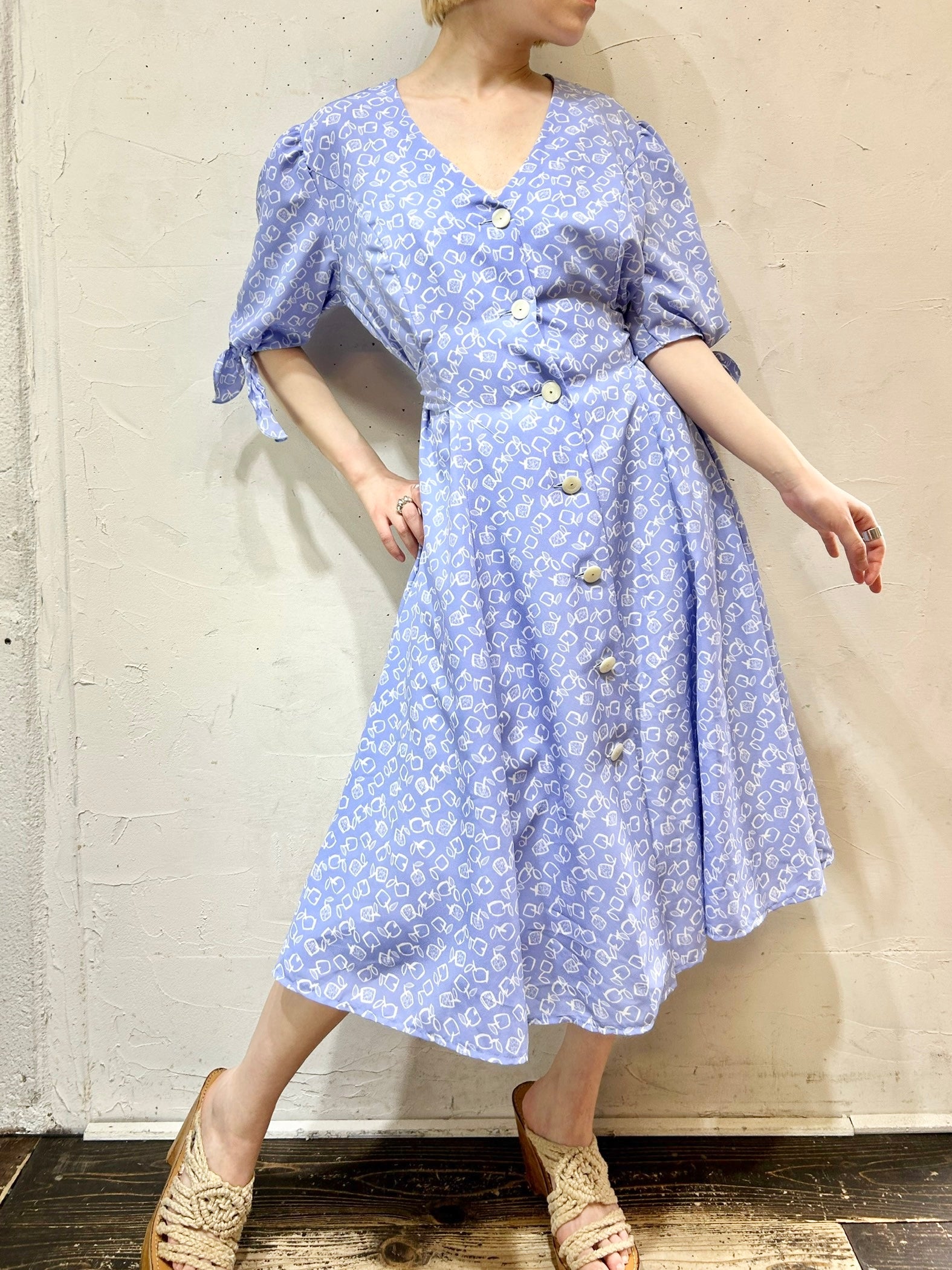 淡いパープルにホワイトでスクエアのりんごがデザインされたユニークで可愛らしい1着。