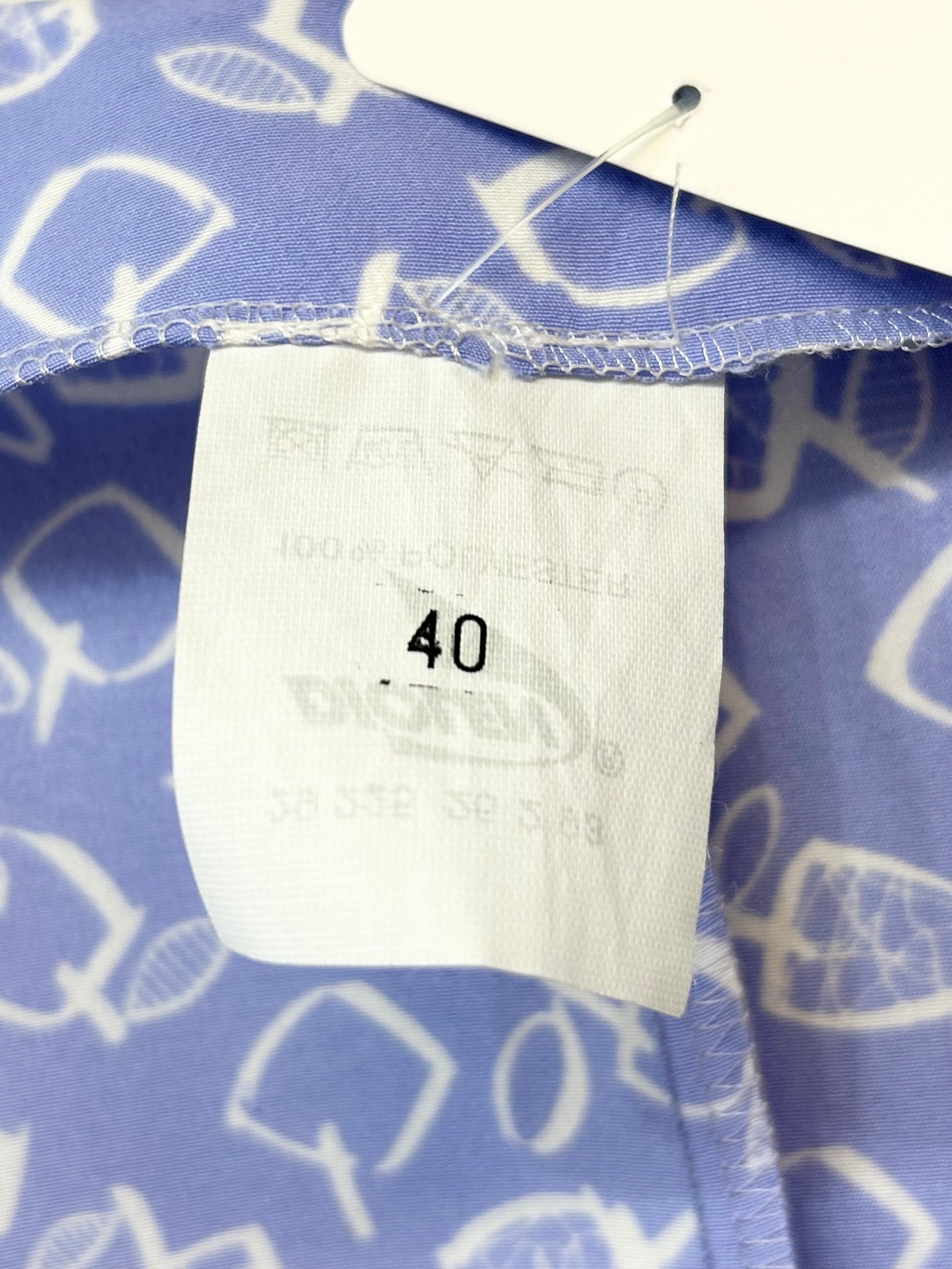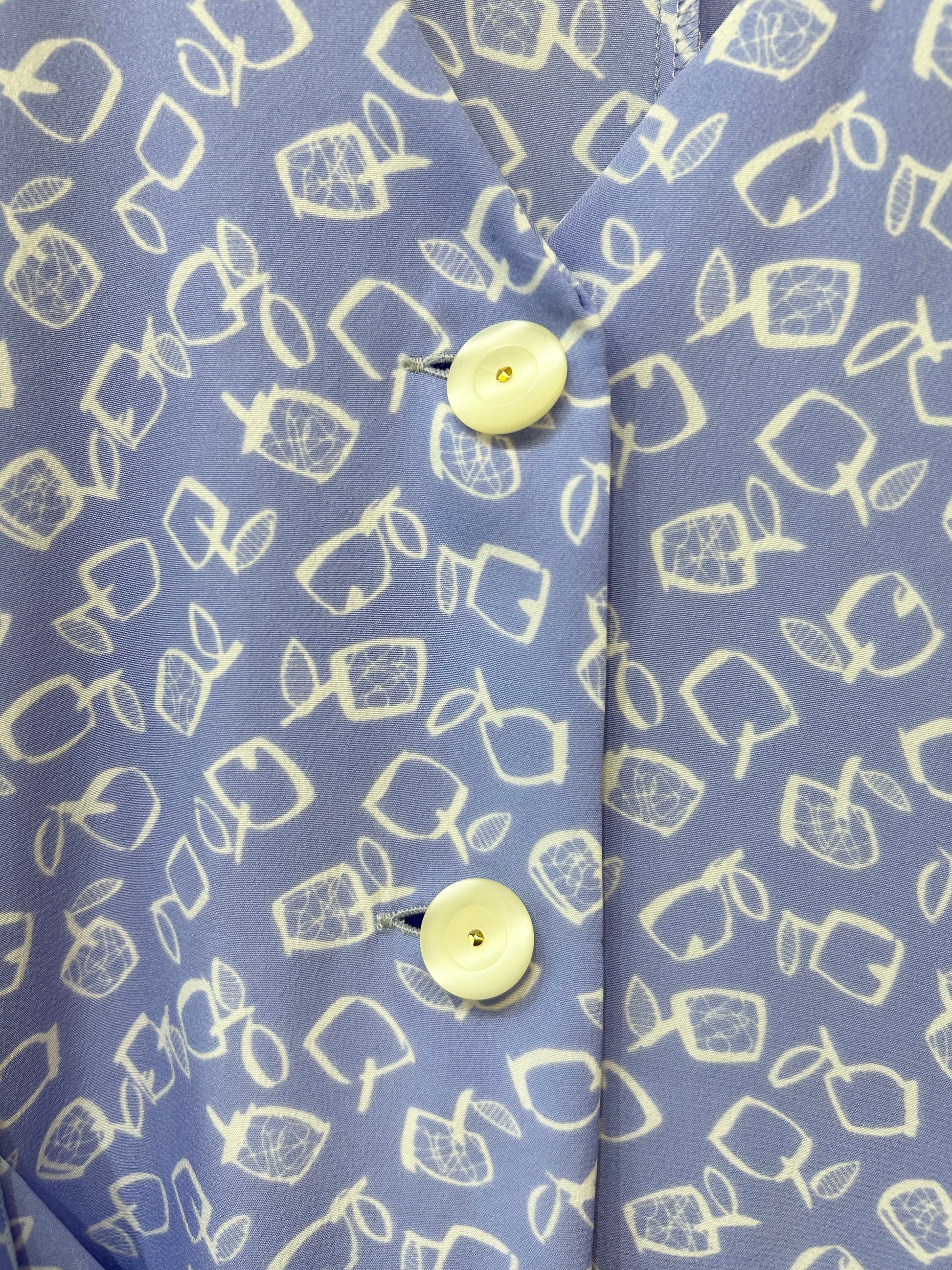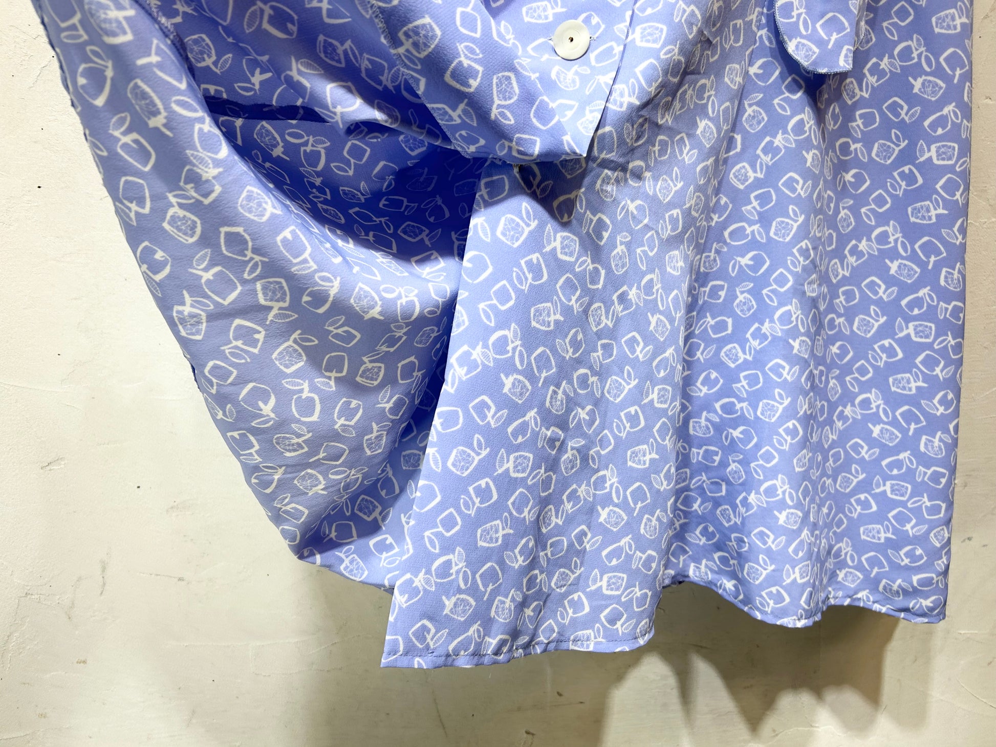 淡いパープルにホワイトでスクエアのりんごがデザインされたユニークで可愛らしい1着。