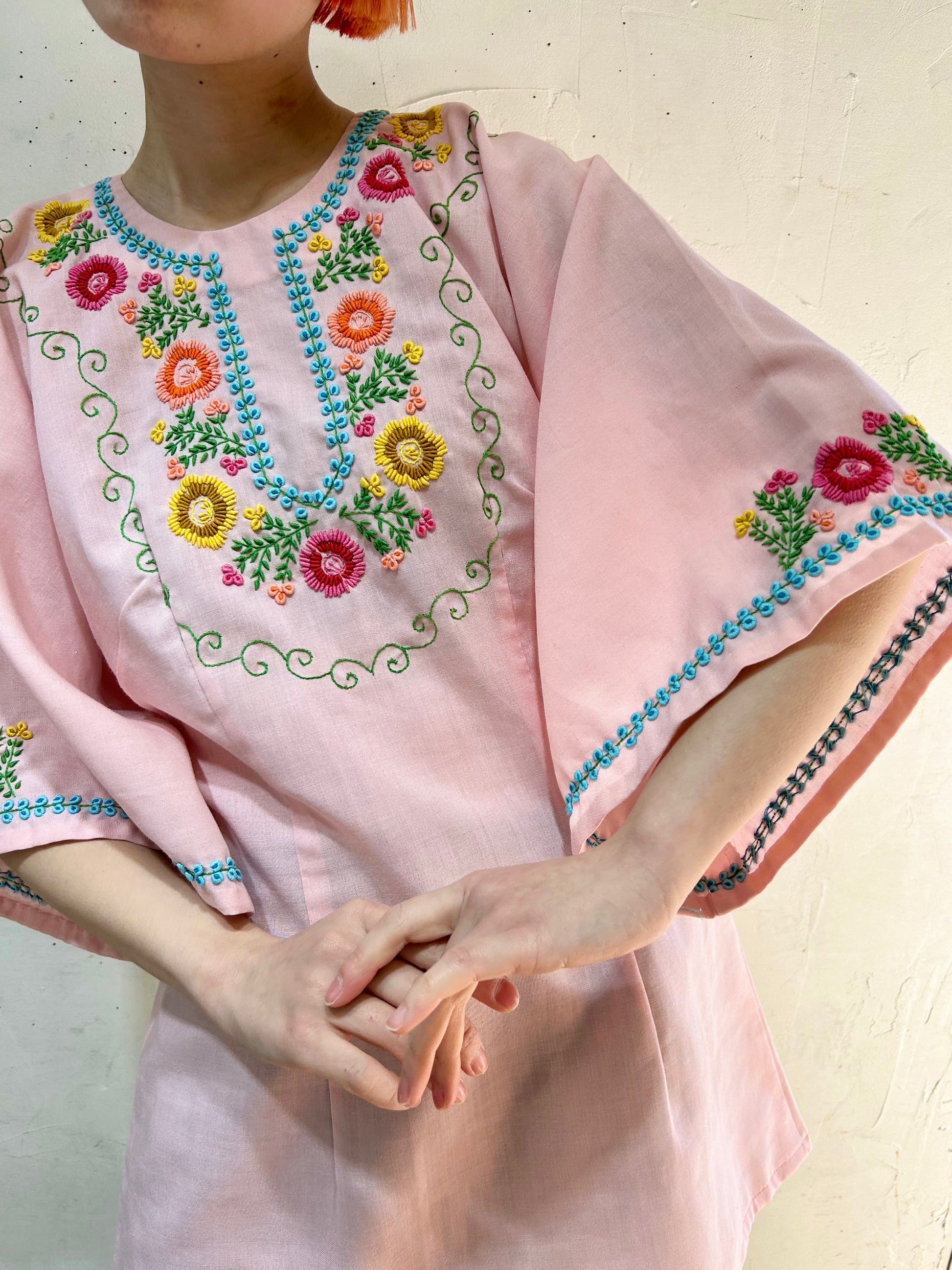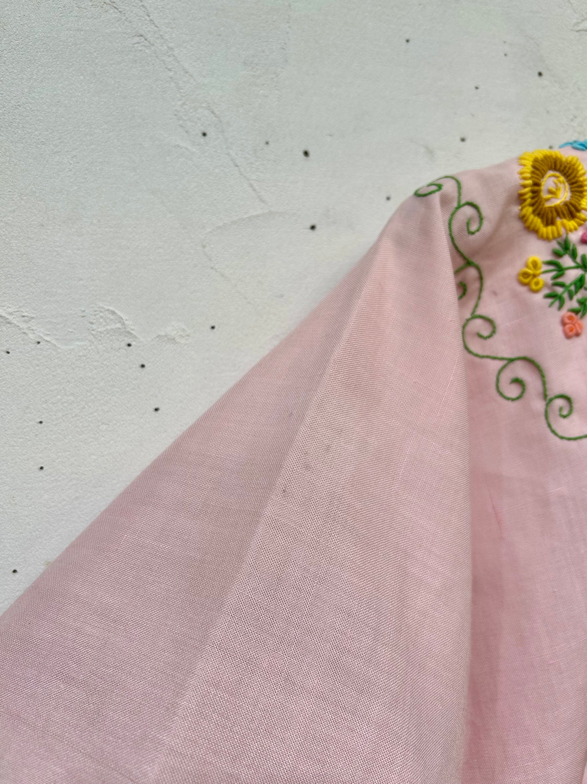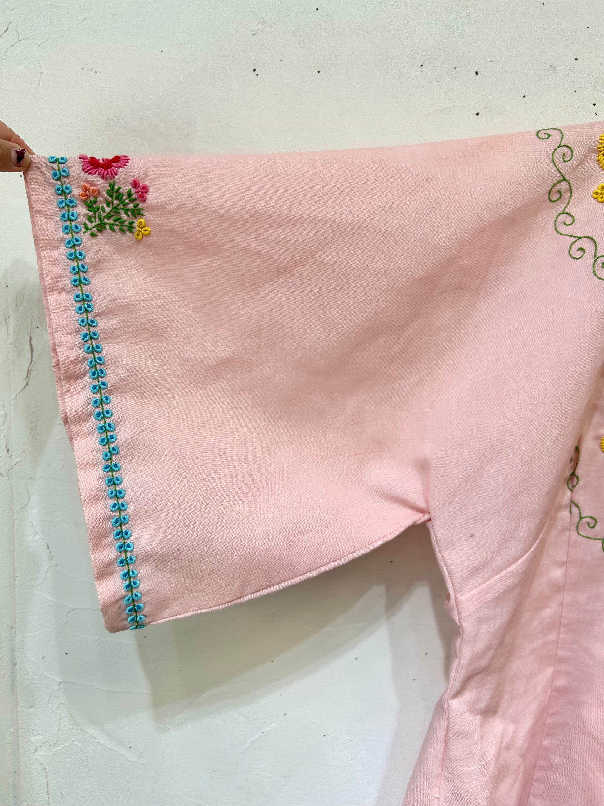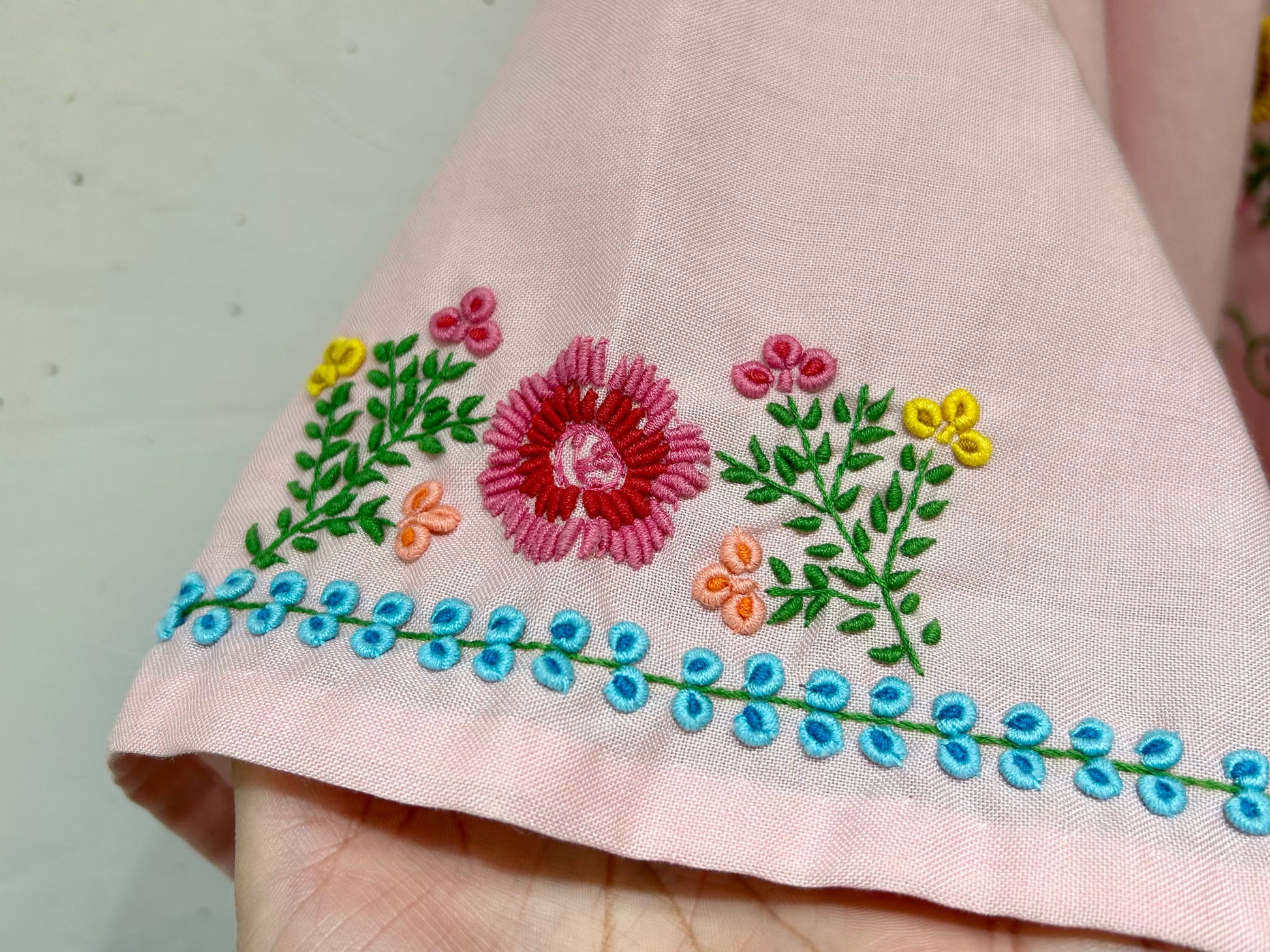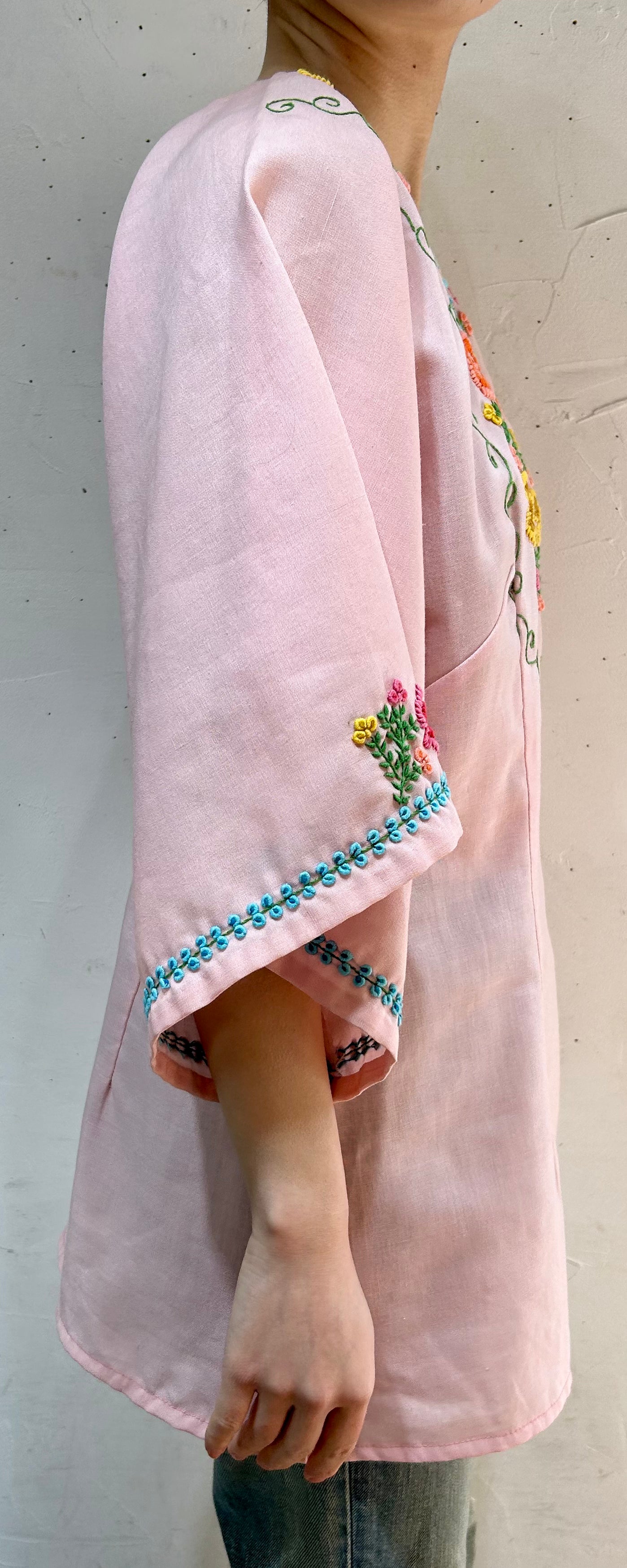 ピンクボディに、みっちりと詰まった立体感のあるカラフルなお花の手刺繍が美しい一着。
