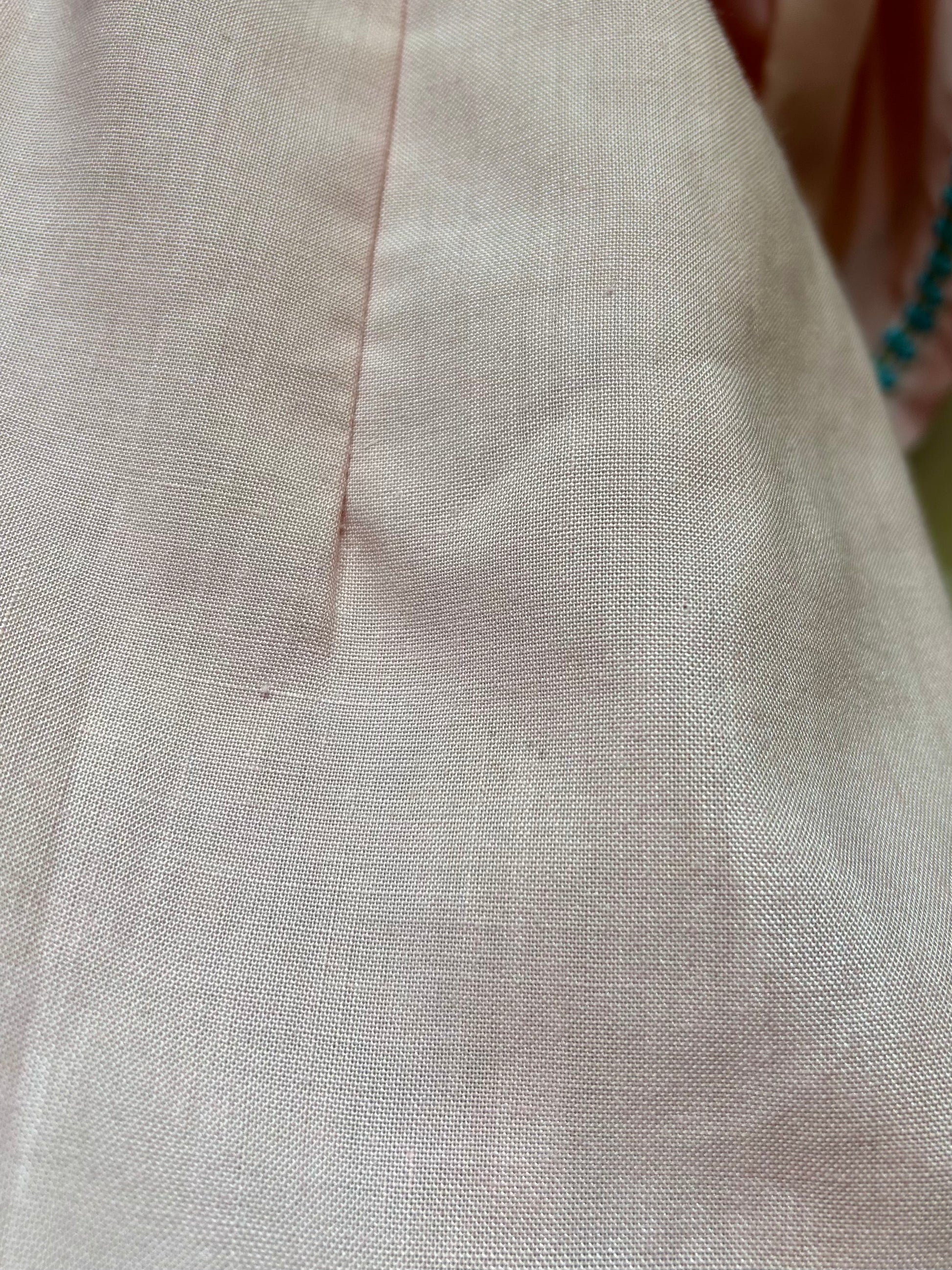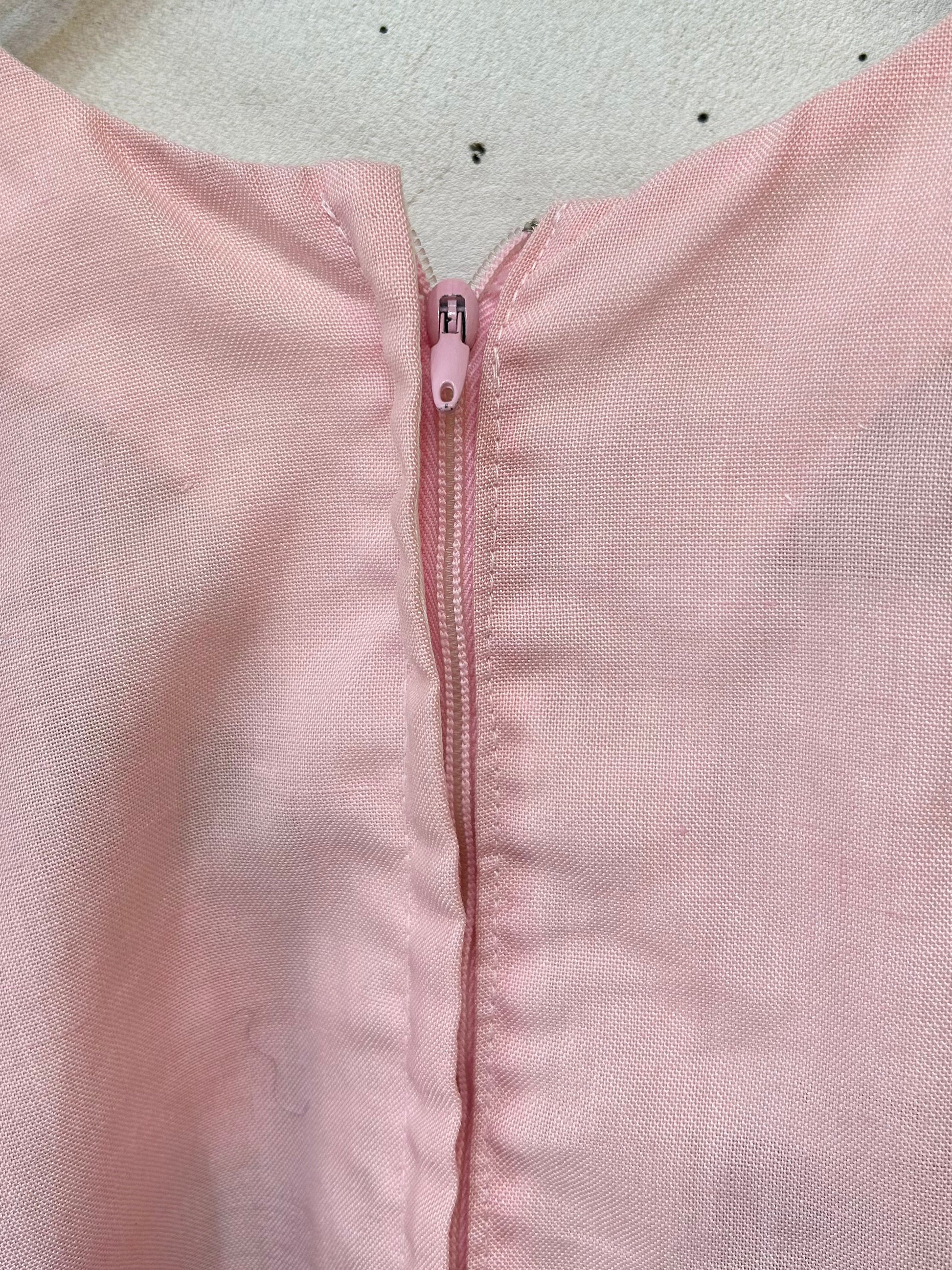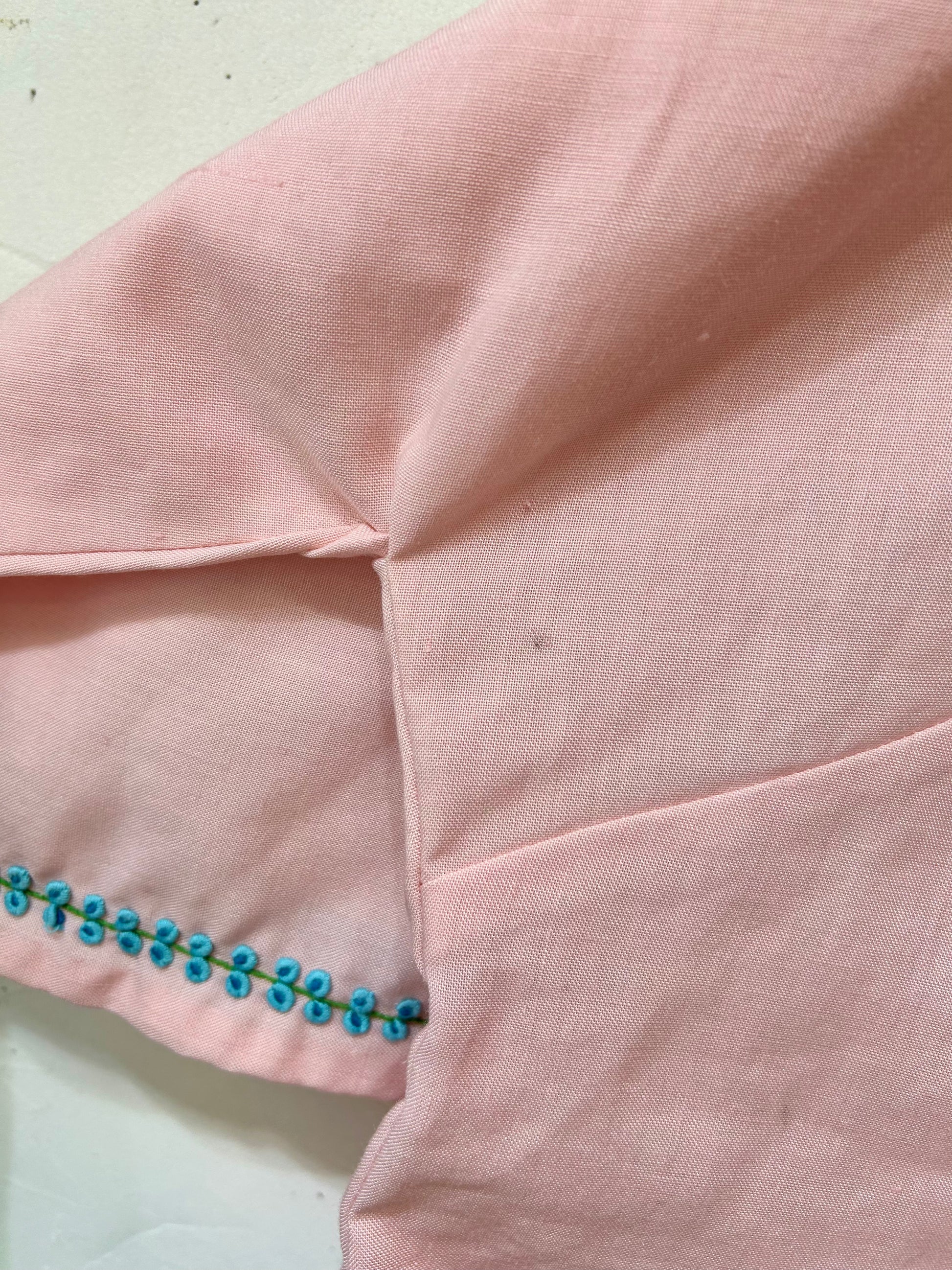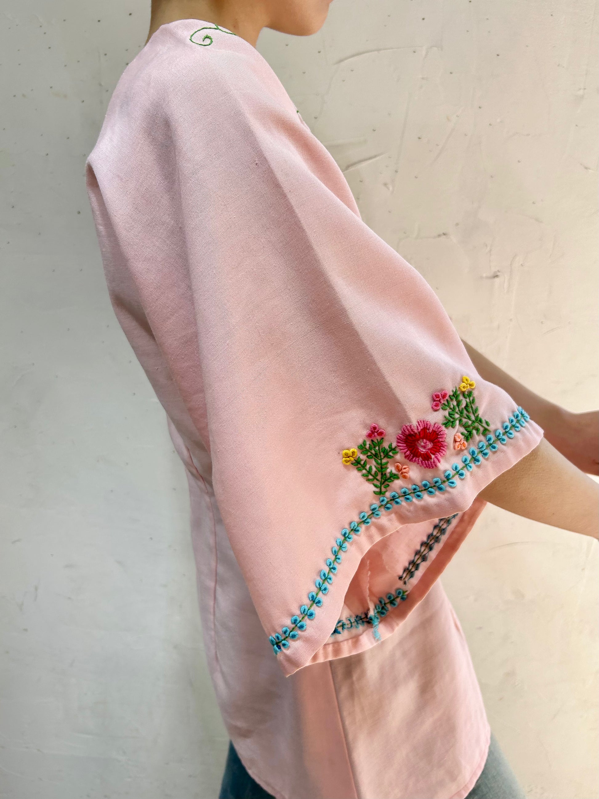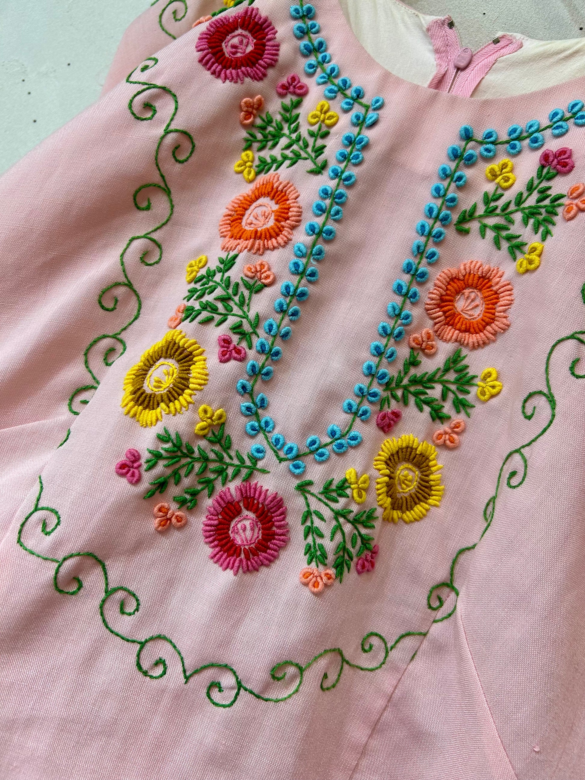 ピンクボディに、みっちりと詰まった立体感のあるカラフルなお花の手刺繍が美しい一着。