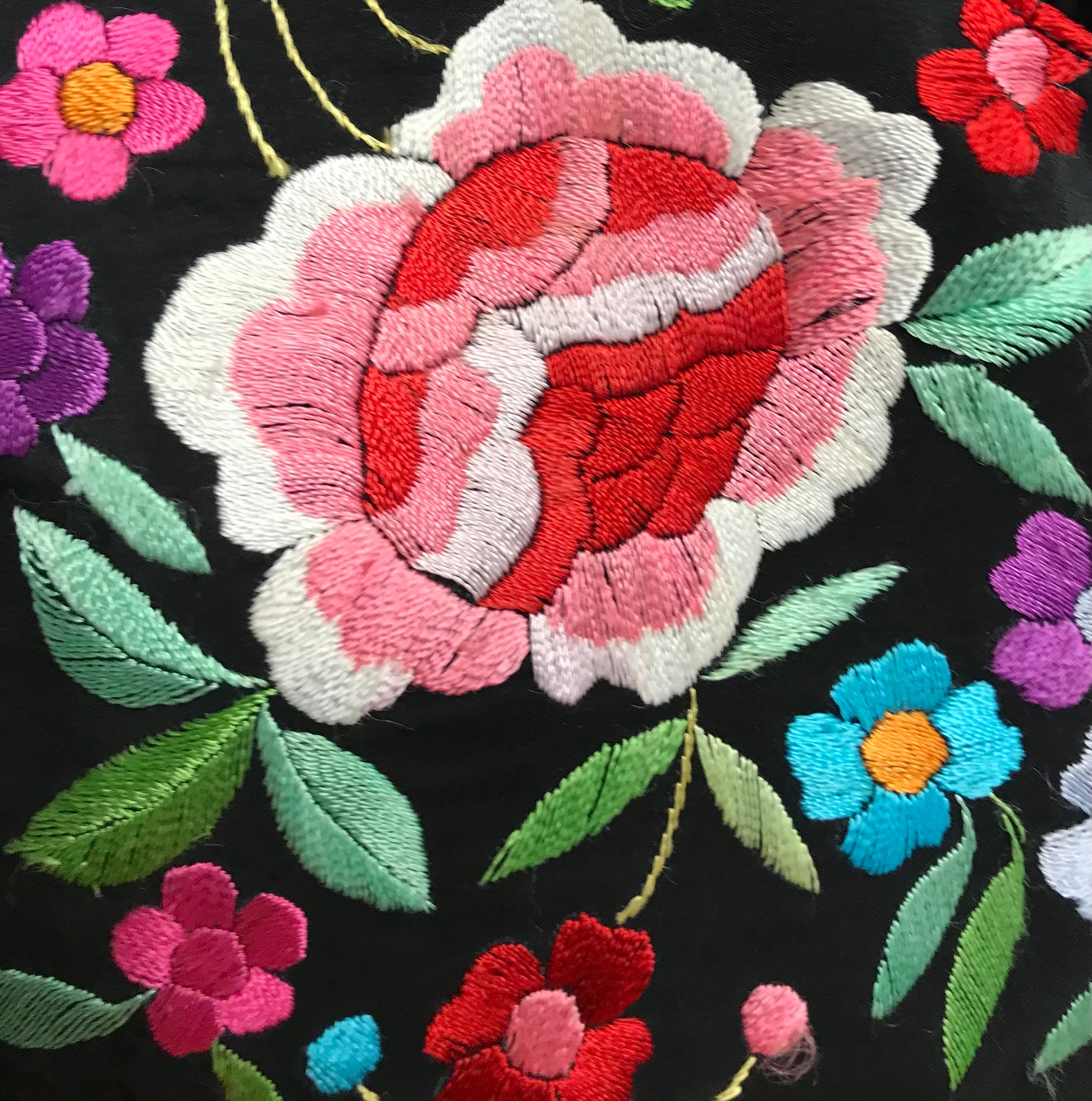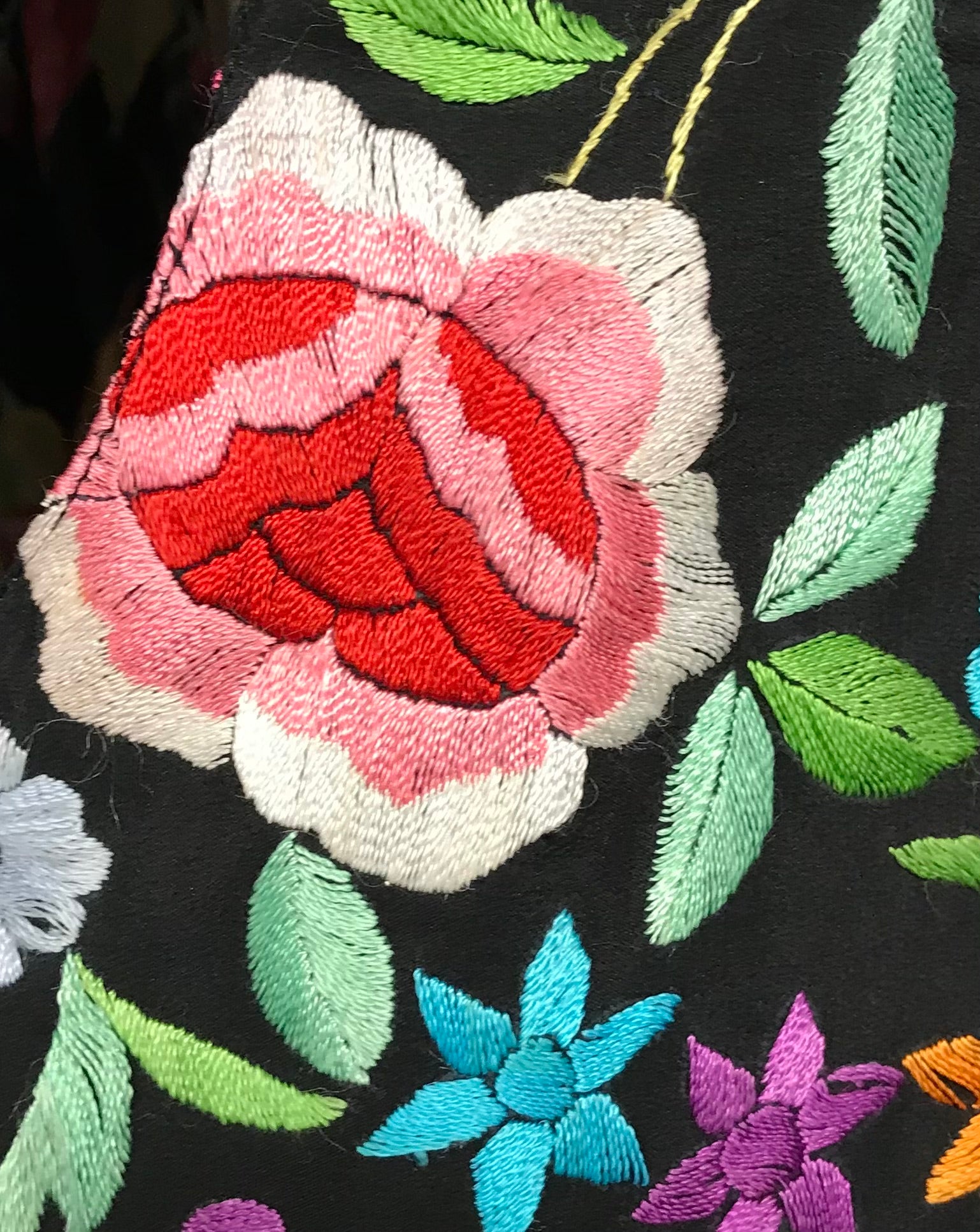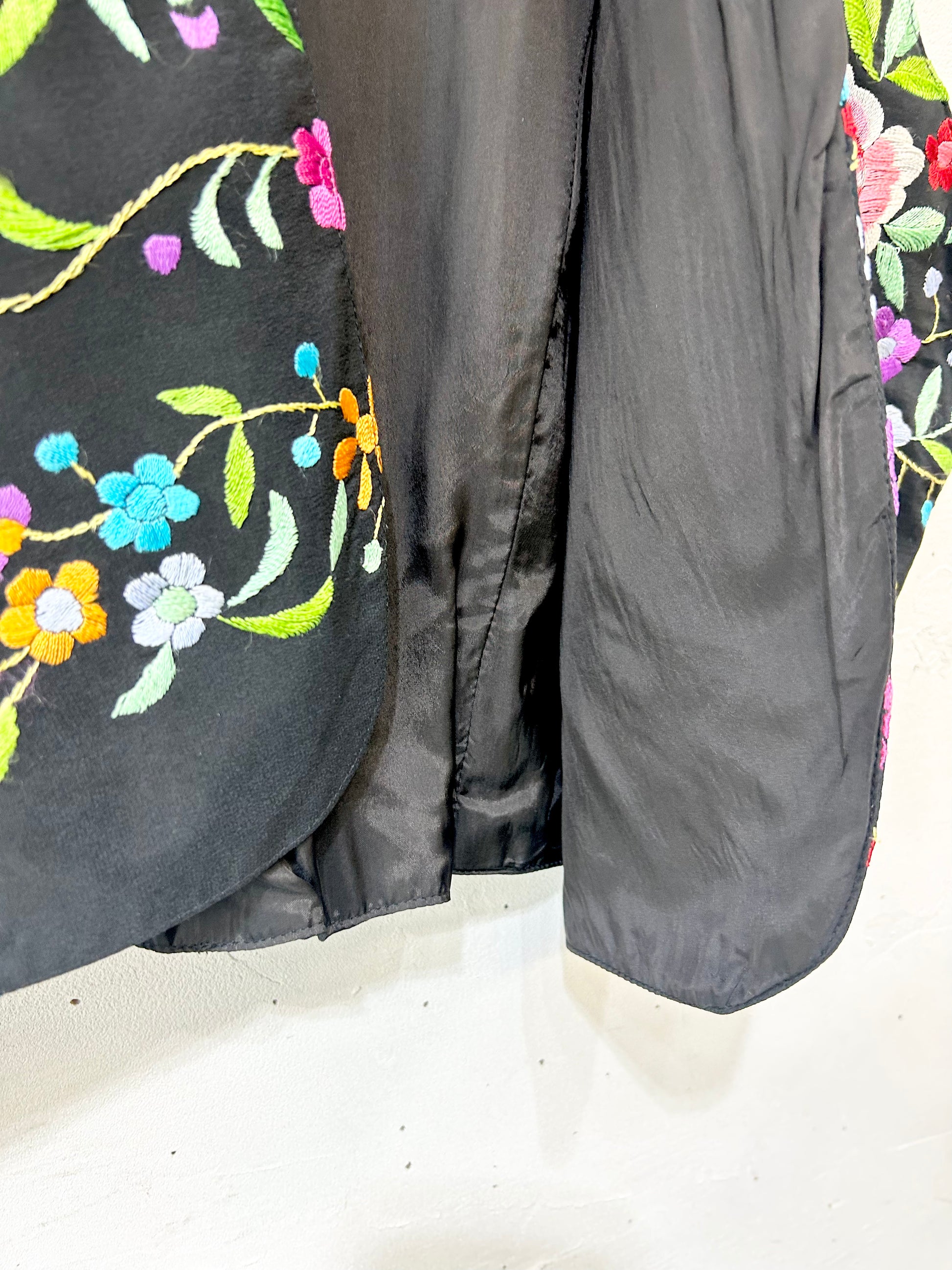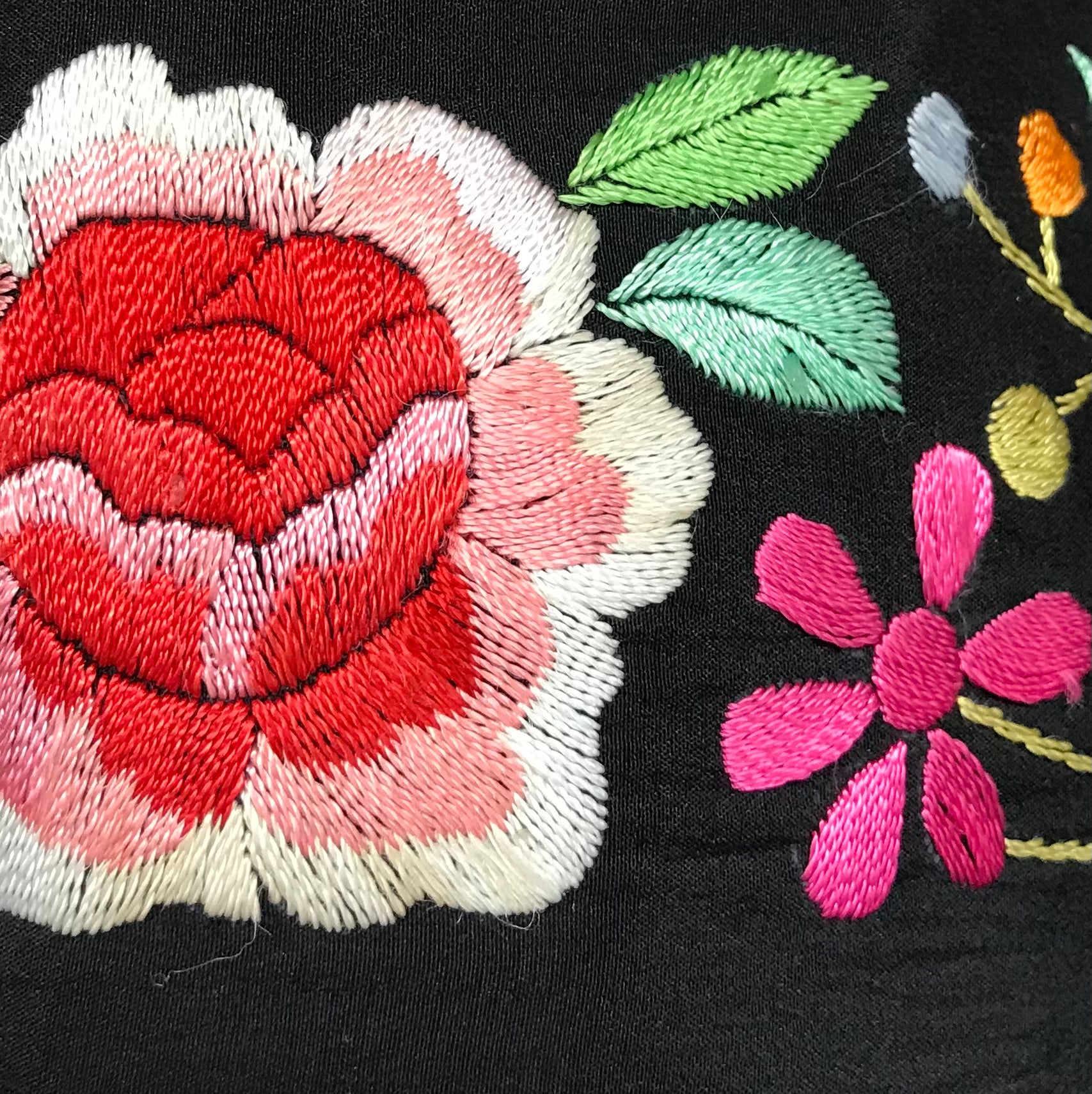 サテンステッチでフロント全体に施されたフラワー刺繍が美しい一着。