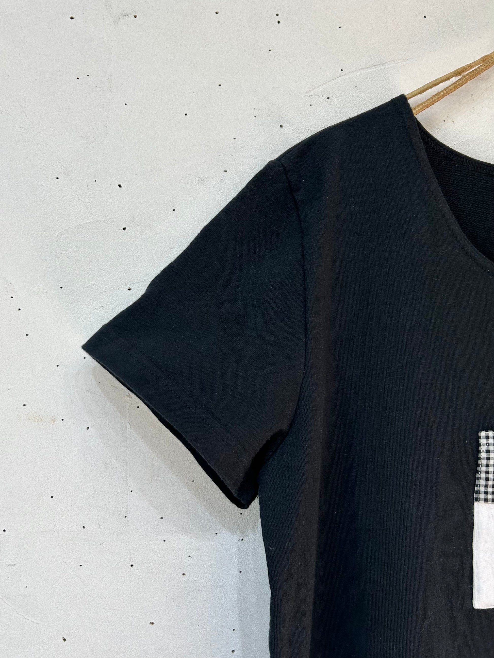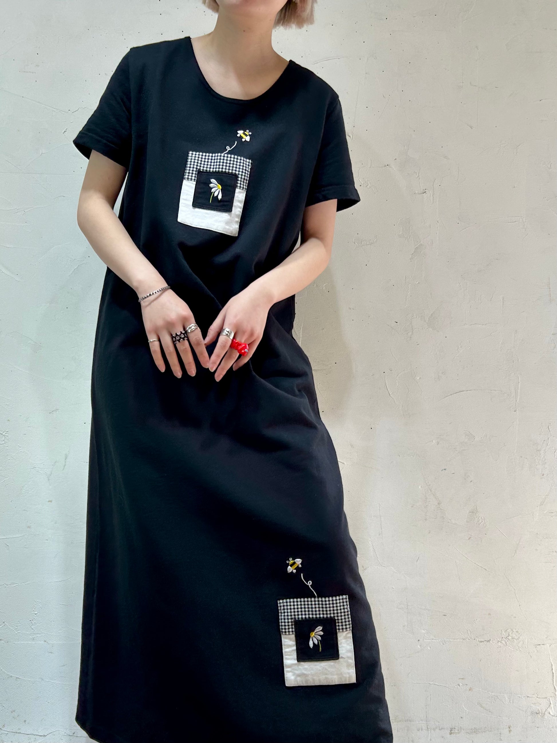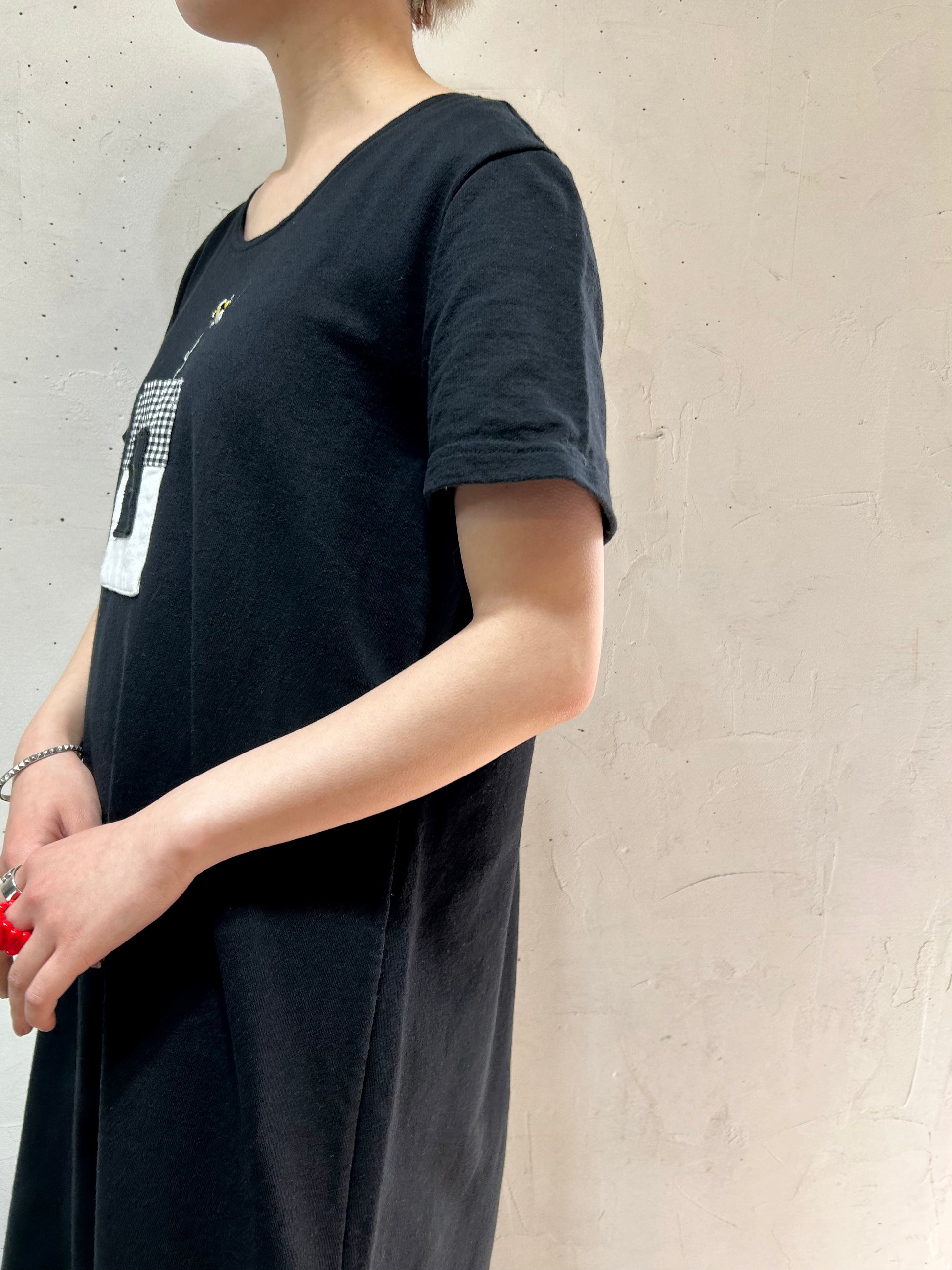 ブラックボディにモノトーンギンガムチェックのパッチポケットと、刺繍が可愛らしい1着。