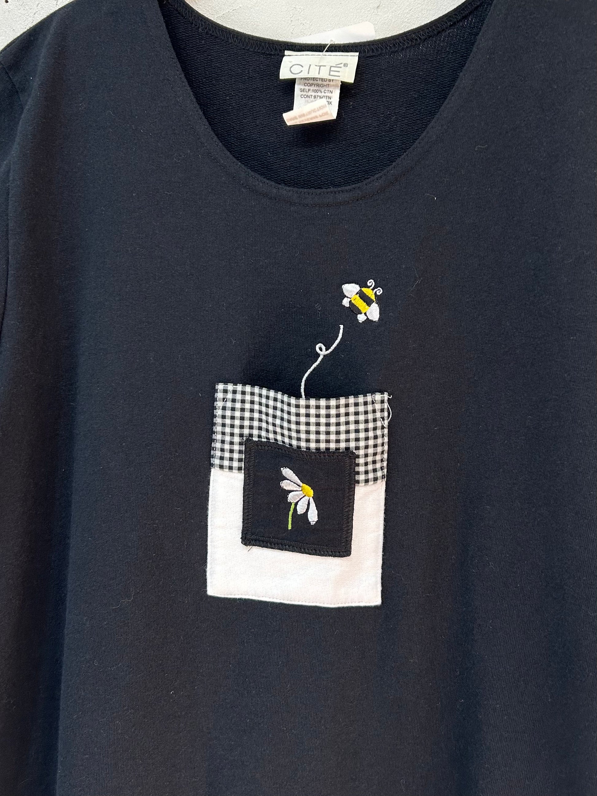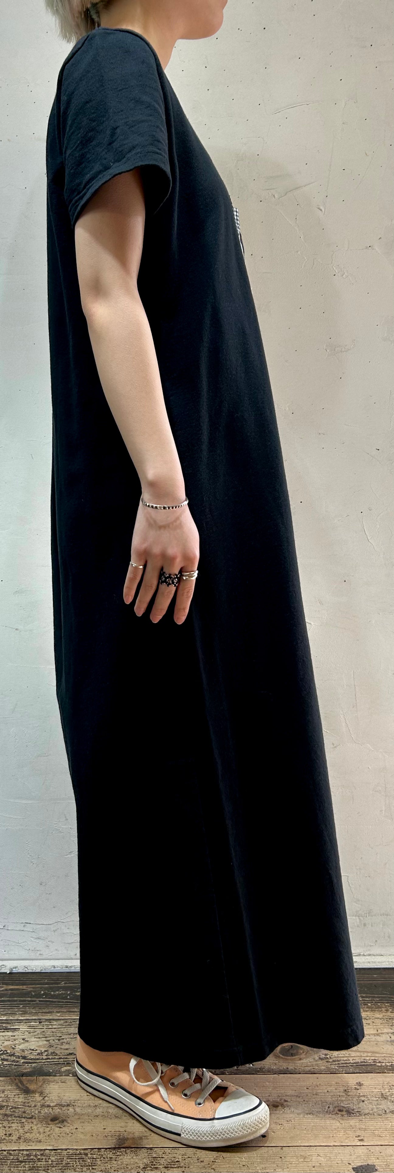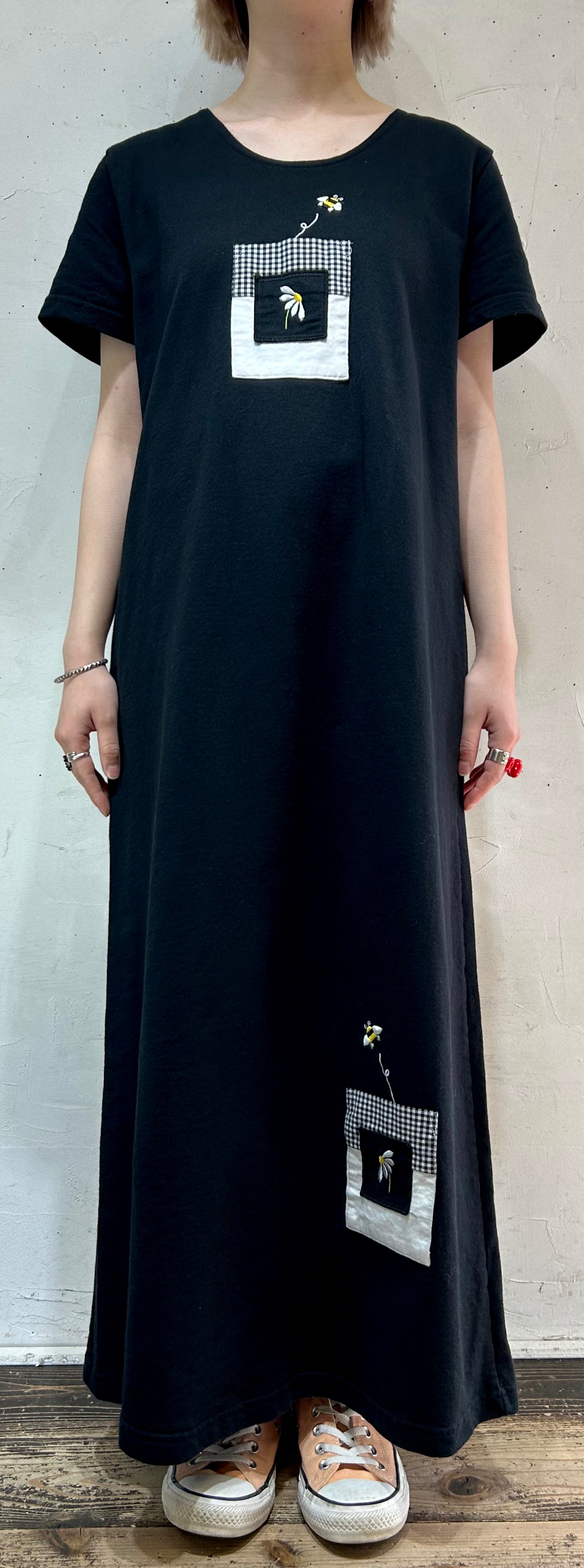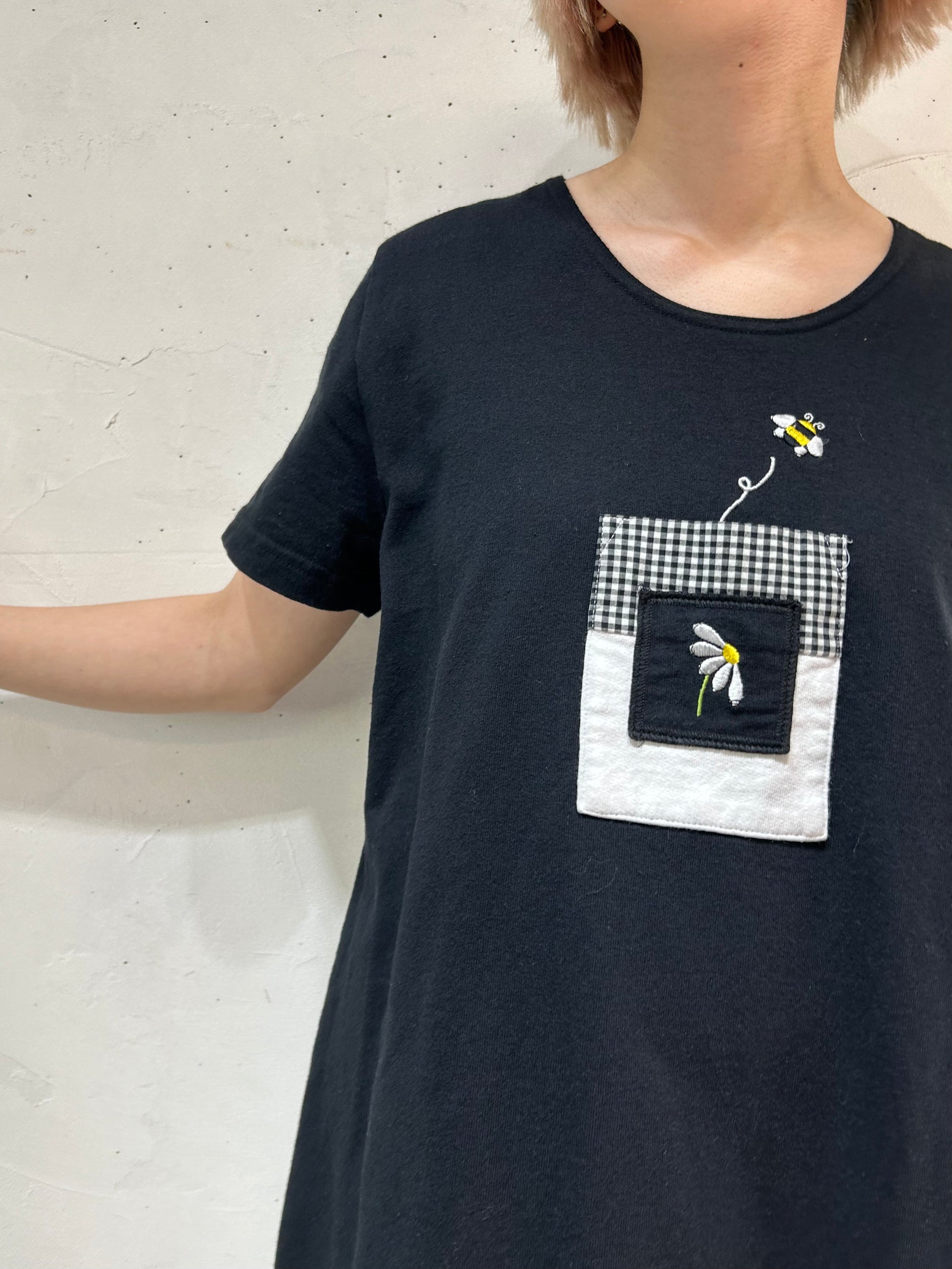 ブラックボディにモノトーンギンガムチェックのパッチポケットと、刺繍が可愛らしい1着。