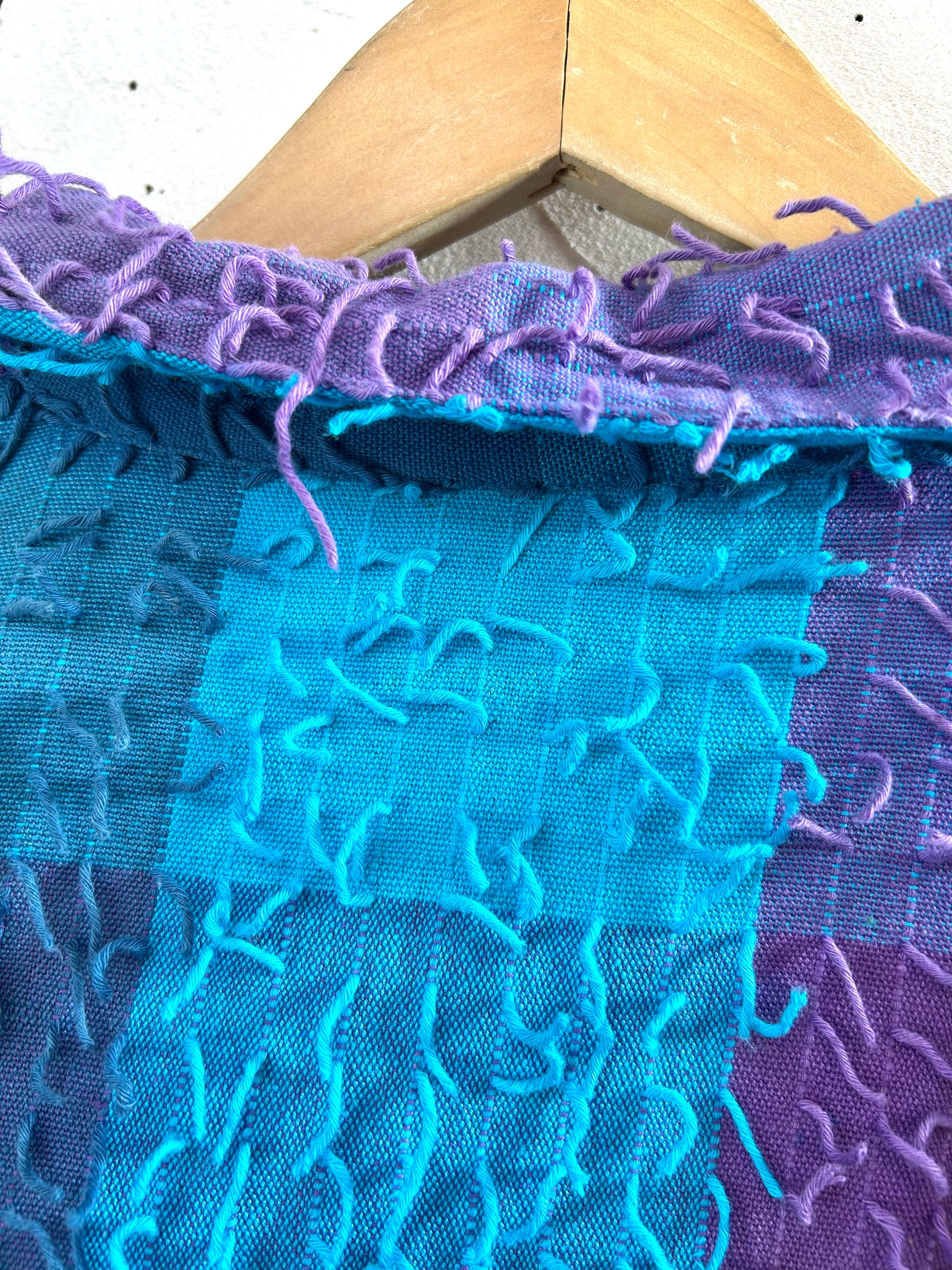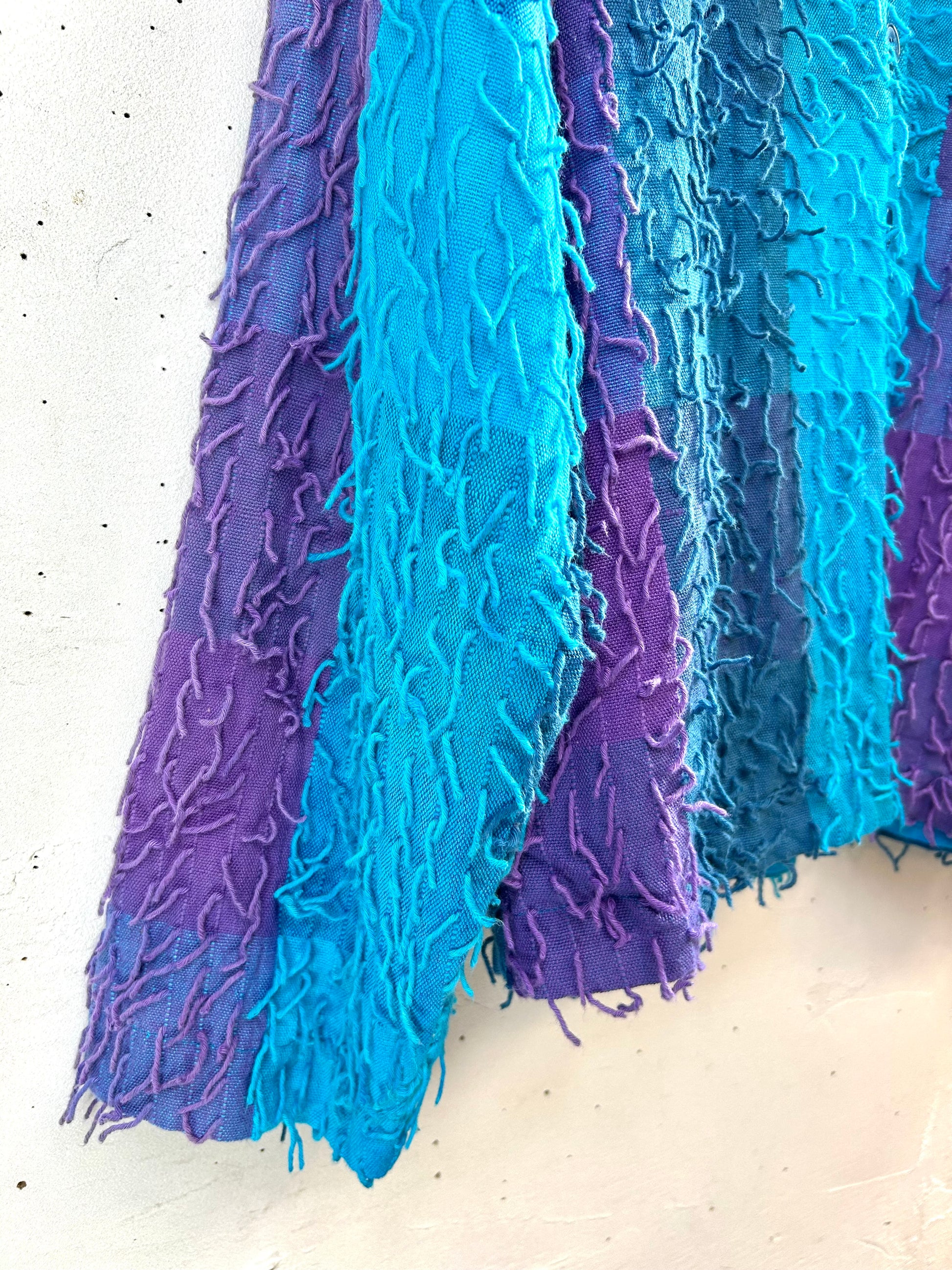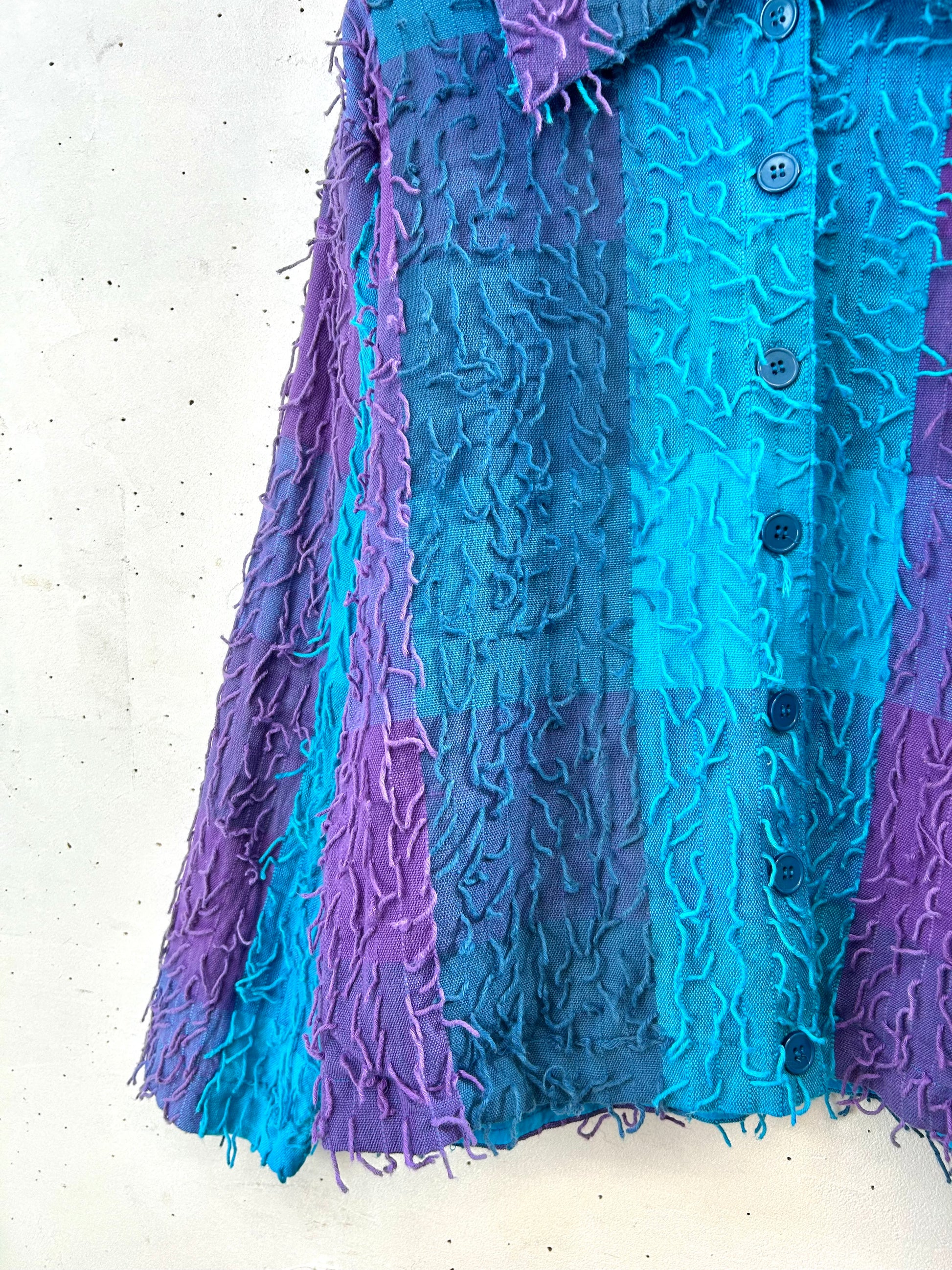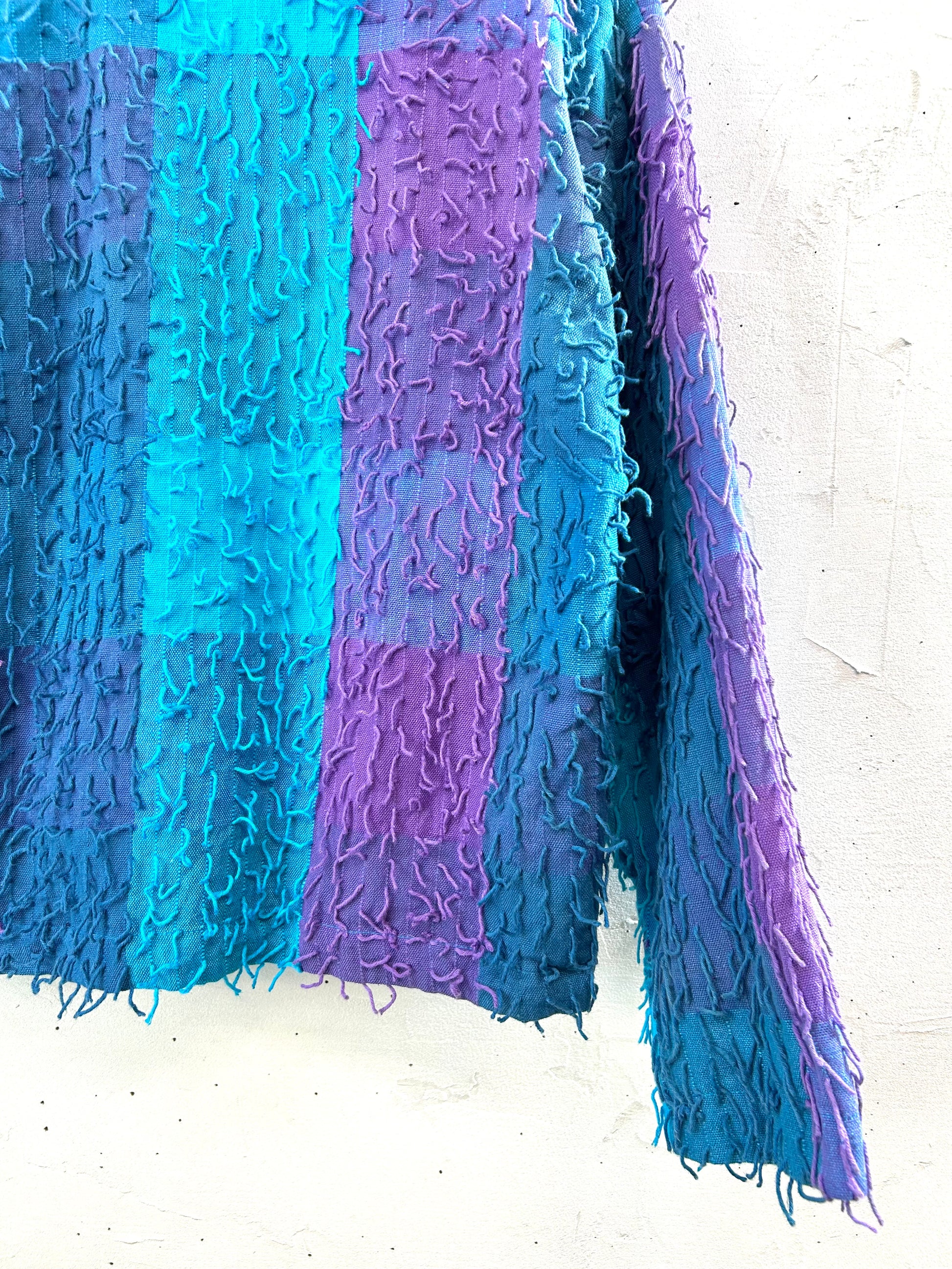 ブルー&パープルの魅力的なカラーリングの織りとモケモケとしたフリンジデザインがビンテージらしいユニークな一着。
