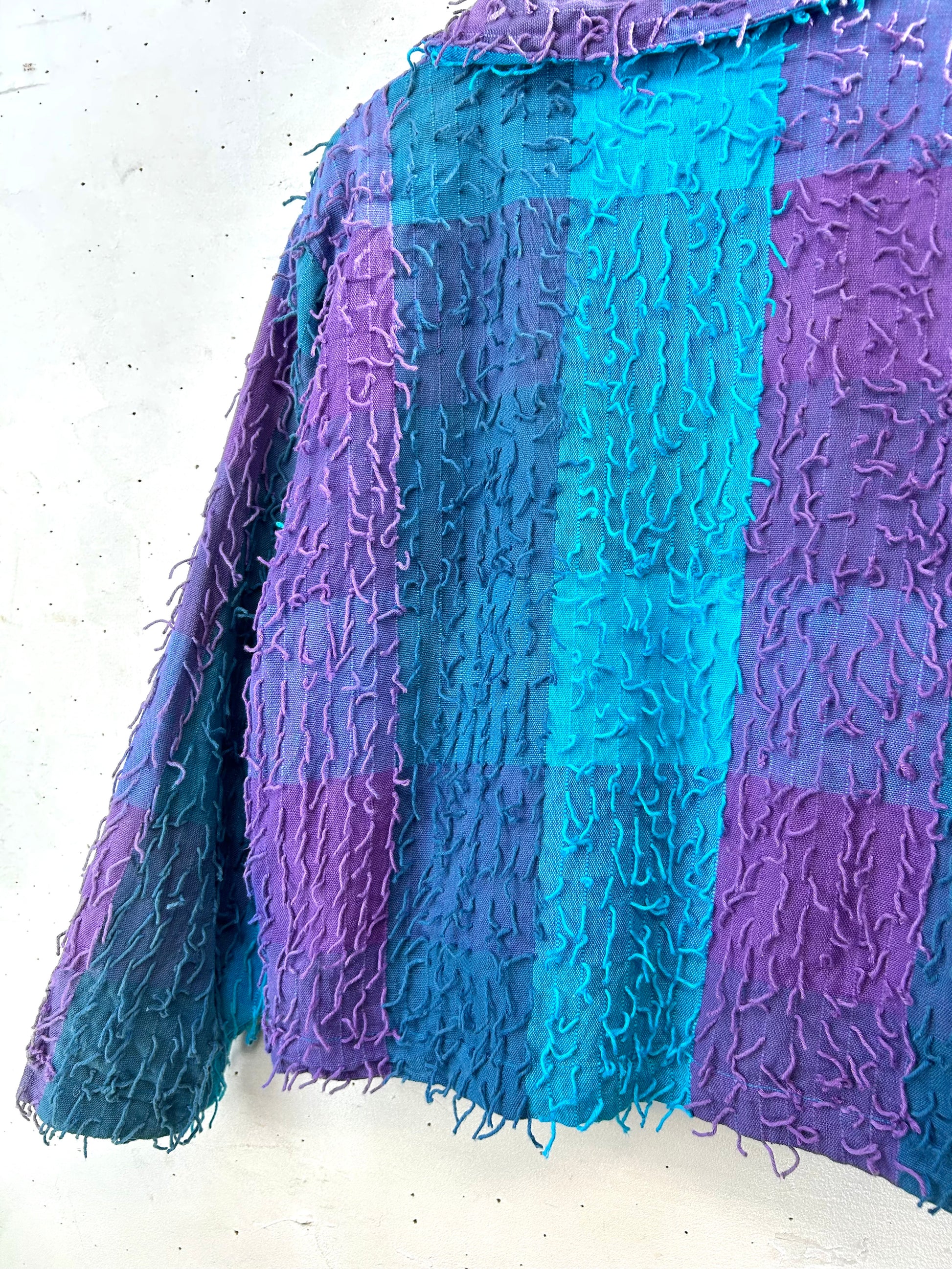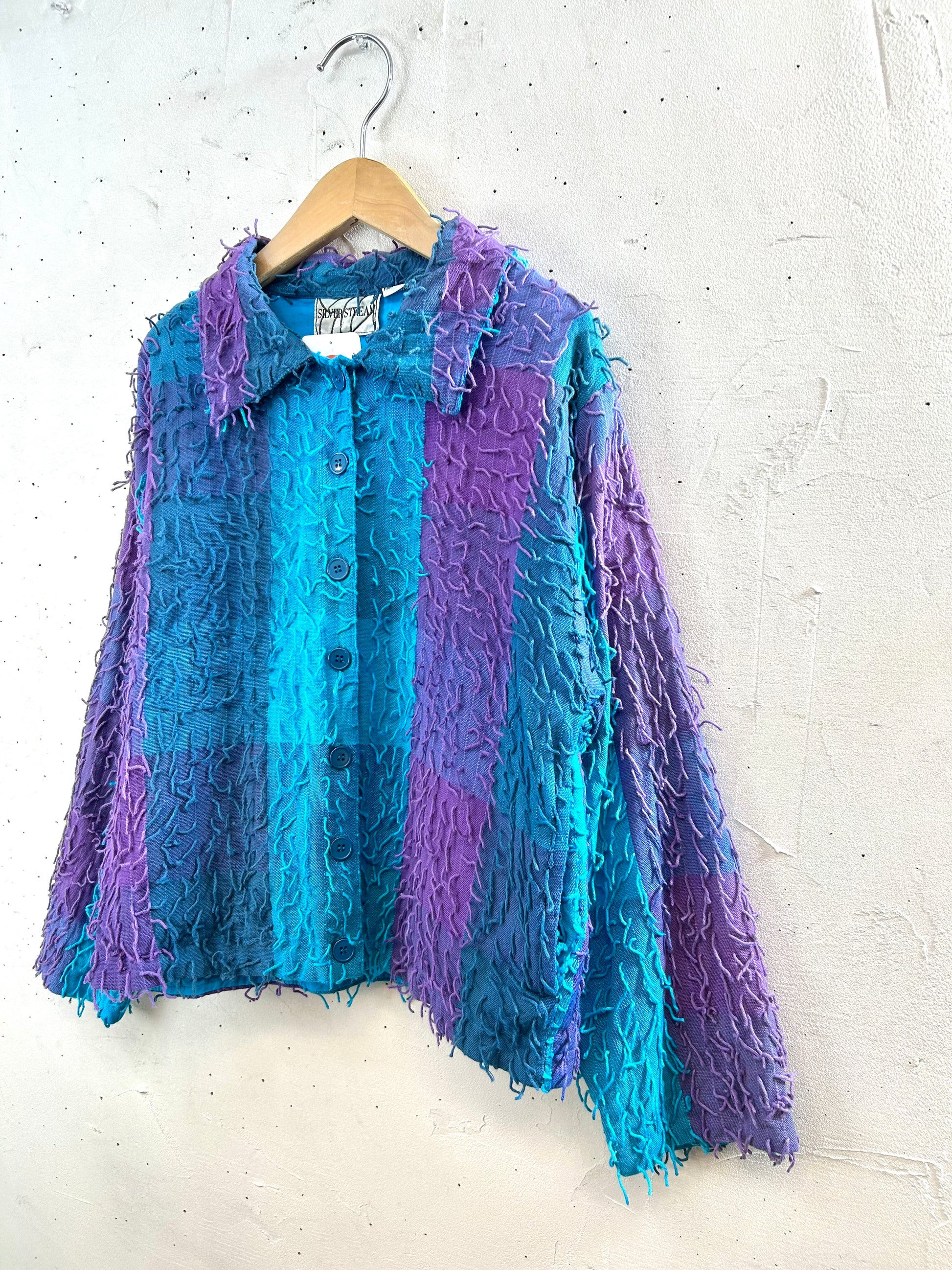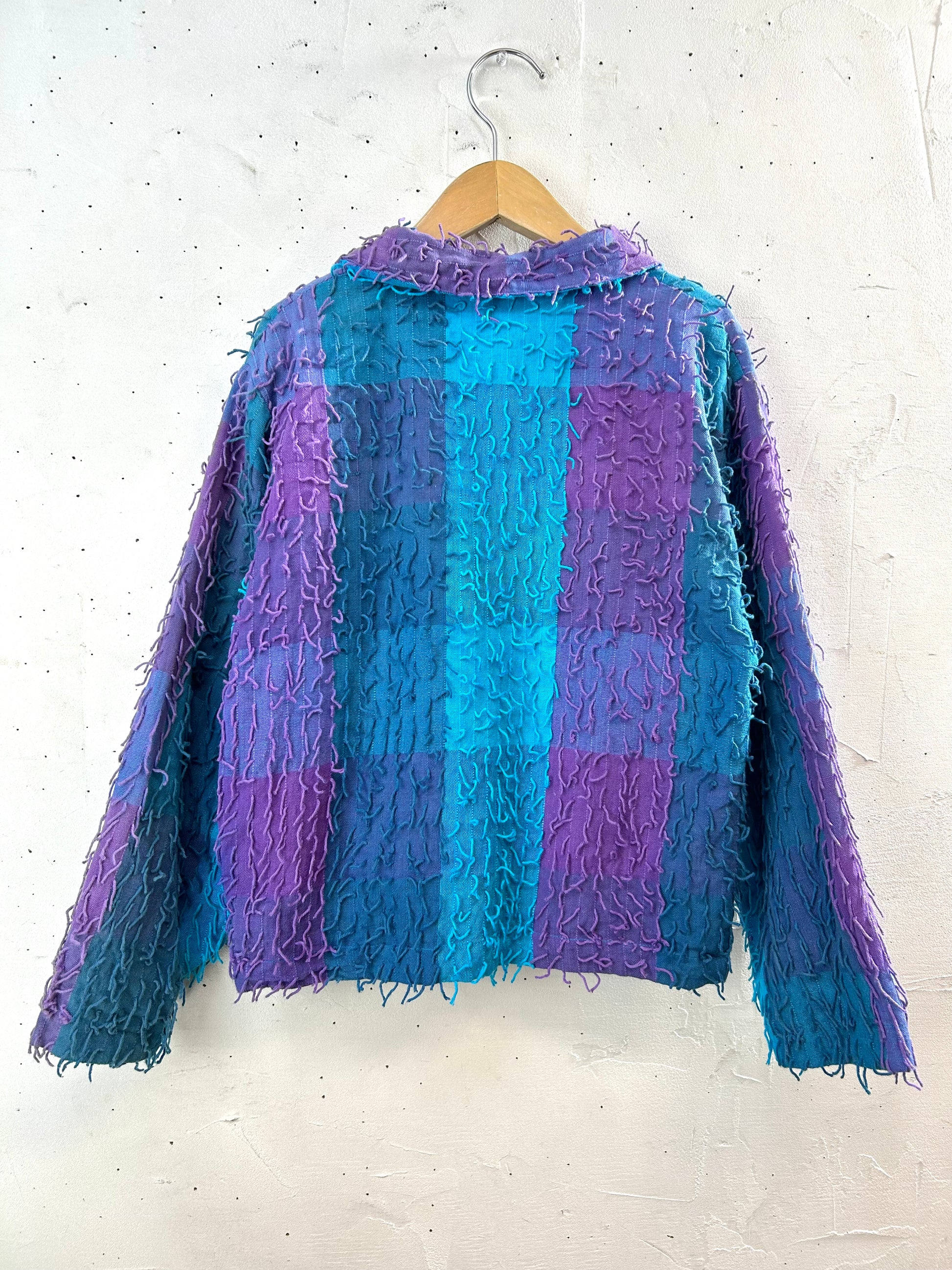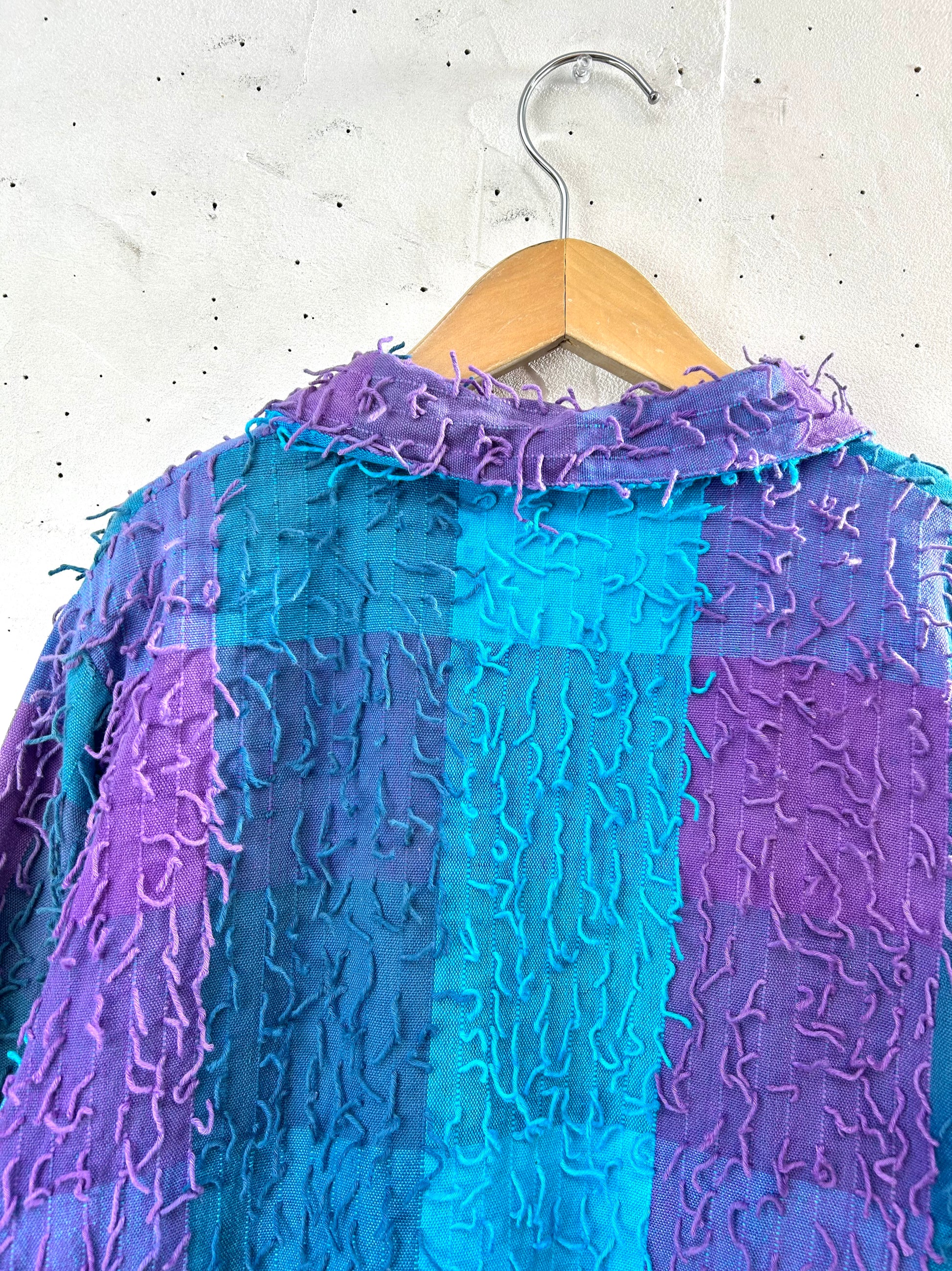 ブルー&パープルの魅力的なカラーリングの織りとモケモケとしたフリンジデザインがビンテージらしいユニークな一着。