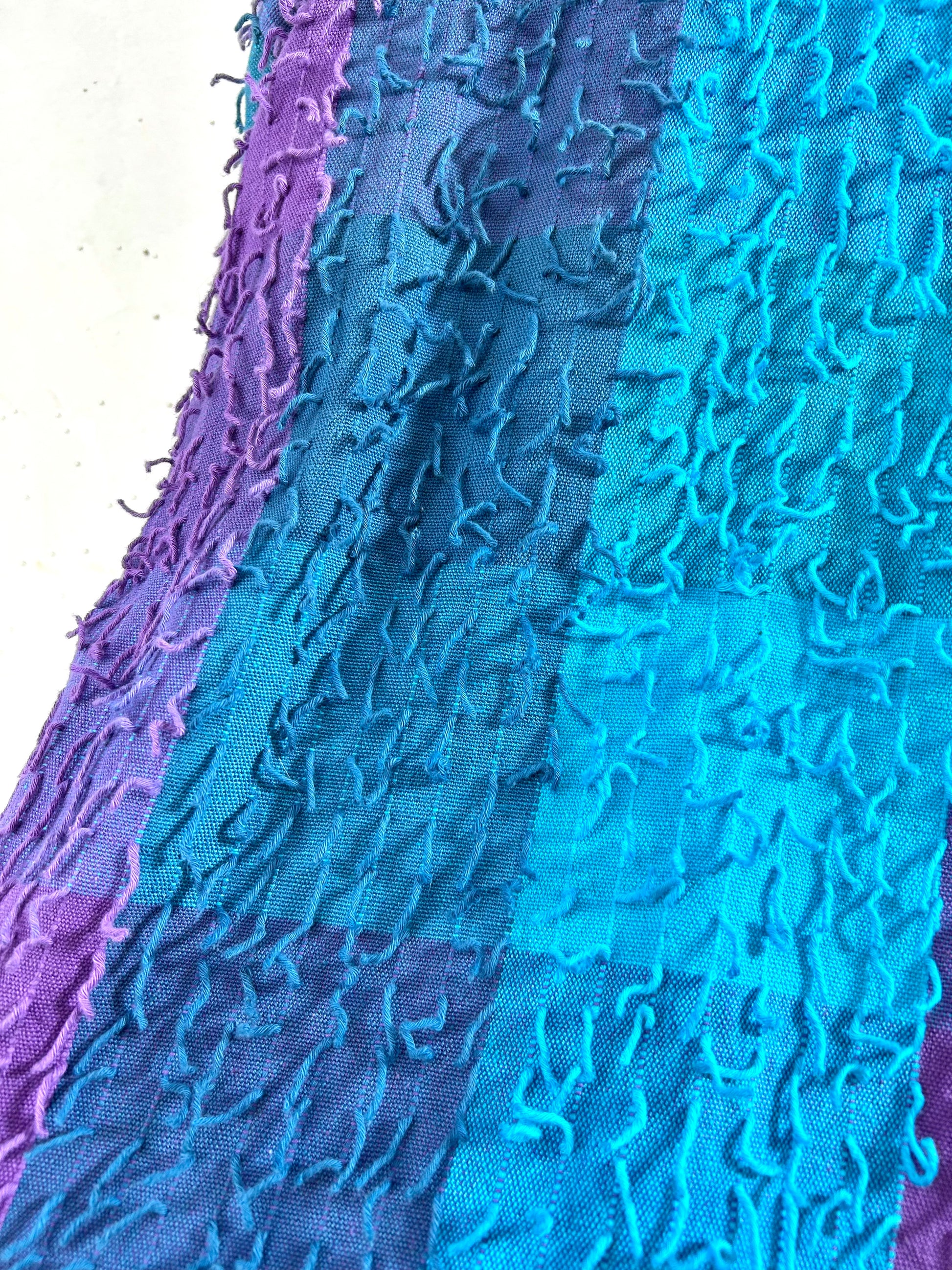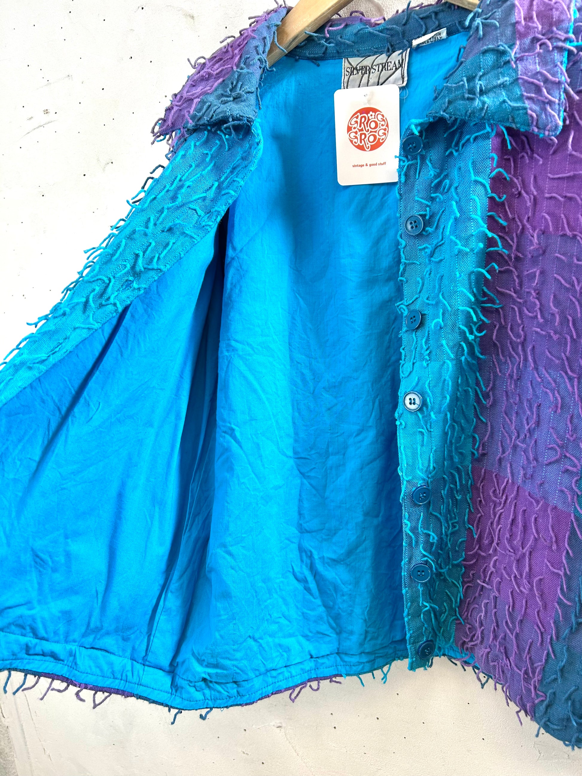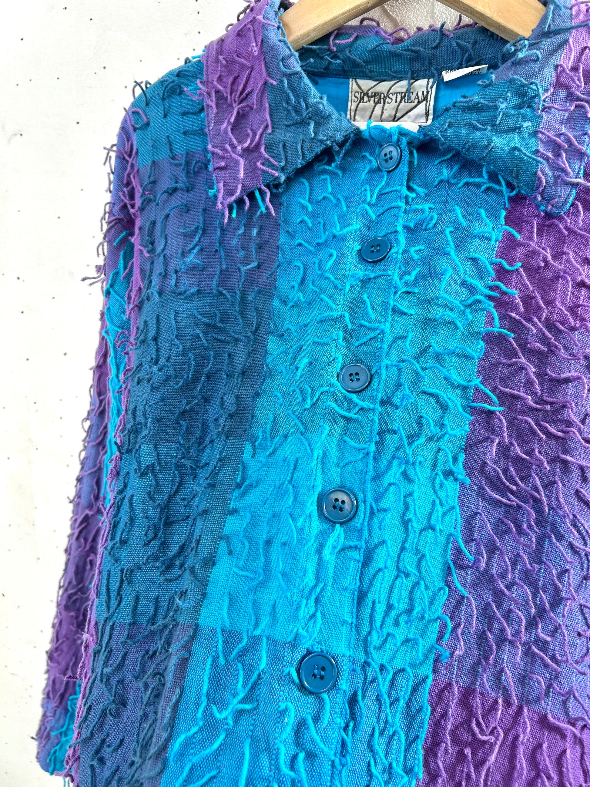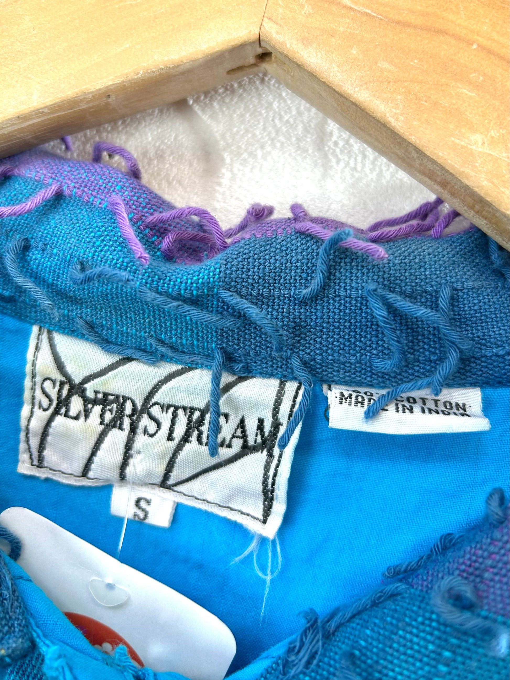 ブルー&パープルの魅力的なカラーリングの織りとモケモケとしたフリンジデザインがビンテージらしいユニークな一着。