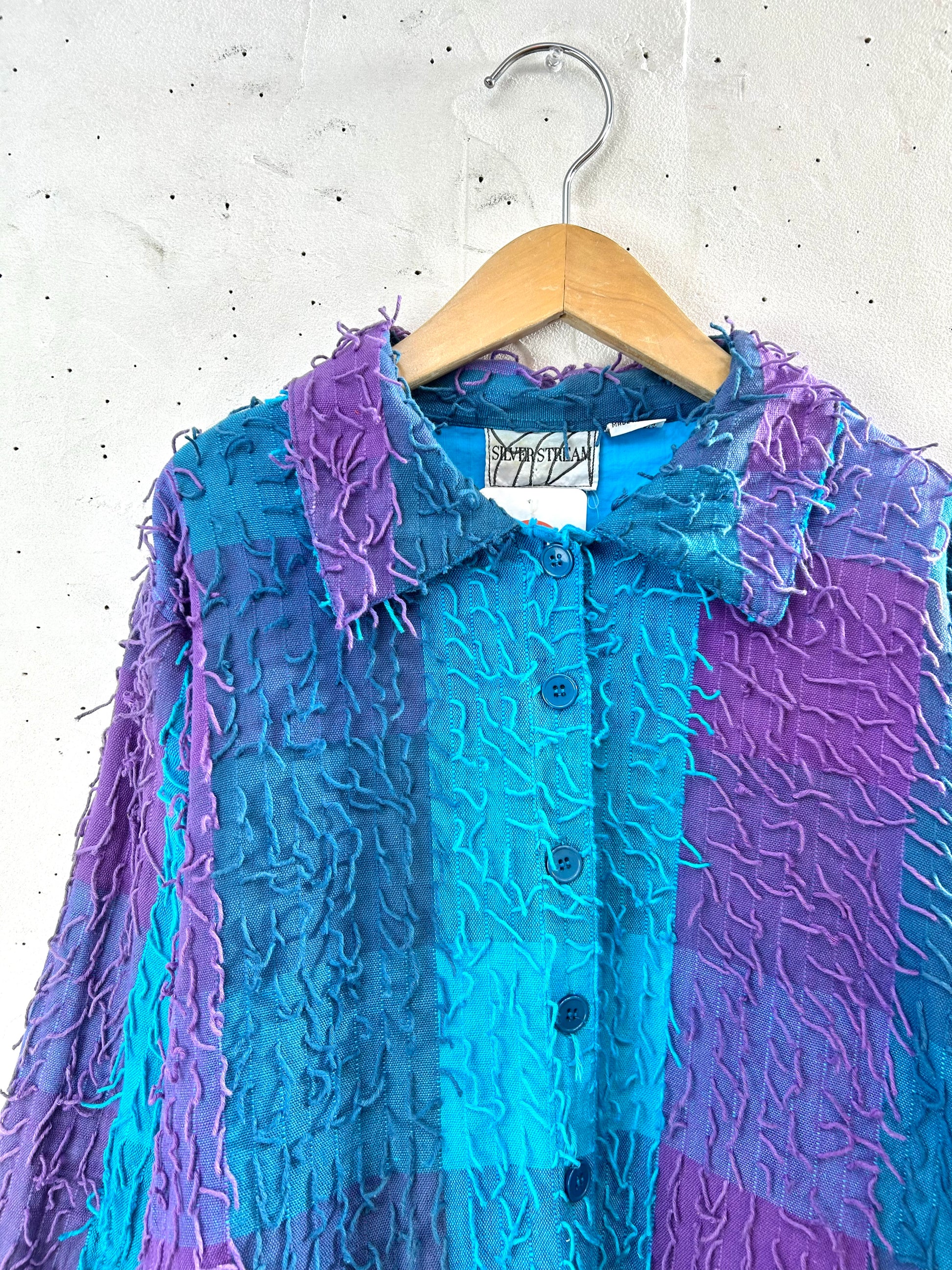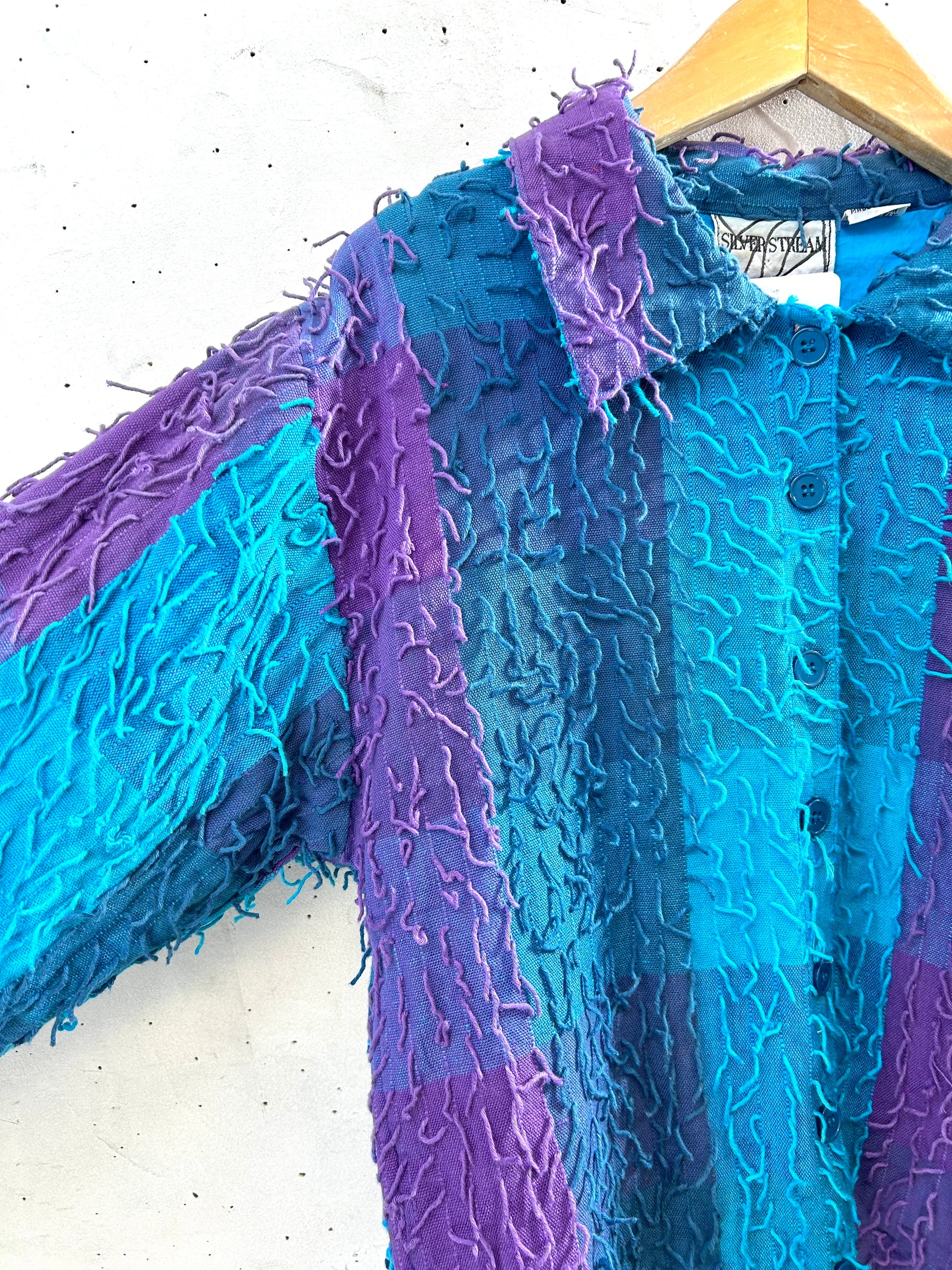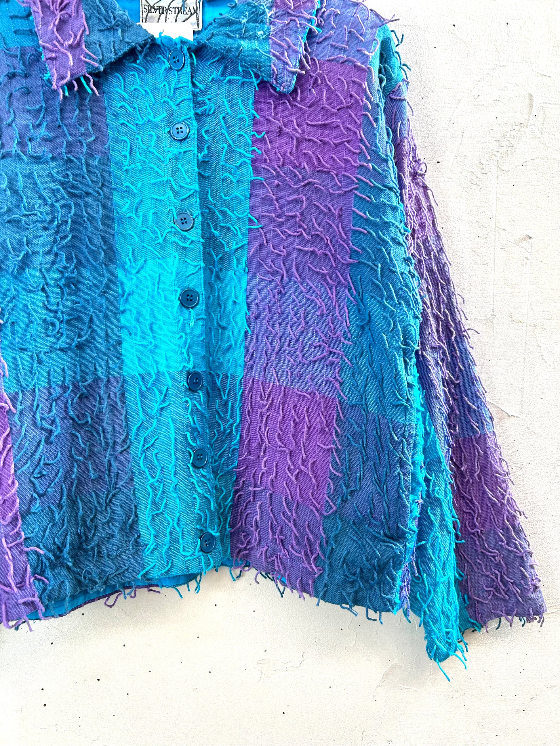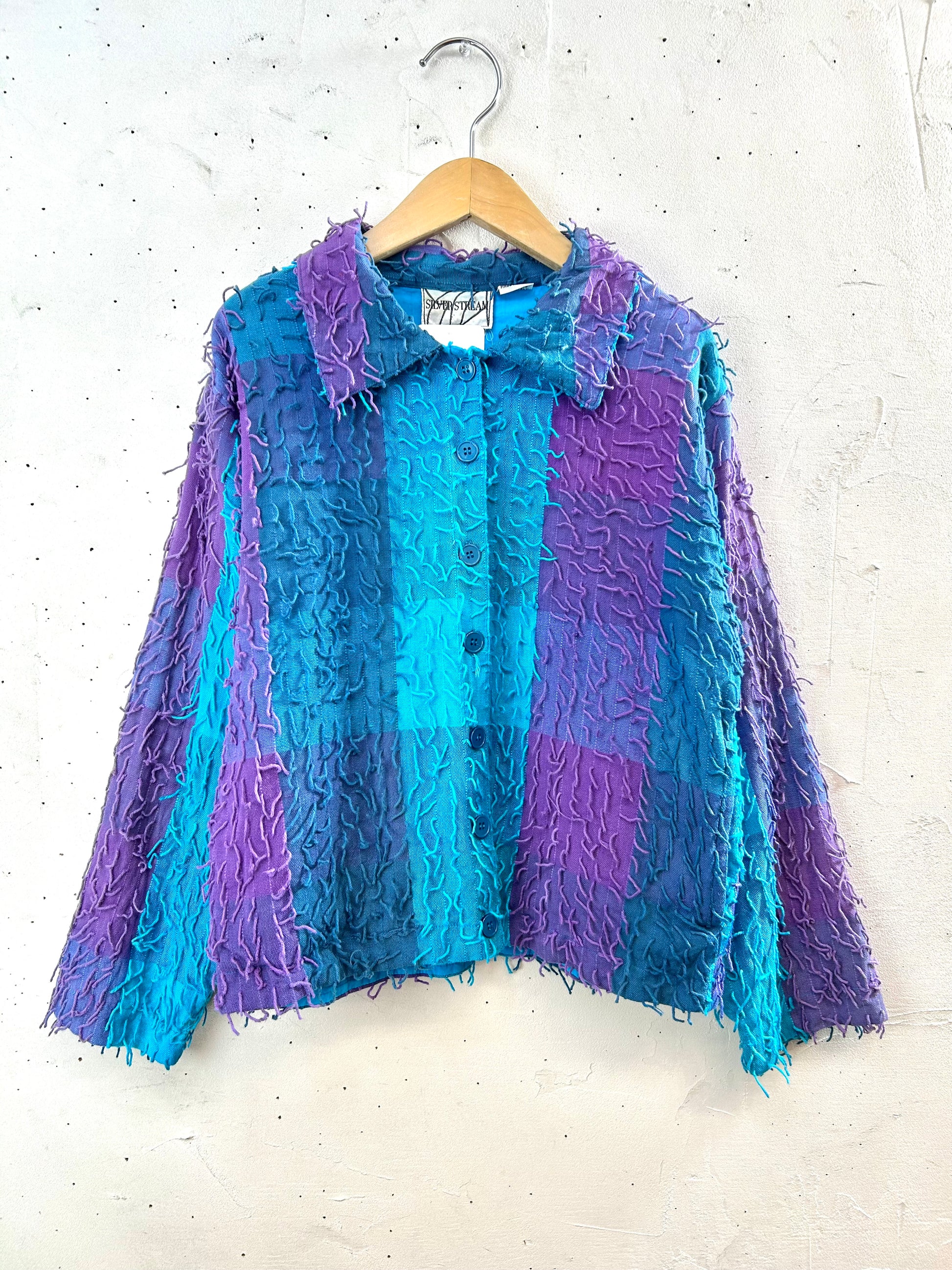 ブルー&パープルの魅力的なカラーリングの織りとモケモケとしたフリンジデザインがビンテージらしいユニークな一着。