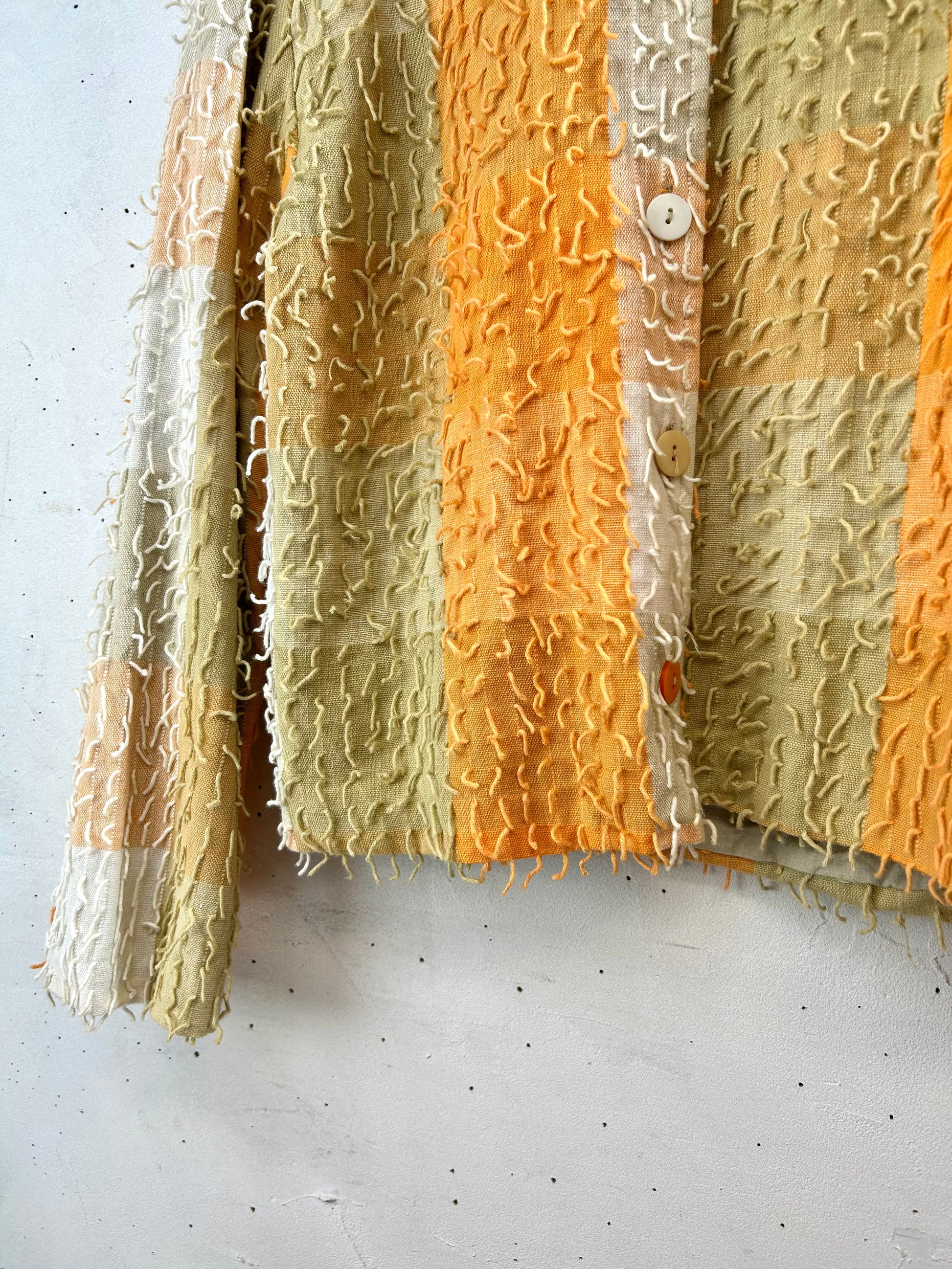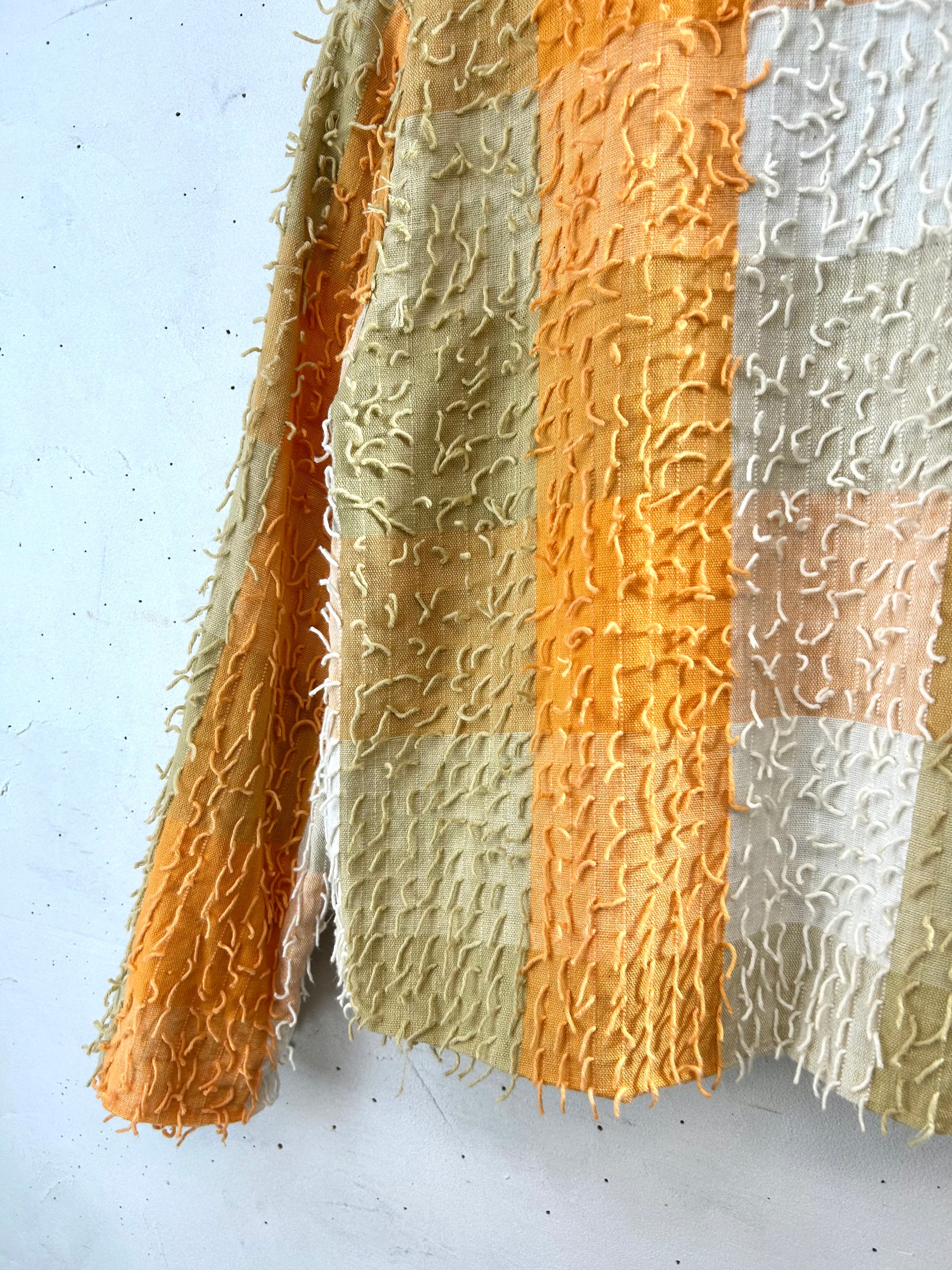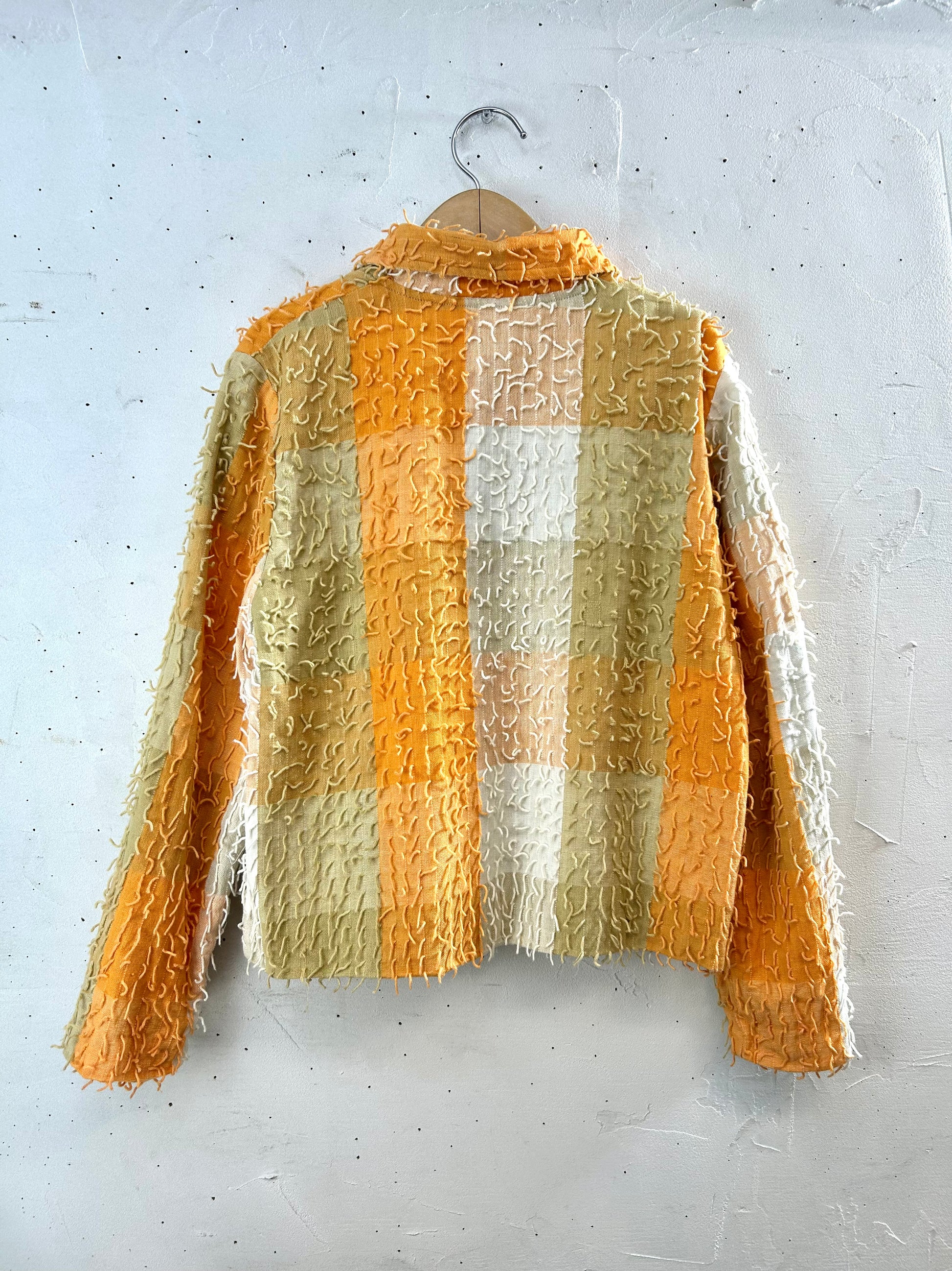オレンジ&ベージュベースの魅力的なカラーリングの織りとモケモケとしたフリンジデザインがビンテージらしいユニークな一着。