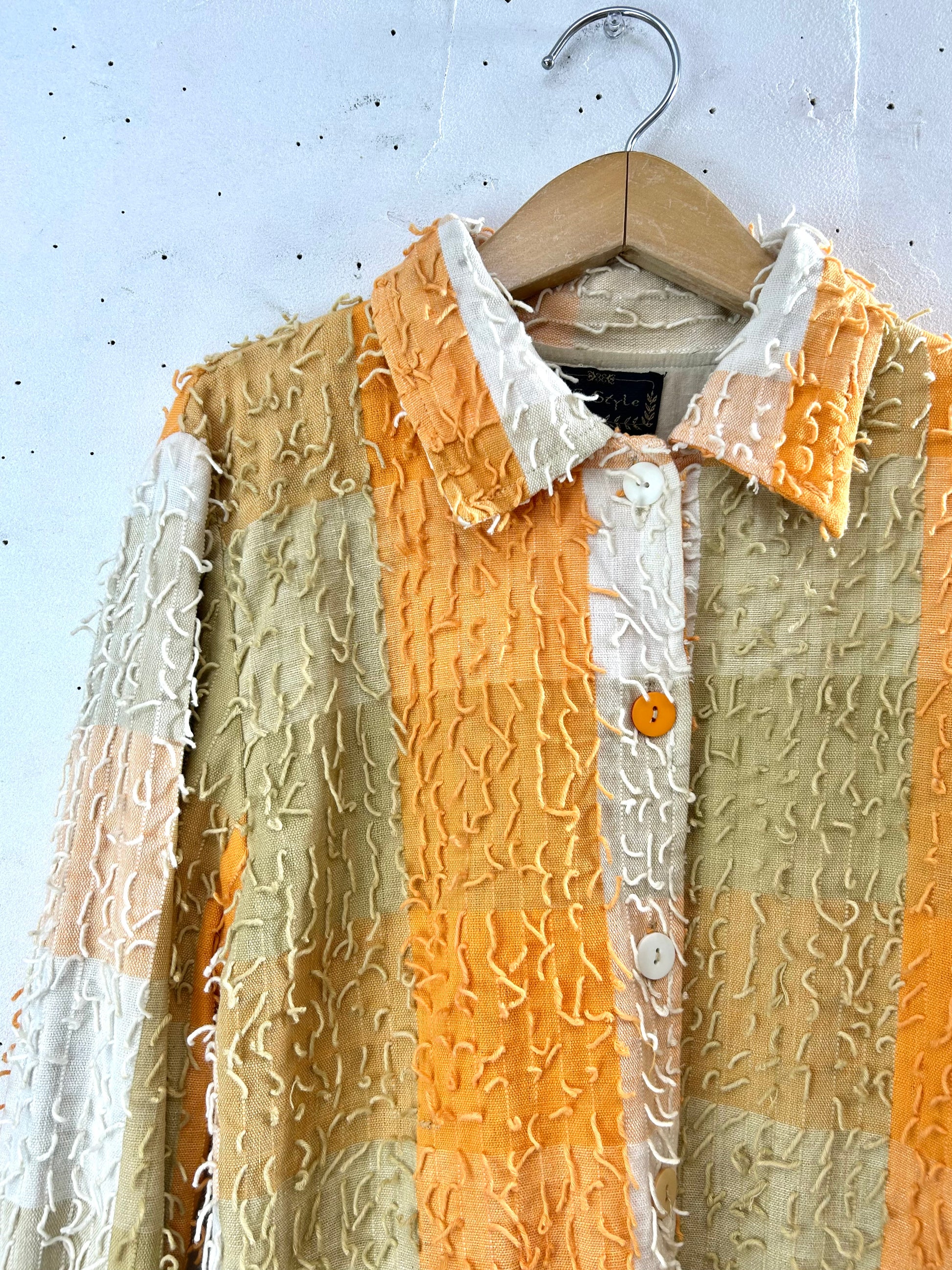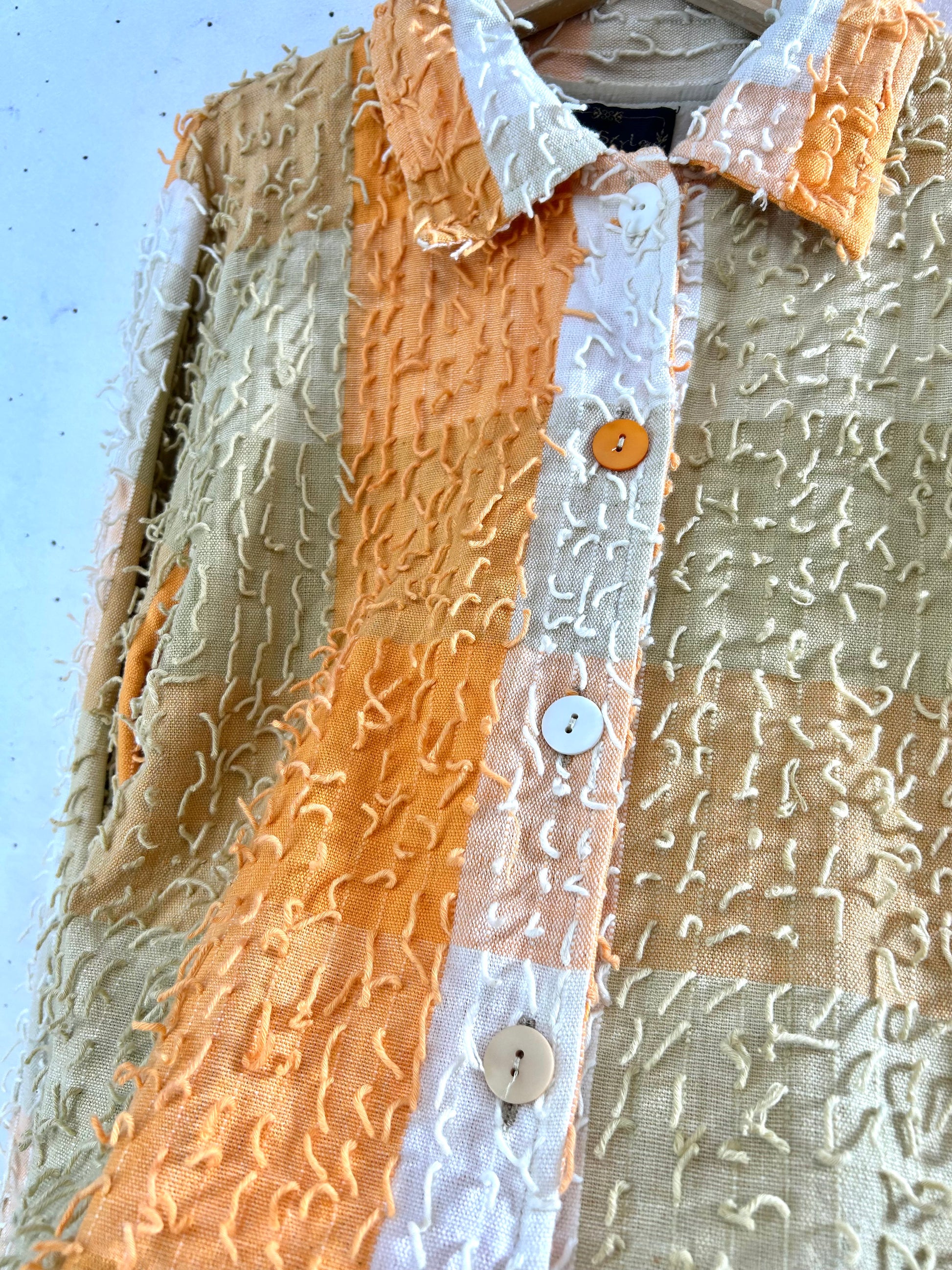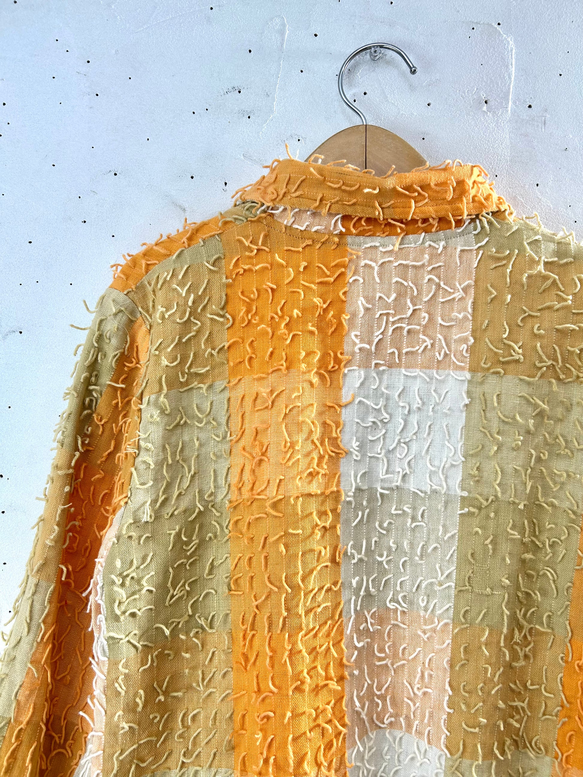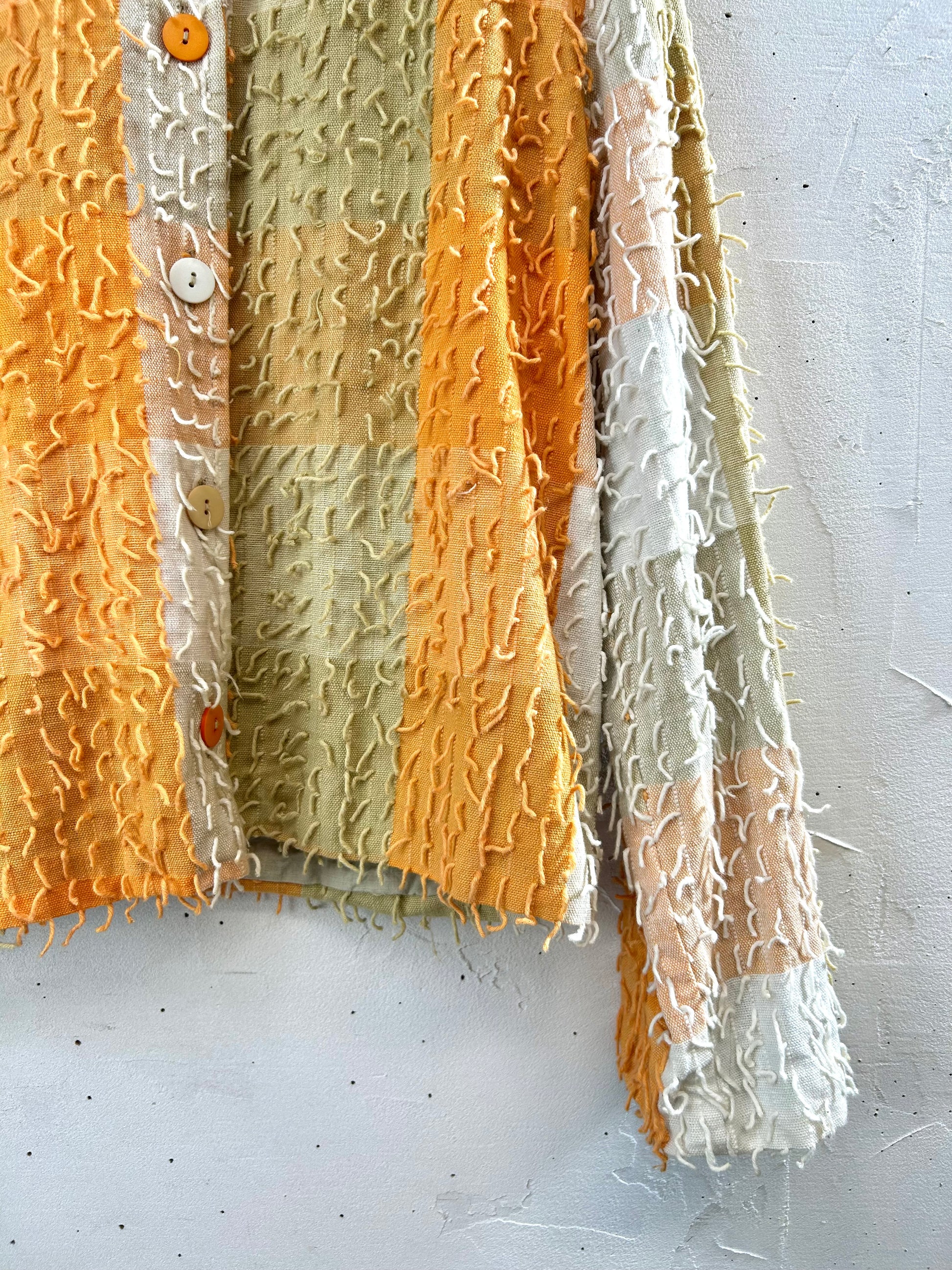 オレンジ&ベージュベースの魅力的なカラーリングの織りとモケモケとしたフリンジデザインがビンテージらしいユニークな一着。