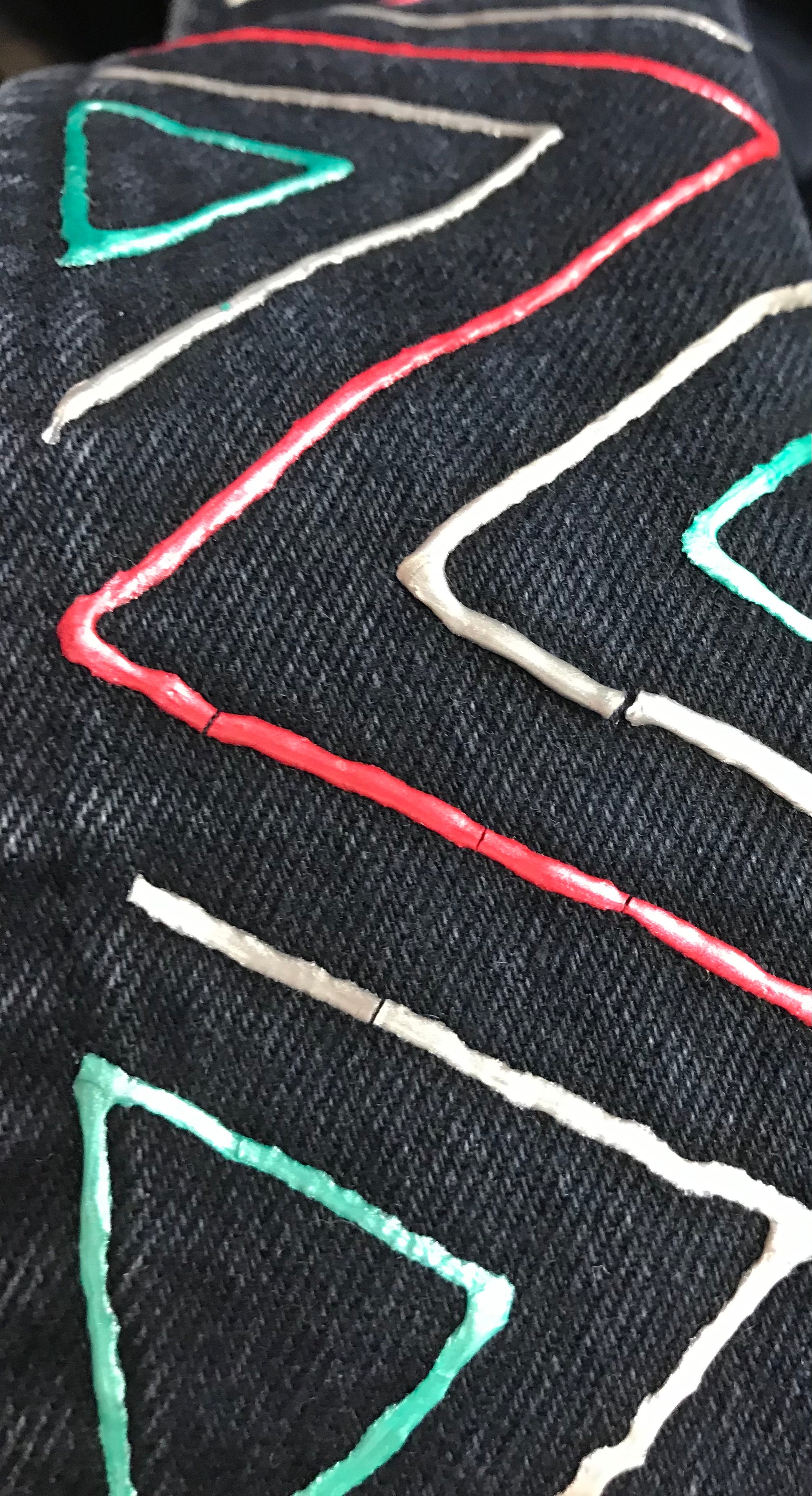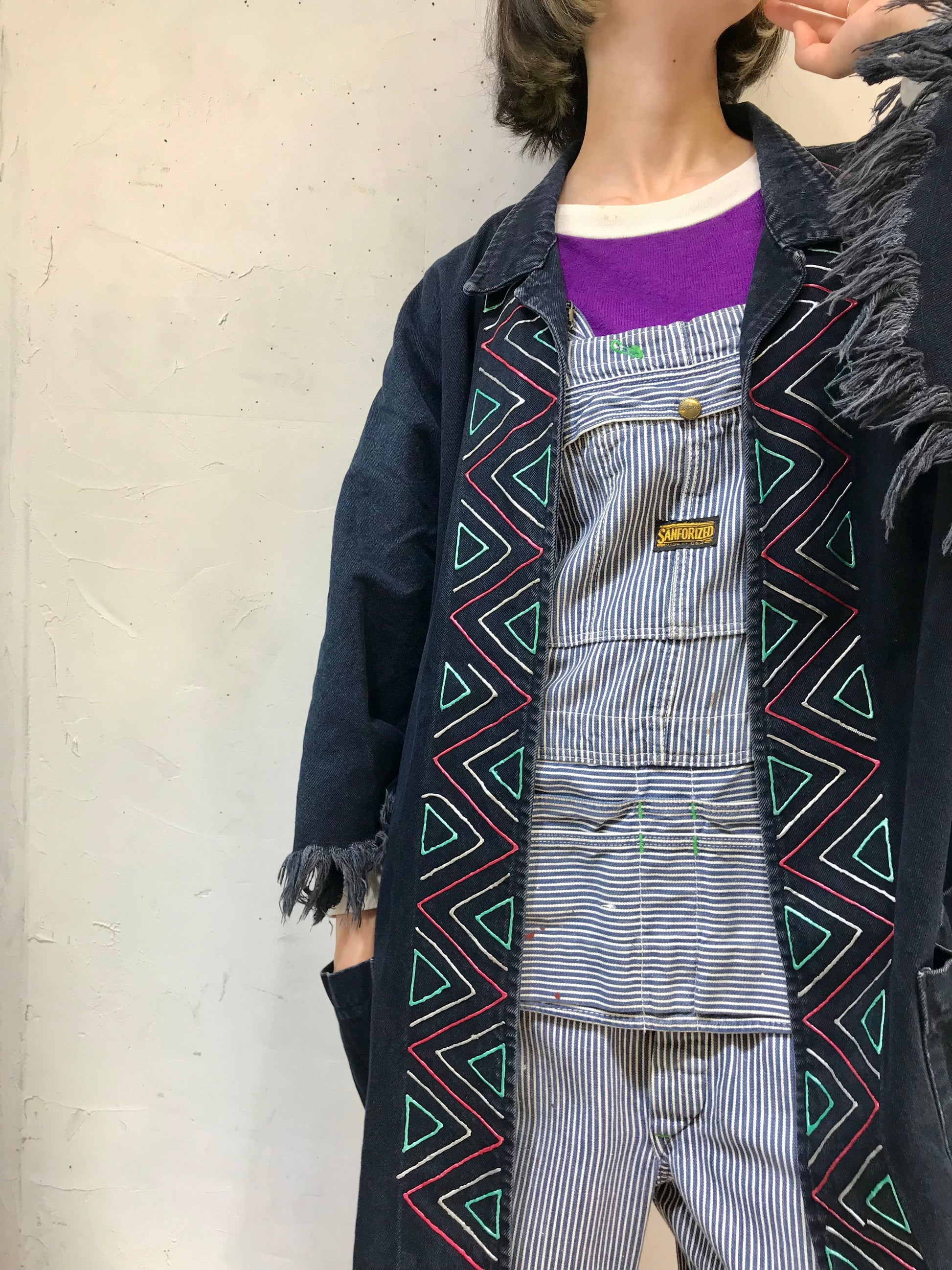 しっかりとした生地感ながら柔らかなデニムボディに、三角やギザギザの立体的なプリントが可愛らしい一着。