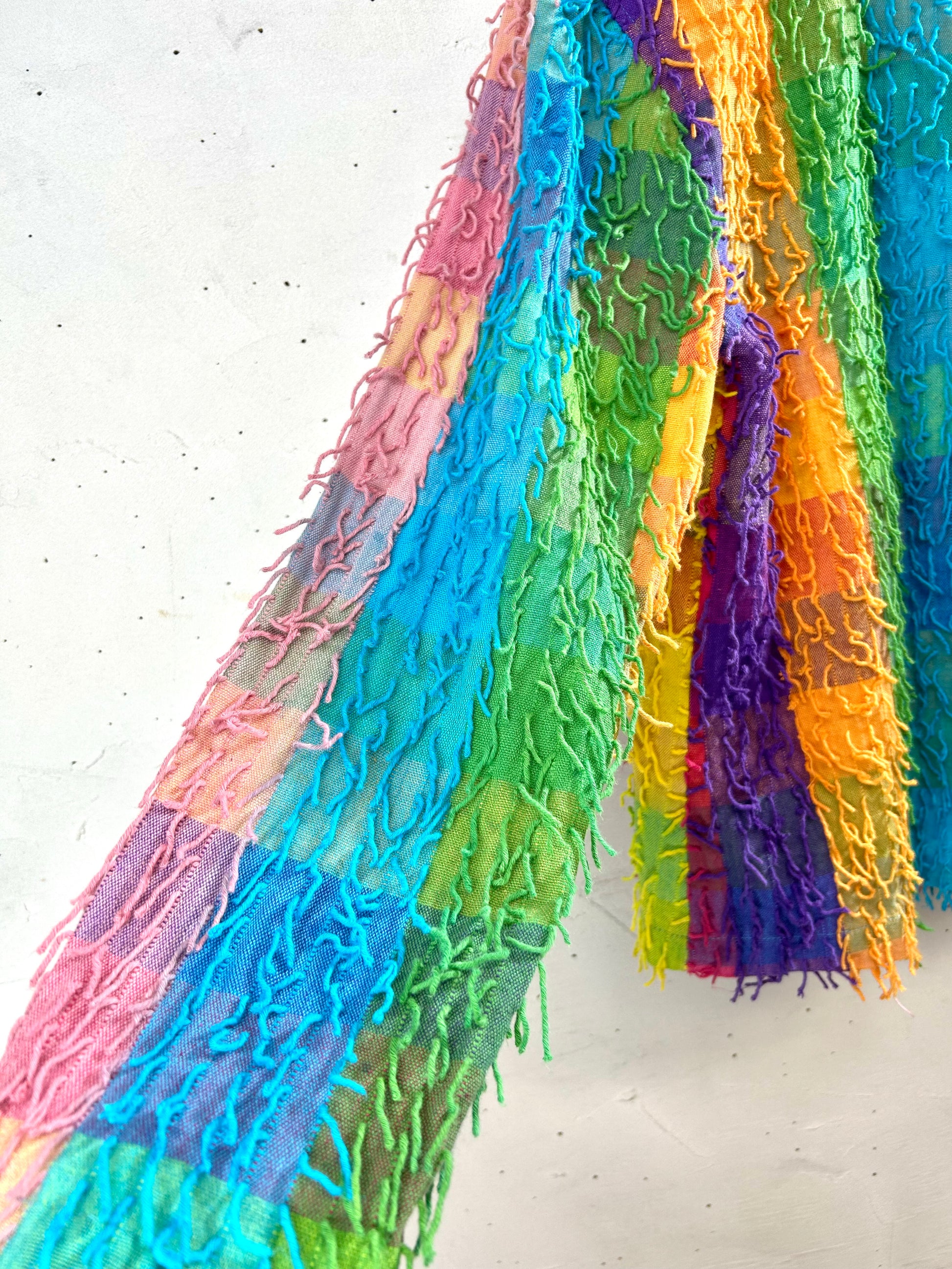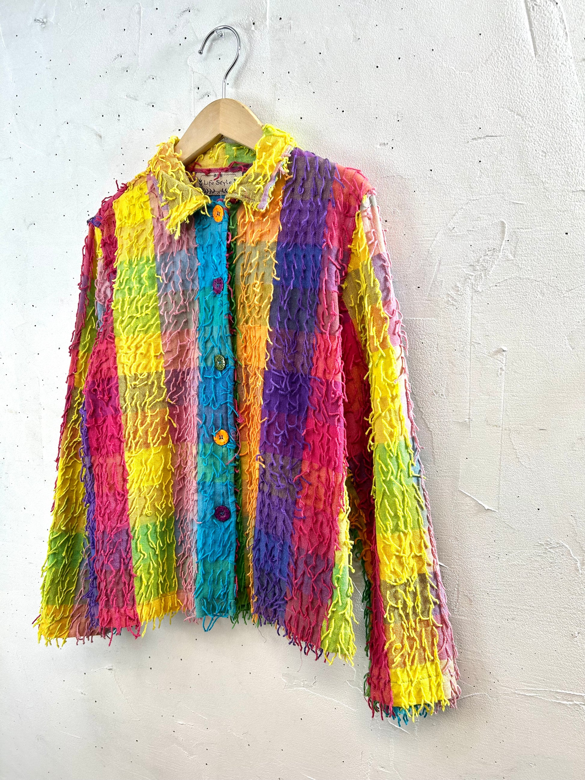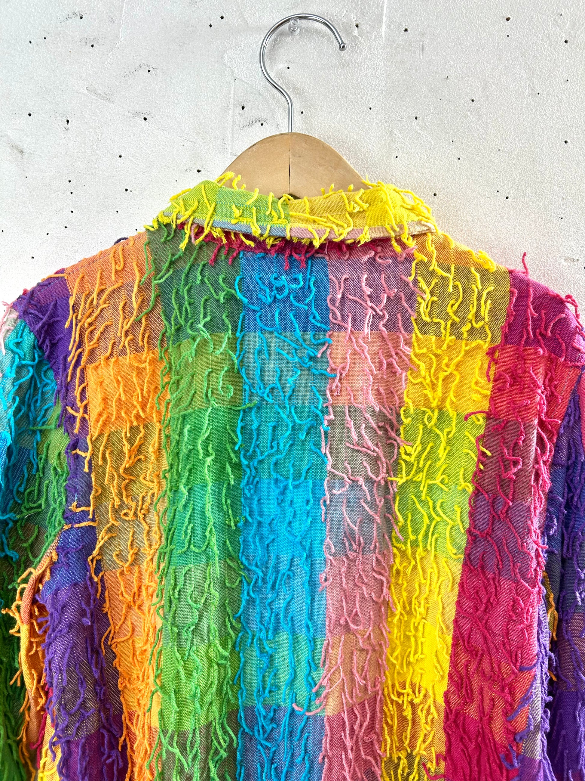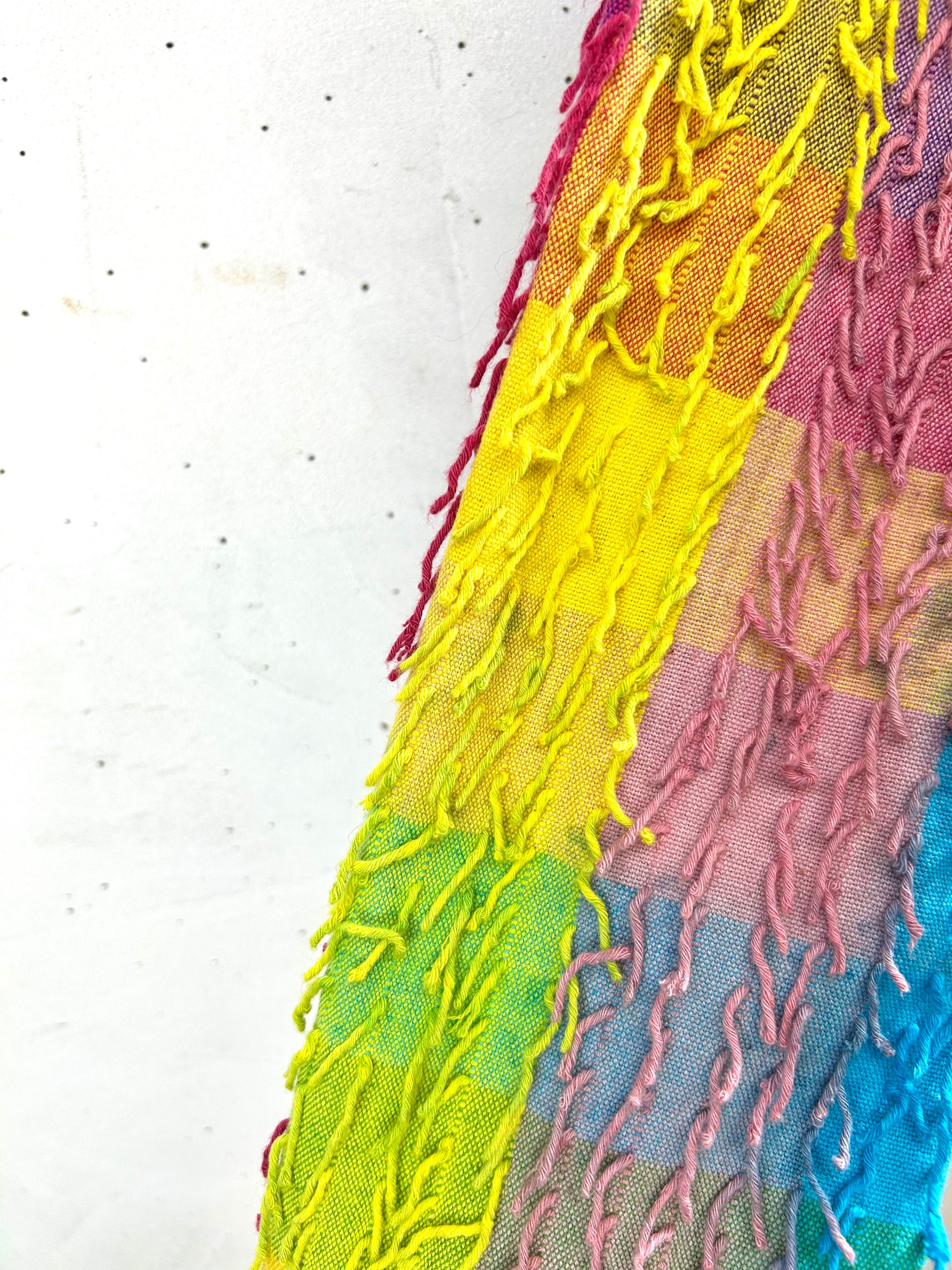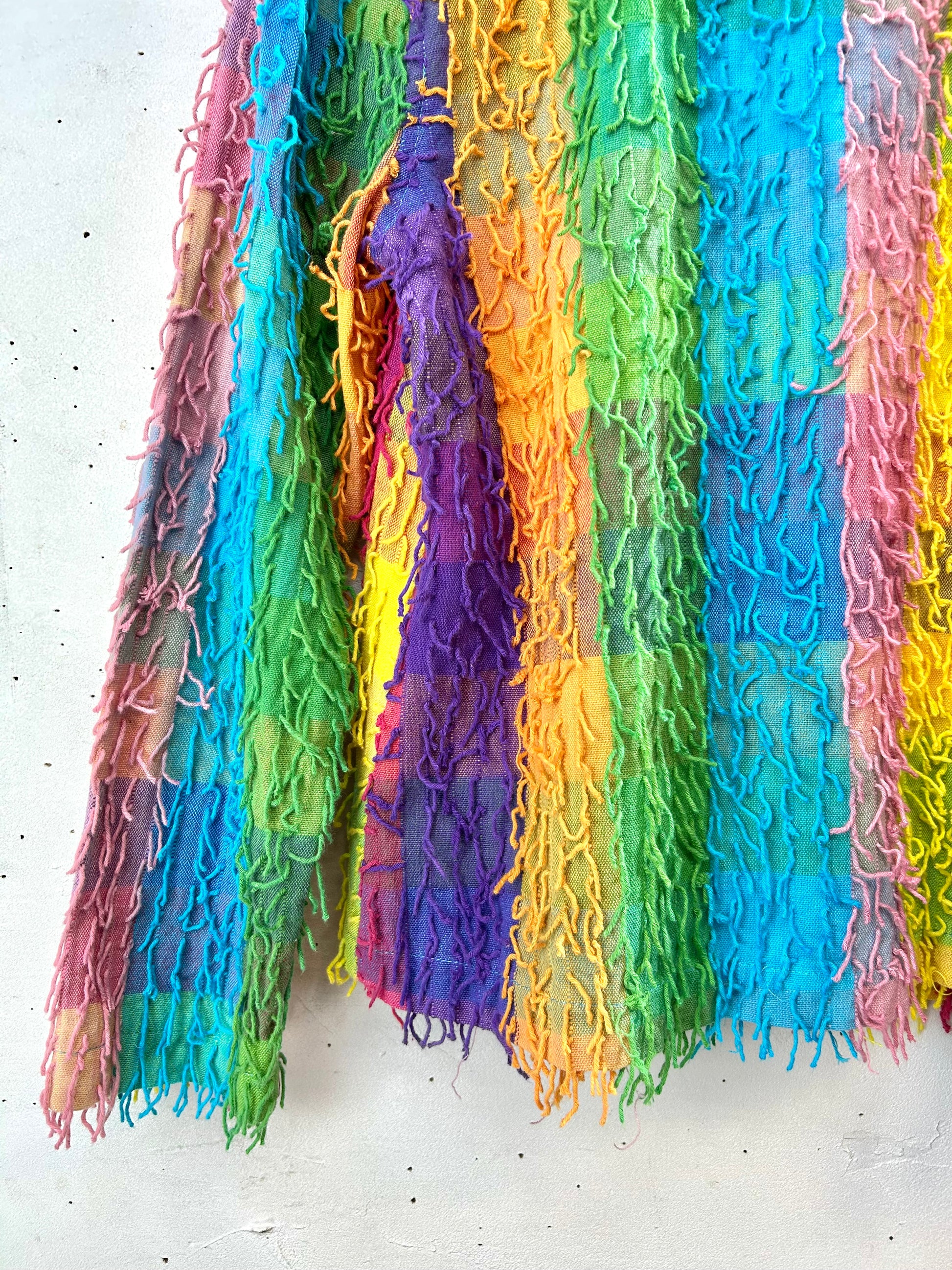 カラフルなカラーリングの織りとモケモケとしたフリンジデザインがビンテージらしいユニークな一着。