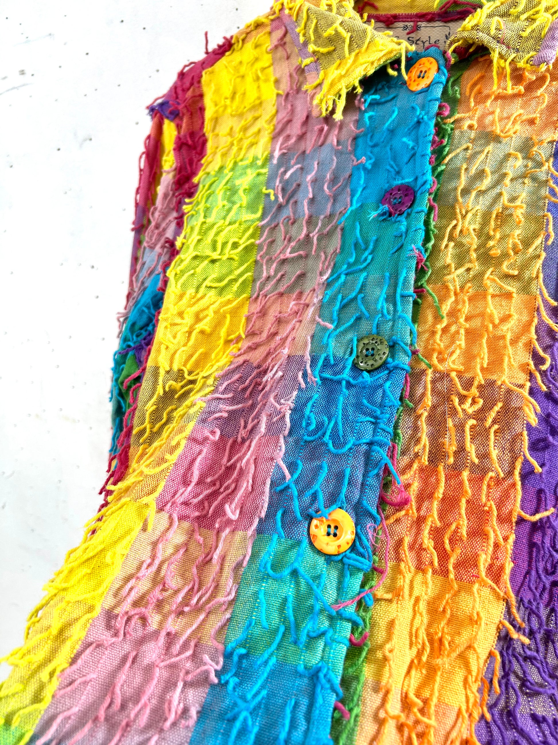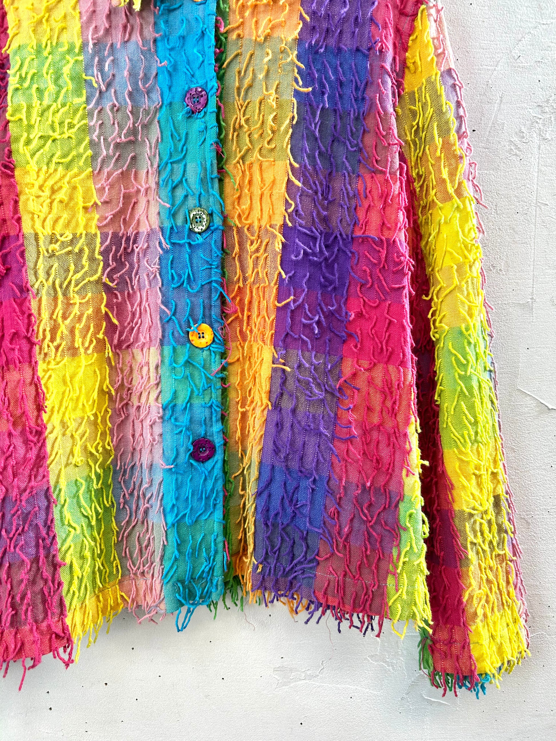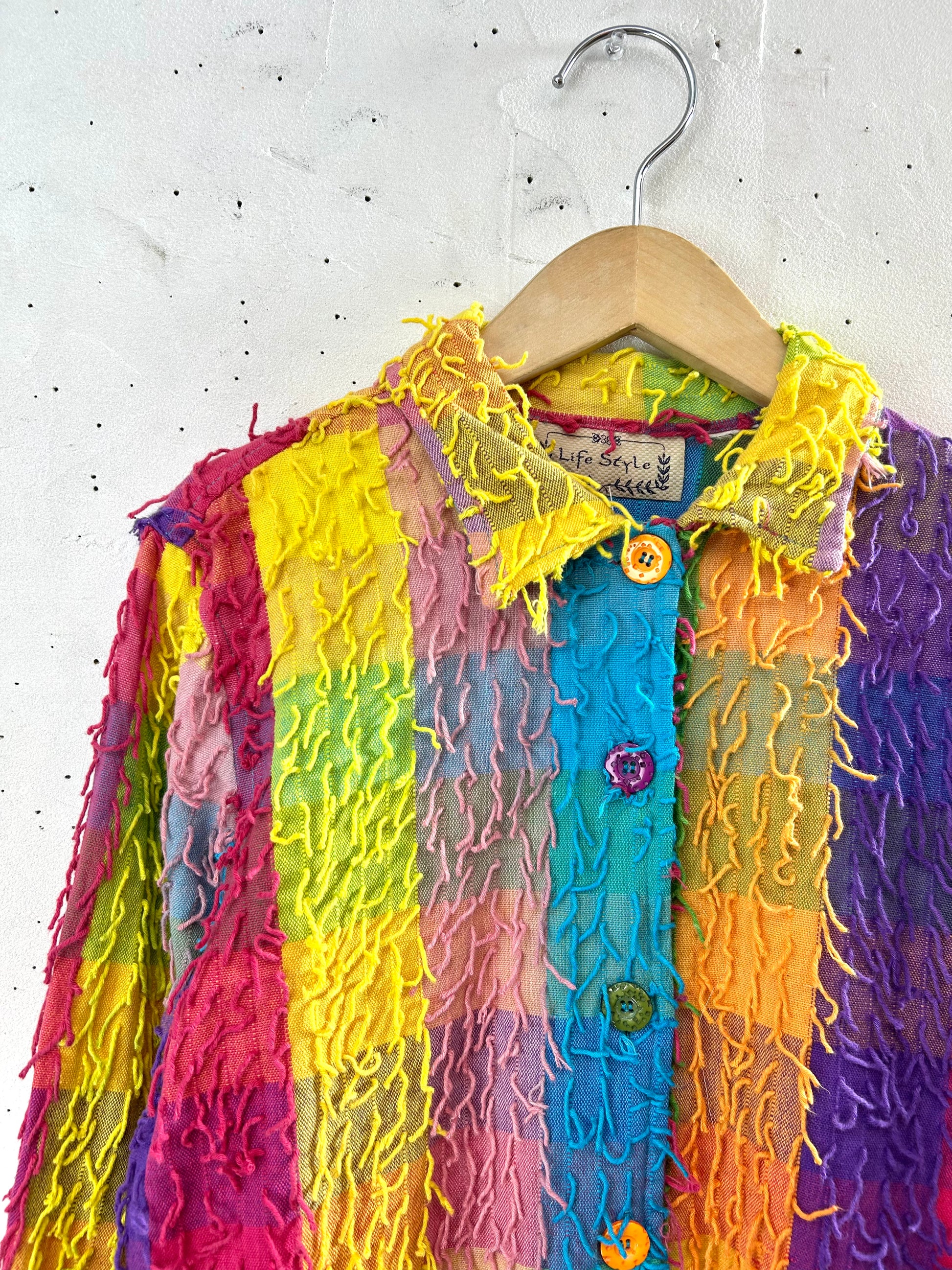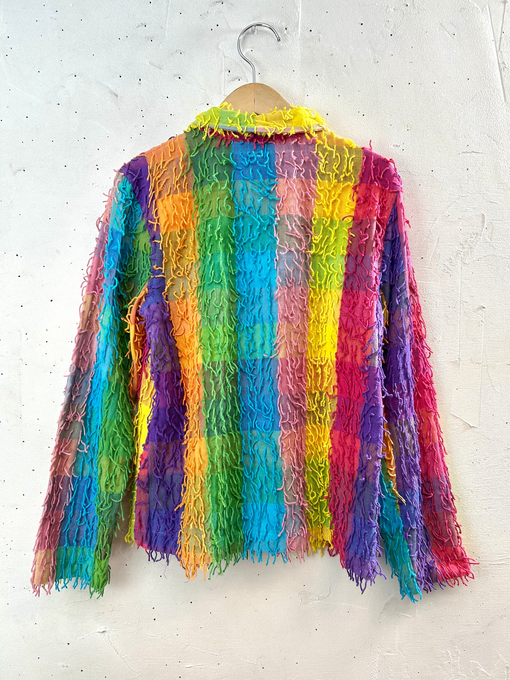 カラフルなカラーリングの織りとモケモケとしたフリンジデザインがビンテージらしいユニークな一着。