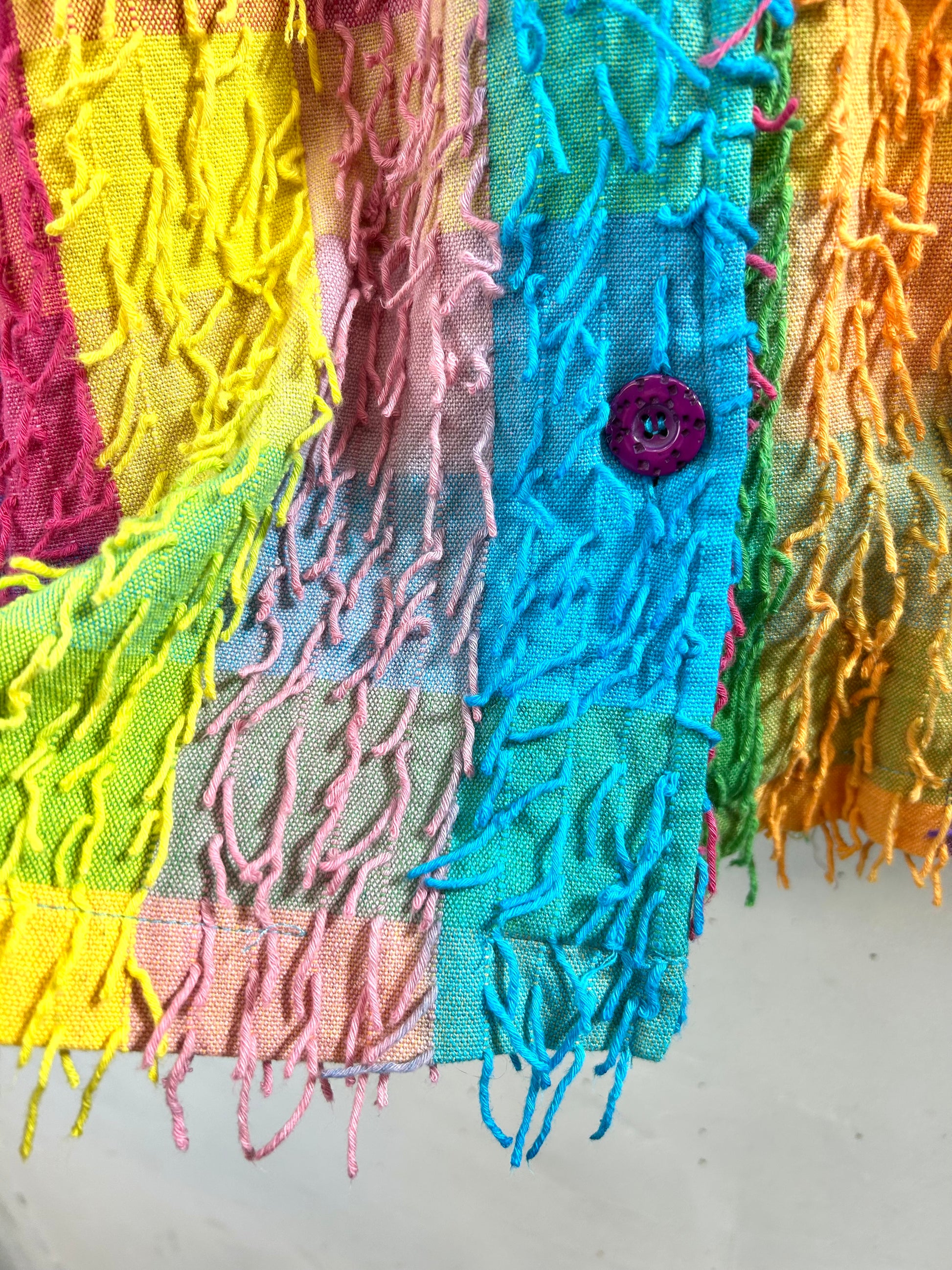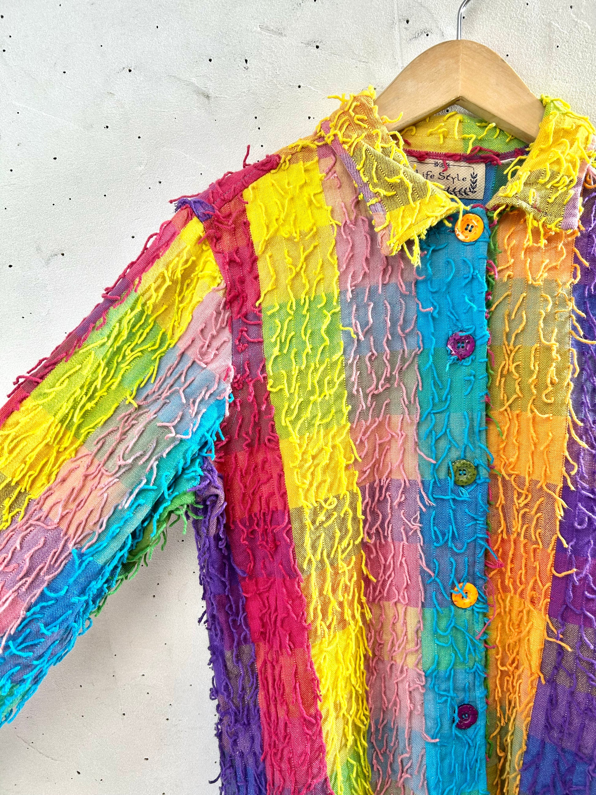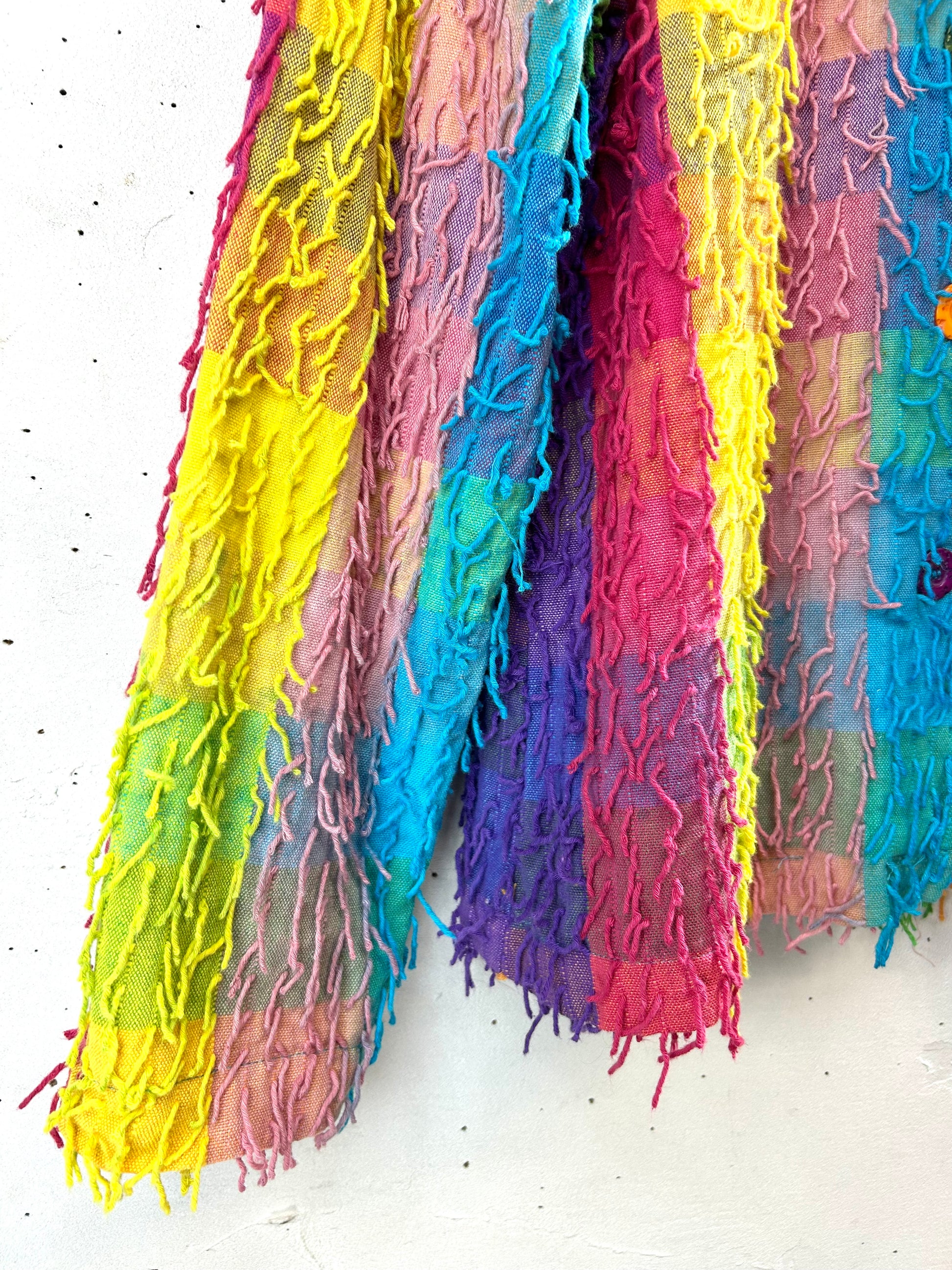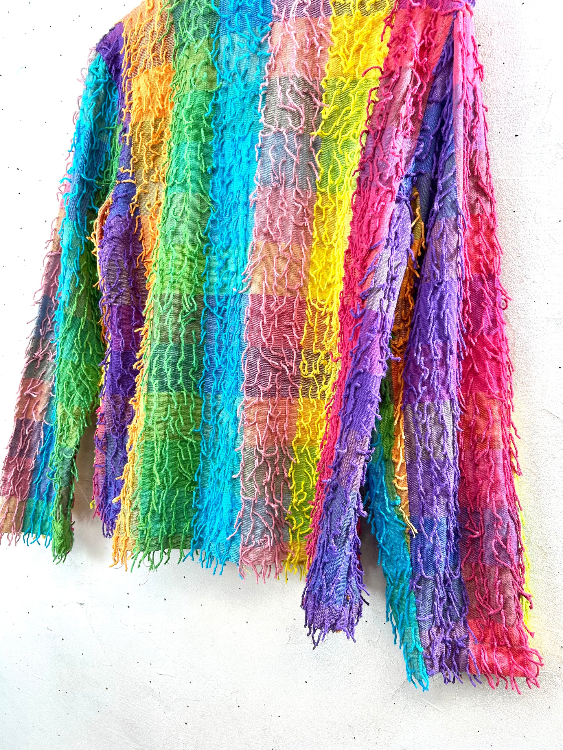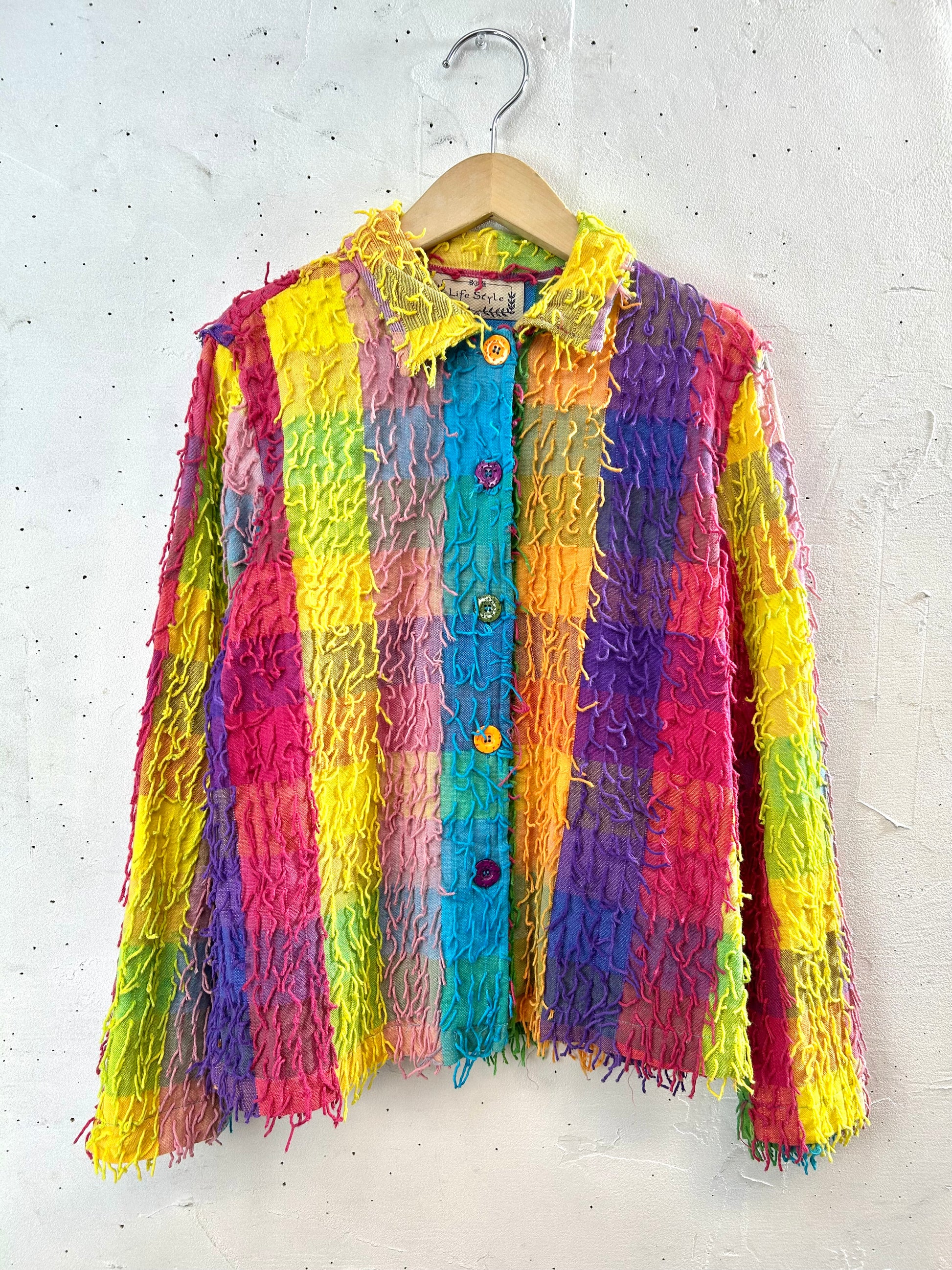 カラフルなカラーリングの織りとモケモケとしたフリンジデザインがビンテージらしいユニークな一着。