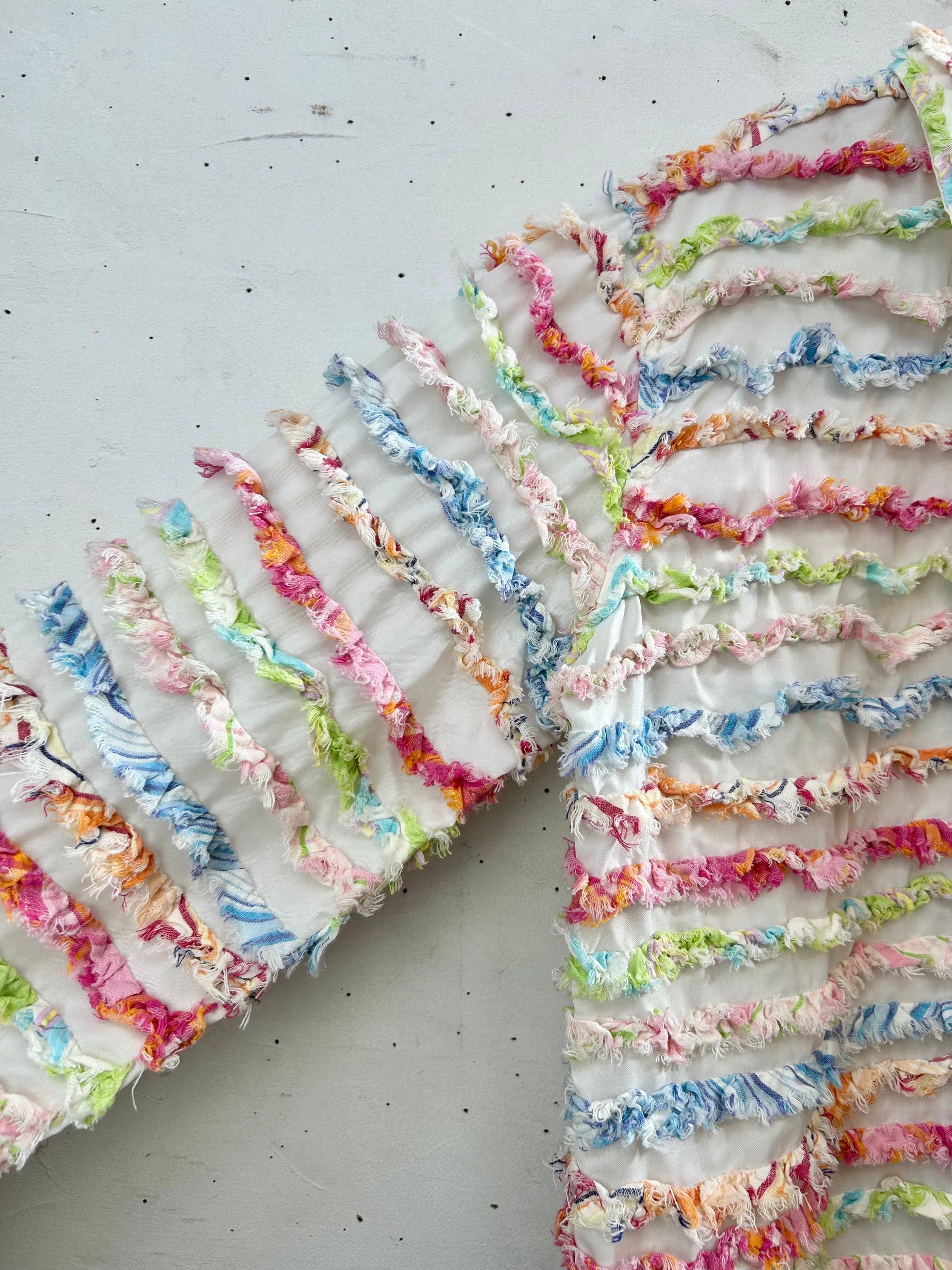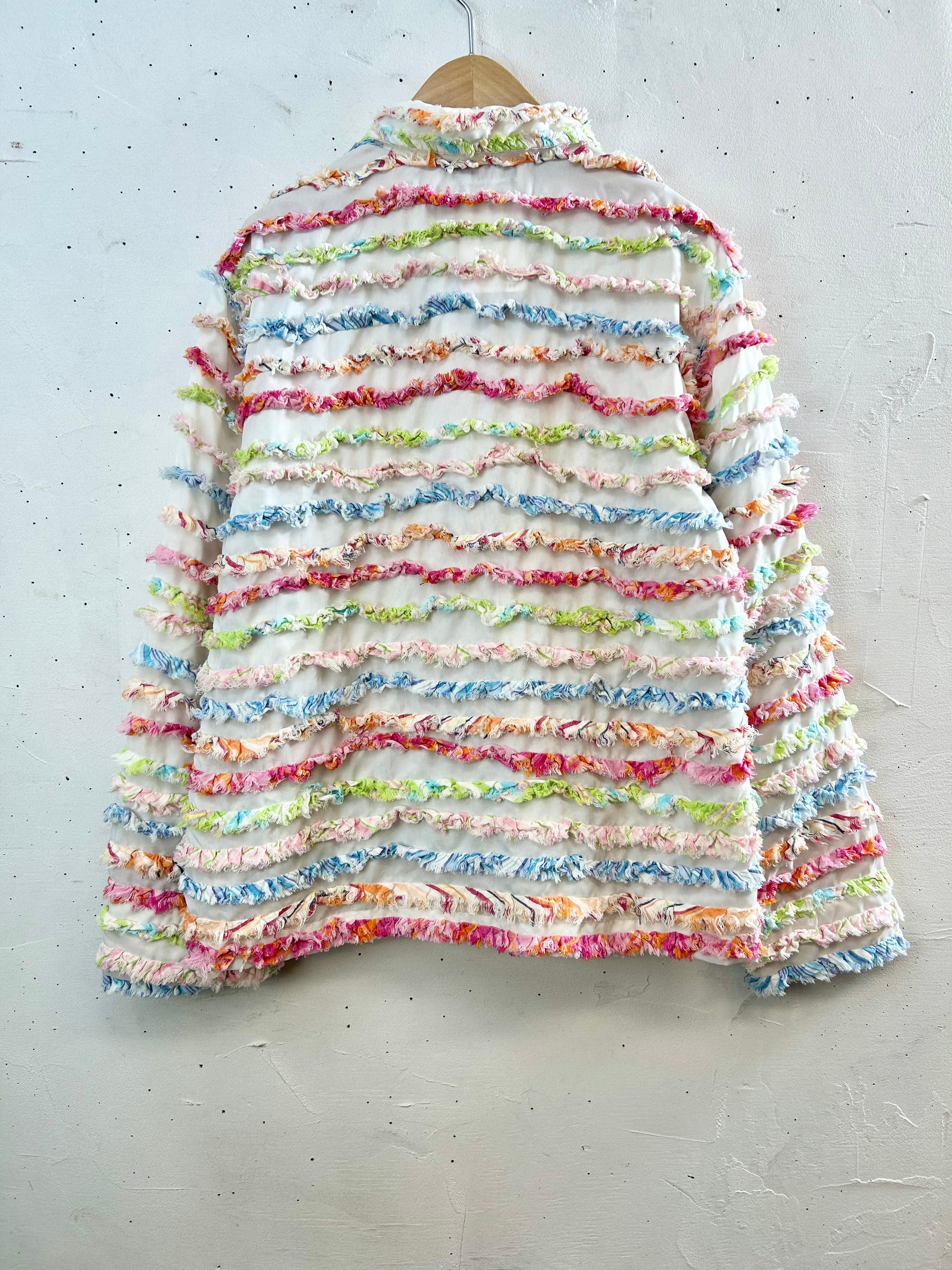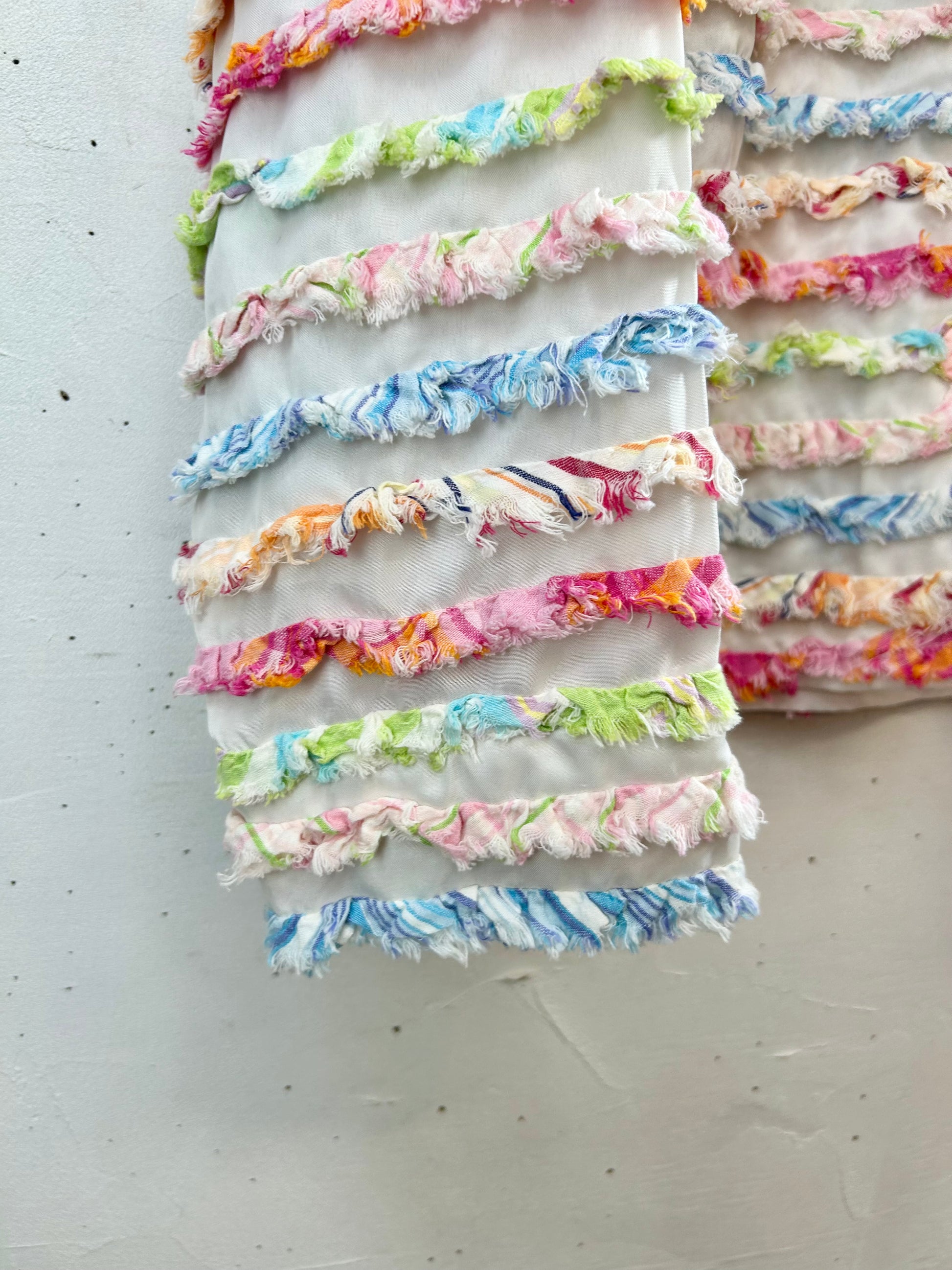 ホワイトボディにカラフルなフリンジがぎっしりと施された春にぴったりな一着。