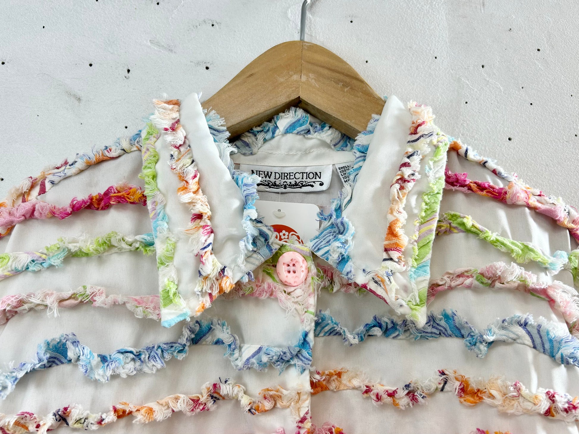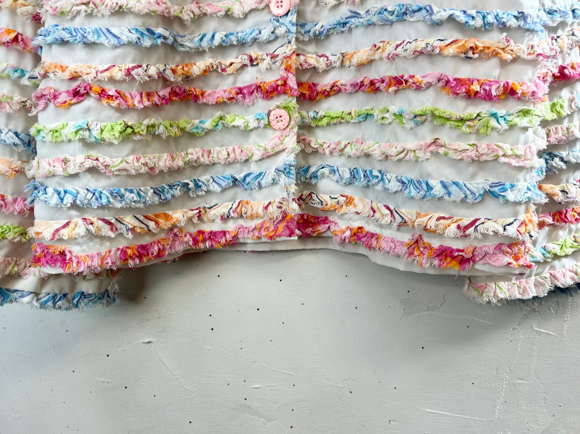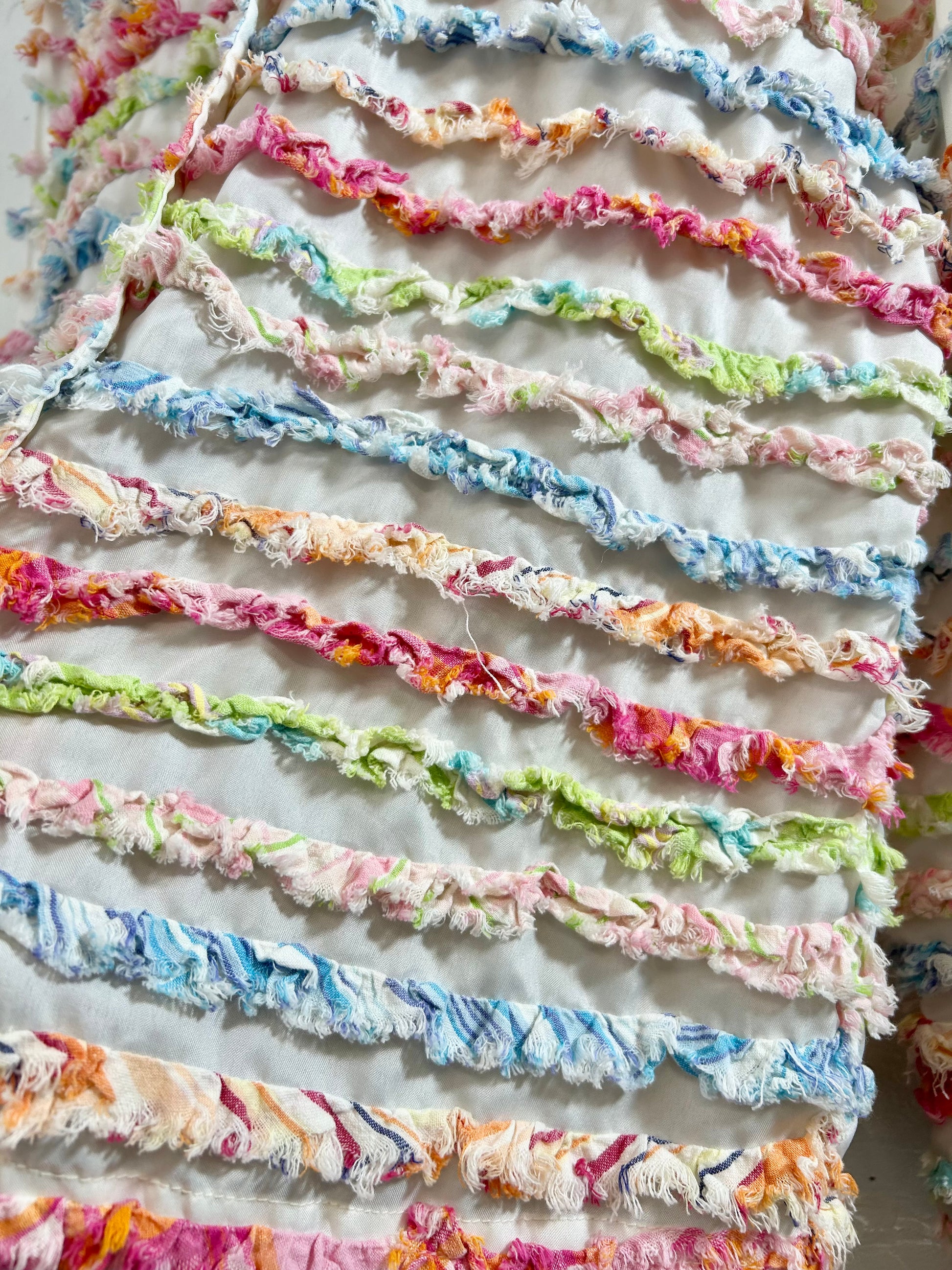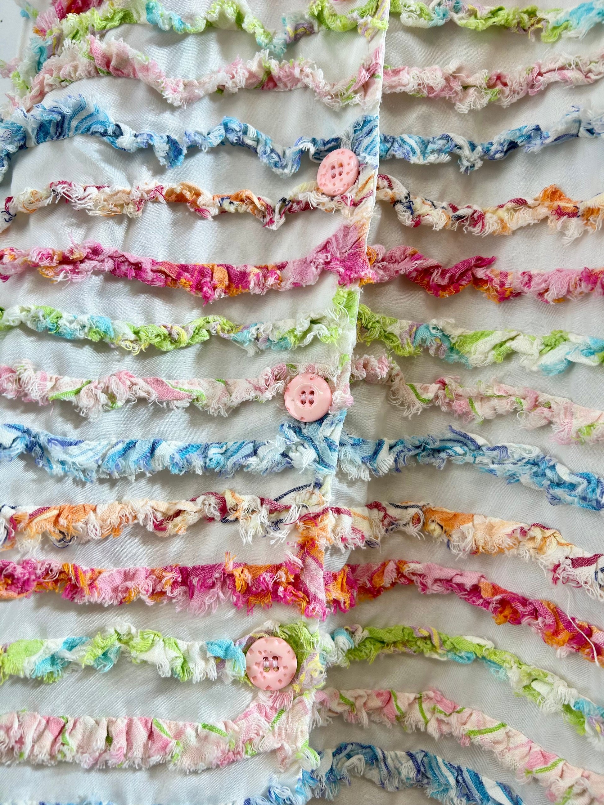 ホワイトボディにカラフルなフリンジがぎっしりと施された春にぴったりな一着。