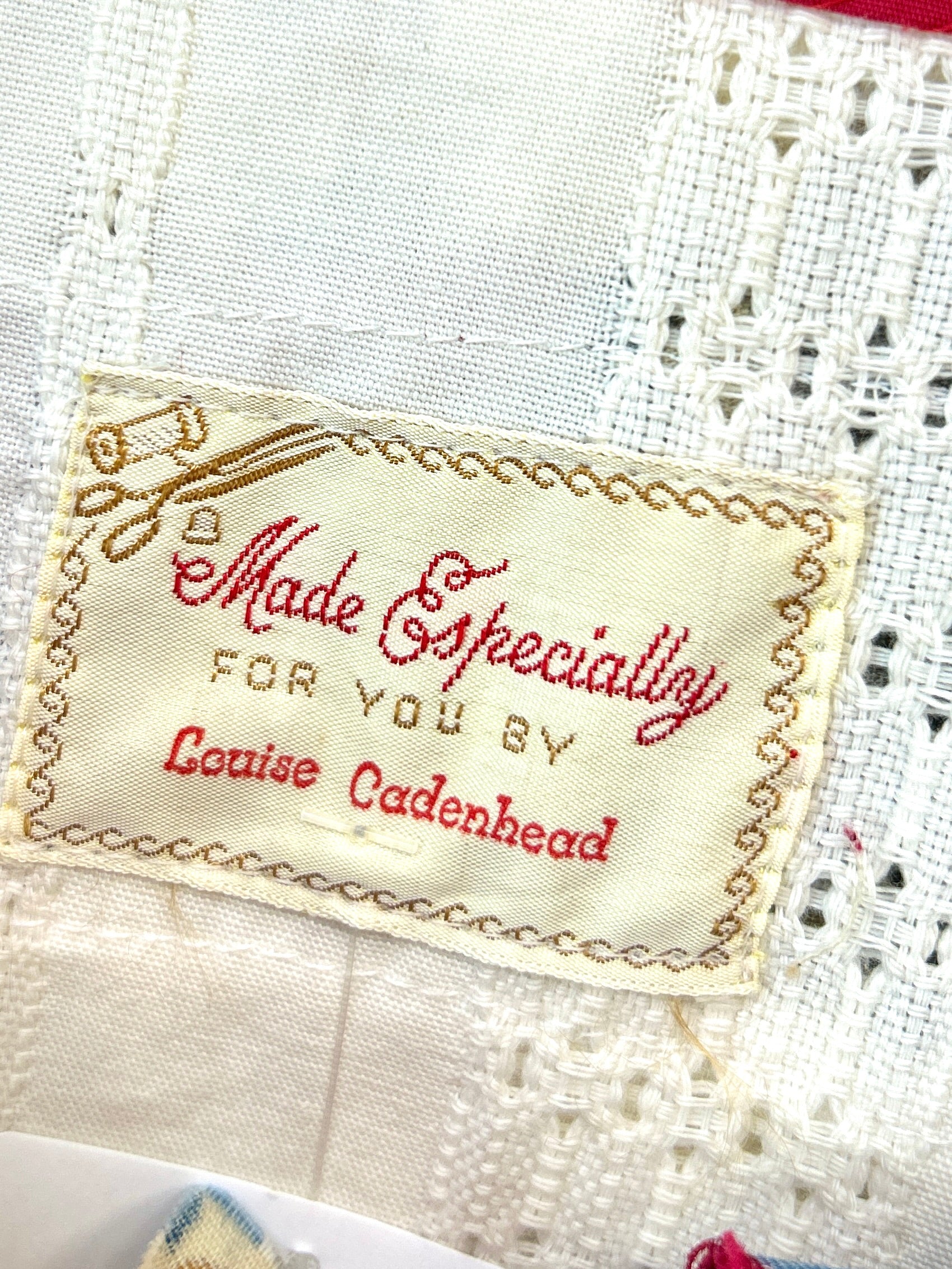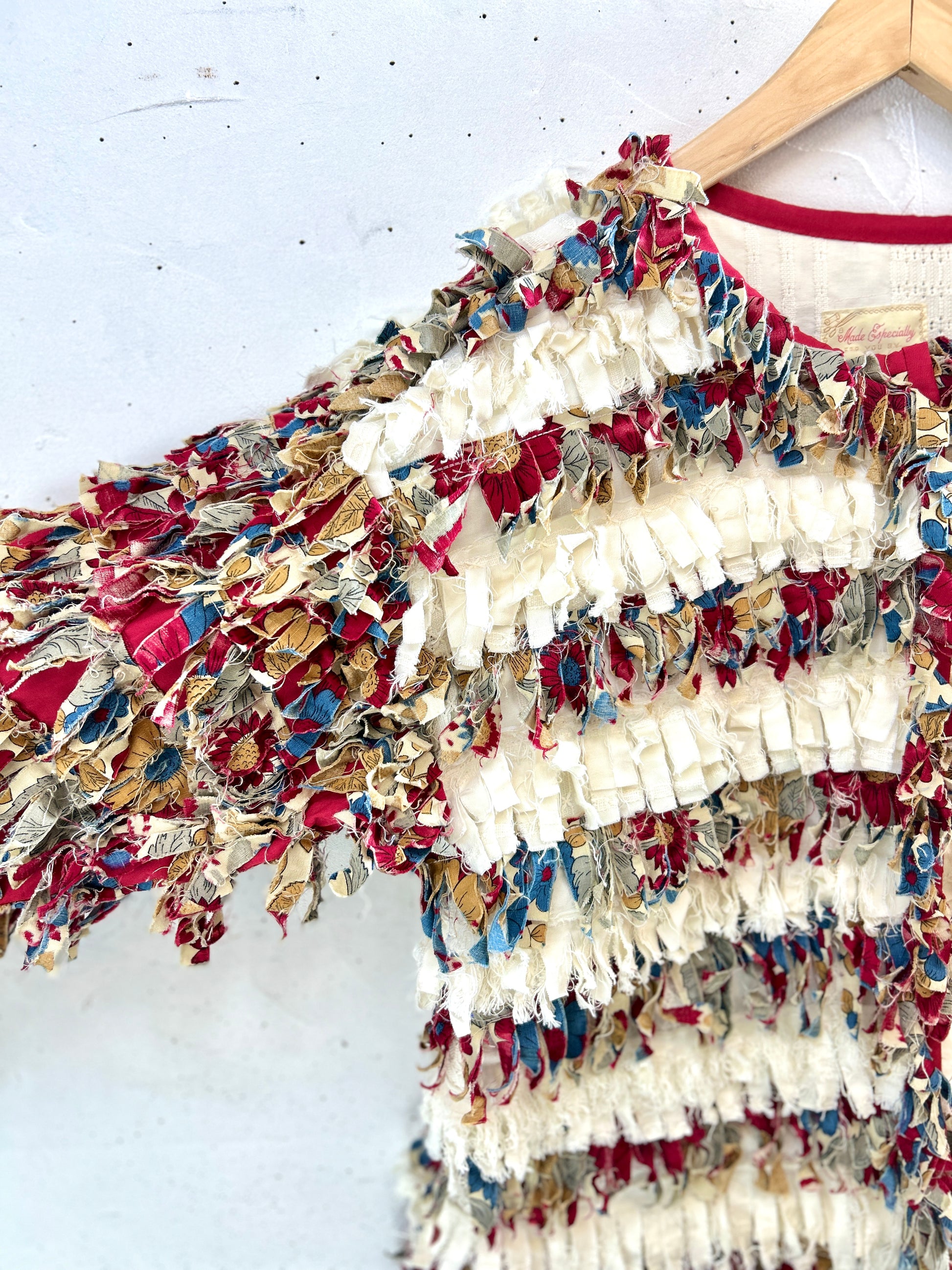 ホワイトとレッドボディに味わいのあるカラーリングのプリント生地を使ったフリンジで、華やかさも申し分なく、サッと羽織るだけで主役級の1着です。
