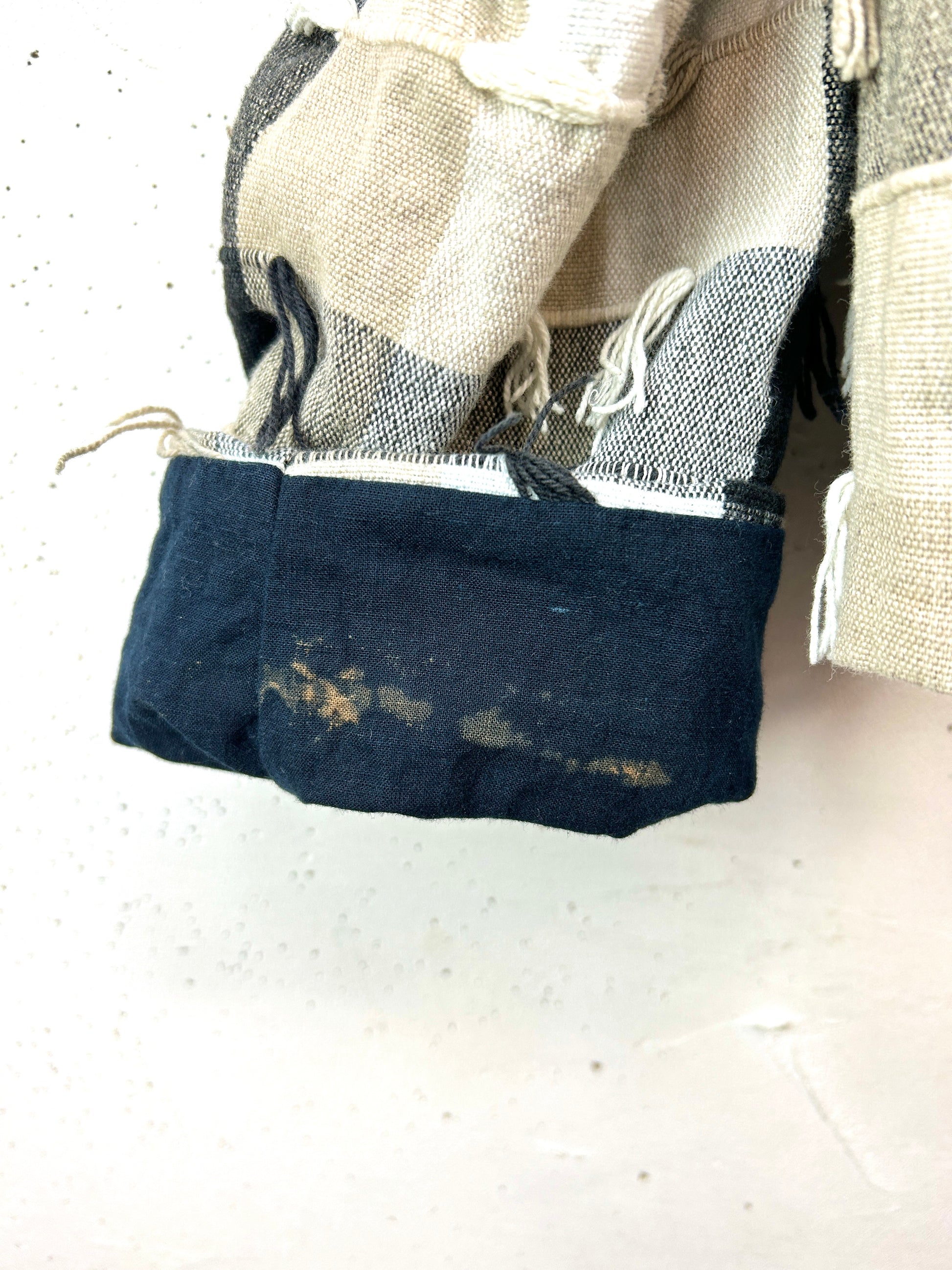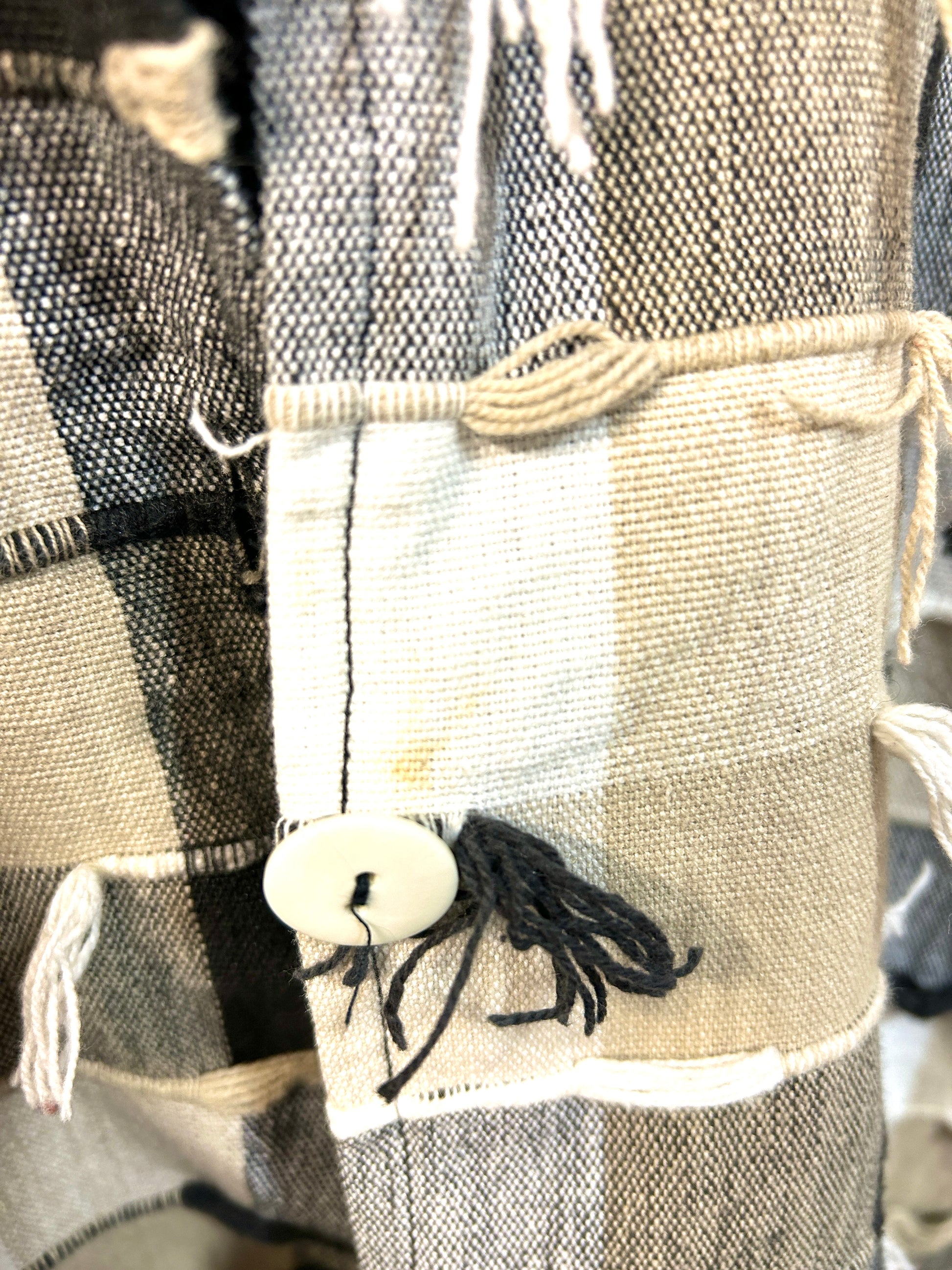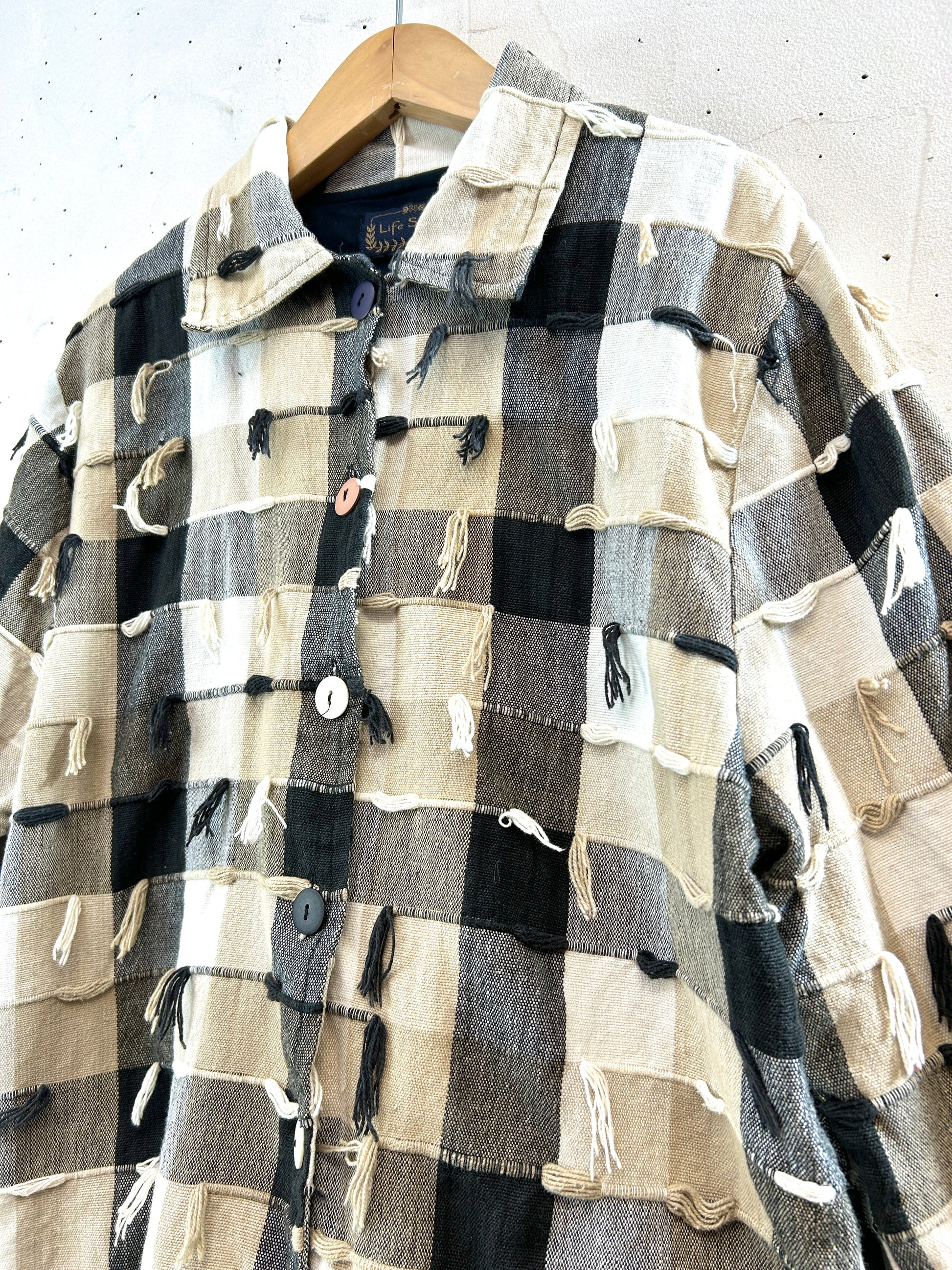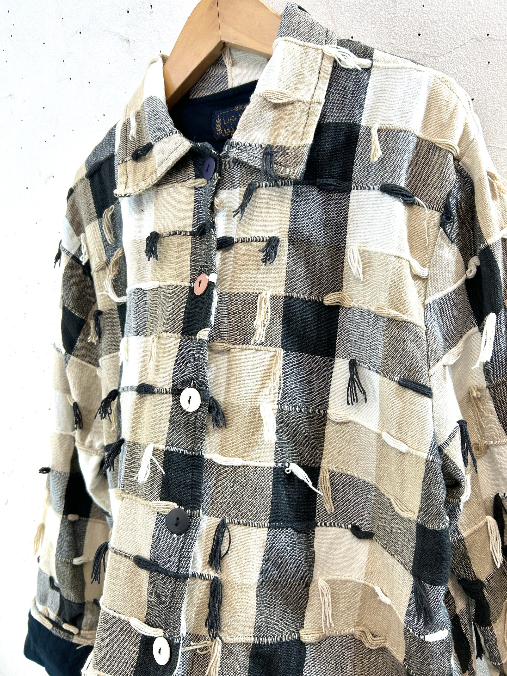 ブラックとナチュラルカラーのブロックチェックに、モケモケとしたフリンジデザインがビンテージらしいユニークな一着。