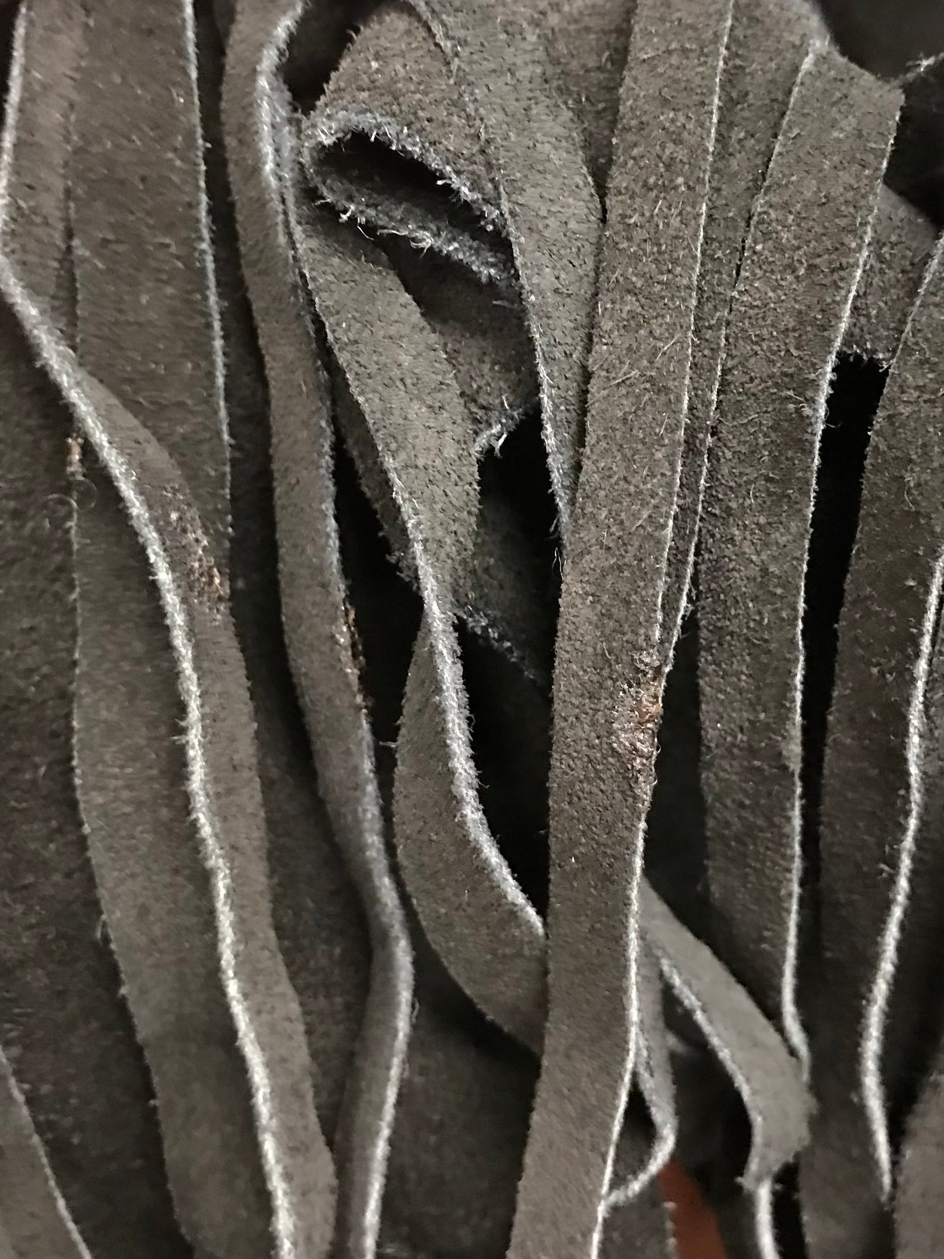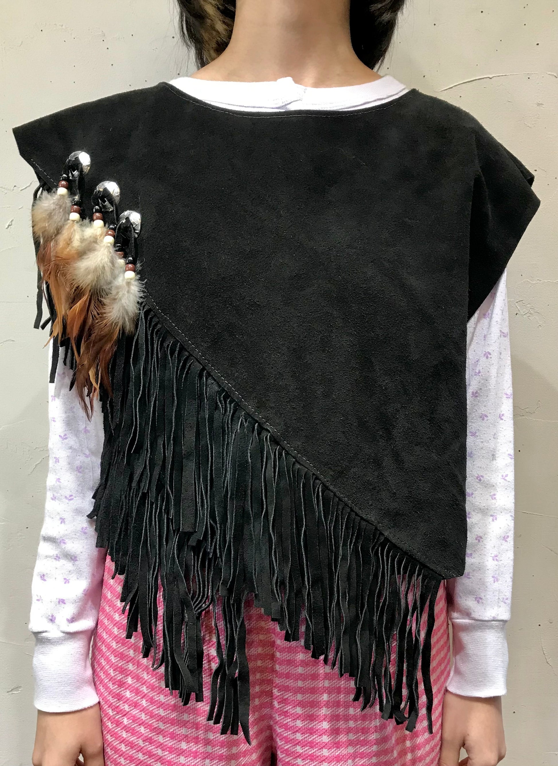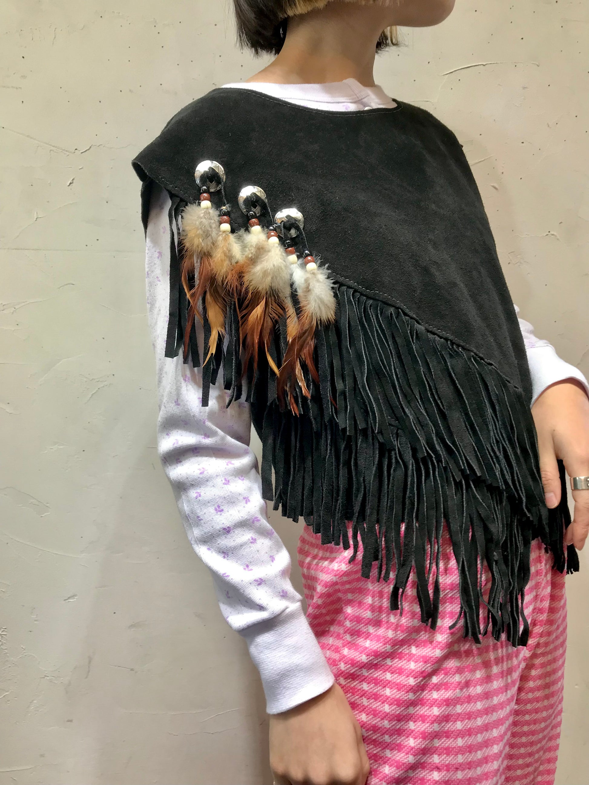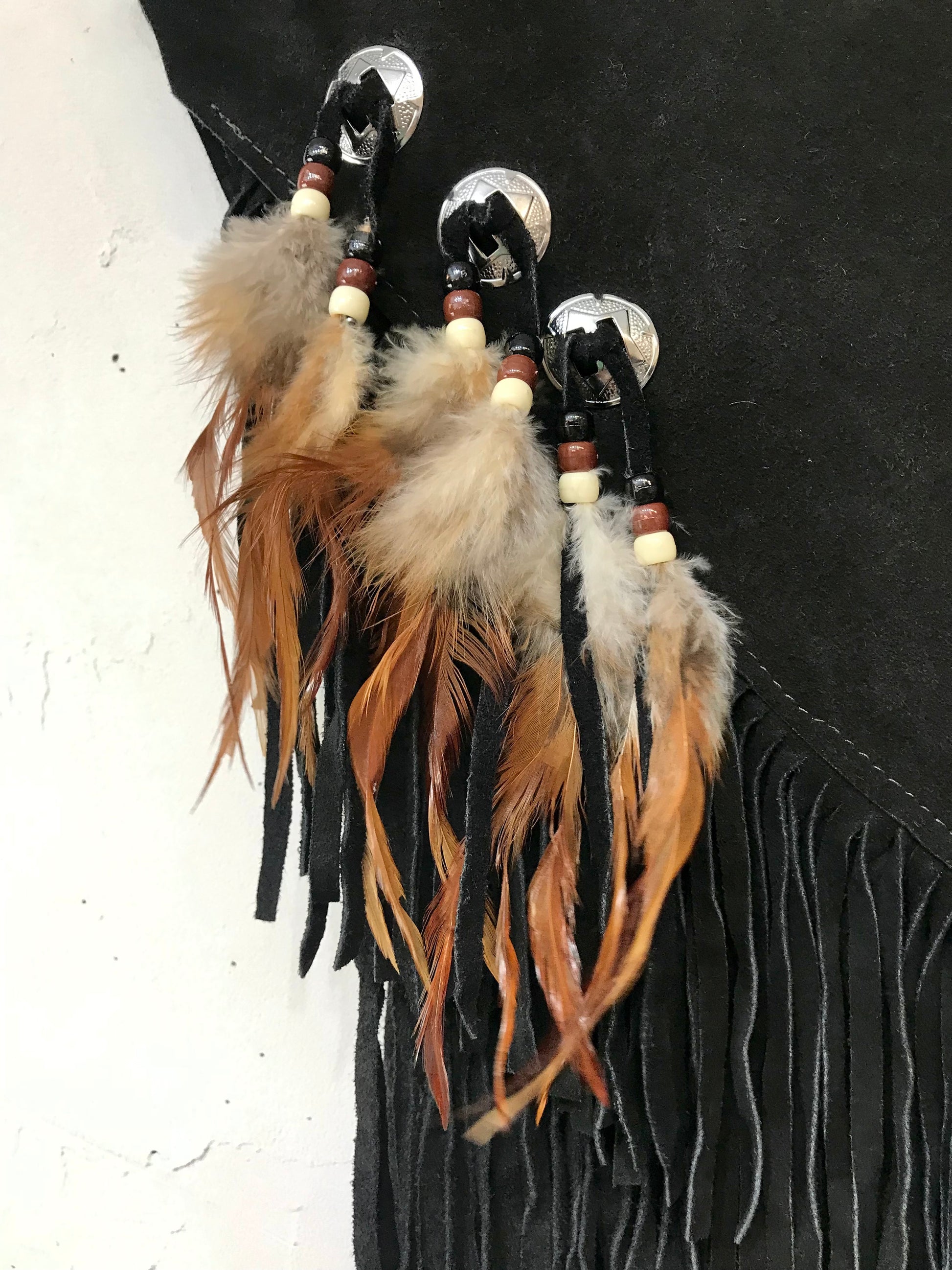 ブラックレザーにフリンジがたっぷり施されたインパクト抜群の1着。