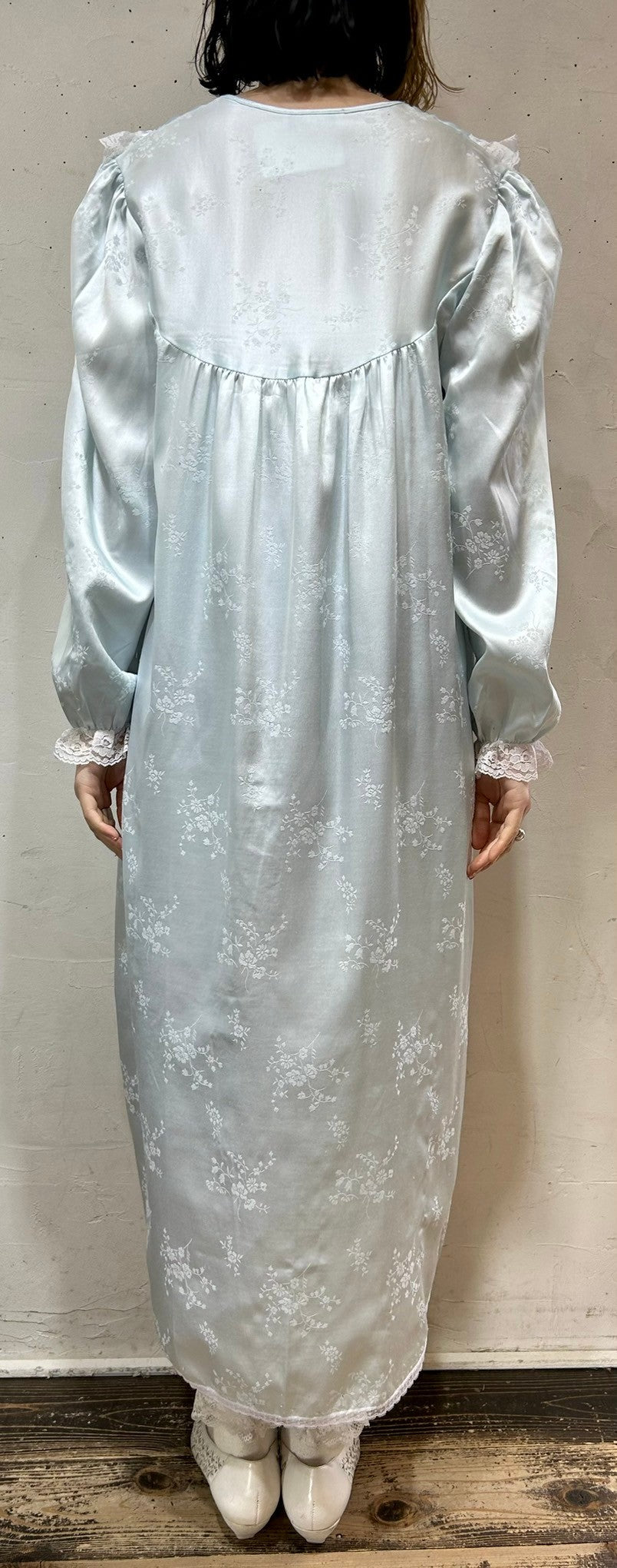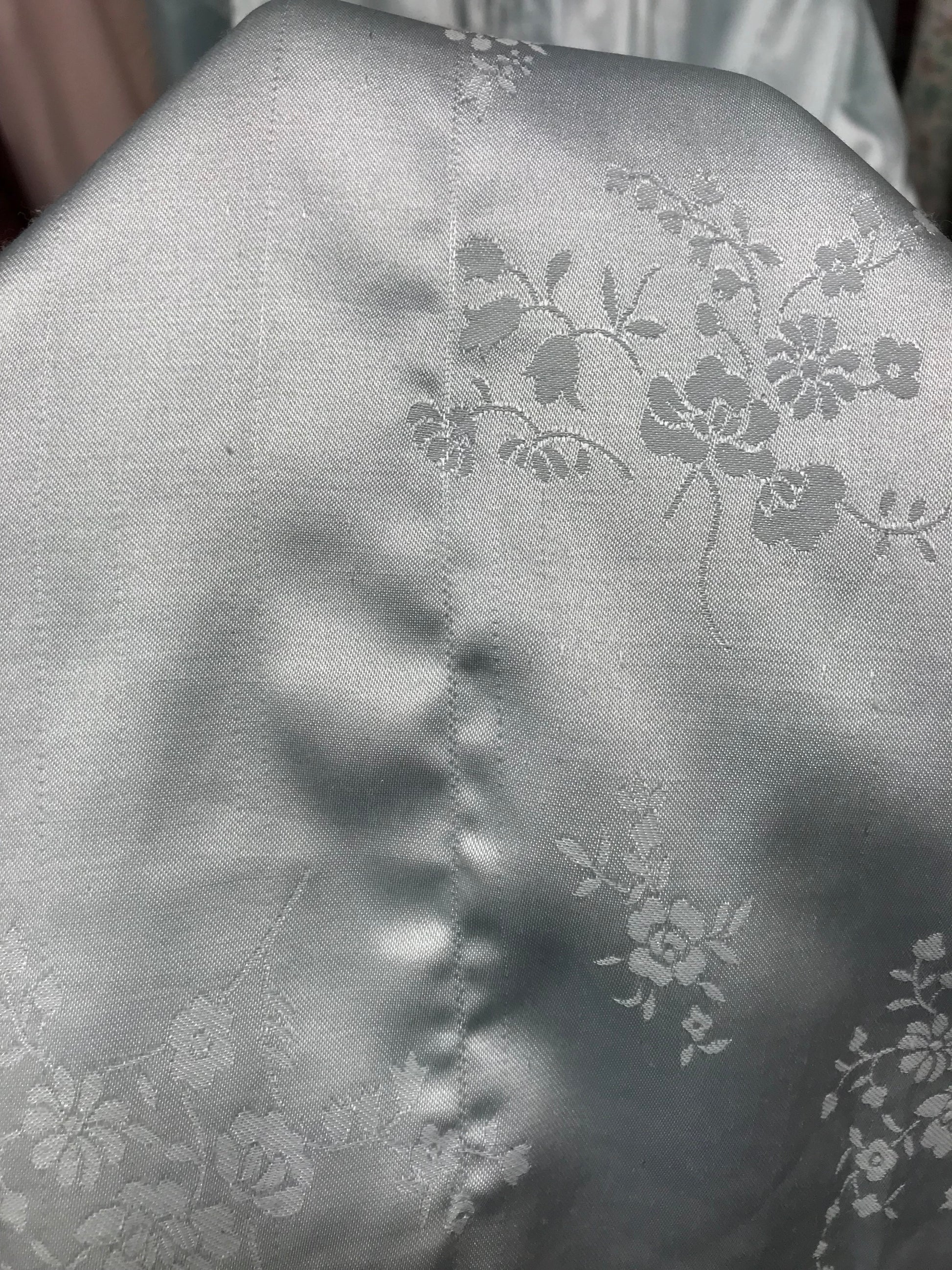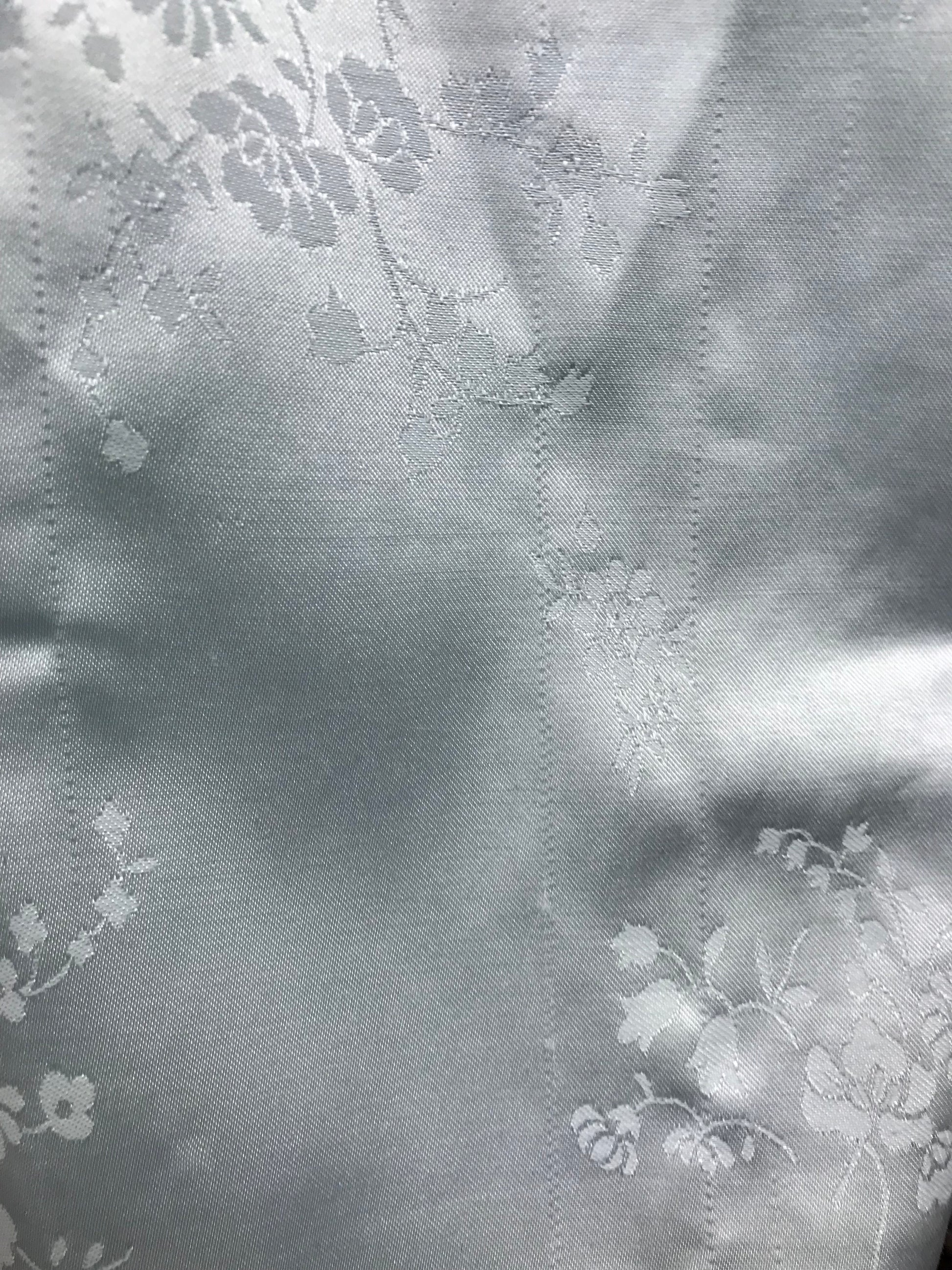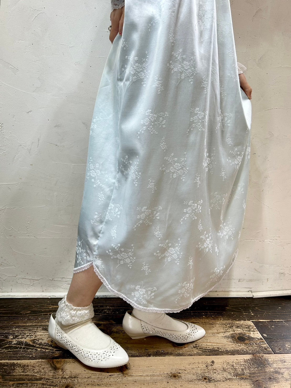 光沢感のあるサテンのボディにフラワーの織りが施されたキュートな1着。
